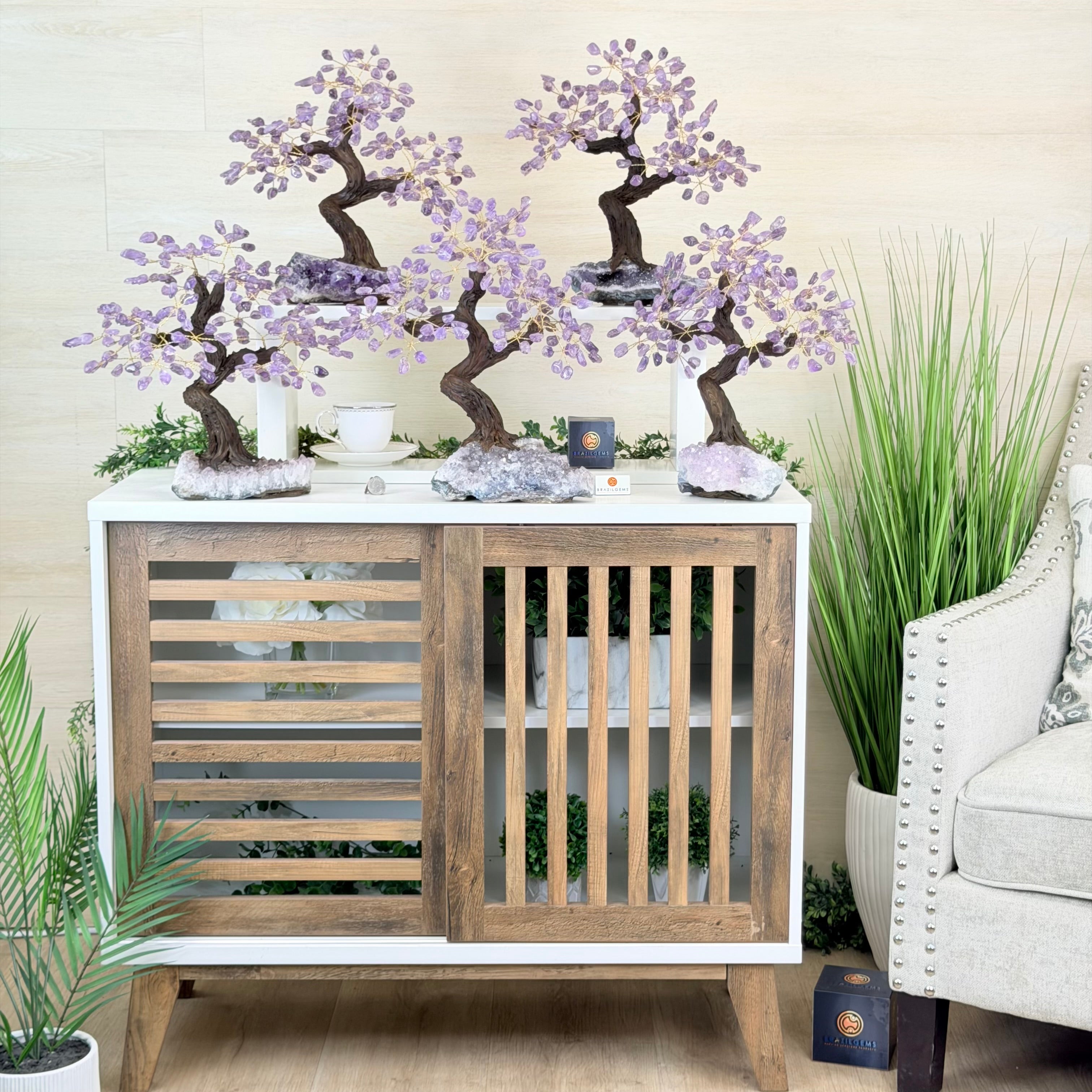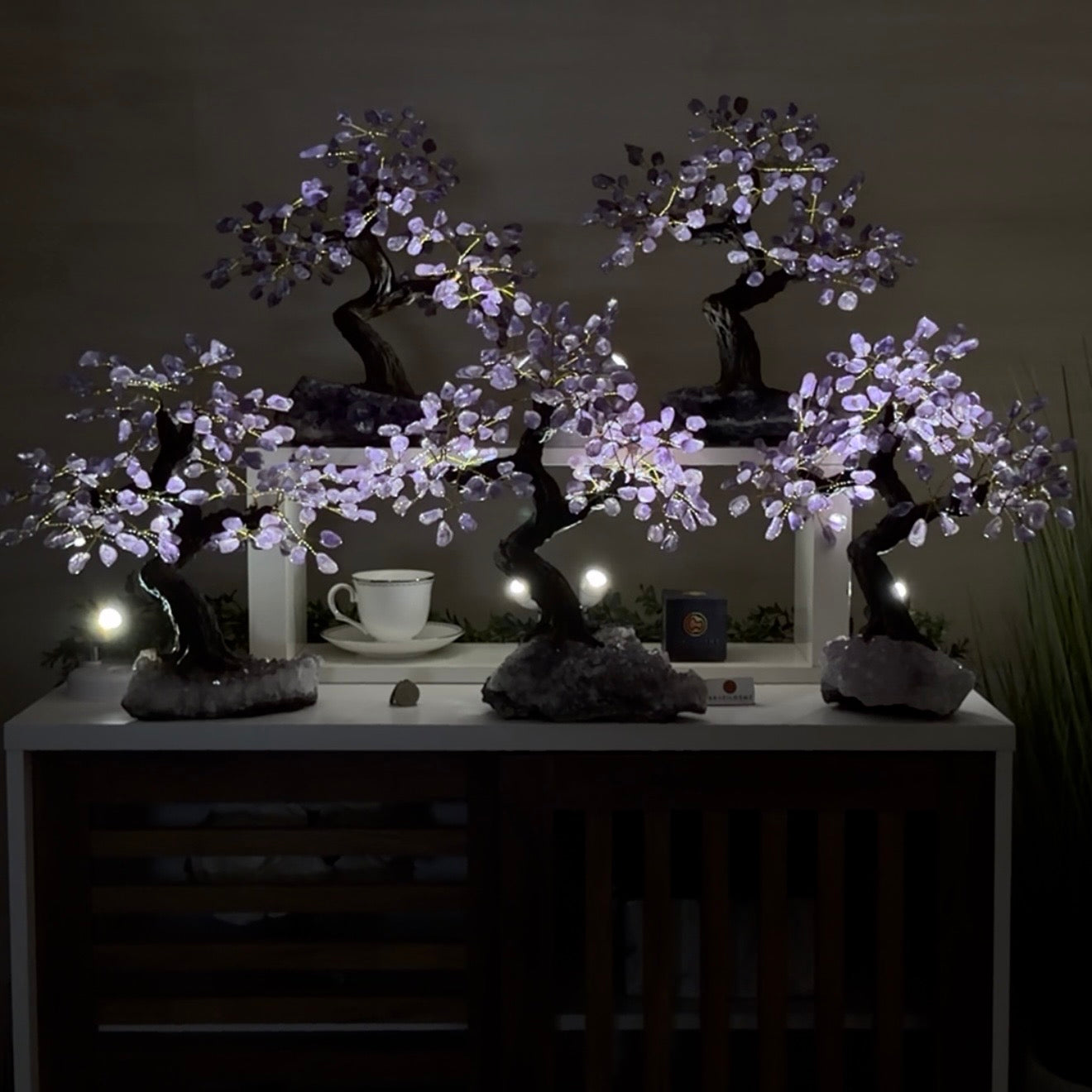 Their bases have a hand-selected crystal cluster, chosen for its size and beauty, commanding attention and admiration. Crafted with meticulous care by skilled artisans, the resin trunk and delicately wired branches gracefully emerge, each branch meticulously adorned with lustrous tumbled gemstones.