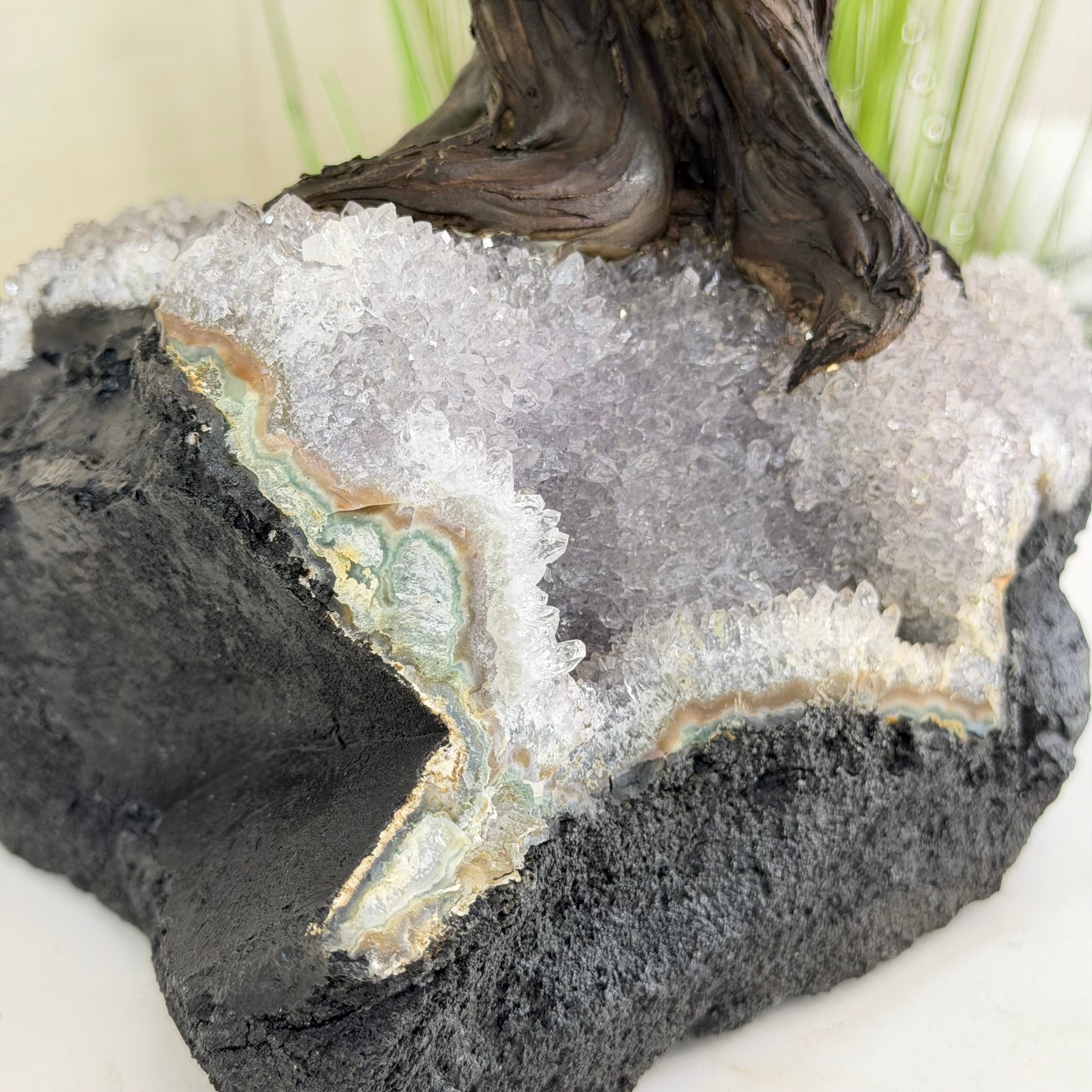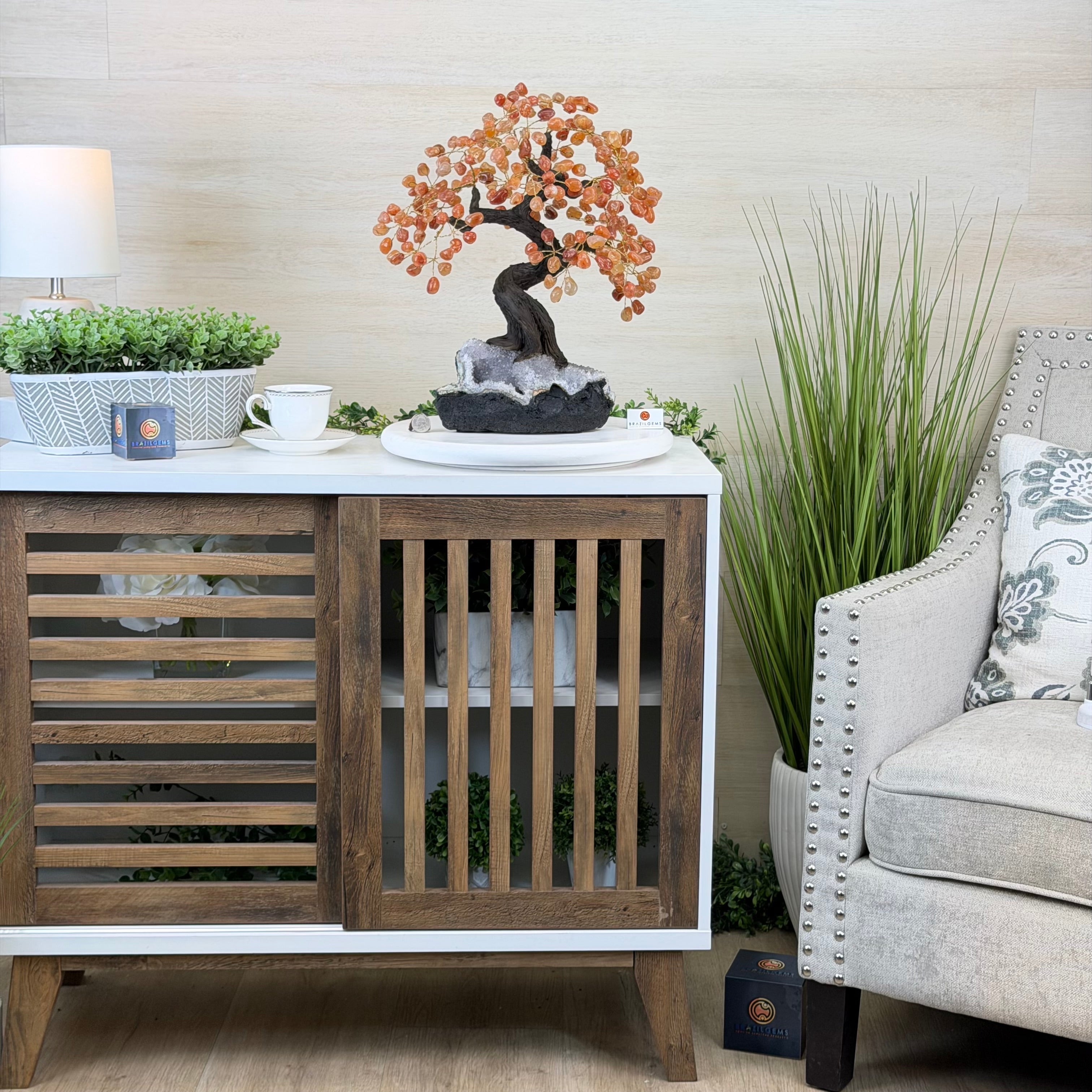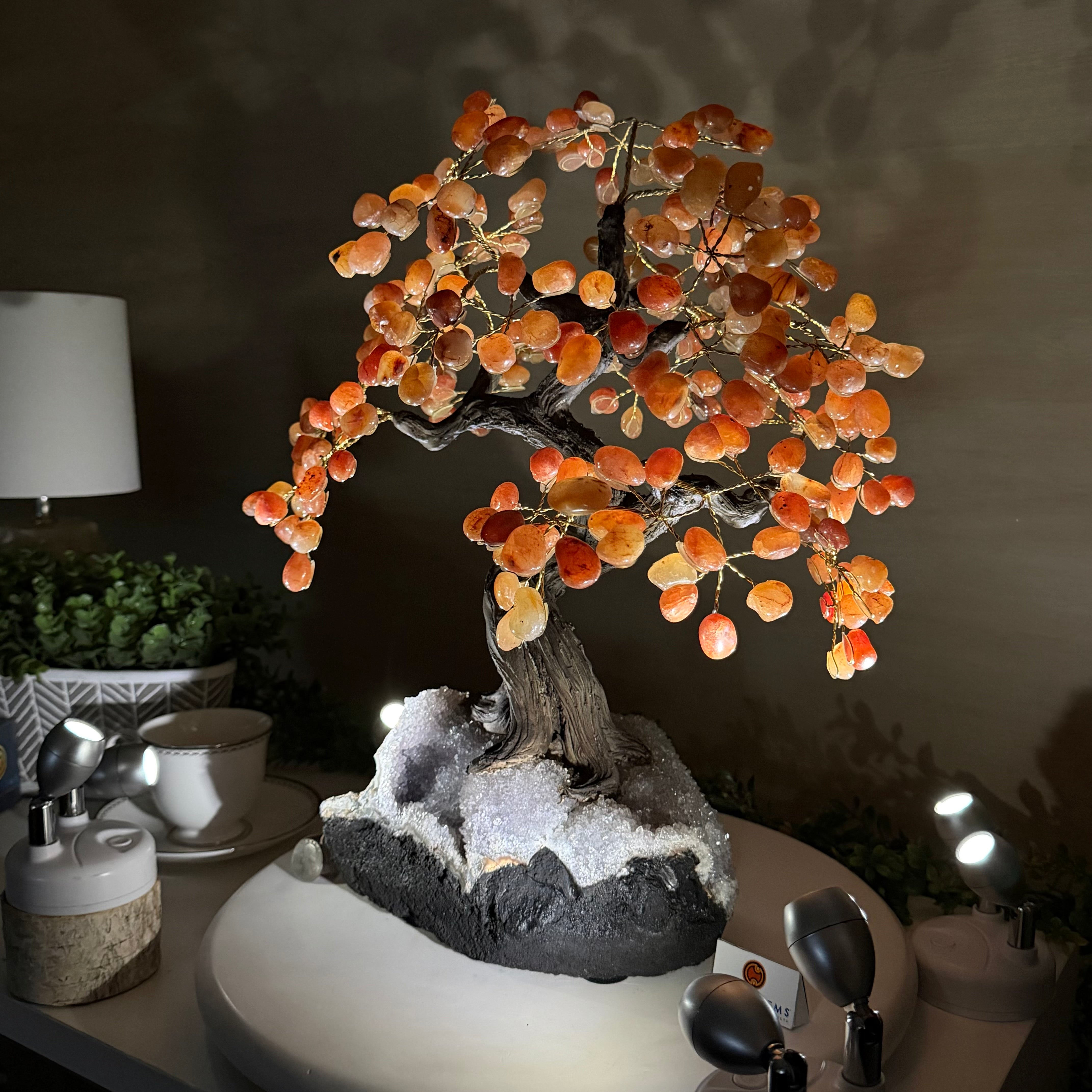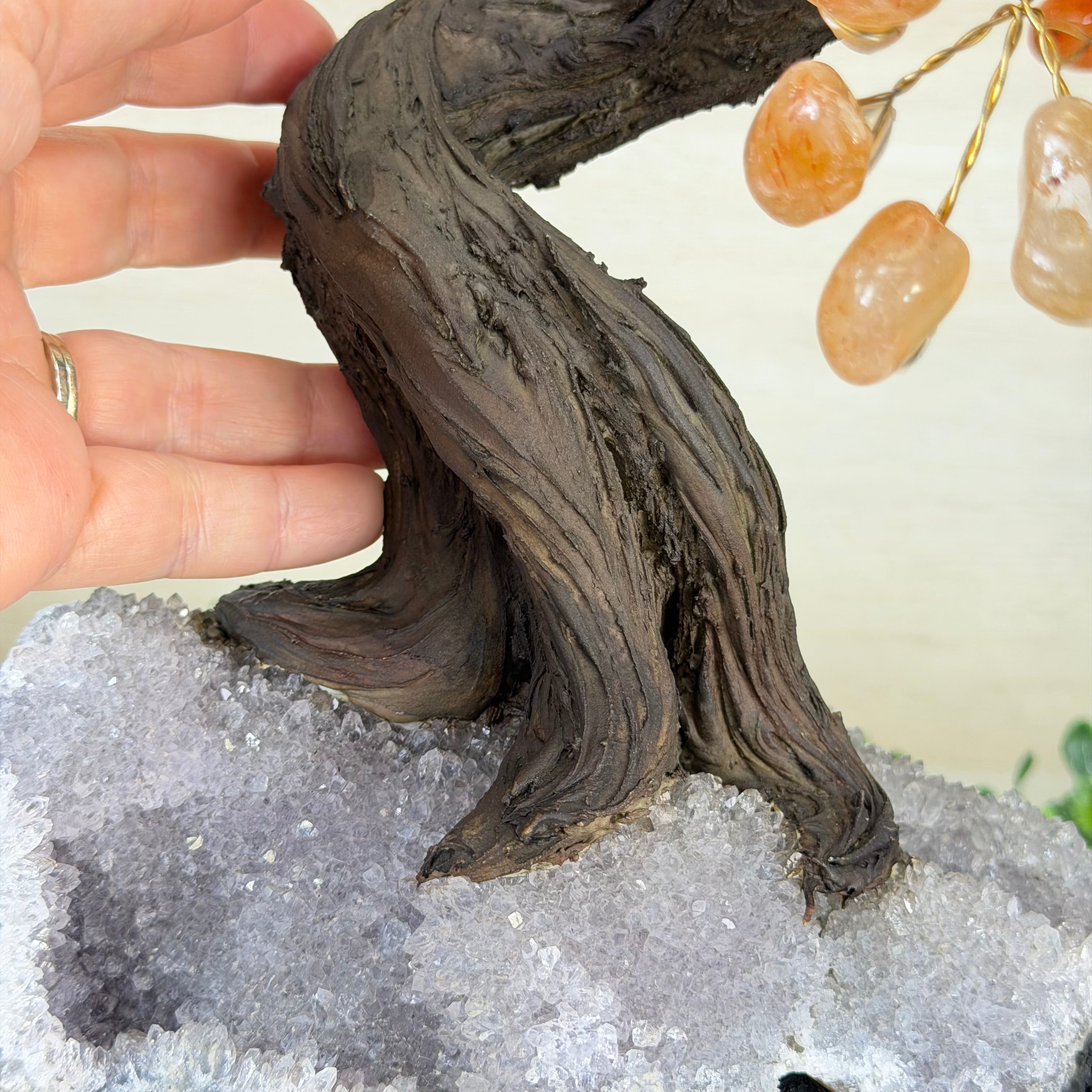 Their bases have a hand-selected crystal cluster, chosen for its size and beauty, commanding attention and admiration. Crafted with meticulous care by skilled artisans, the resin trunk and delicately wired branches gracefully emerge, each branch meticulously adorned with lustrous tumbled gemstones.