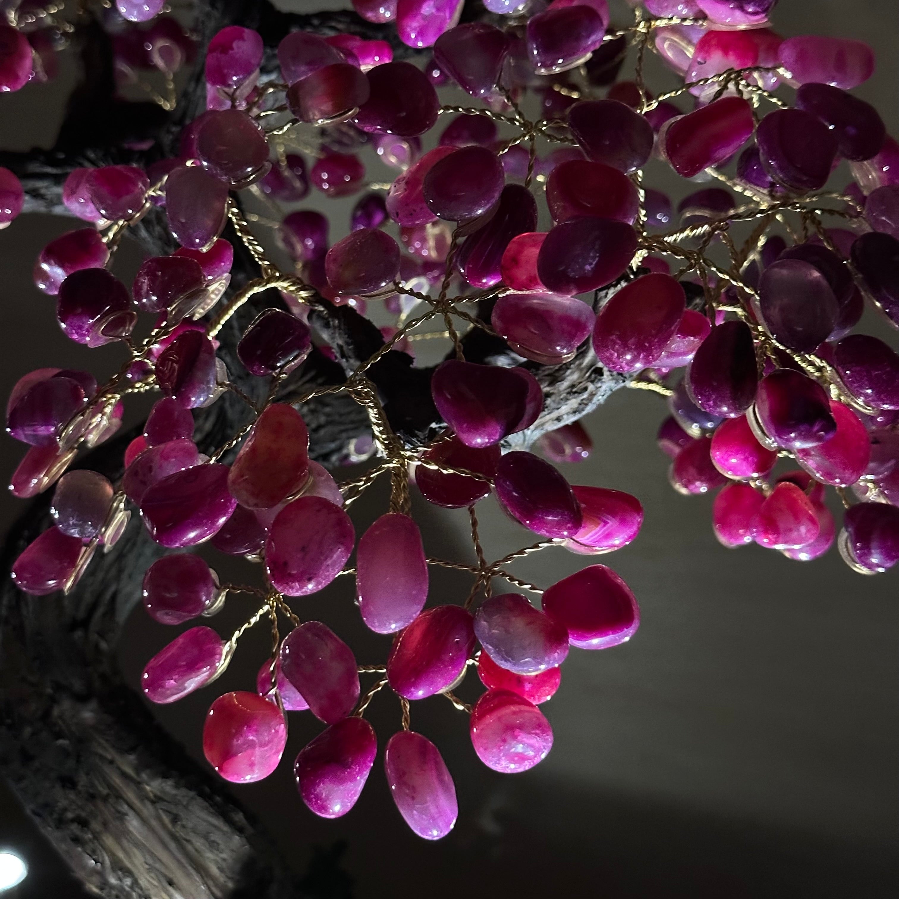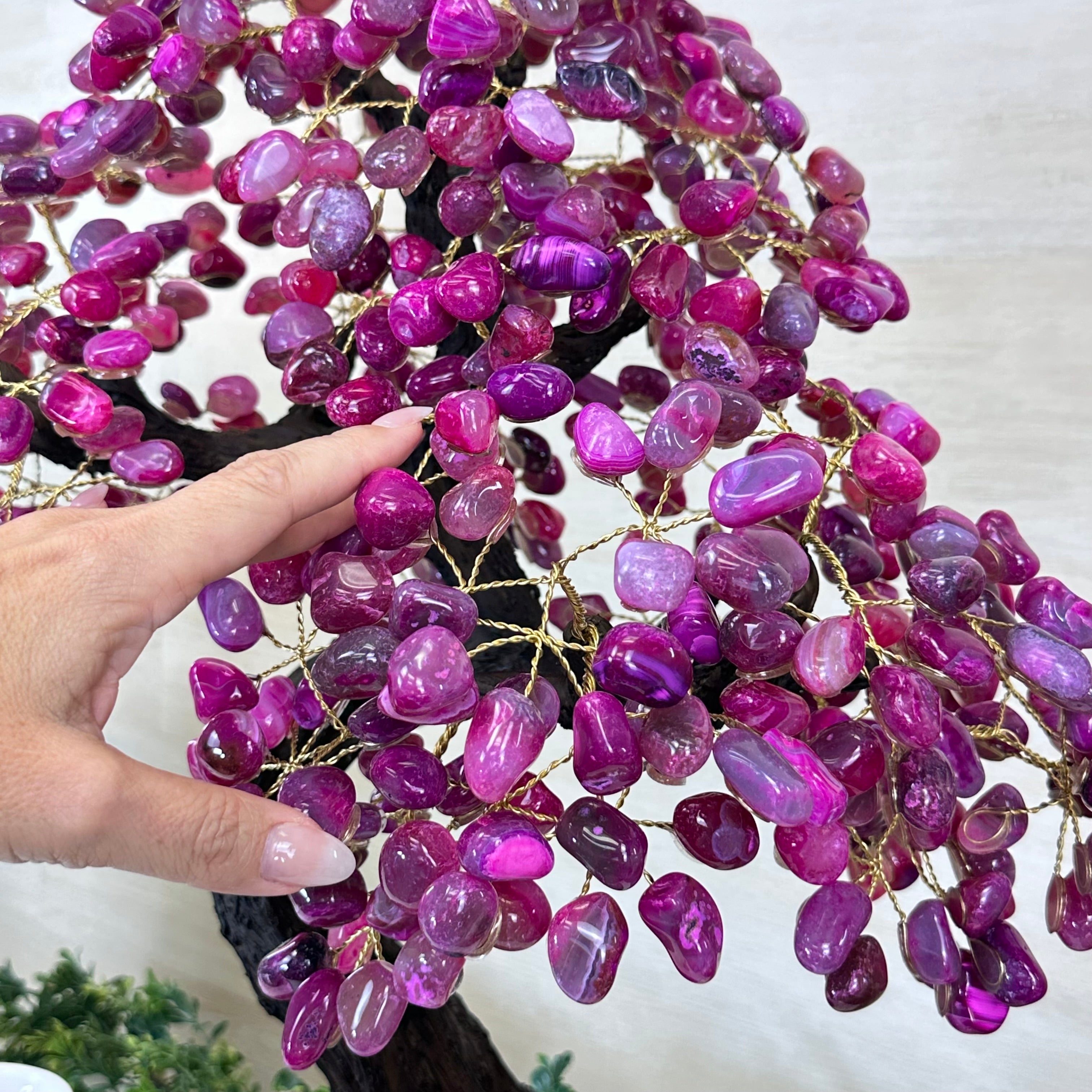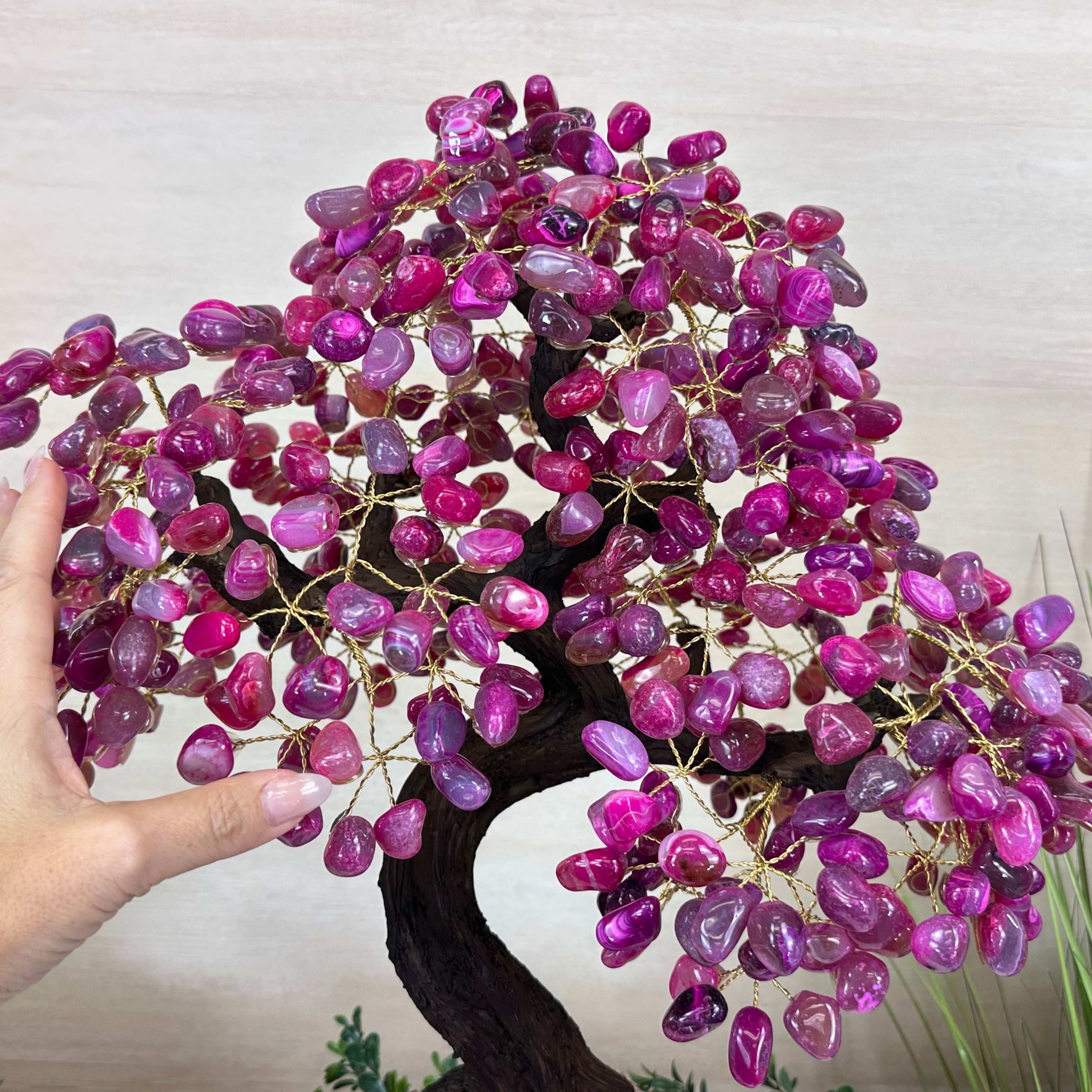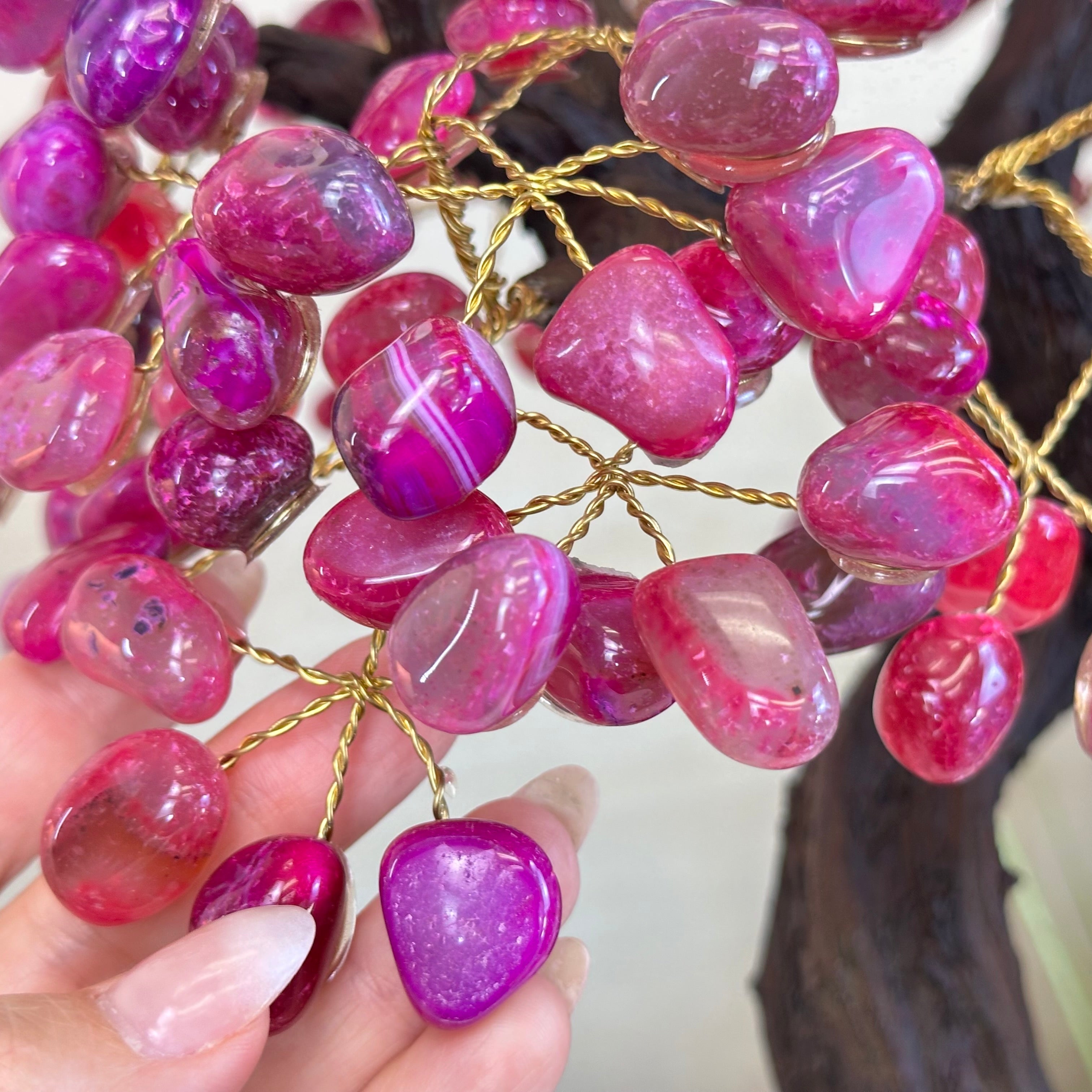 Their bases have a hand-selected crystal cluster, chosen for its size and beauty, commanding attention and admiration. Crafted with meticulous care by skilled artisans, the resin trunk and delicately wired branches gracefully emerge, each branch meticulously adorned with lustrous tumbled gemstones.