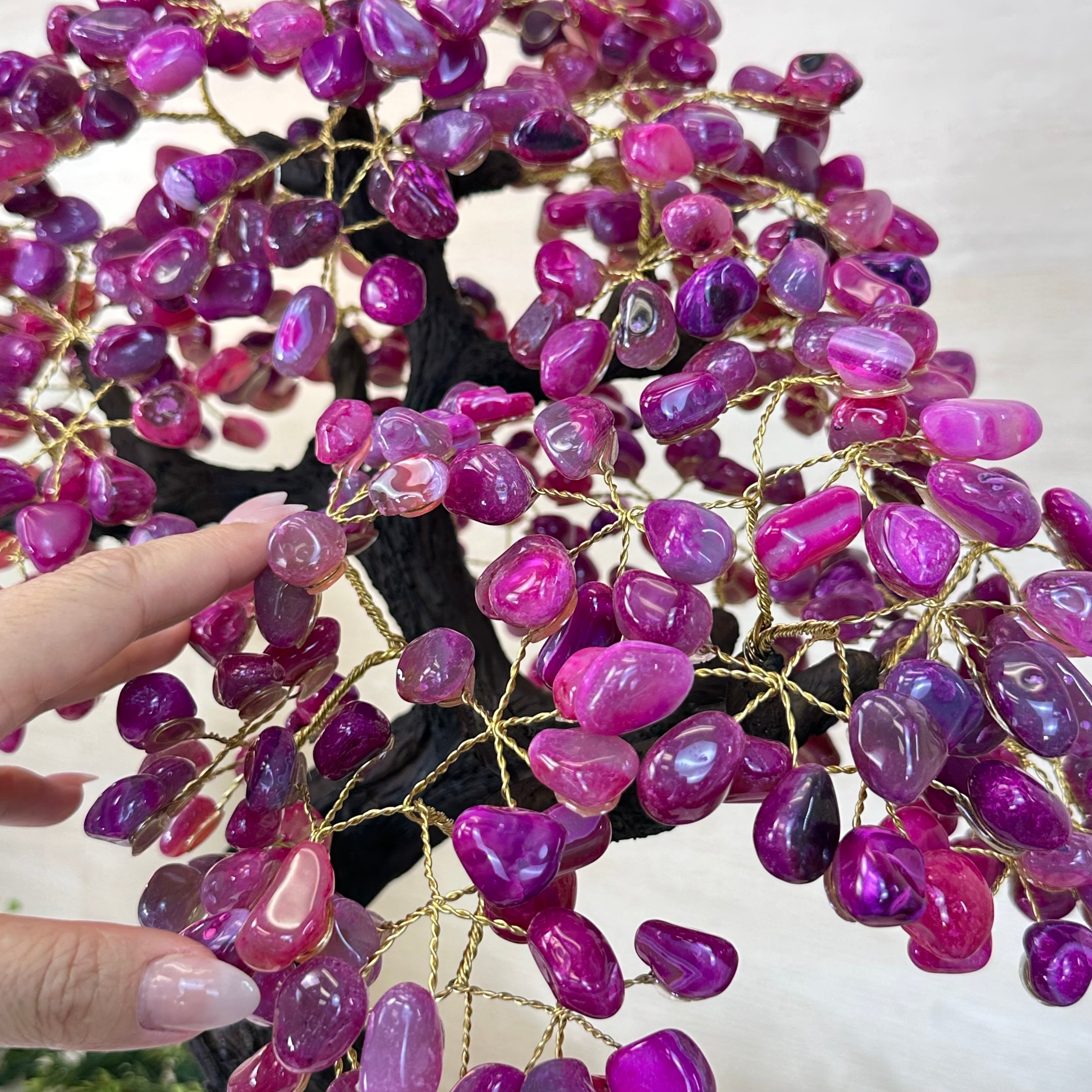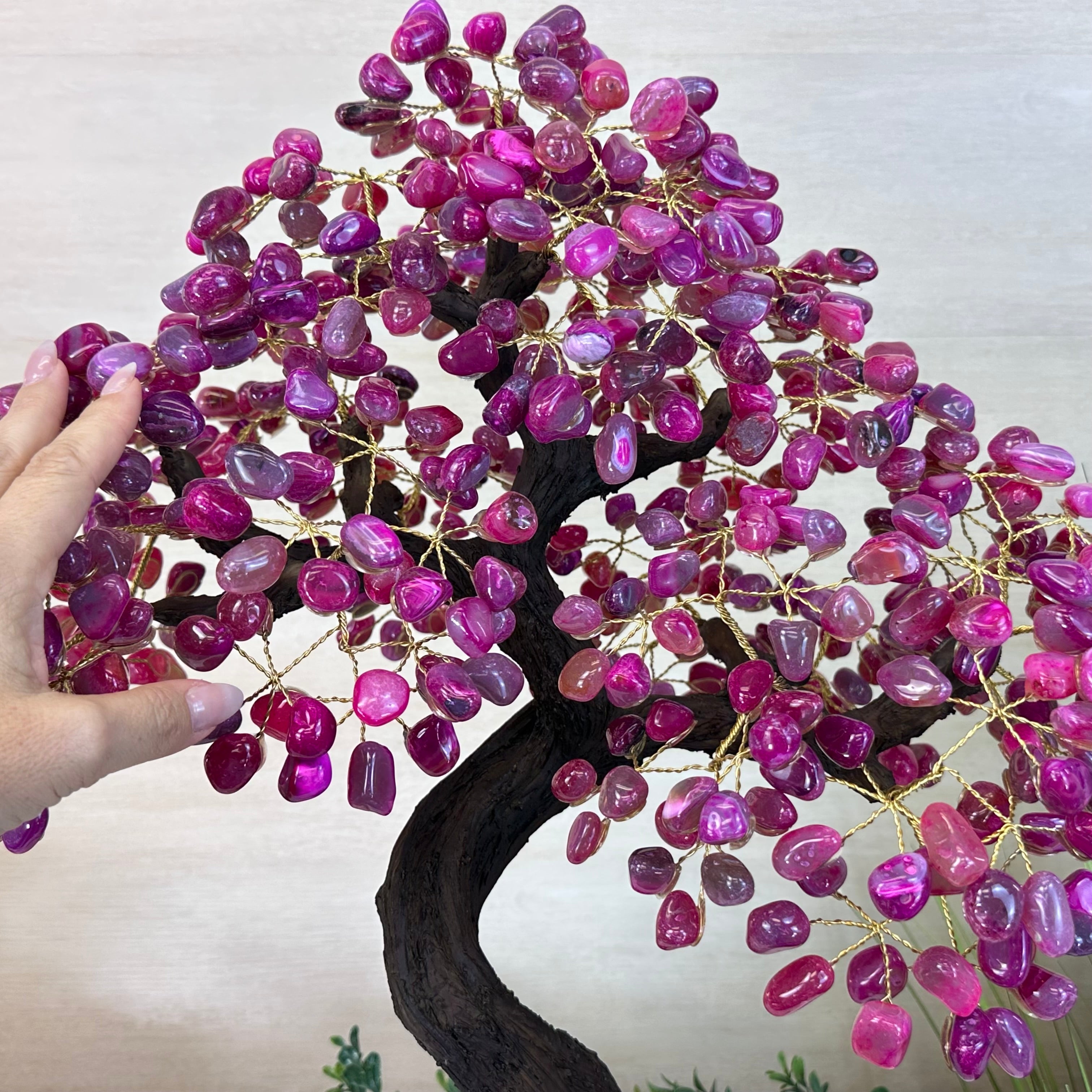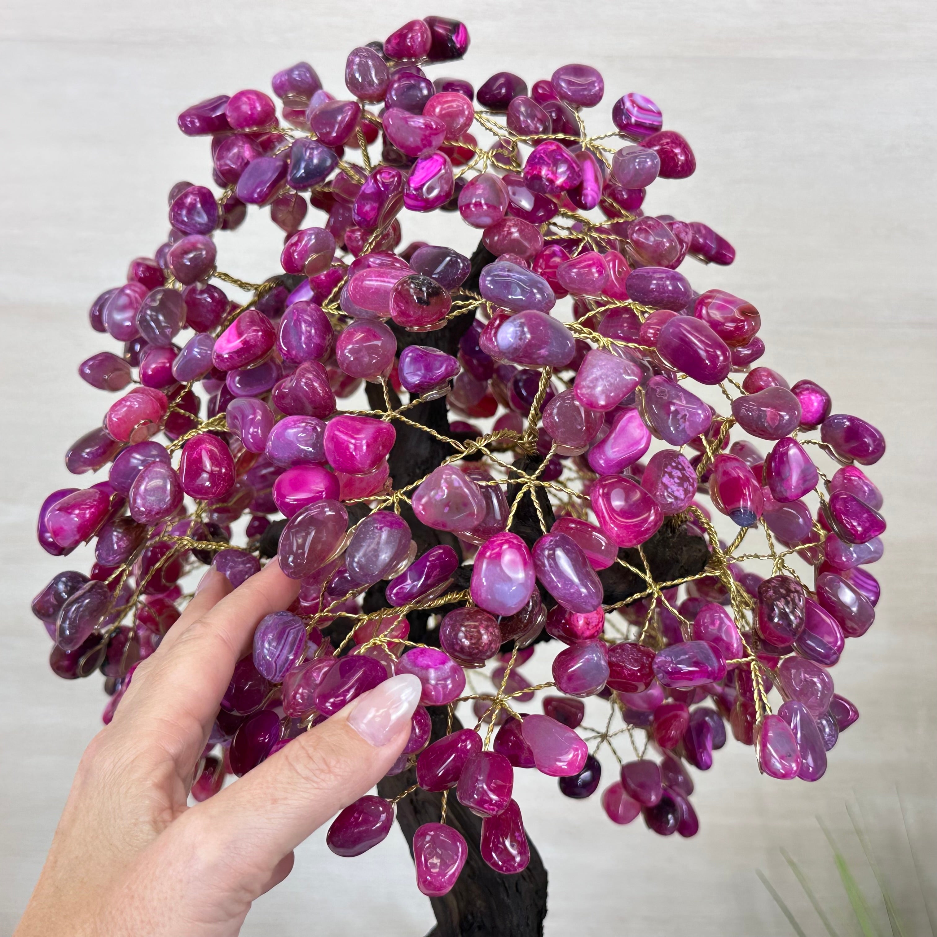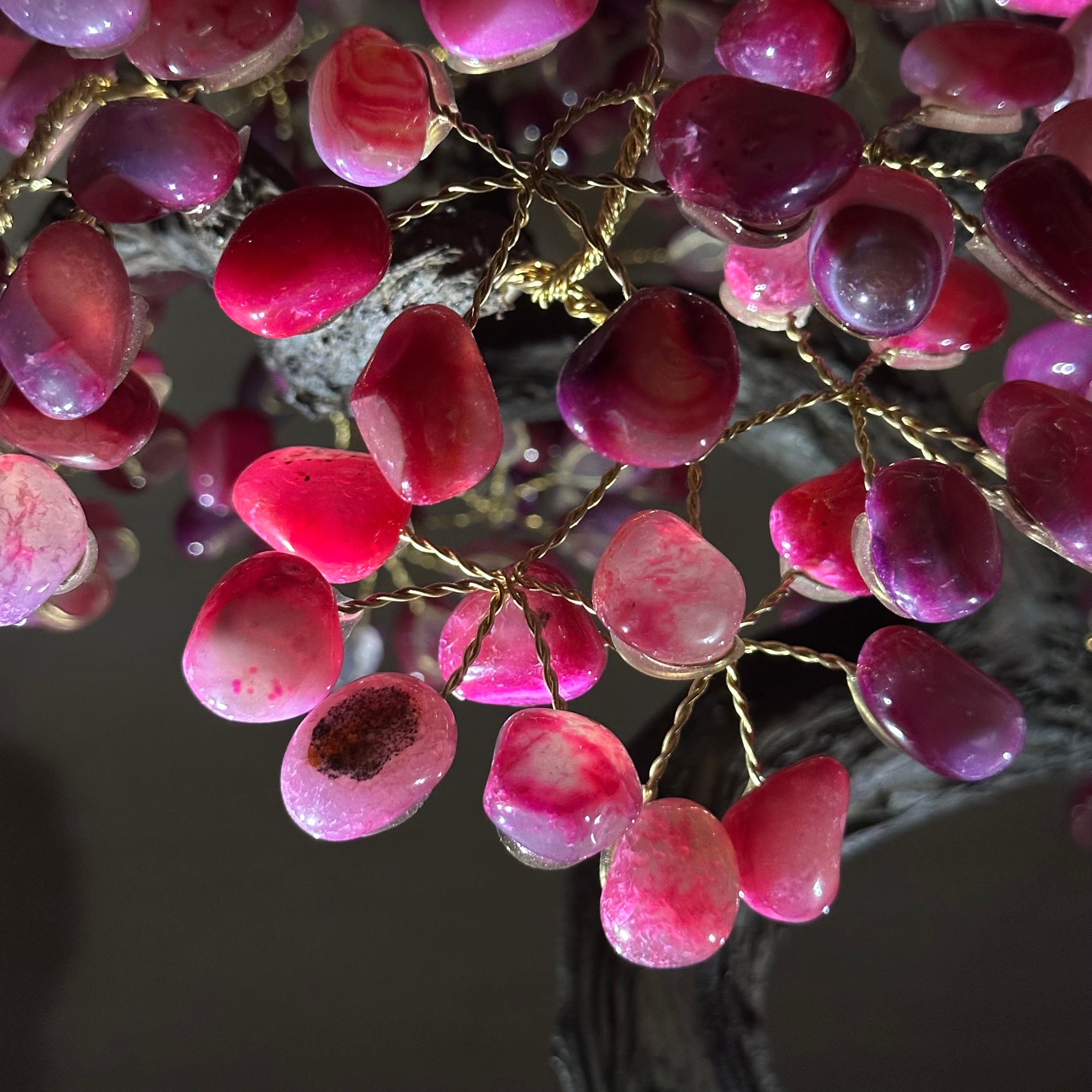 Their bases have a hand-selected crystal cluster, chosen for its size and beauty, commanding attention and admiration. Crafted with meticulous care by skilled artisans, the resin trunk and delicately wired branches gracefully emerge, each branch meticulously adorned with lustrous tumbled gemstones.