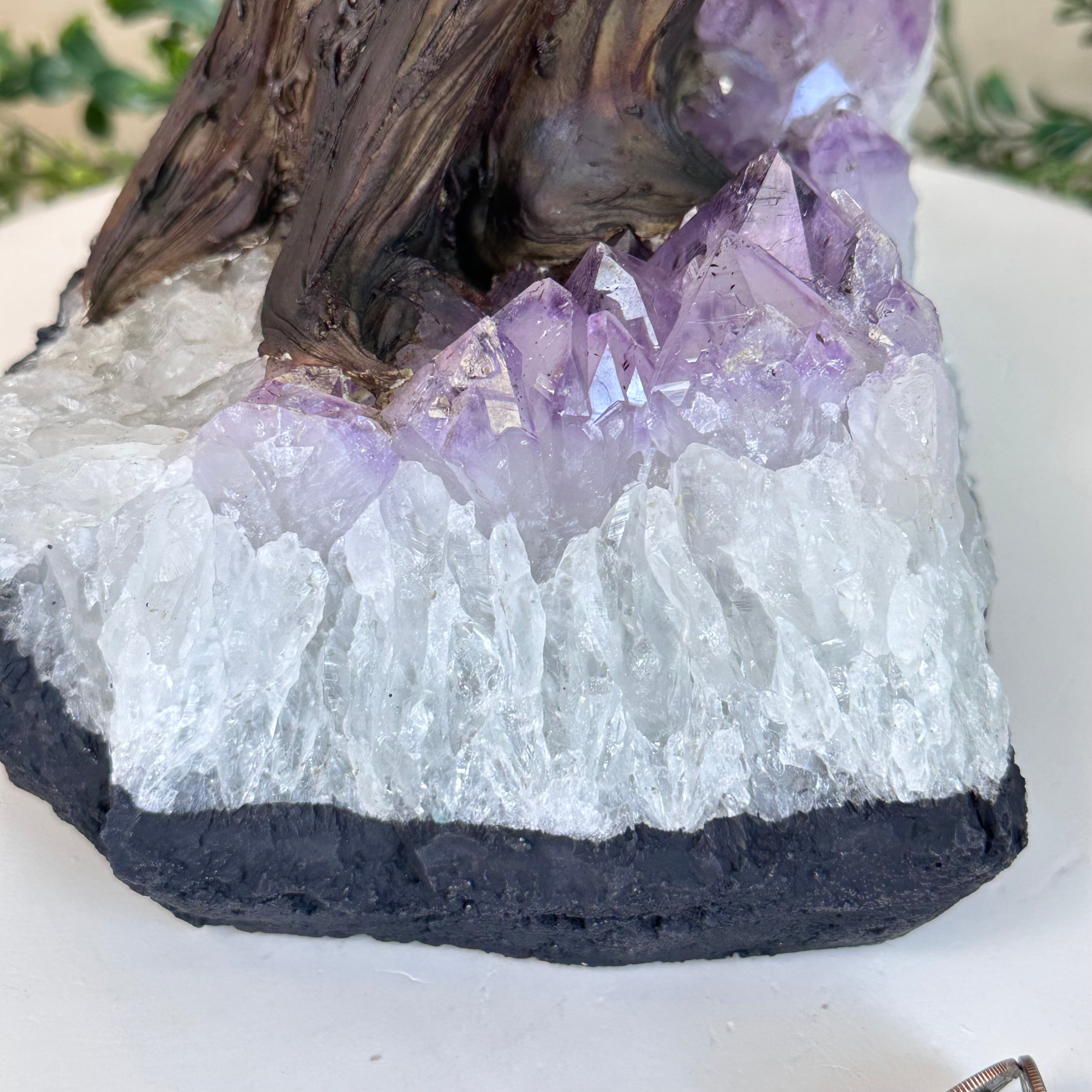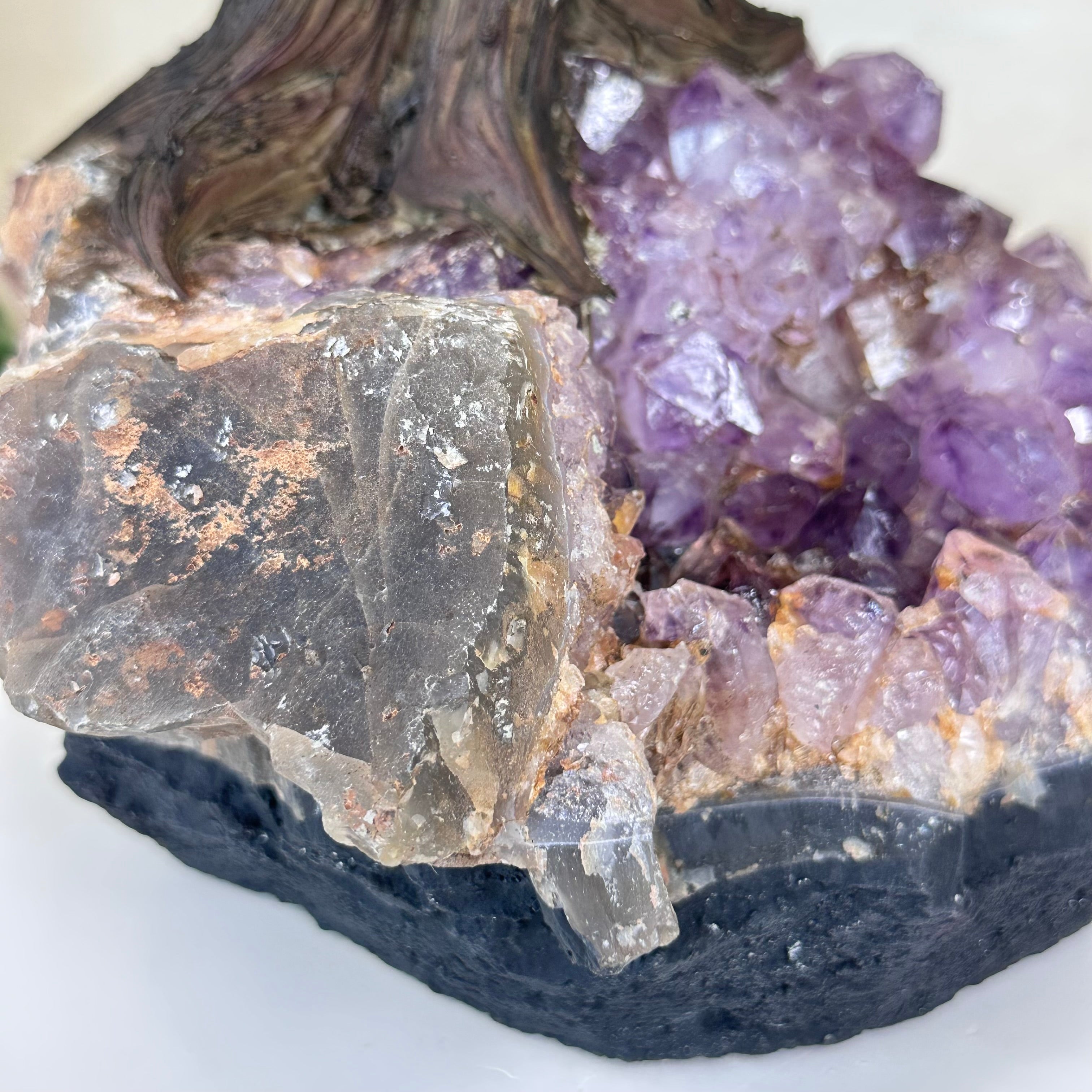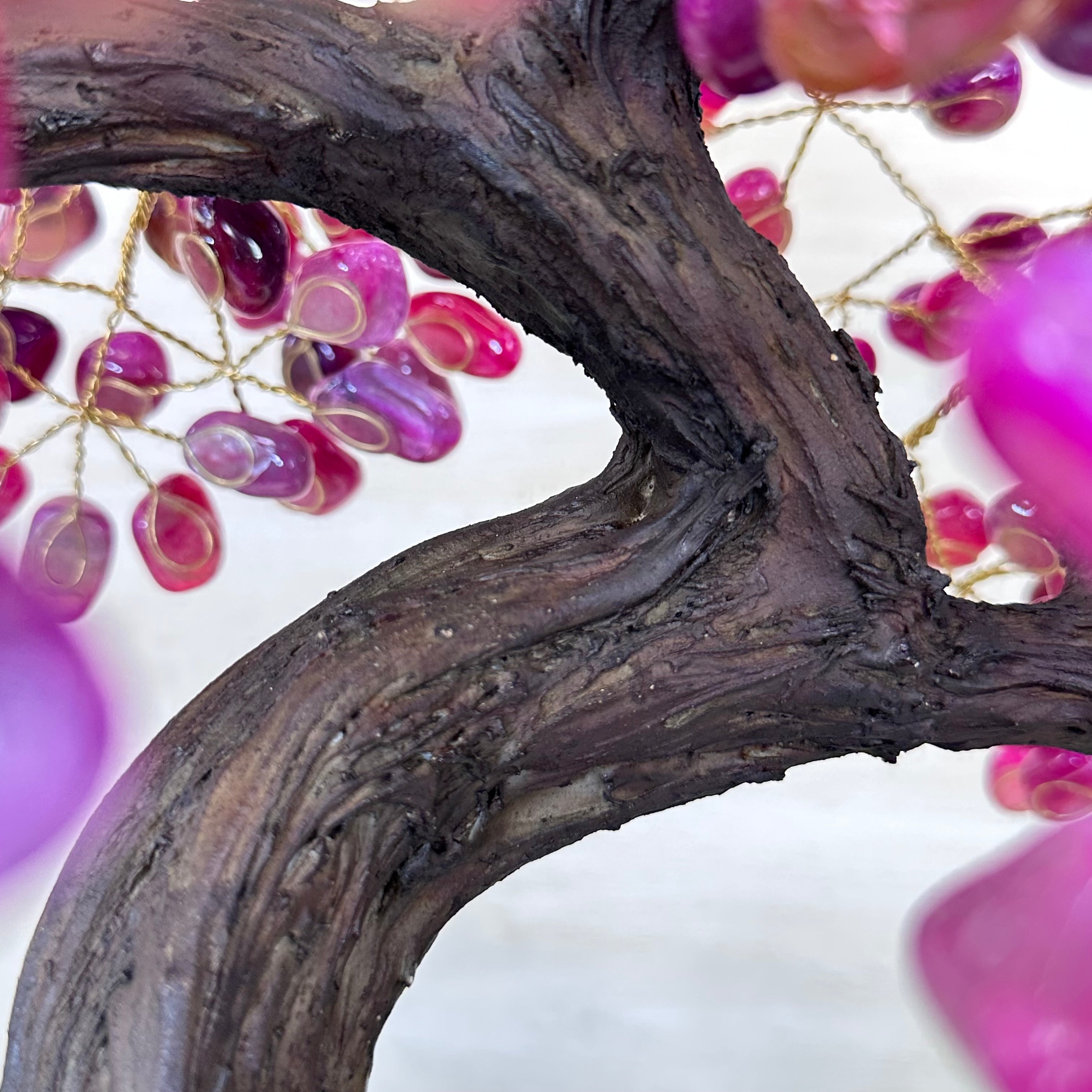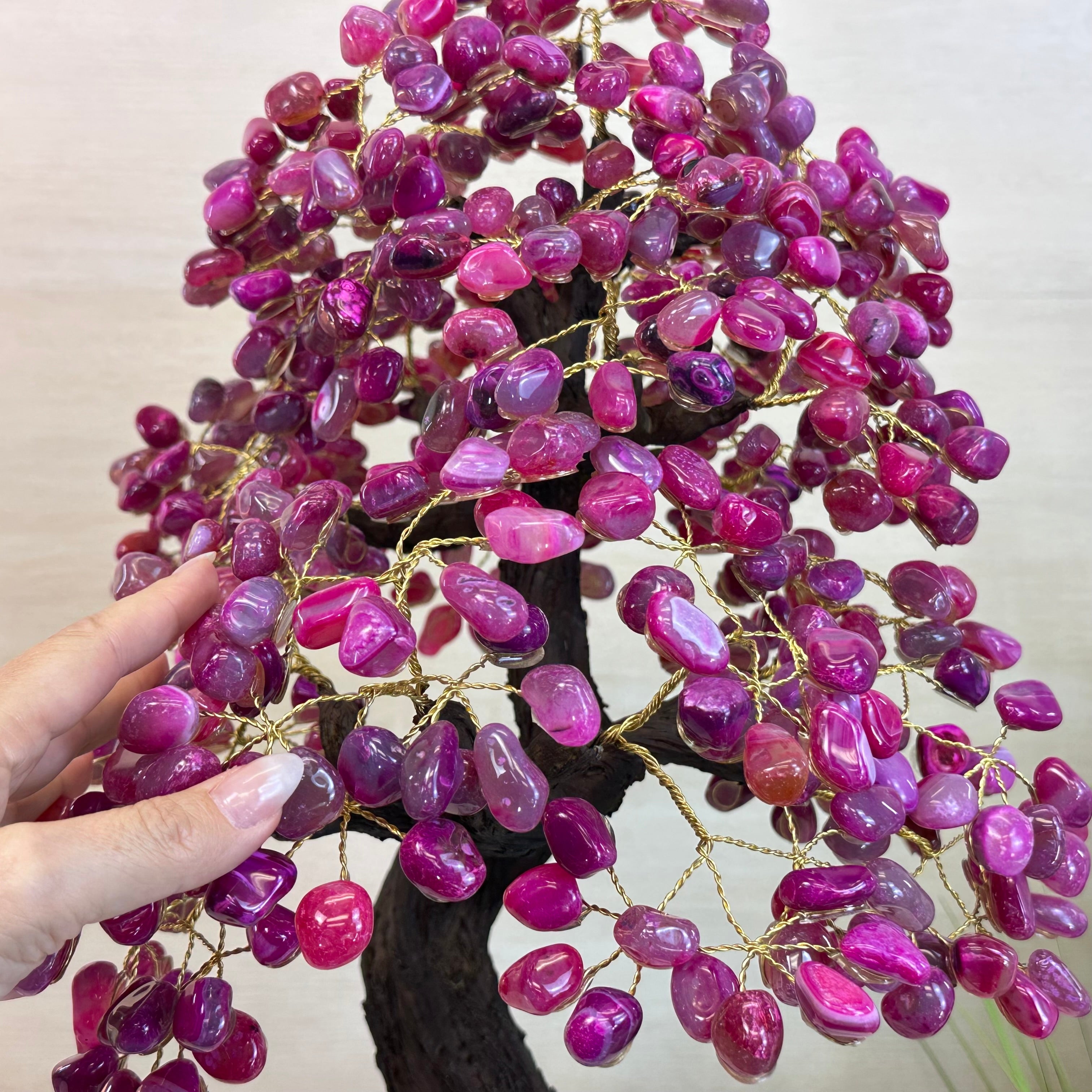 Their bases have a hand-selected crystal cluster, chosen for its size and beauty, commanding attention and admiration. Crafted with meticulous care by skilled artisans, the resin trunk and delicately wired branches gracefully emerge, each branch meticulously adorned with lustrous tumbled gemstones.