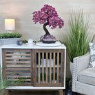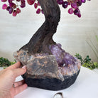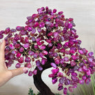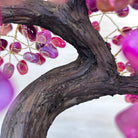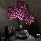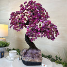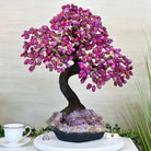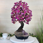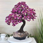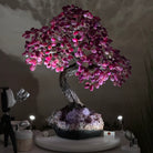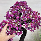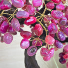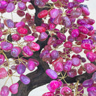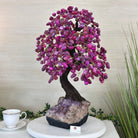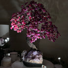 Nature and Artistry combine to create this Large Handmade Gemstone Tree with Pink Agate Gemstones as leaves. Set atop a large Amethyst cluster base, it has a masterfully detailed trunk and branches crafted from resin in a bonsai tree style and 108 wired branches supporting 540 tumbled gemstones.