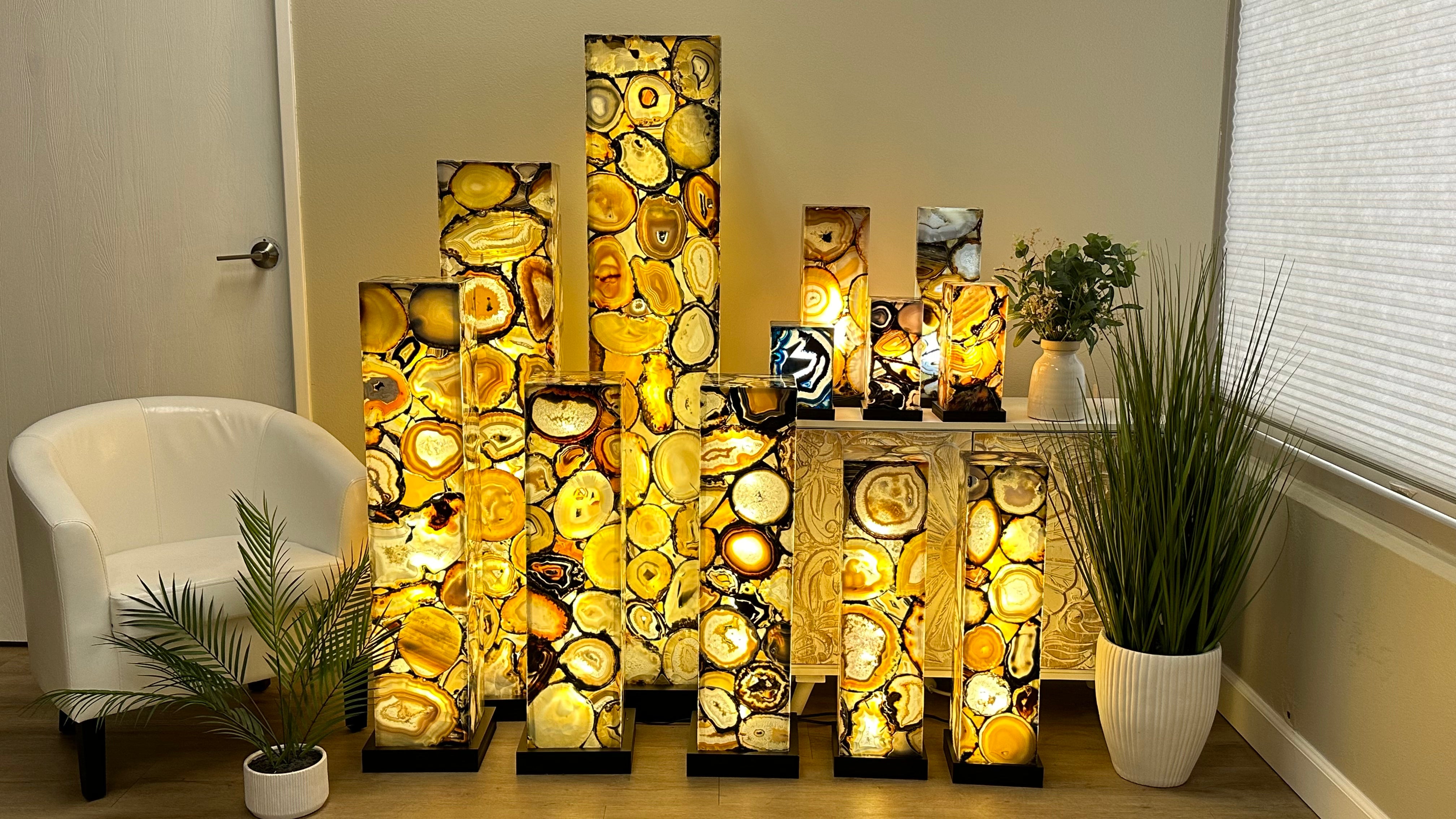 Brazil Gems® brings you Handmade LED floor lamps built with Natural Agate slices set with a clear resin and mounted on a wooden base. Amazing pieces of art that went through an extensive artisan process.