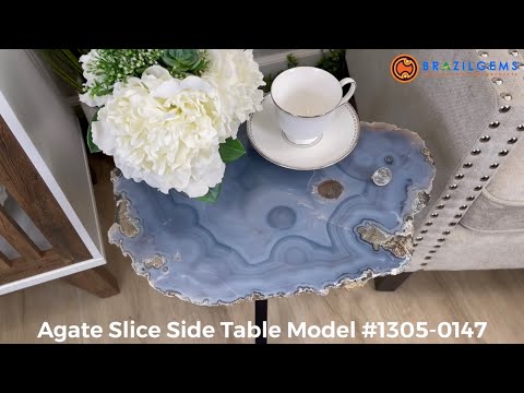 Large Natural Brazilian Agate side table w/ one slice of stone on a black metal base. Rough, natural edges complement its look. It can be used as a side table, corner table or accent table. This particular table has a perfectly round hole filled with a clear resin, no doubt that was the "discovery hole" for this large geode created by the miner.