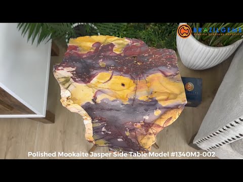 Large Natural Natural Mookaite Jasper Side Table w/ one slice of stone on a gold colored metal base. An amazing specimen with vibrant colors to accent the decor of your home.