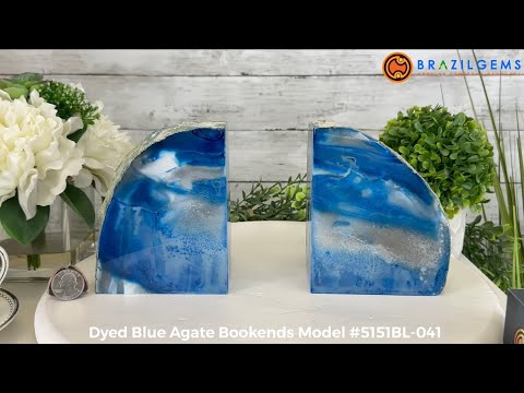 Crafted from a single piece of genuine Brazilian agate, these bookends are cut in half and polished to reveal mesmerizing bands of color. Each set is unique, with striking patterns enhanced by a rich Blue dye.