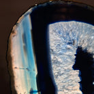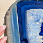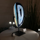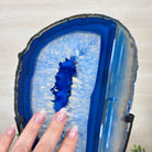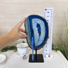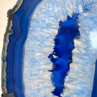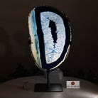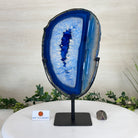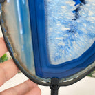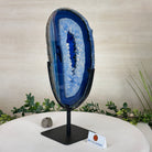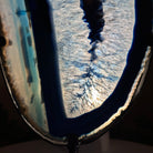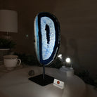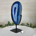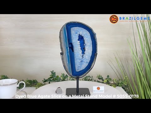 Enhance your decor with this bright slice of Brazilian Blue Agate (dyed blue) beautifully placed on a metal stand by Brazil Gems®. With its striking colors, well defined bands and drusy crystals, this is nature's work of millions of years now available to you.