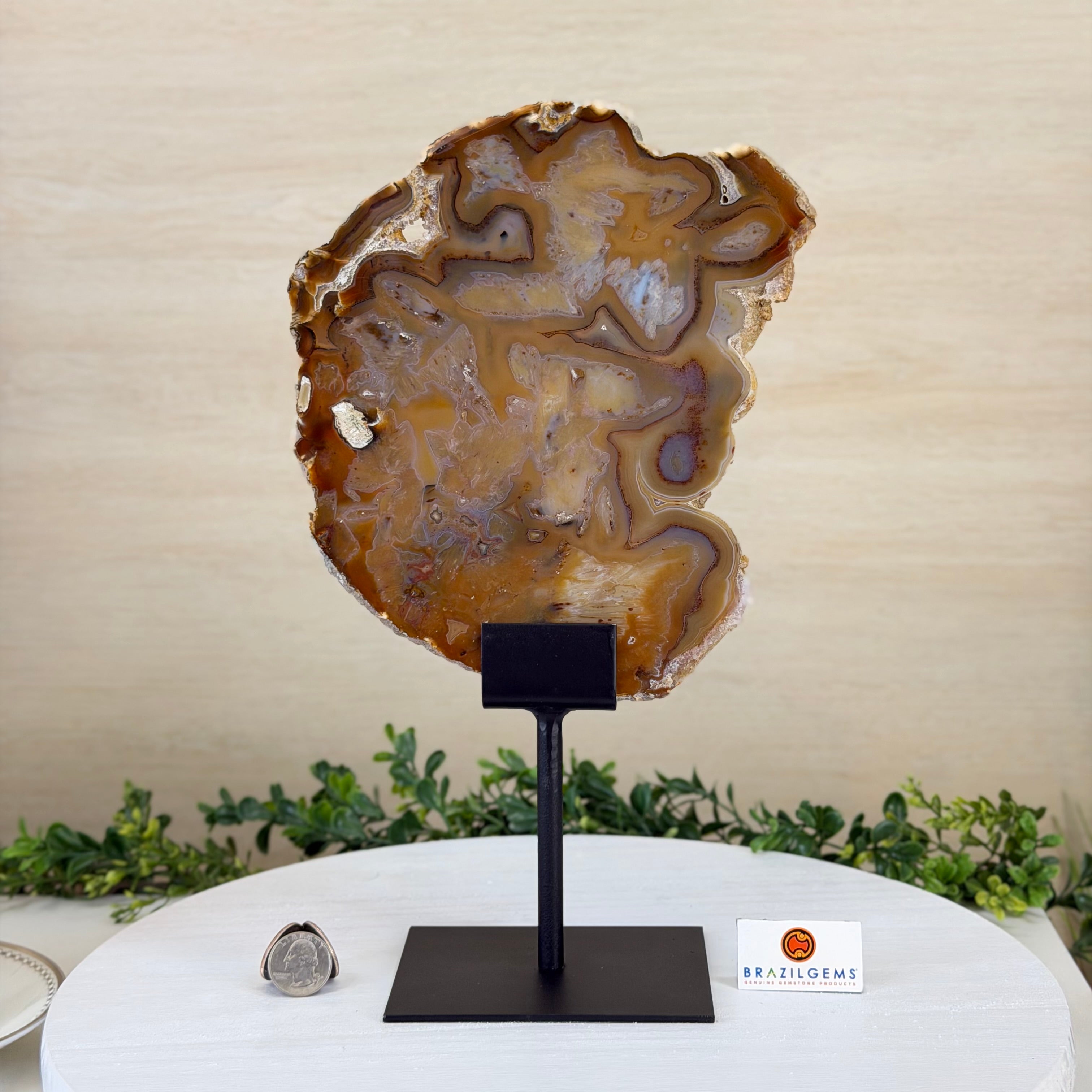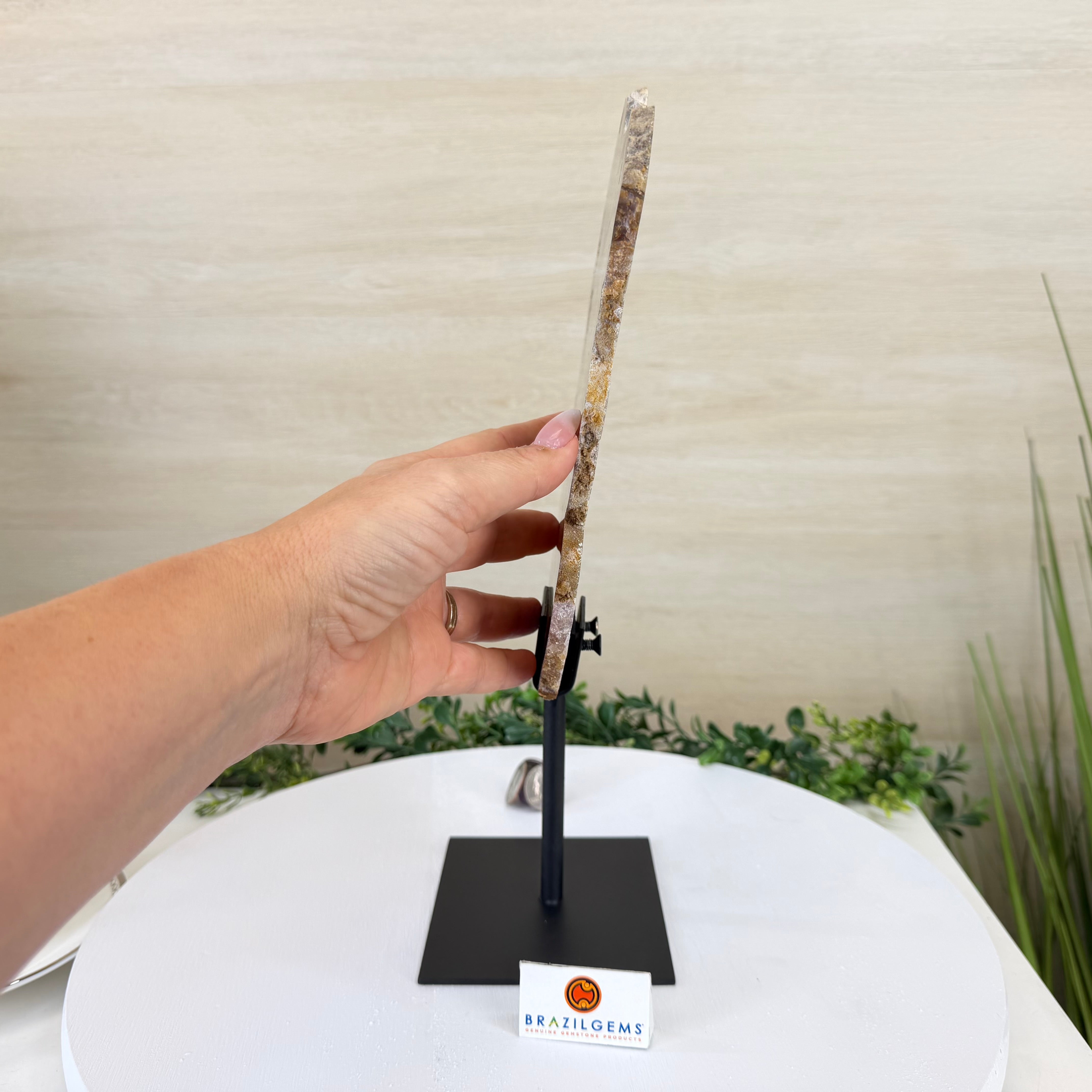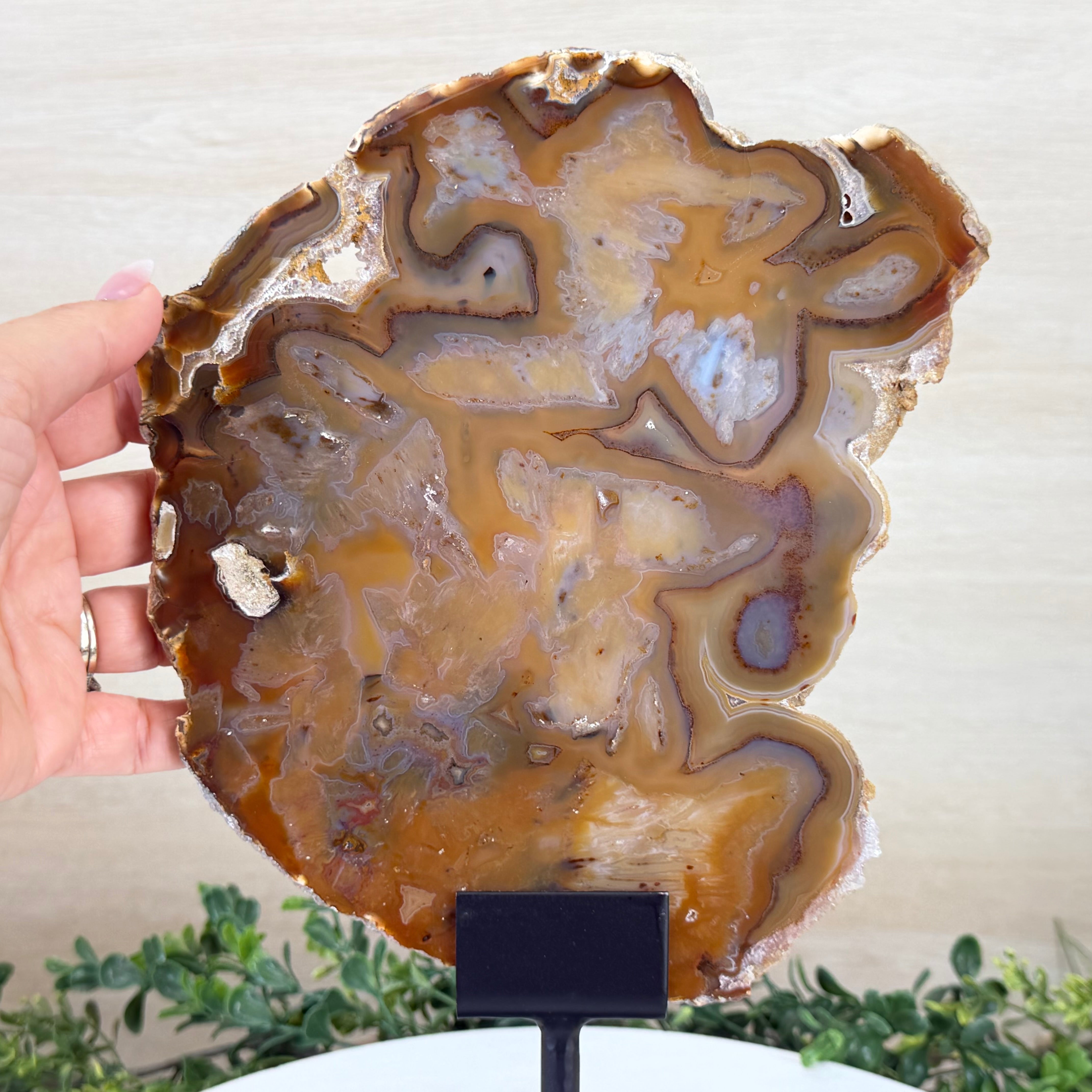 Special natural Brazilian Agate slice, expertly mounted on a sleek metal stand. Millions of years in the making, this gem reveals mesmerizing bands, crystals, and translucent layers that glow when backlit.