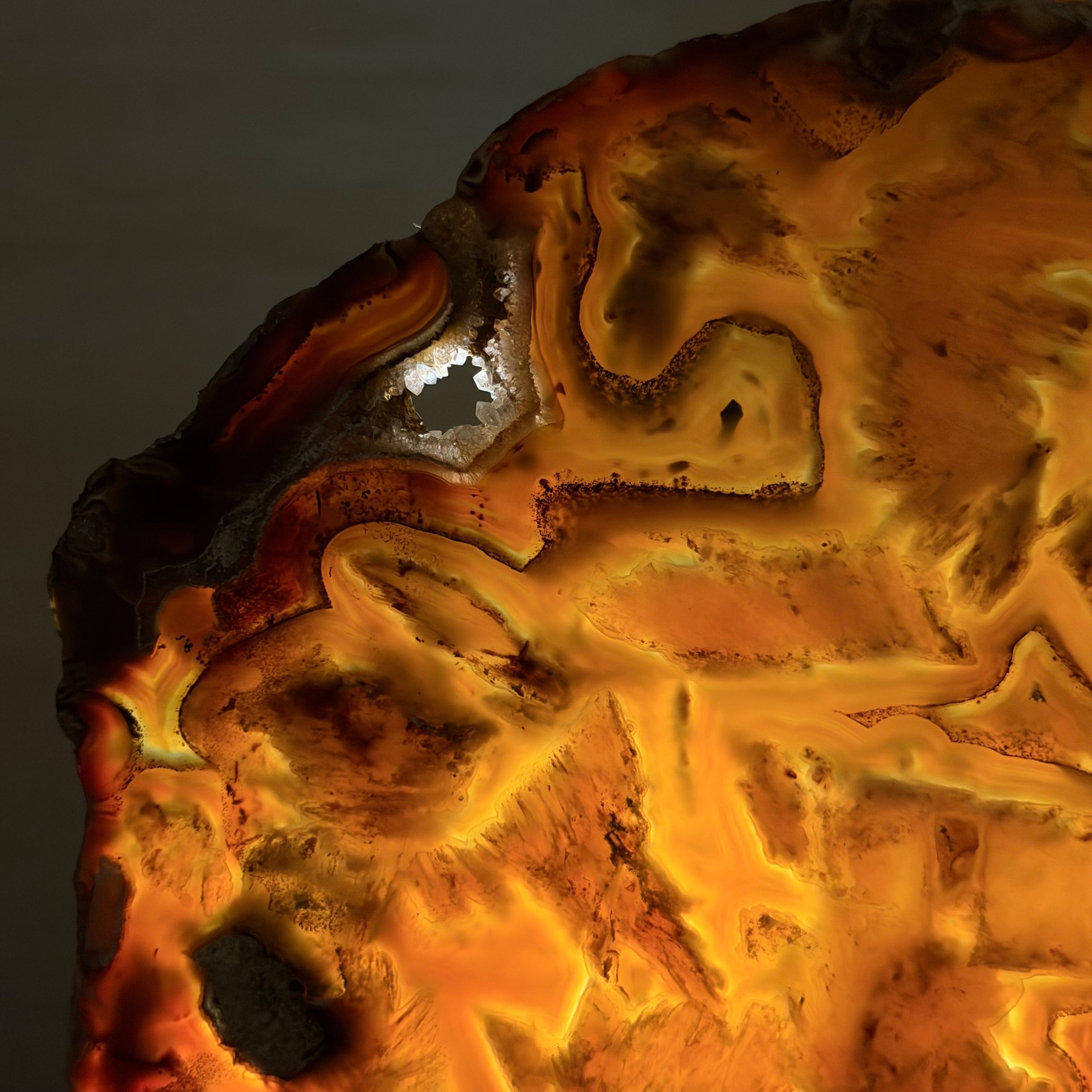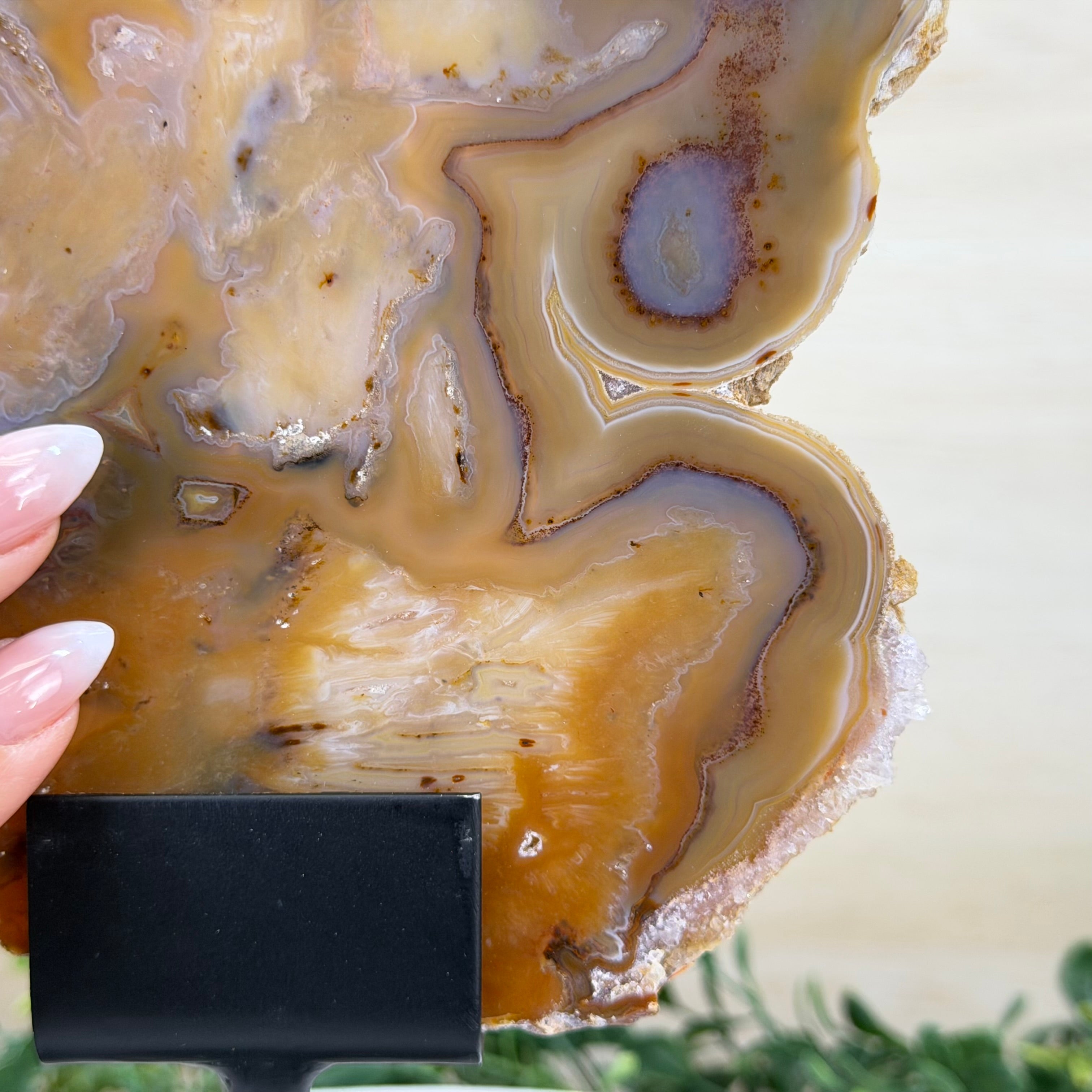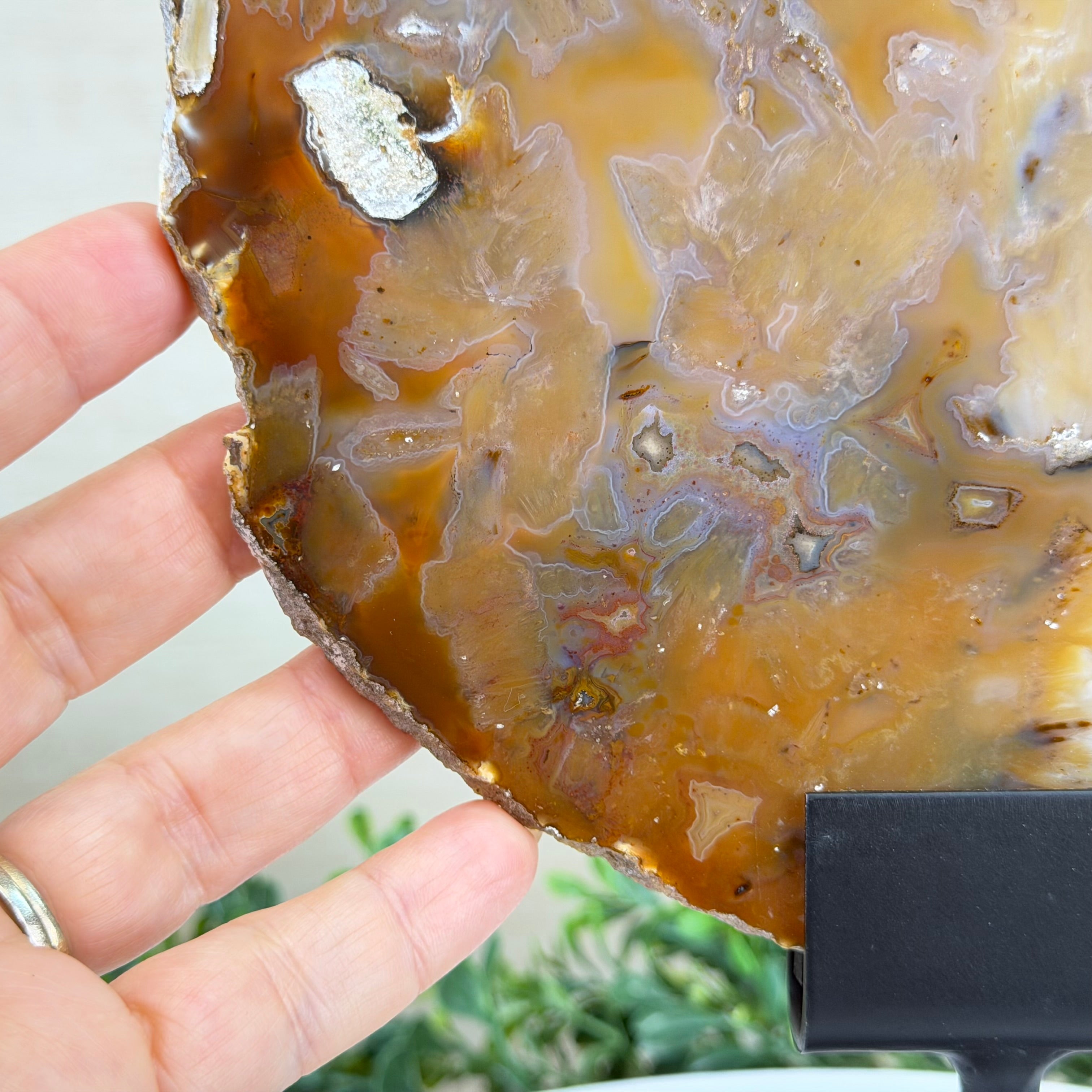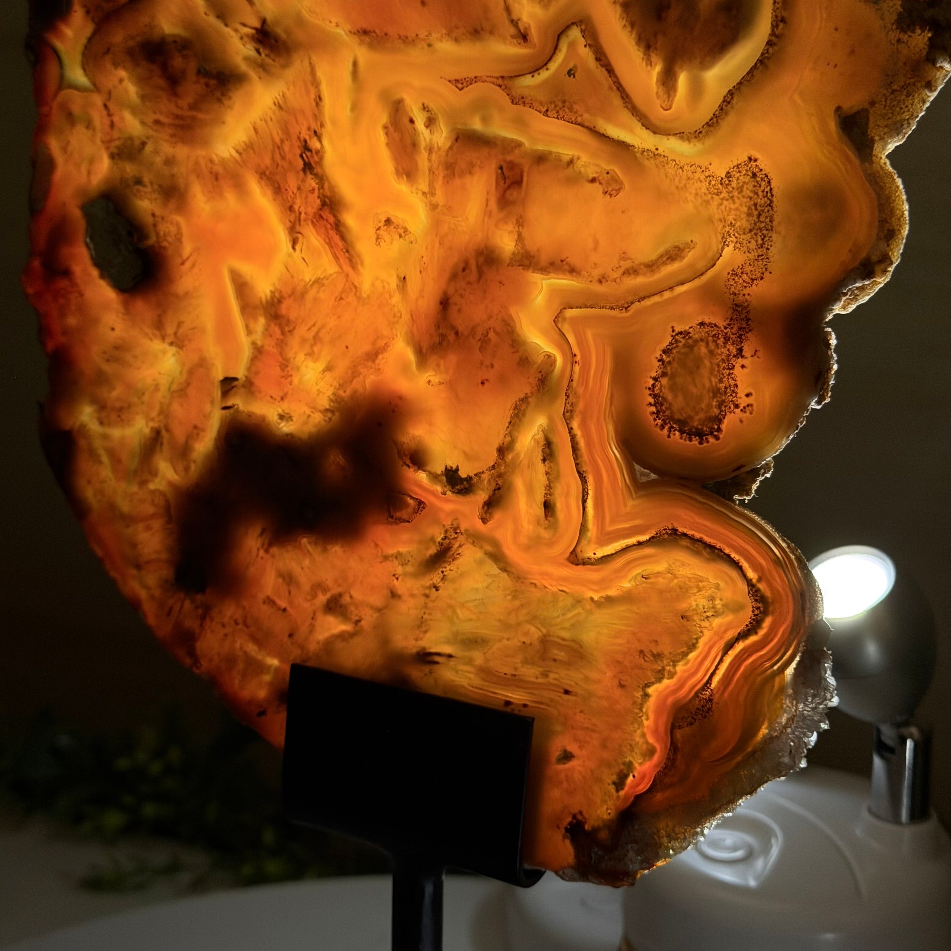 Special natural Brazilian Agate slice, expertly mounted on a sleek metal stand. Millions of years in the making, this gem reveals mesmerizing bands, crystals, and translucent layers that glow when backlit.
