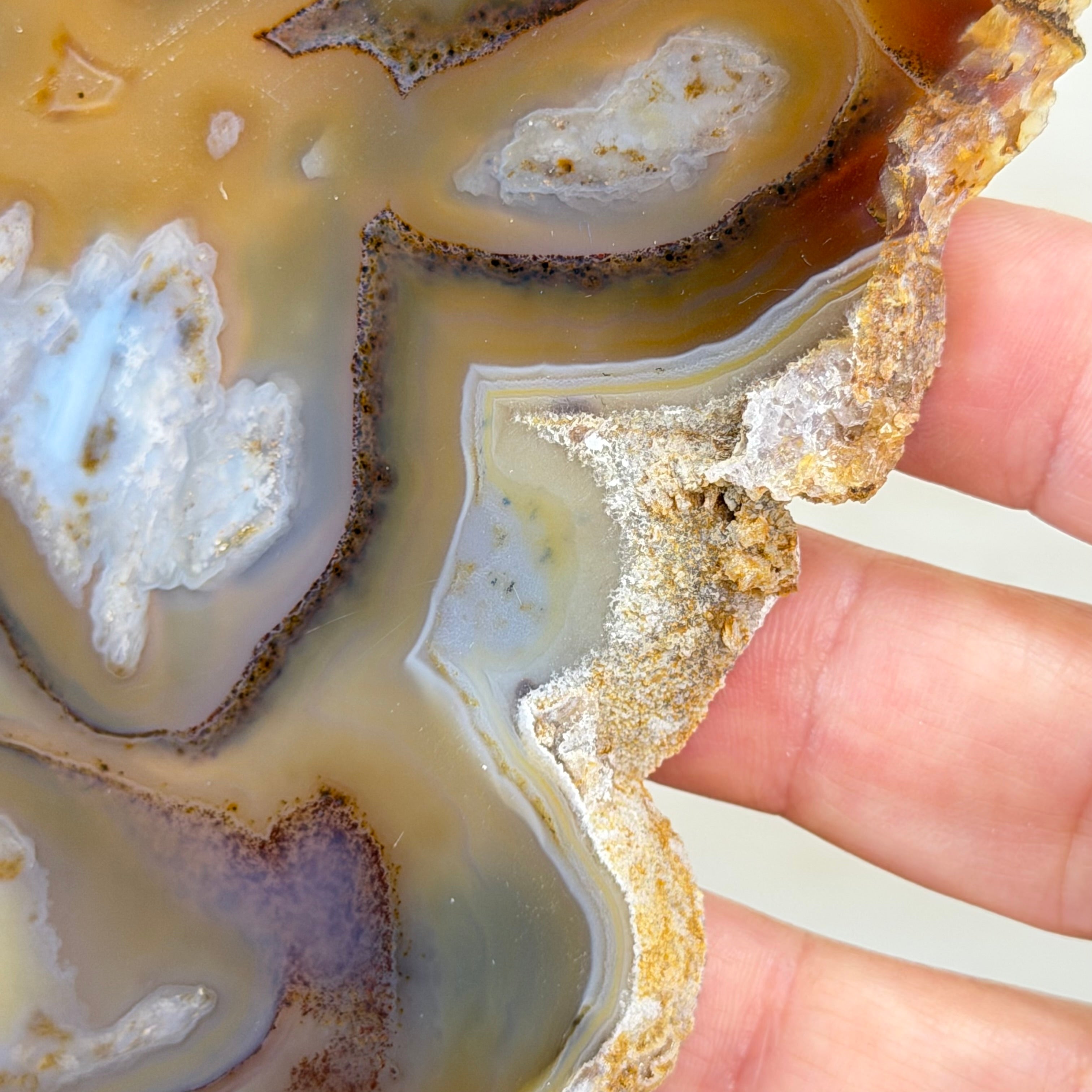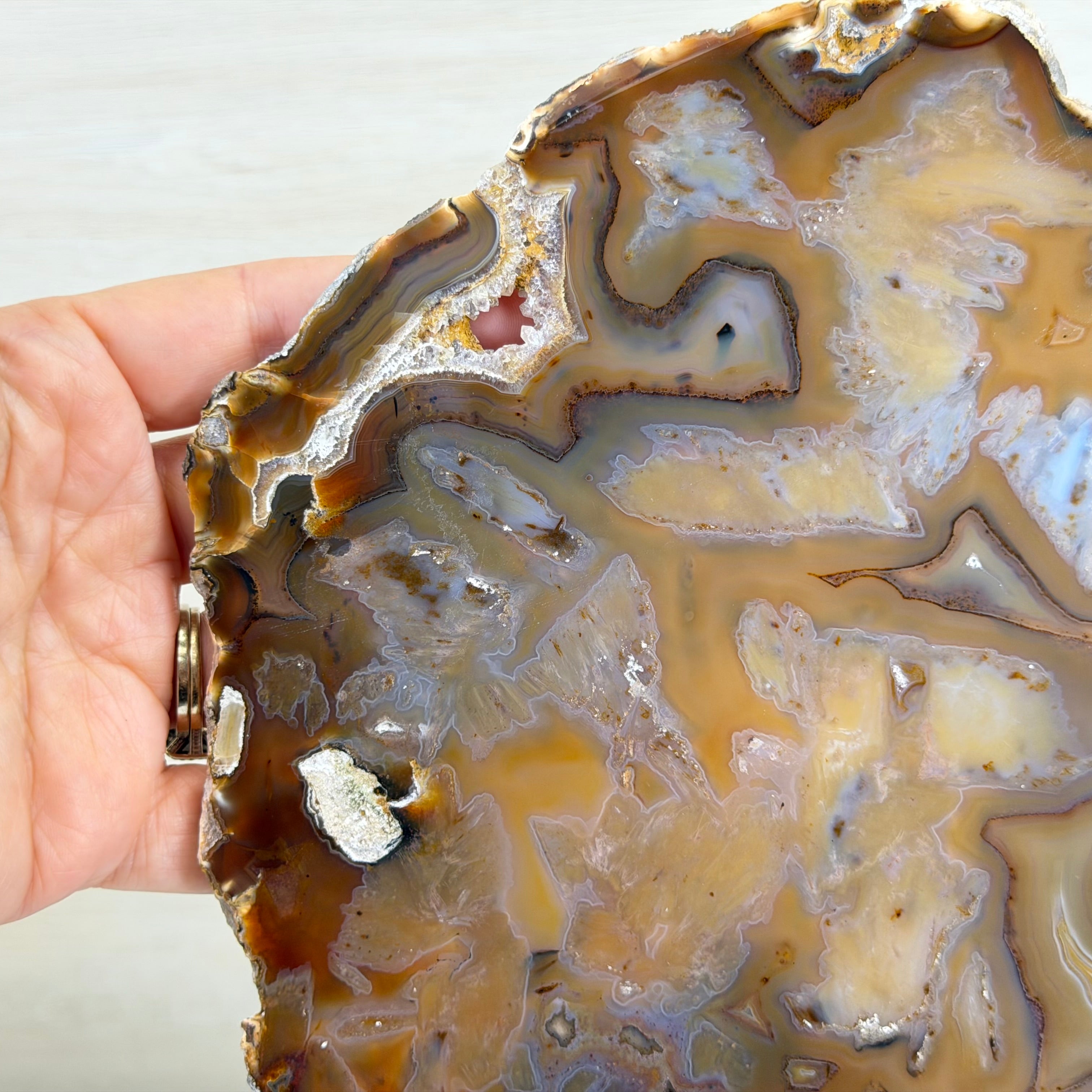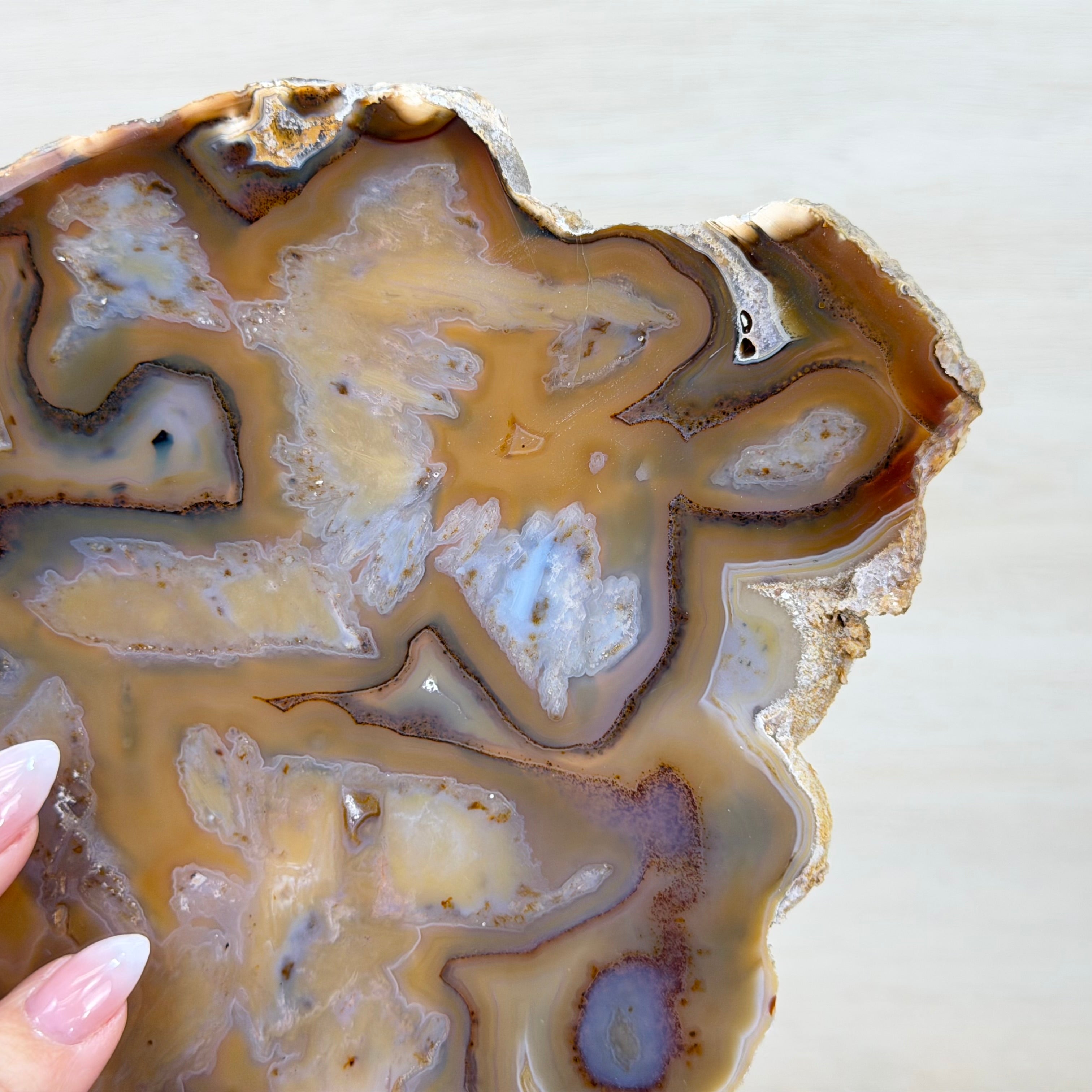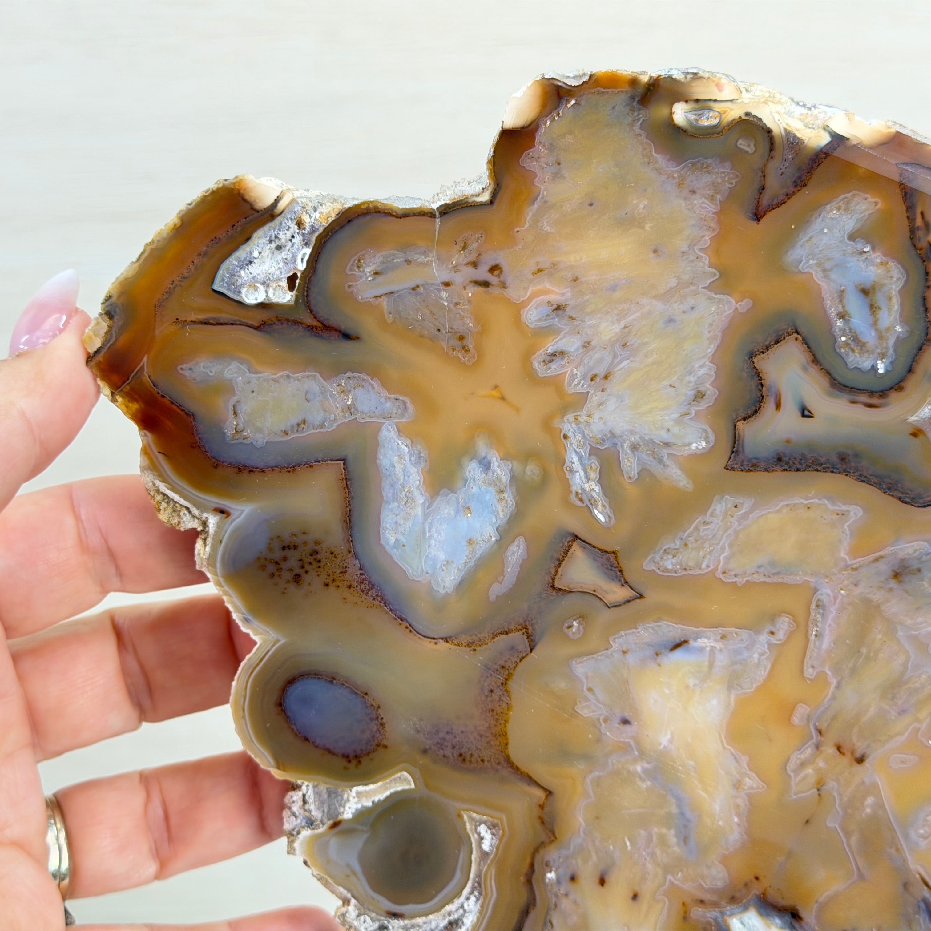 Slicing such a delicate piece is risky and time-intensive; the cutter never knows the hidden beauty until the final reveal. This one is breathtaking!