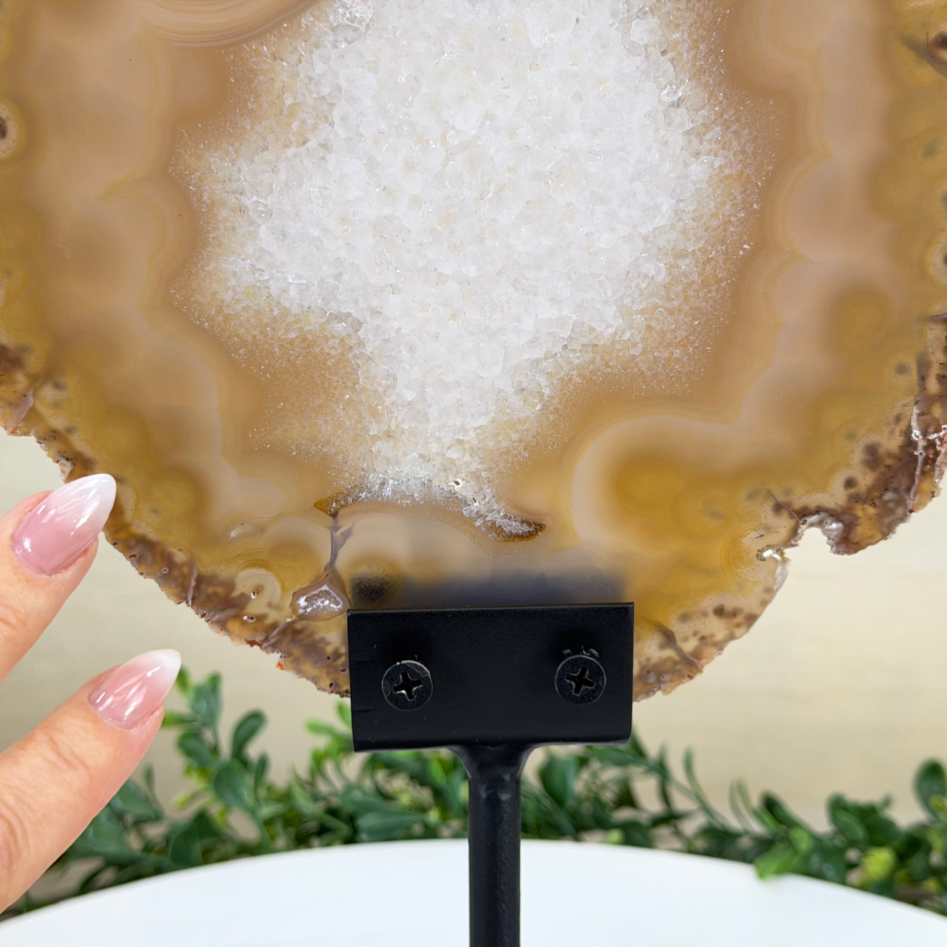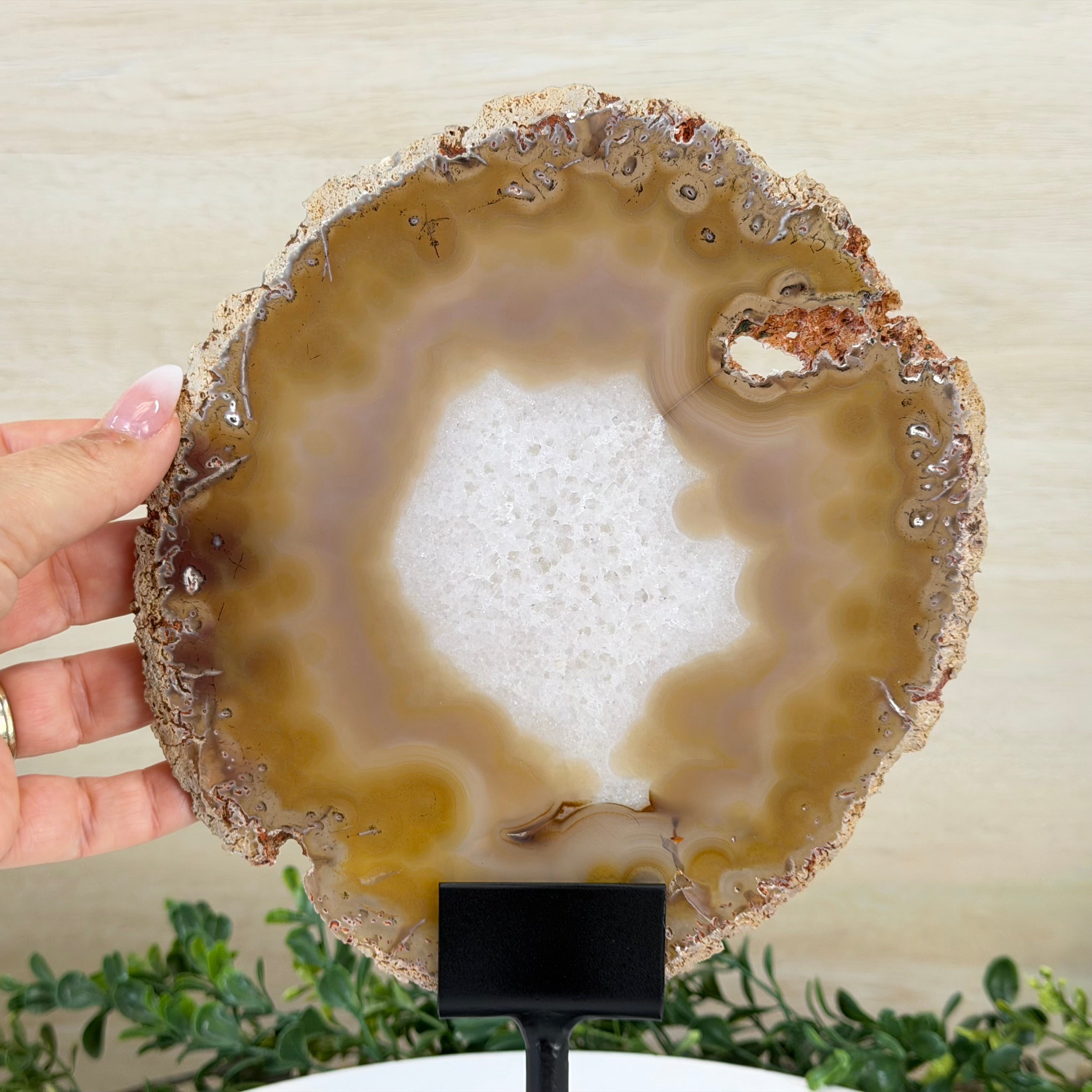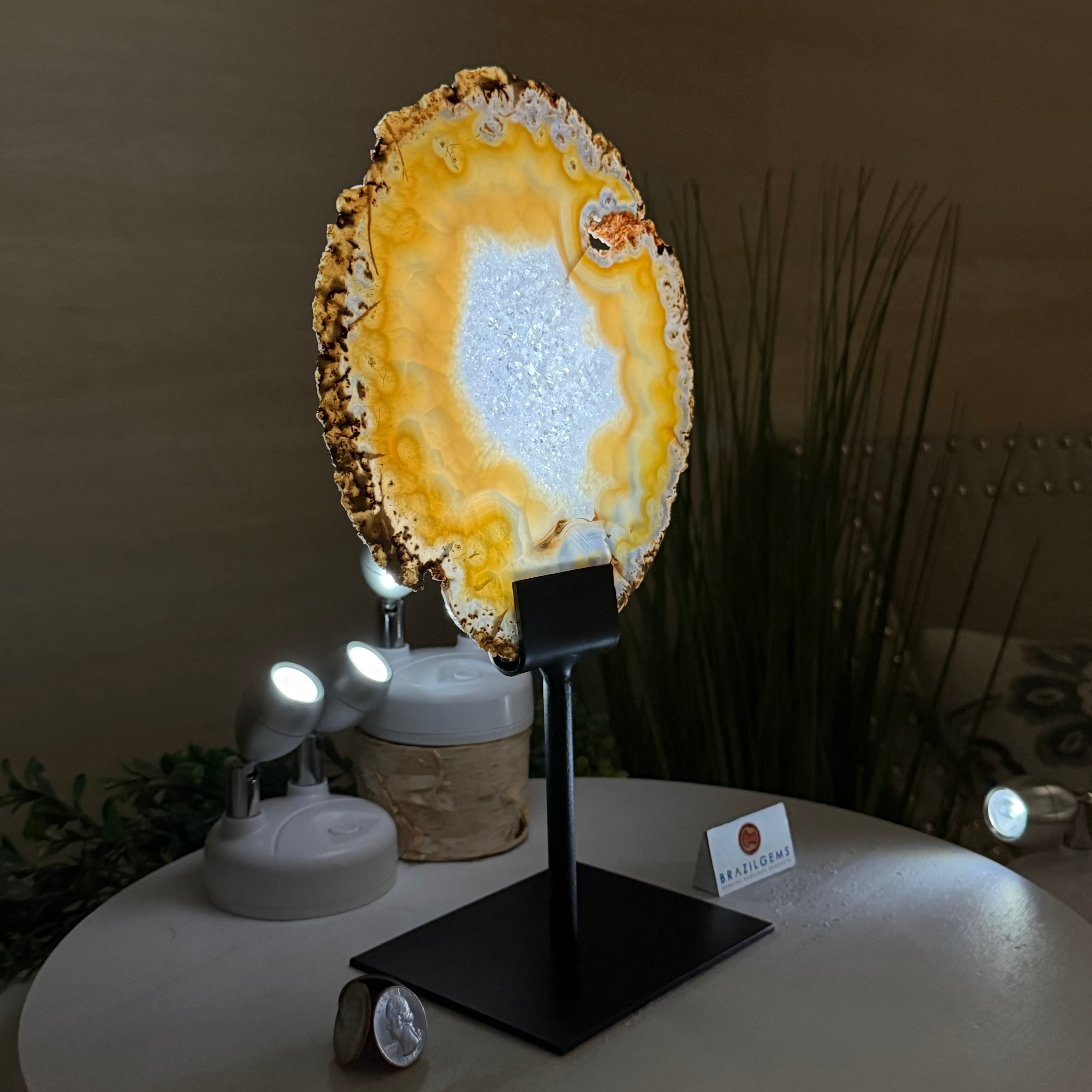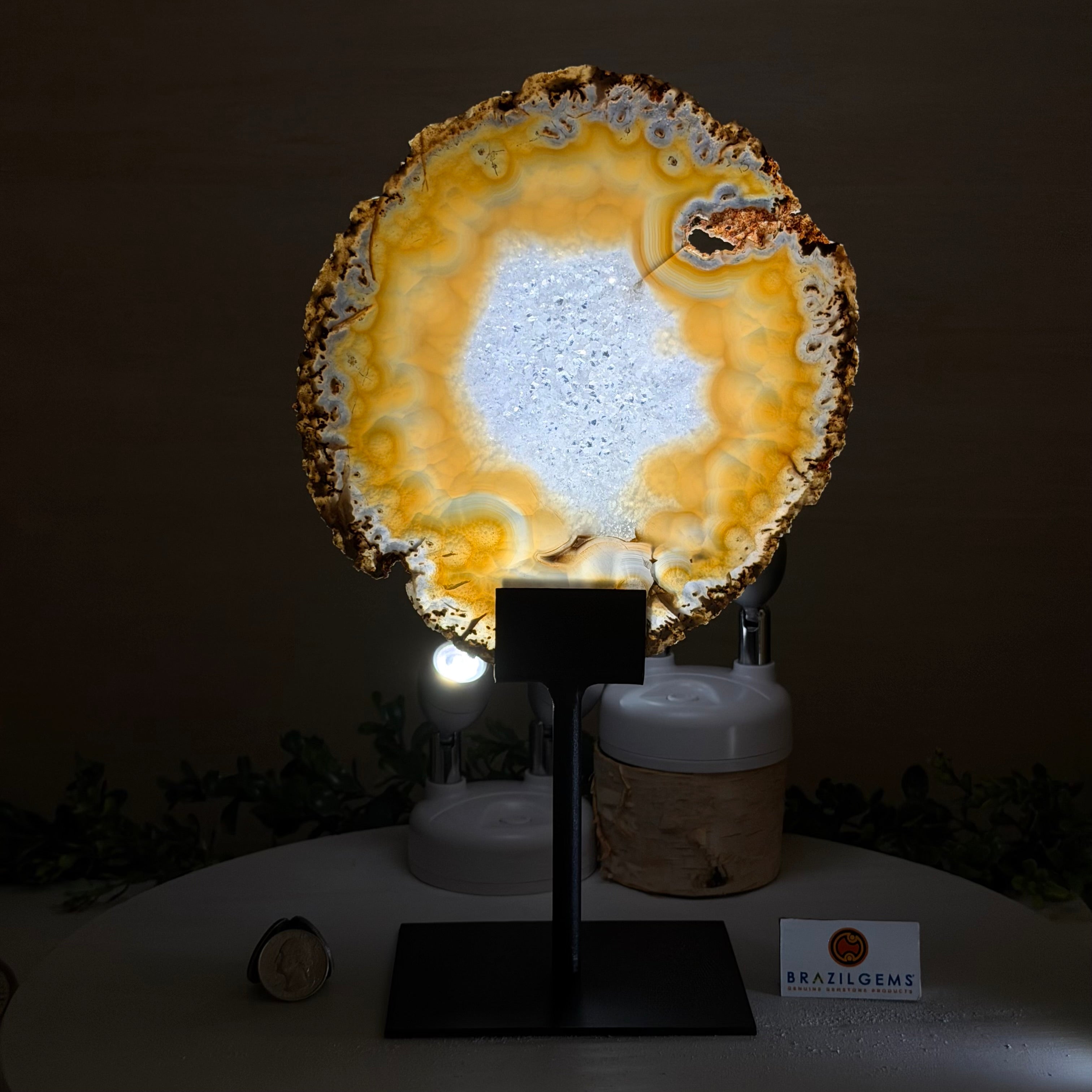 Special natural Brazilian Agate slice, expertly mounted on a sleek metal stand. Millions of years in the making, this gem reveals mesmerizing bands, crystals, and translucent layers that glow when backlit.