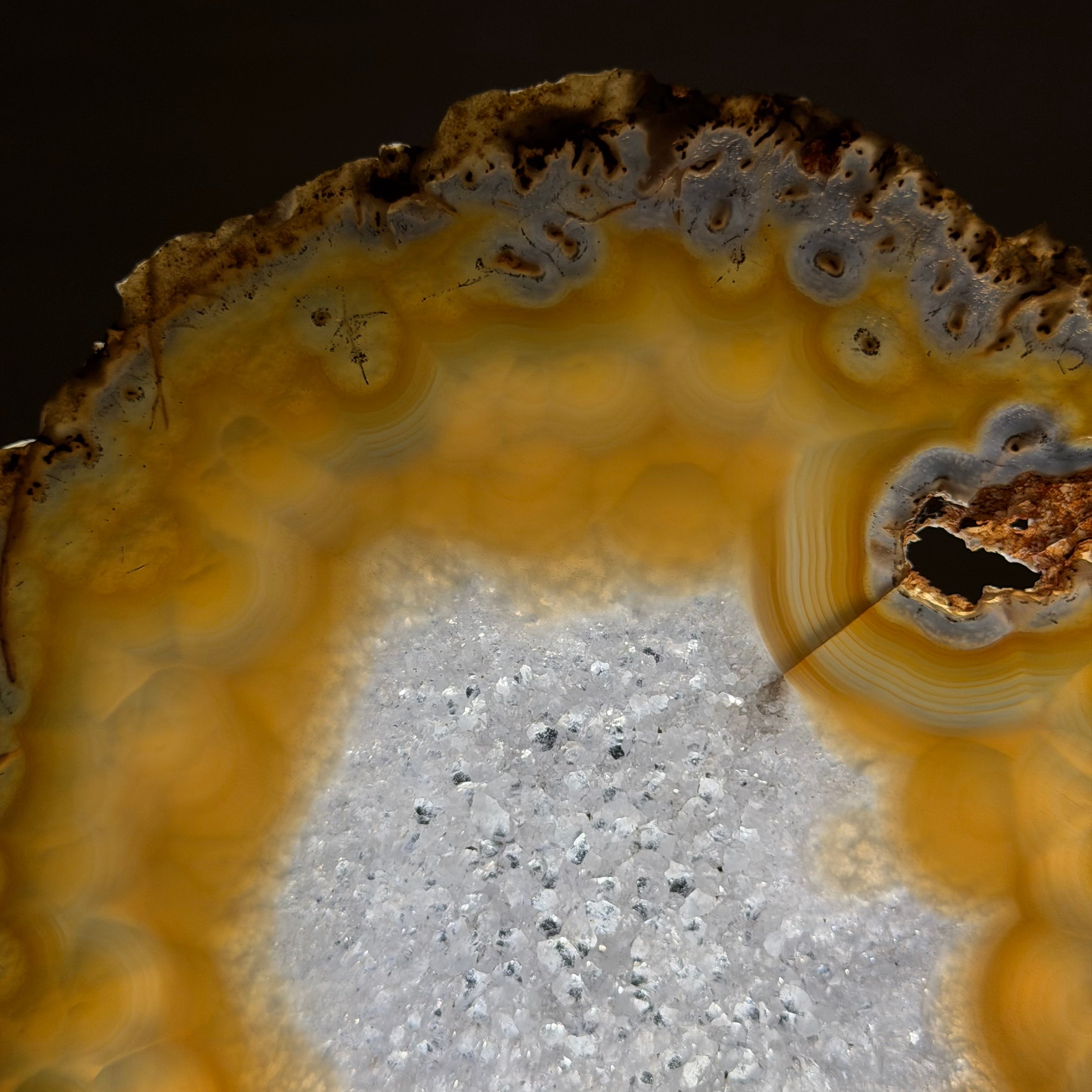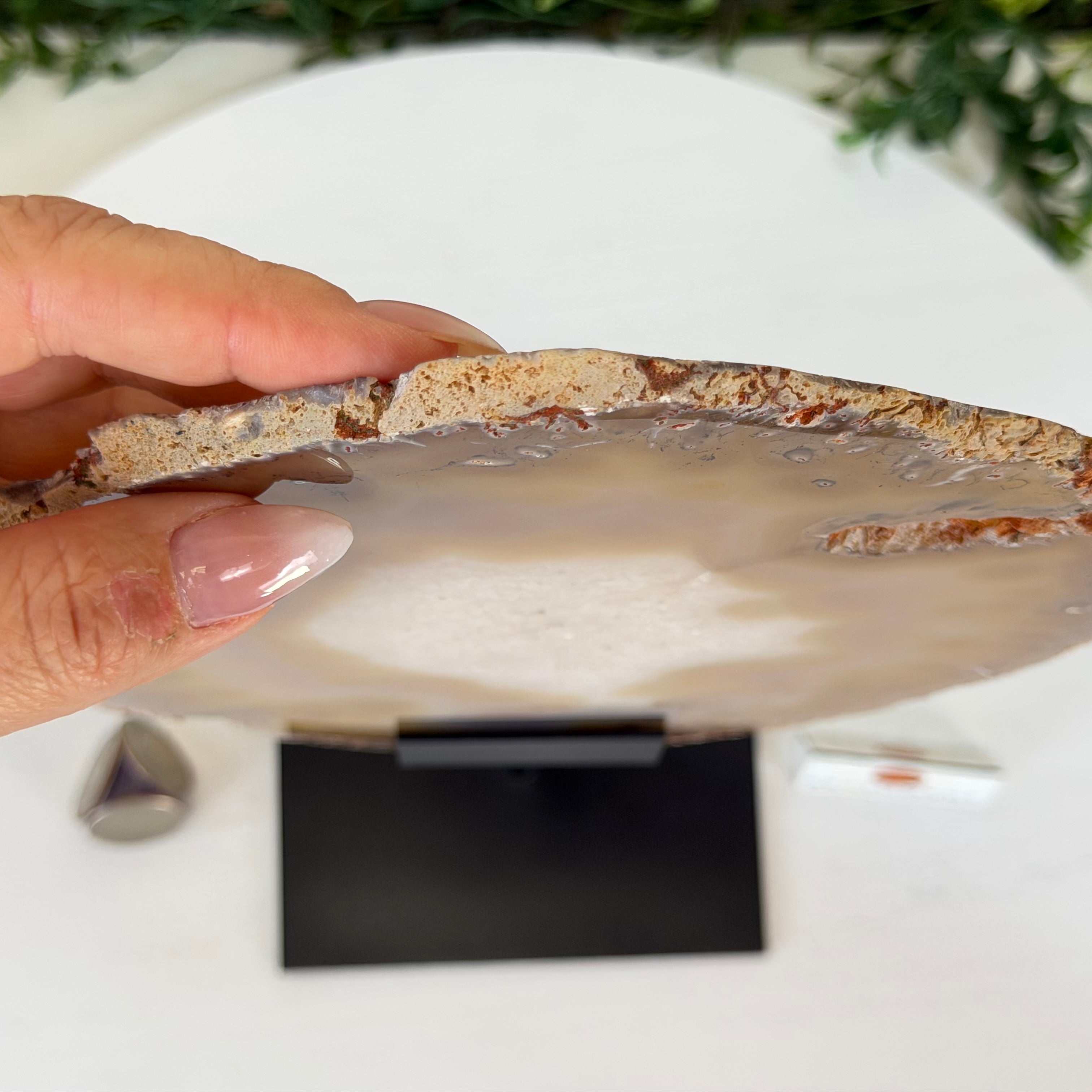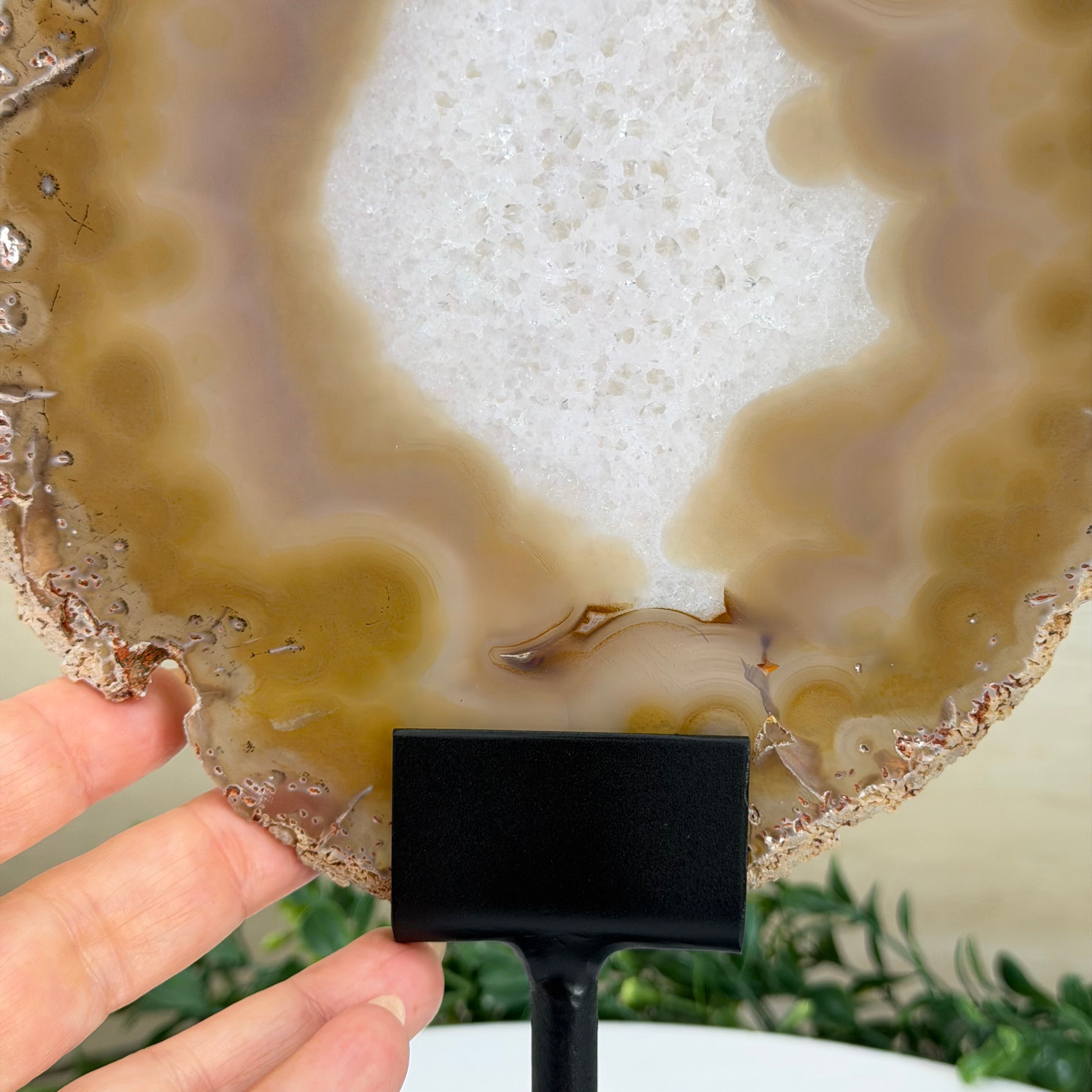 Special natural Brazilian Agate slice, expertly mounted on a sleek metal stand. Millions of years in the making, this gem reveals mesmerizing bands, crystals, and translucent layers that glow when backlit.