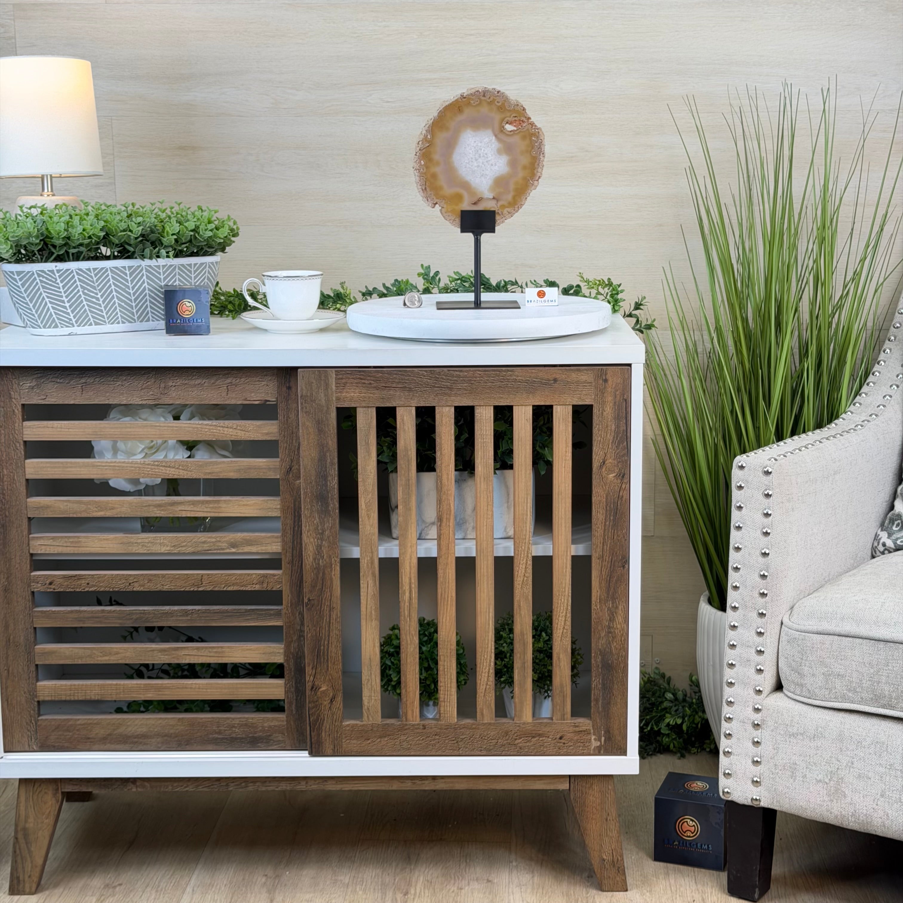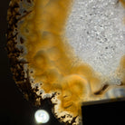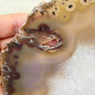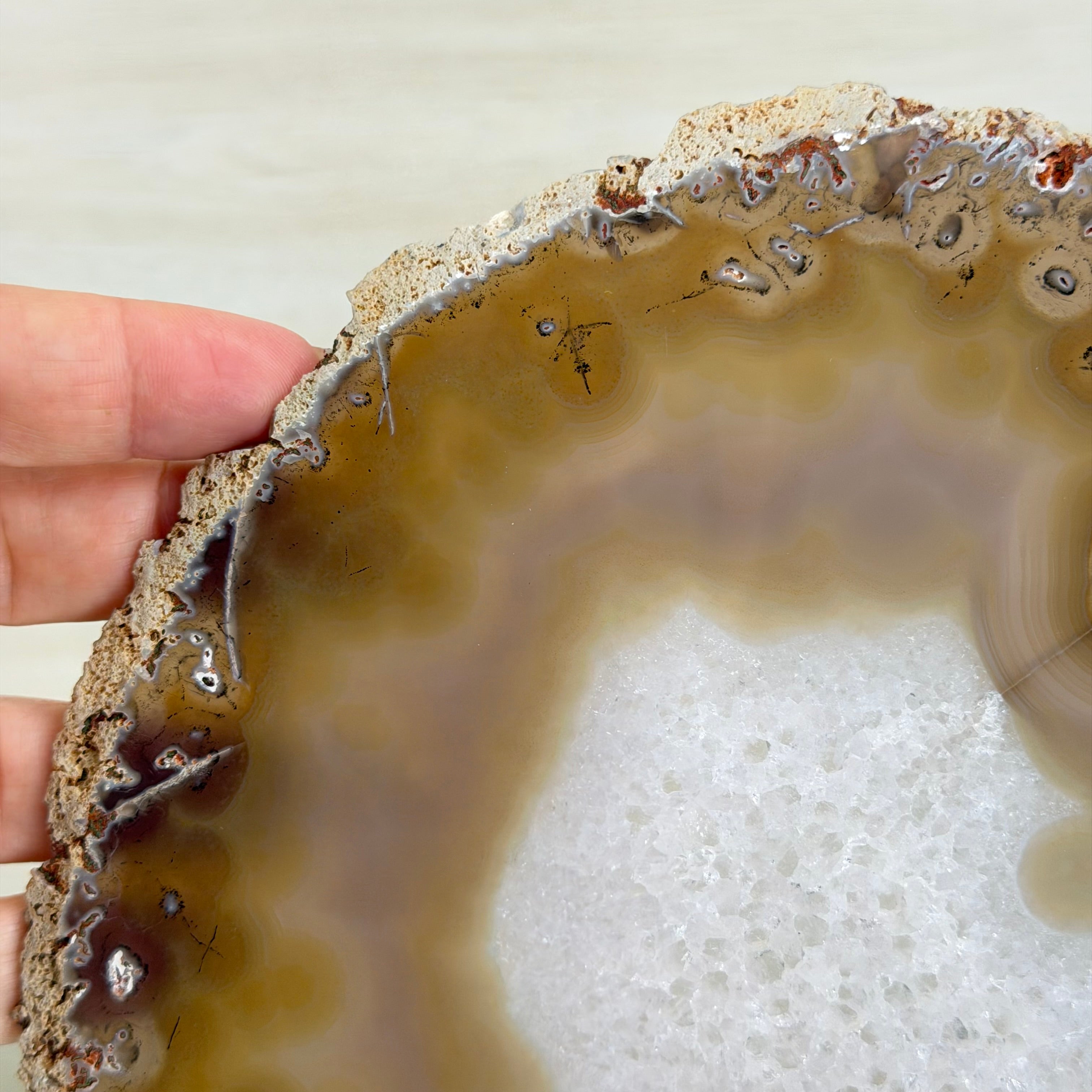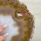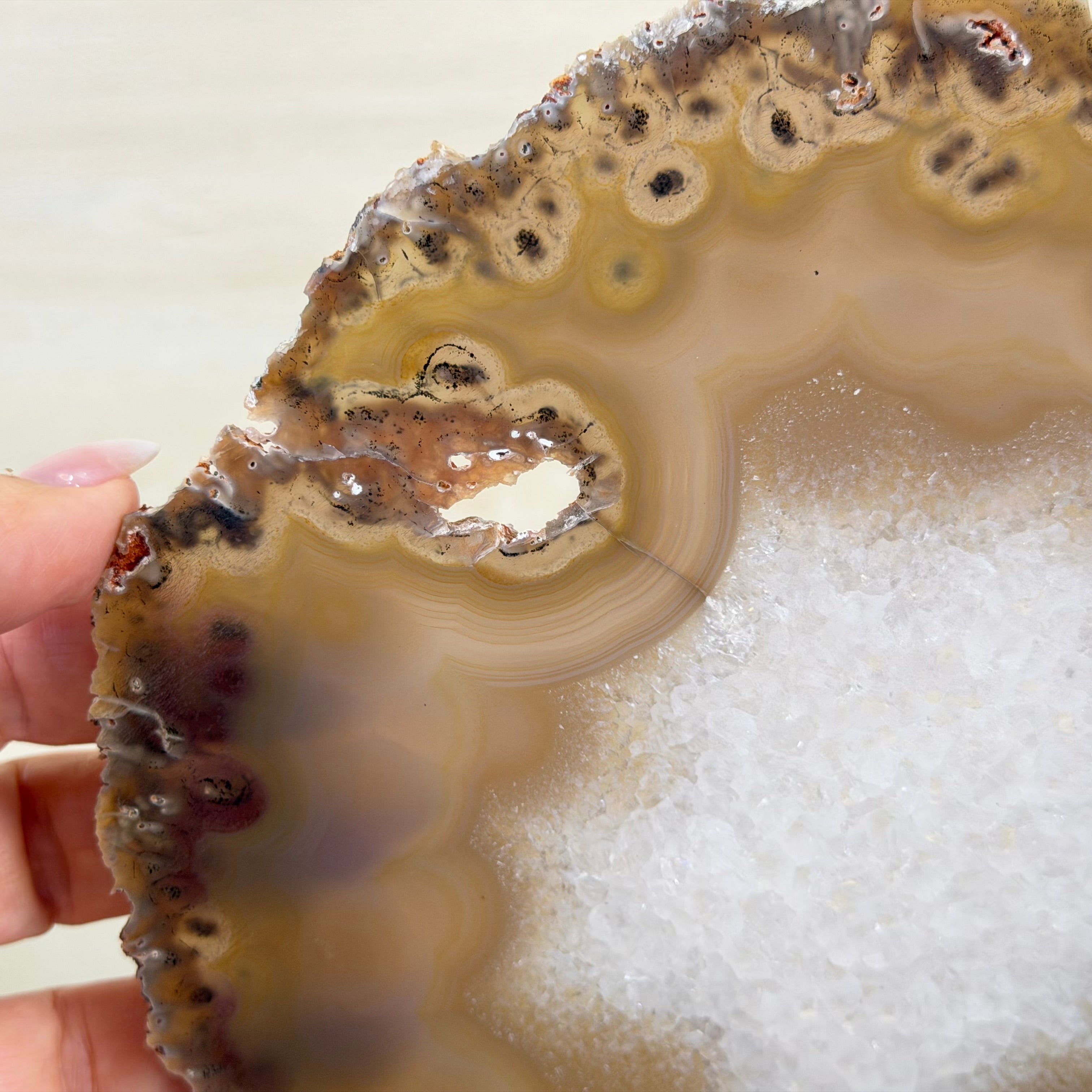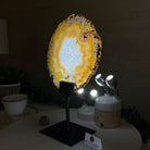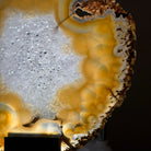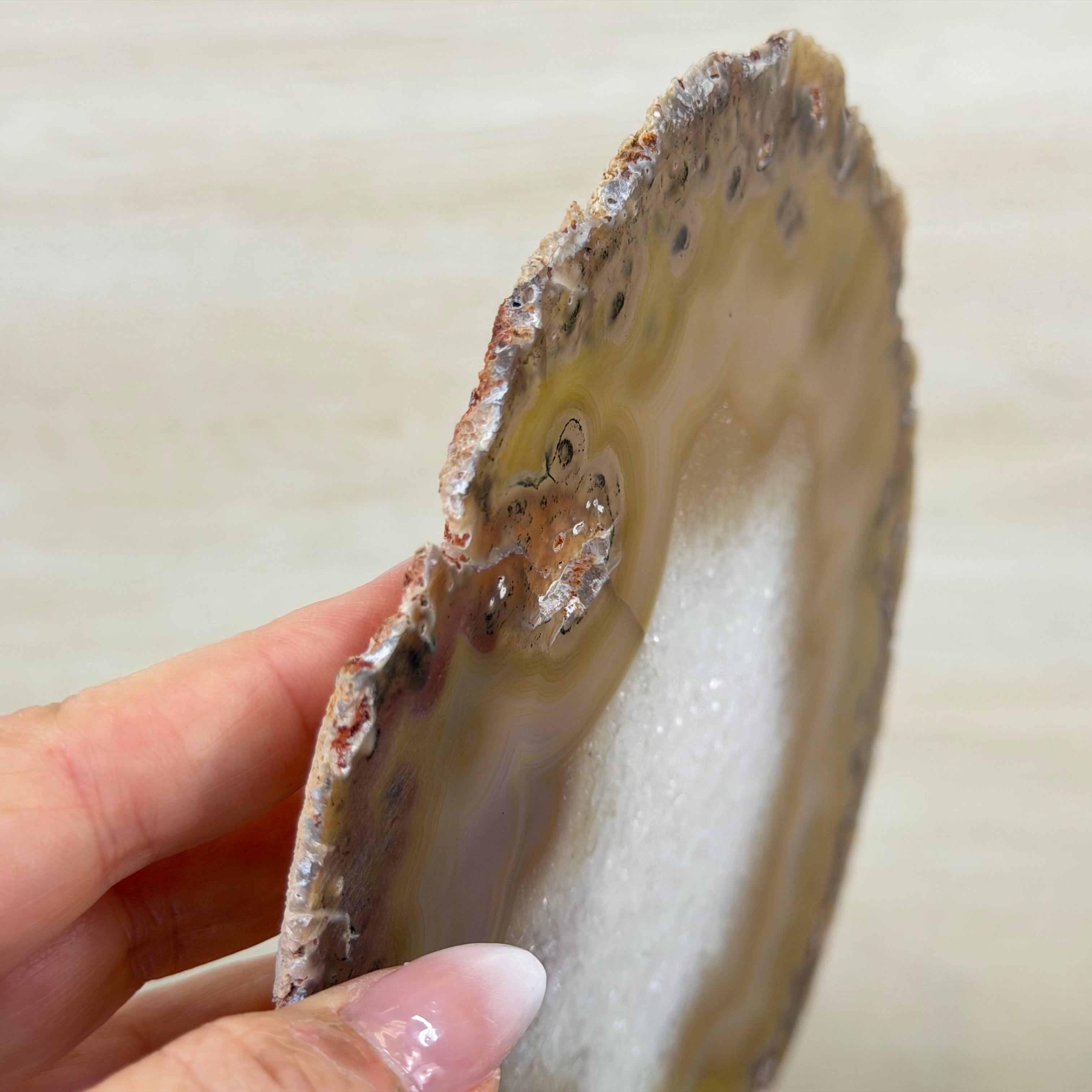 Special natural Brazilian Agate slice, expertly mounted on a sleek metal stand. Millions of years in the making, this gem reveals mesmerizing bands, crystals, and translucent layers that glow when backlit.