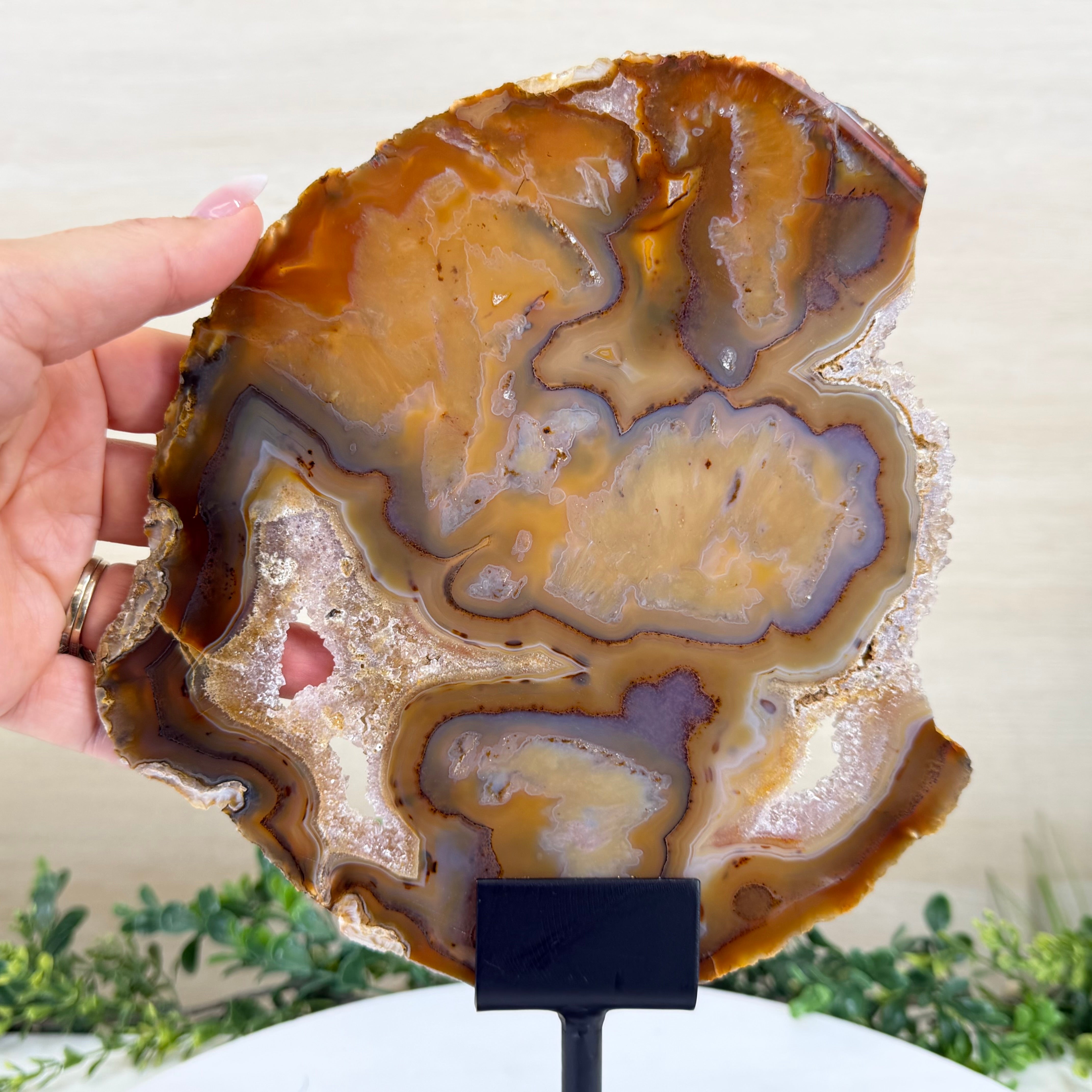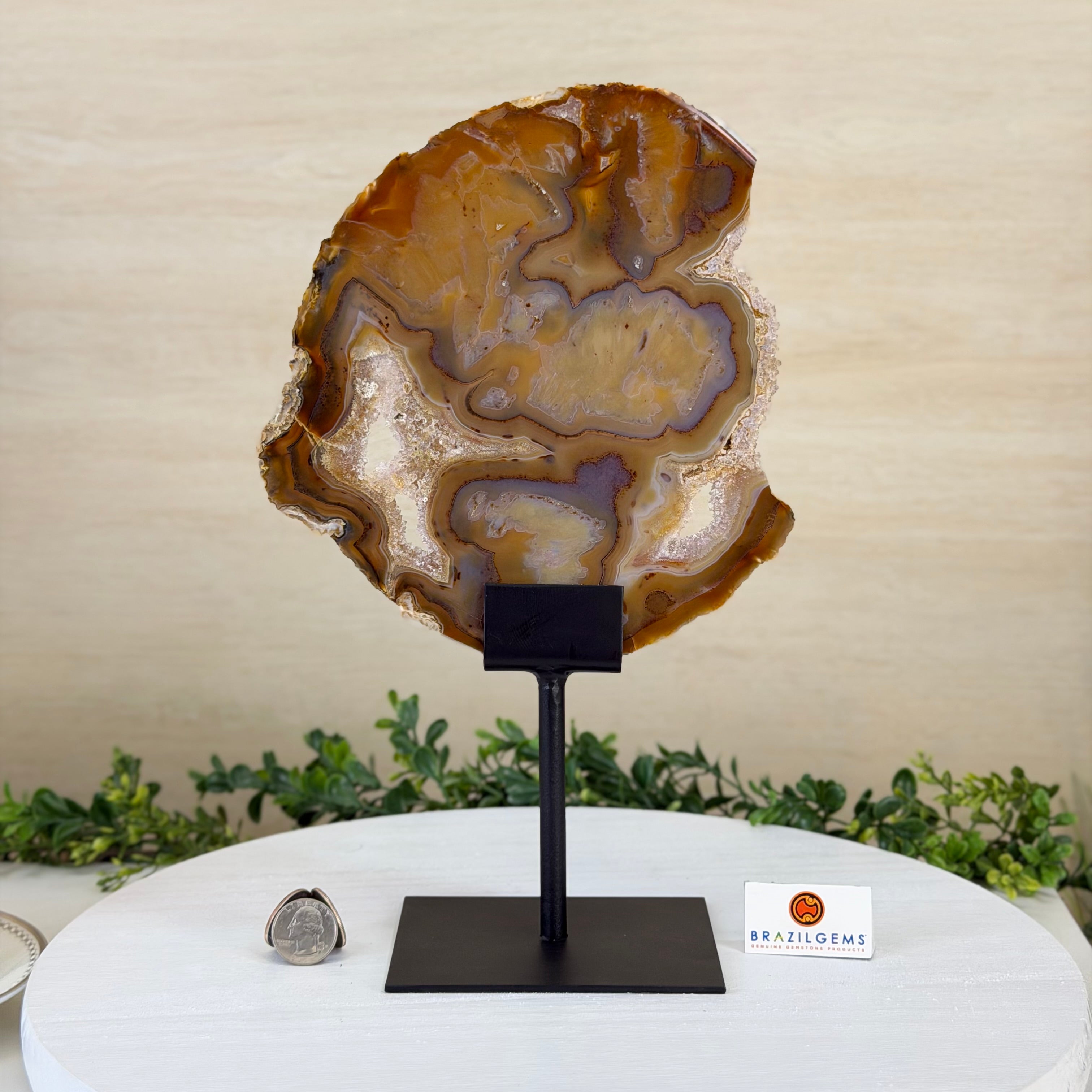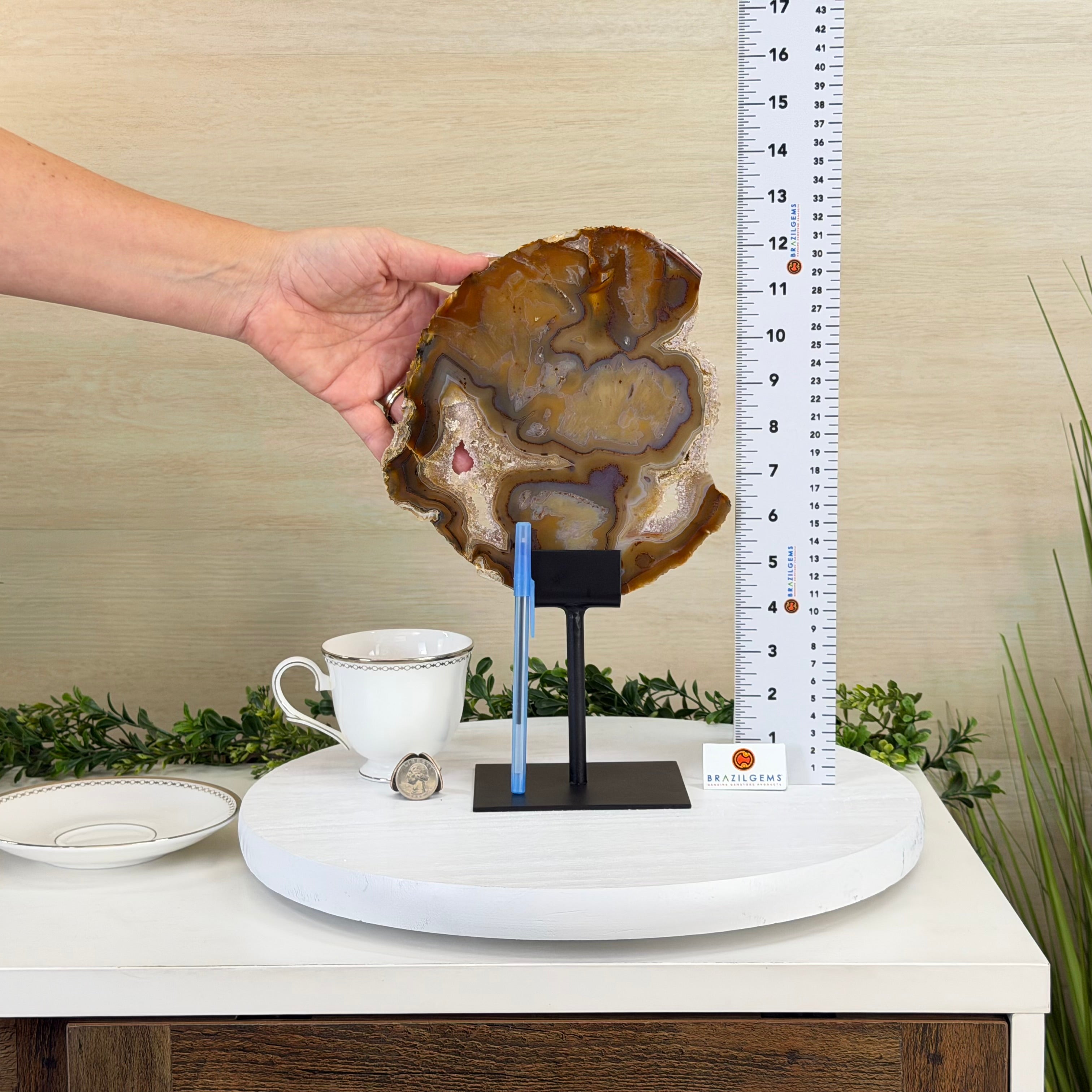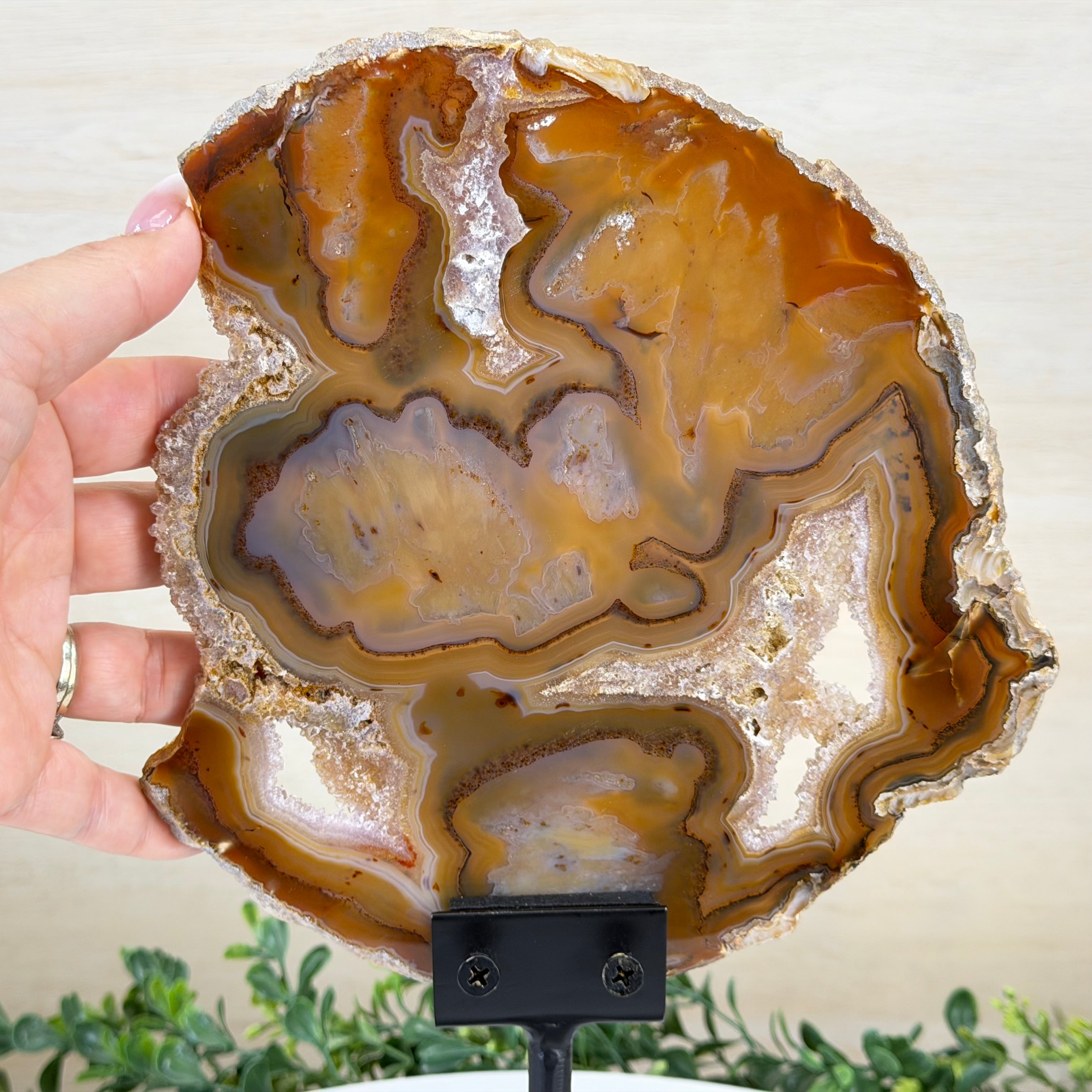 Special natural Brazilian Agate slice, expertly mounted on a sleek metal stand. Millions of years in the making, this gem reveals mesmerizing bands, crystals, and translucent layers that glow when backlit.