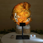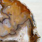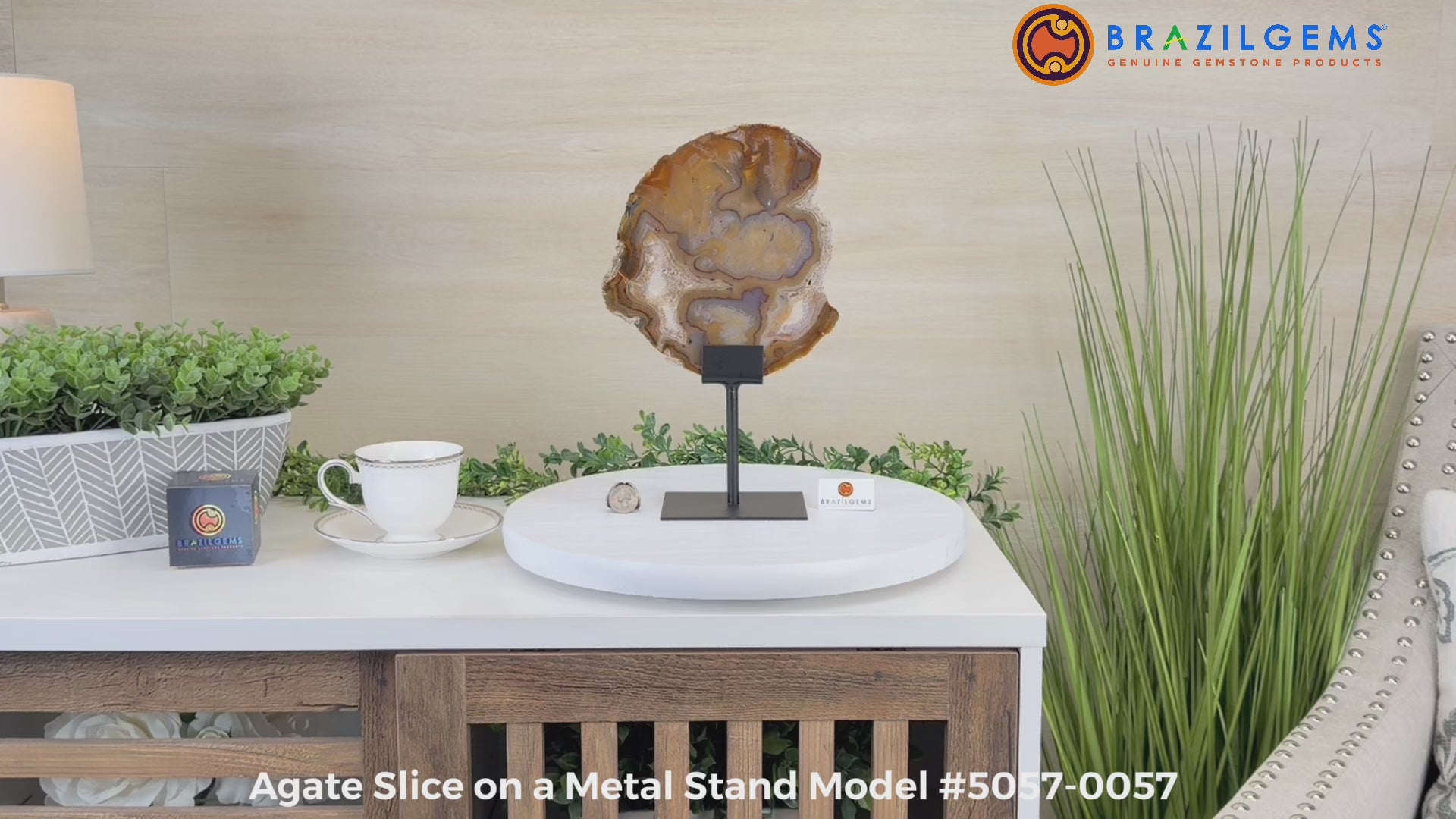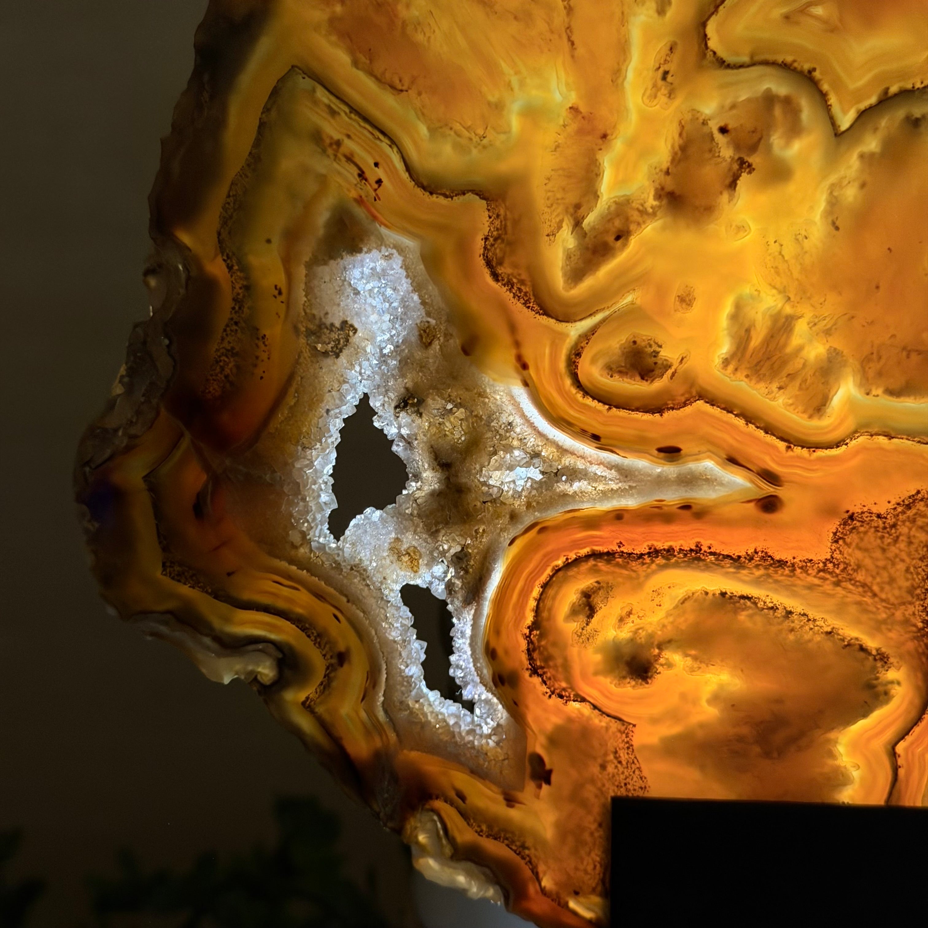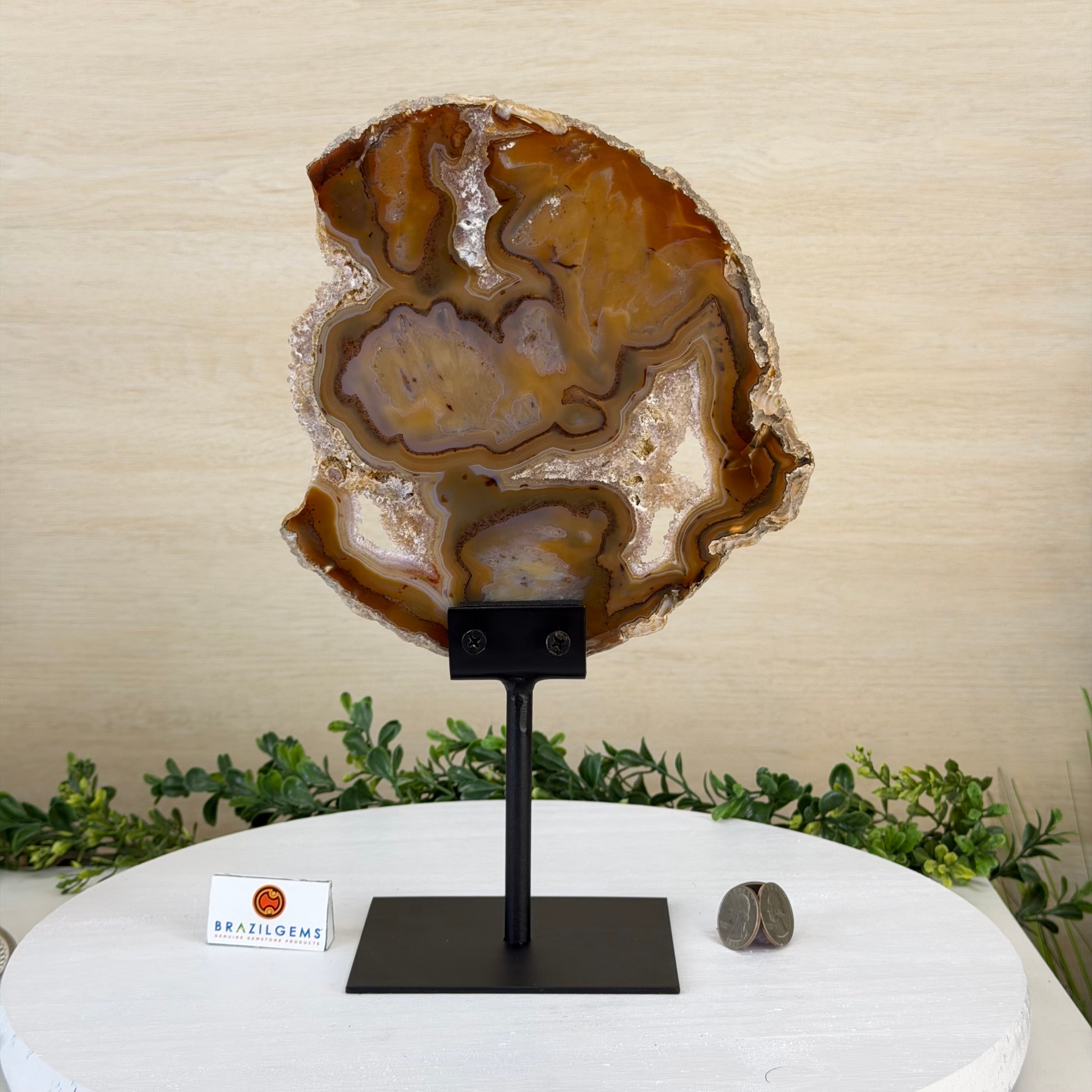 Special natural Brazilian Agate slice, expertly mounted on a sleek metal stand. Millions of years in the making, this gem reveals mesmerizing bands, crystals, and translucent layers that glow when backlit.