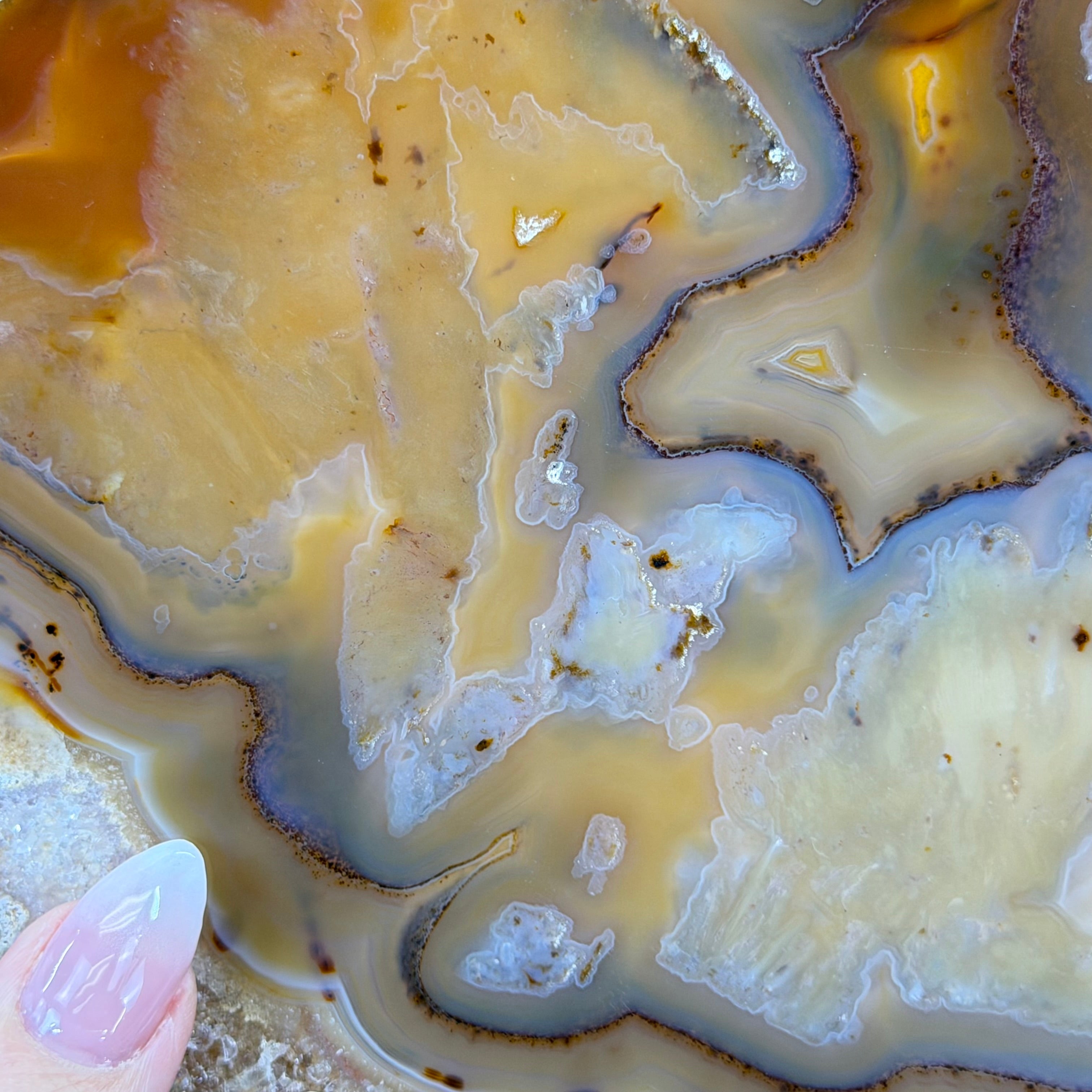 Agate, with its vibrant array of colors and intricate banding, is a stone of protection, strength, and courage. Known to offer a sense of security, it acts as a talisman during both challenging and peaceful times. Whether you're navigating periods of worry or overthinking, Agate invites healing energy to calm the mind and restore balance. It forms in ancient volcanic rocks, where over time, mineral-rich waters pass through cavities, creating the stone’s characteristic layered appearance. Each unique band reflects the power of strength built slowly and steadily, making it a reminder of resilience and enduring stability.