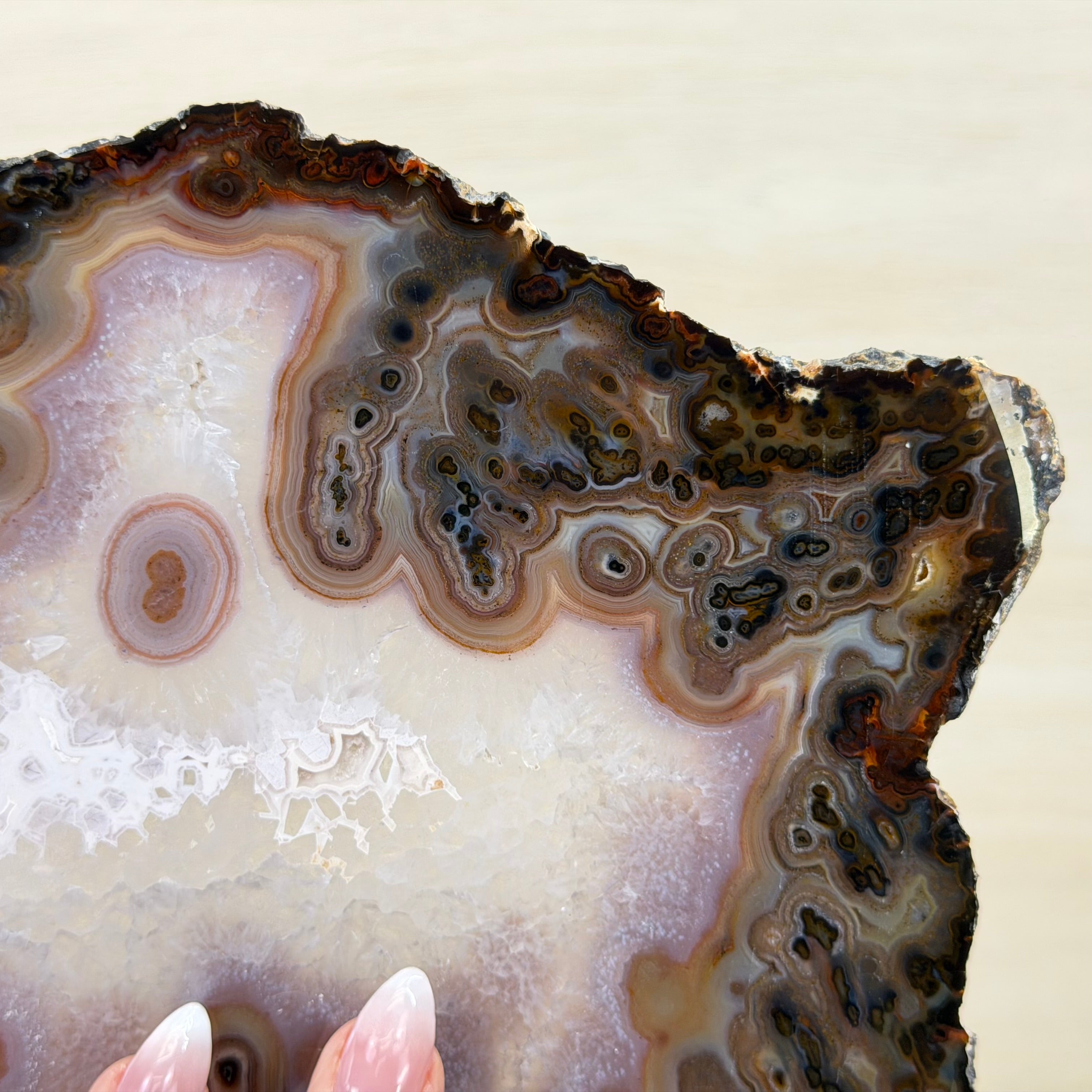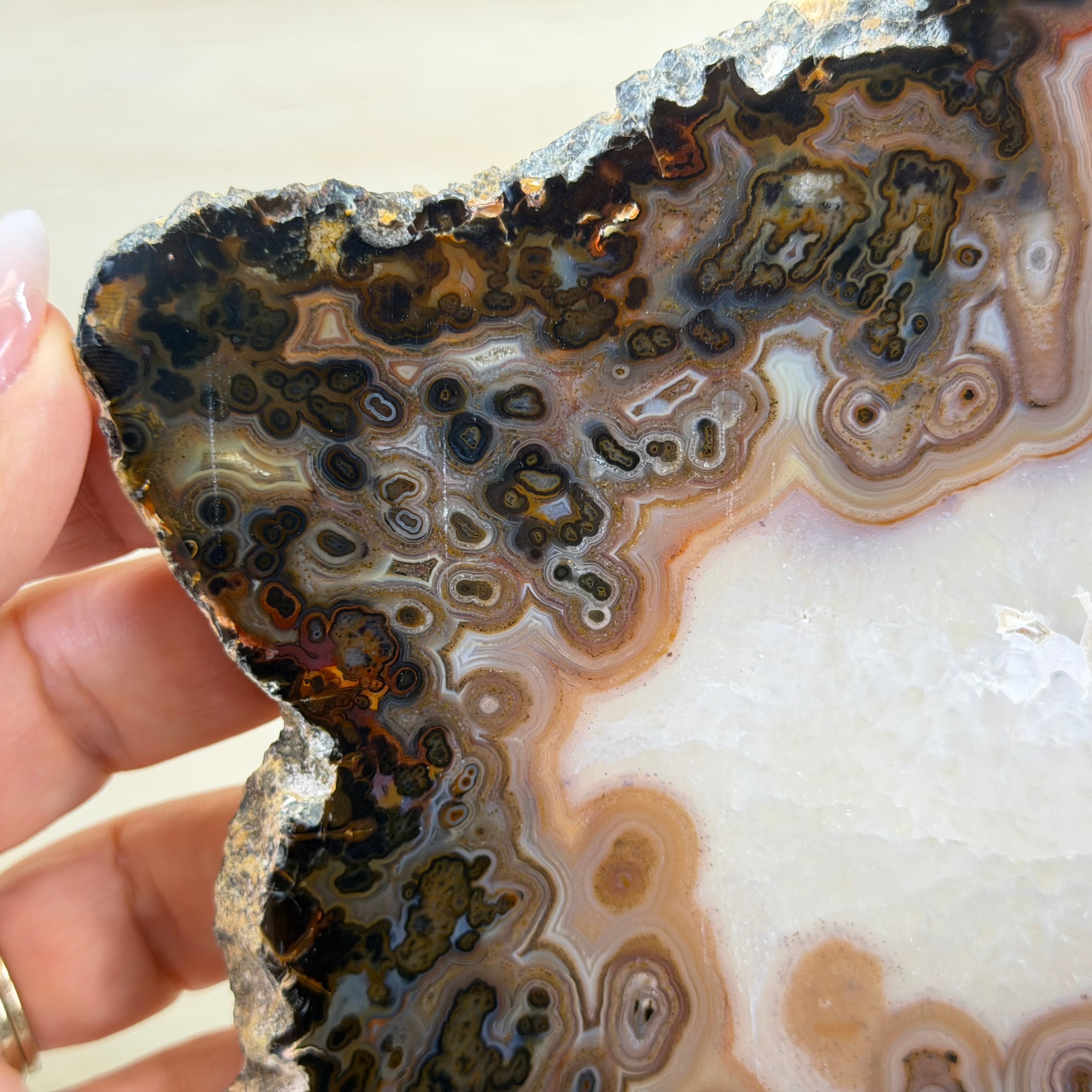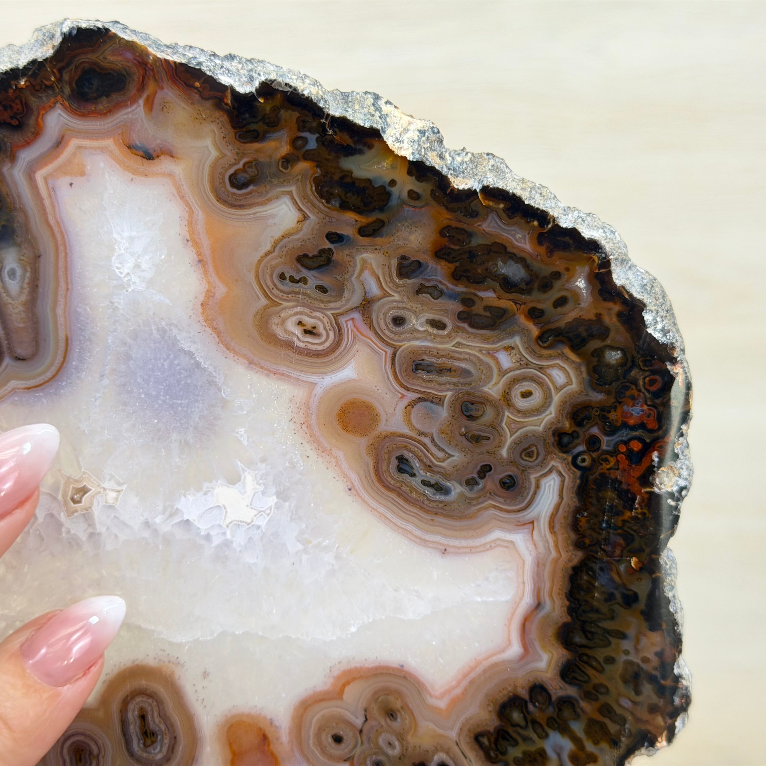 Slicing such a delicate piece is risky and time-intensive; the cutter never knows the hidden beauty until the final reveal. This one is breathtaking!