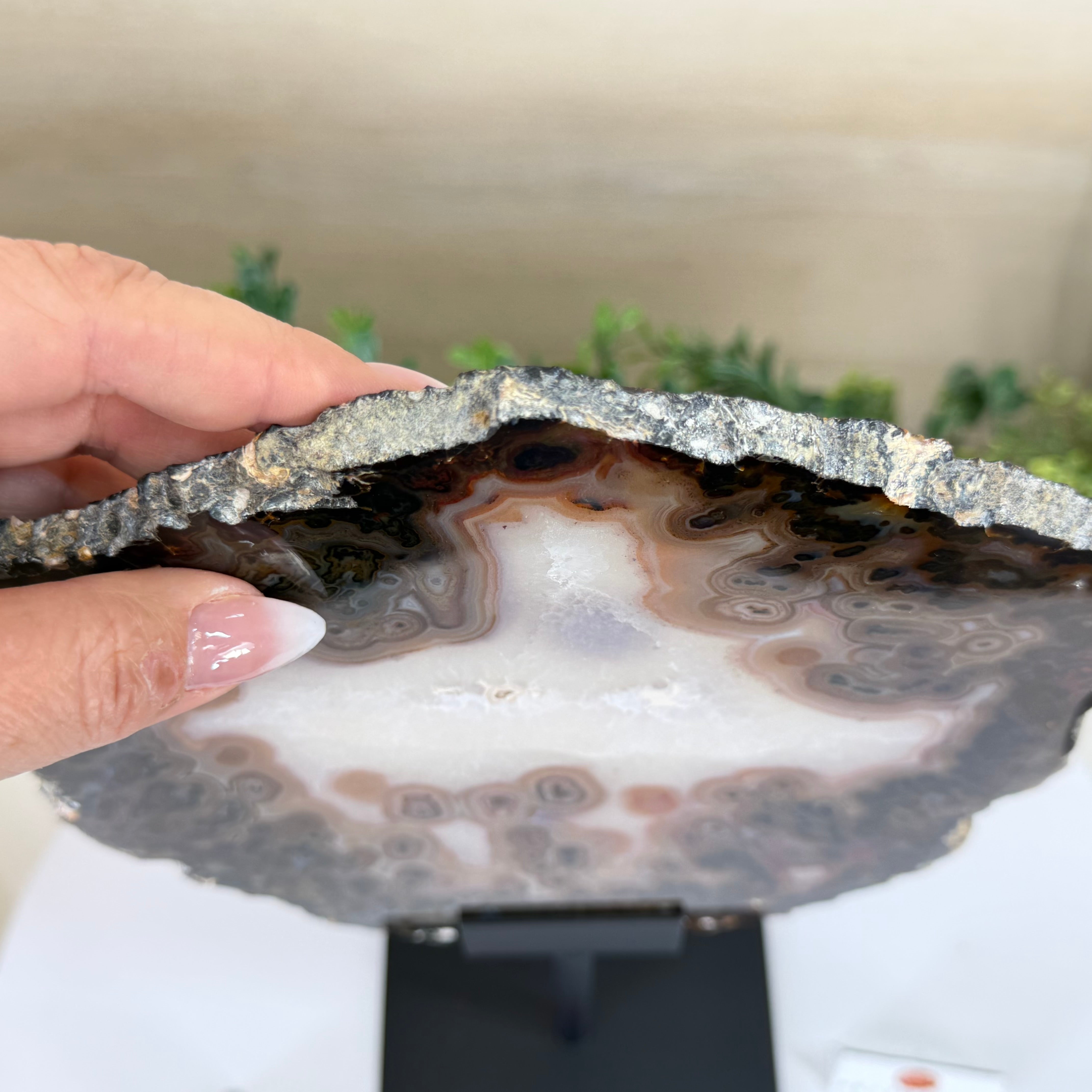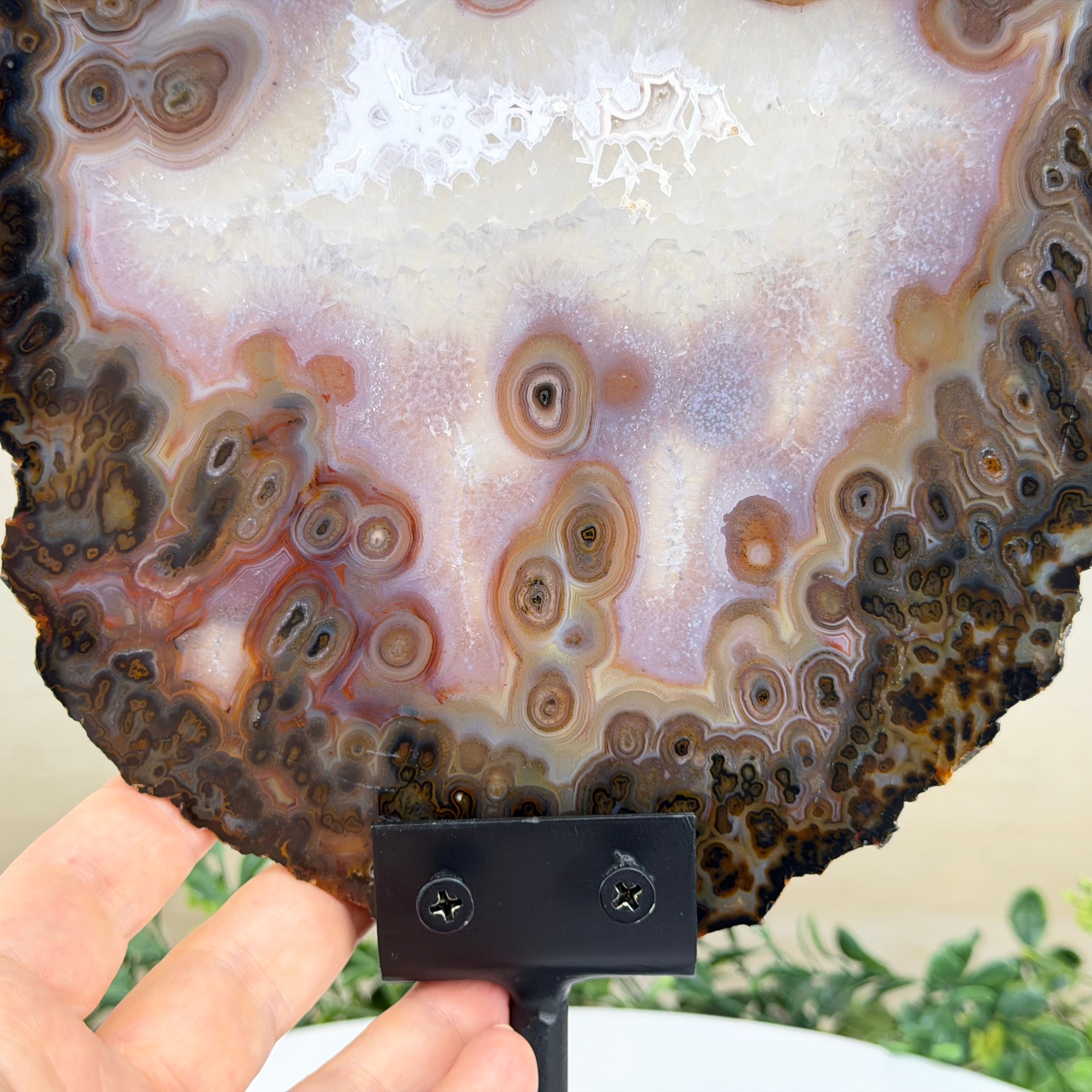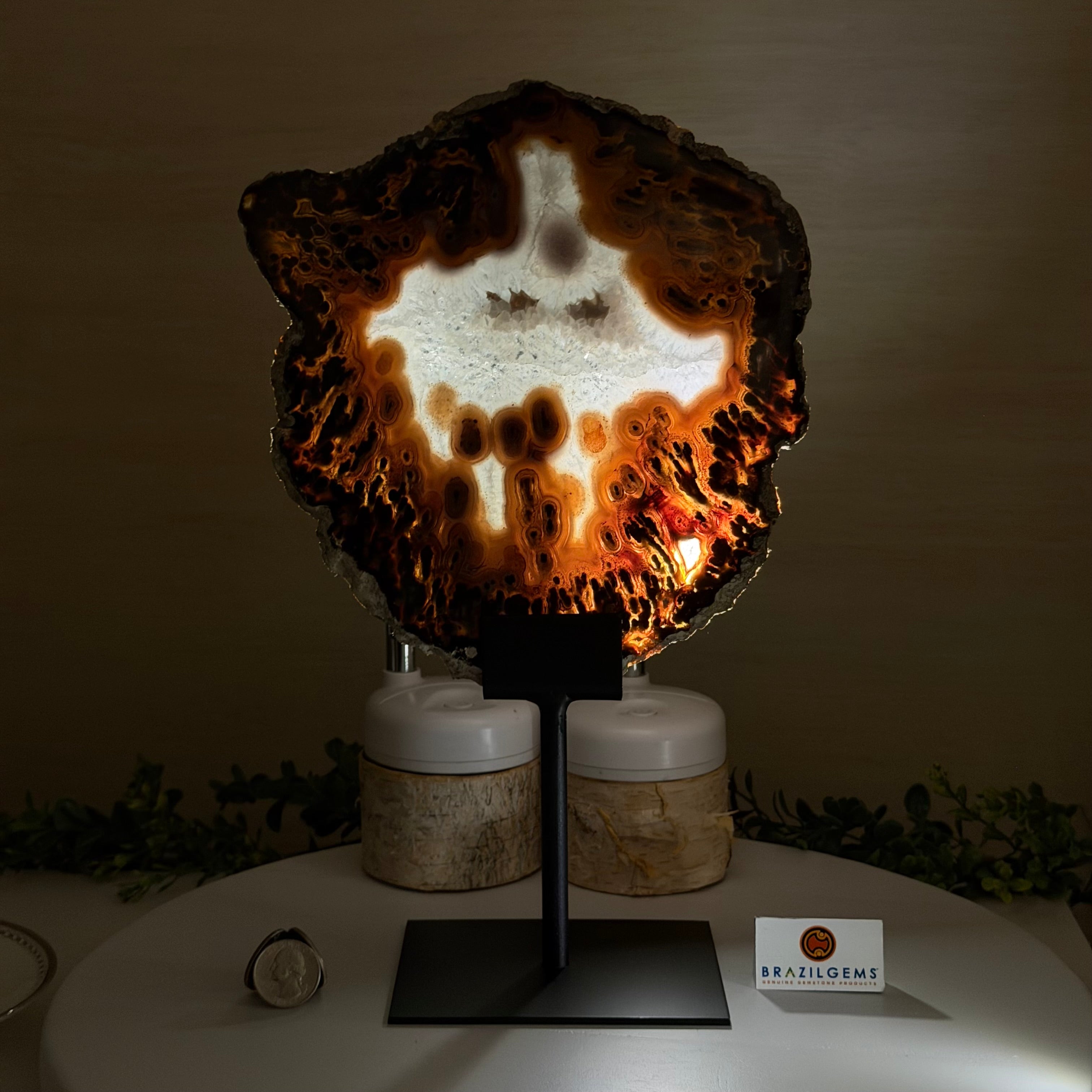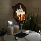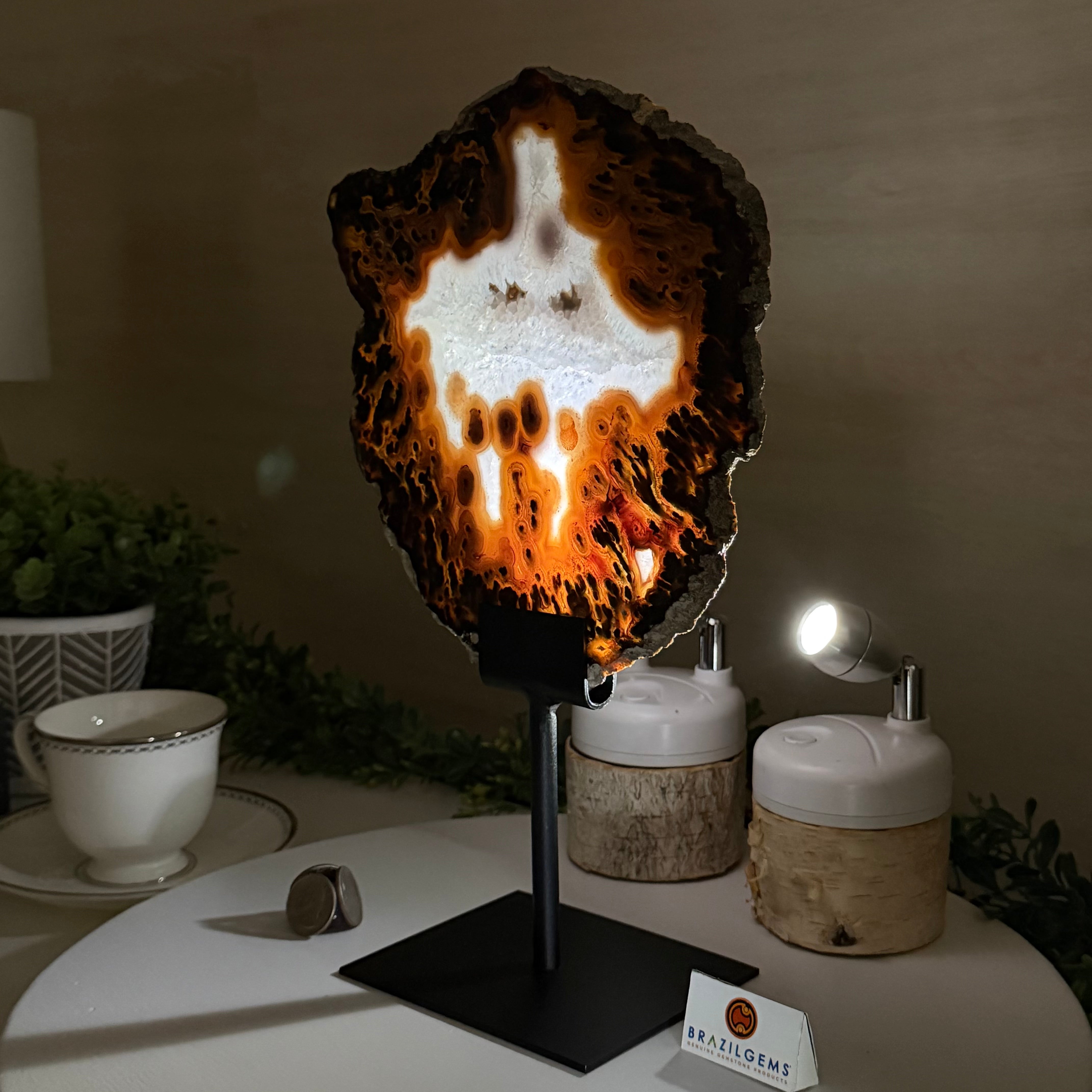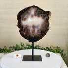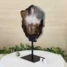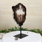 Special natural Brazilian Agate slice, expertly mounted on a sleek metal stand. Millions of years in the making, this gem reveals mesmerizing bands, crystals, and translucent layers that glow when backlit.