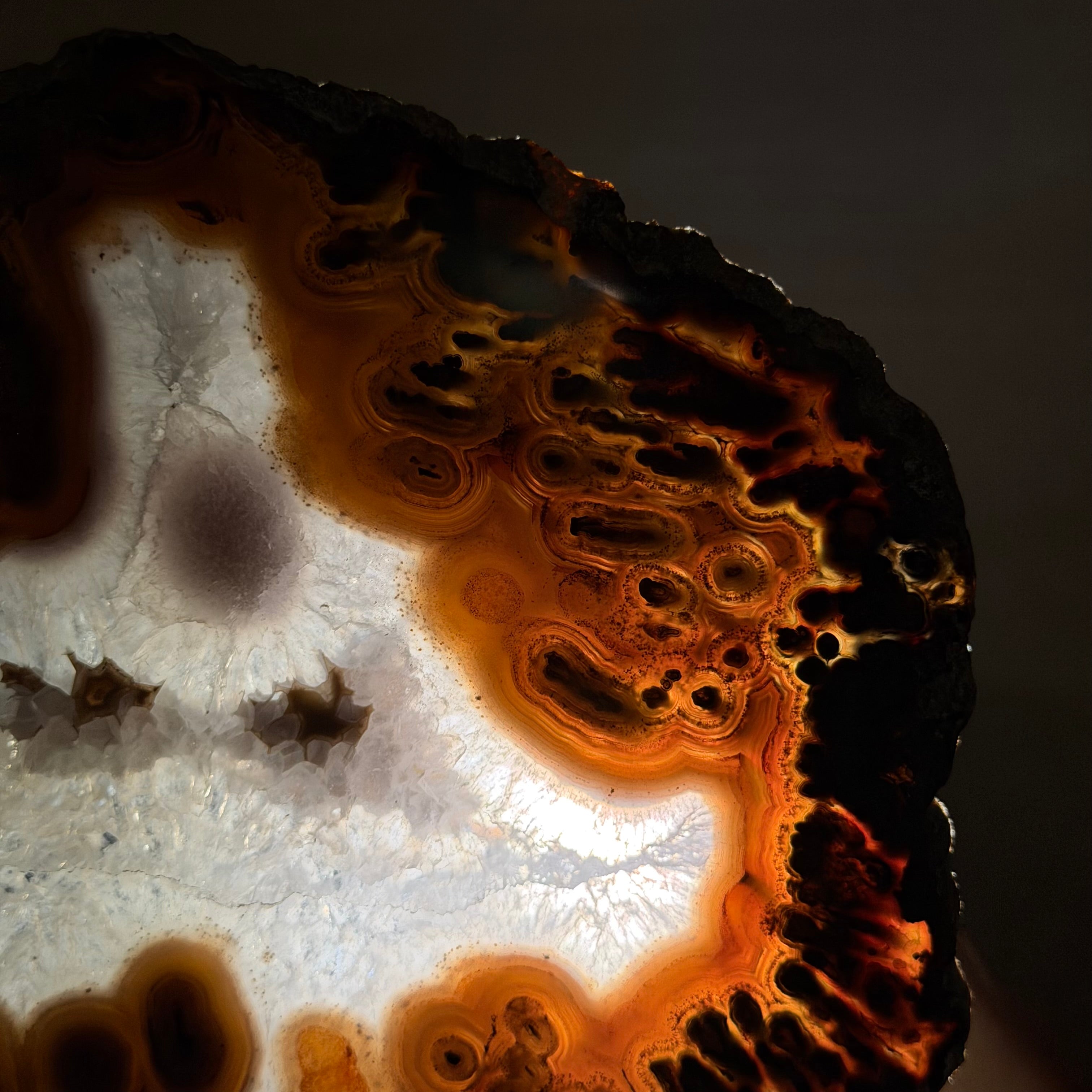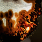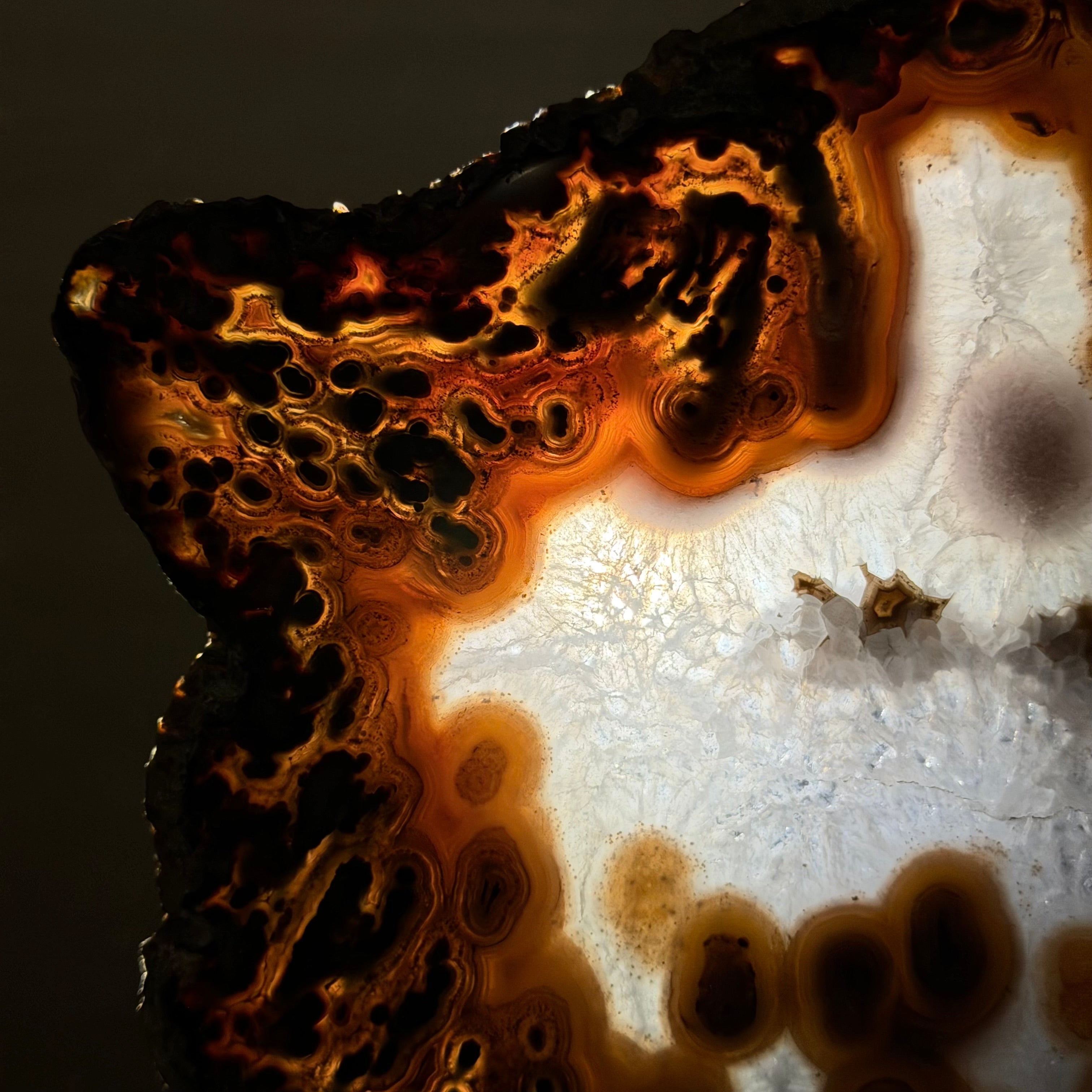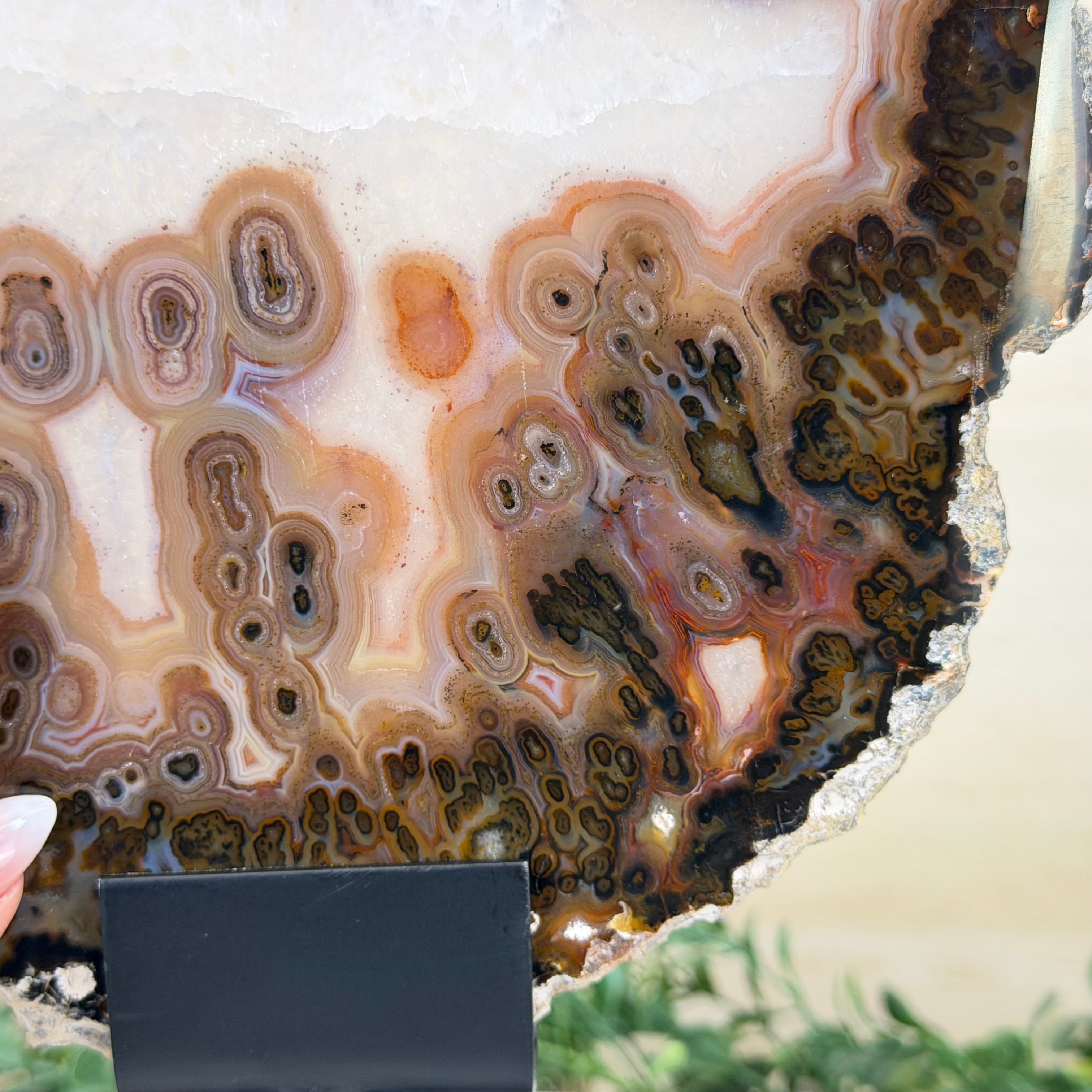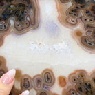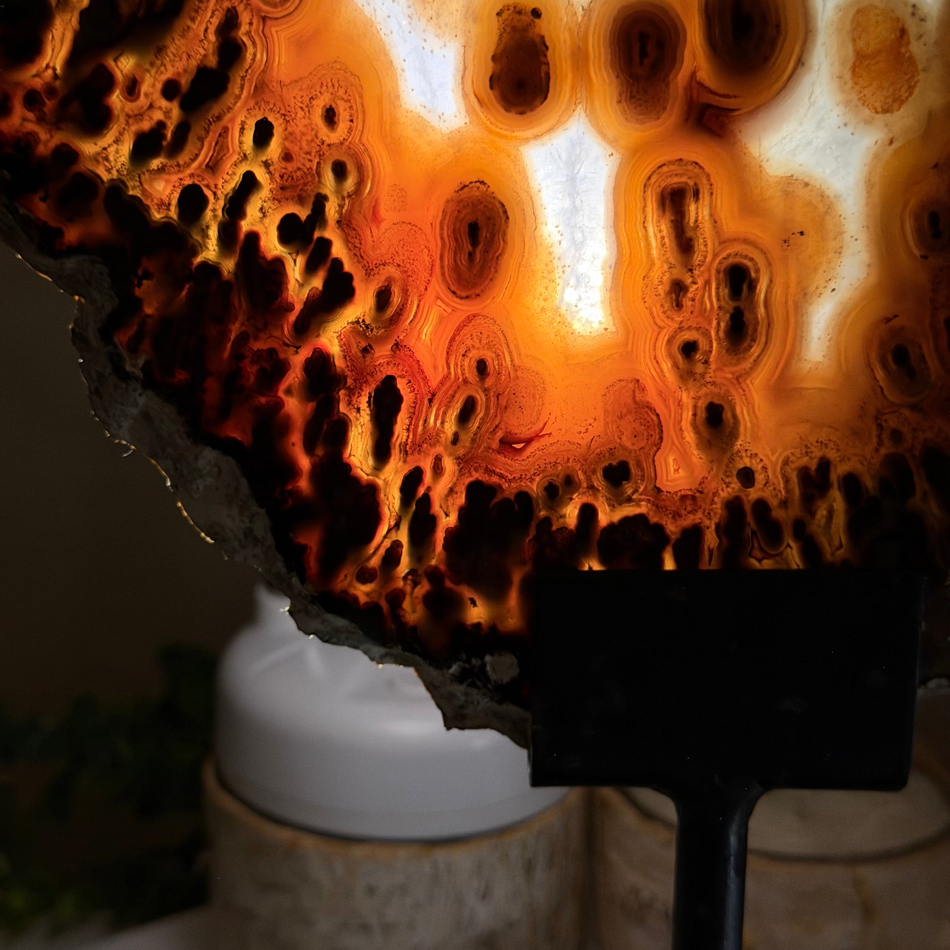 Special natural Brazilian Agate slice, expertly mounted on a sleek metal stand. Millions of years in the making, this gem reveals mesmerizing bands, crystals, and translucent layers that glow when backlit.