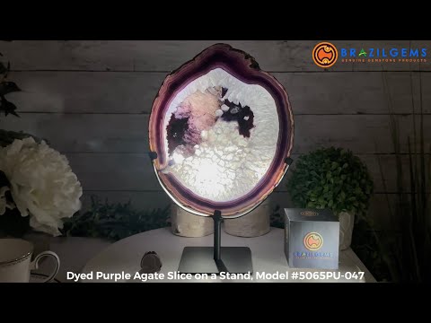Brazil Gems® brings you this bright slice of Brazilian Purple Agate (dyed purple) beautifully placed on a metal stand to display and enjoy. This gemstone will enhance any room décor with its striking colors, bands and crystals. Nature's work of millions of years now available to you.