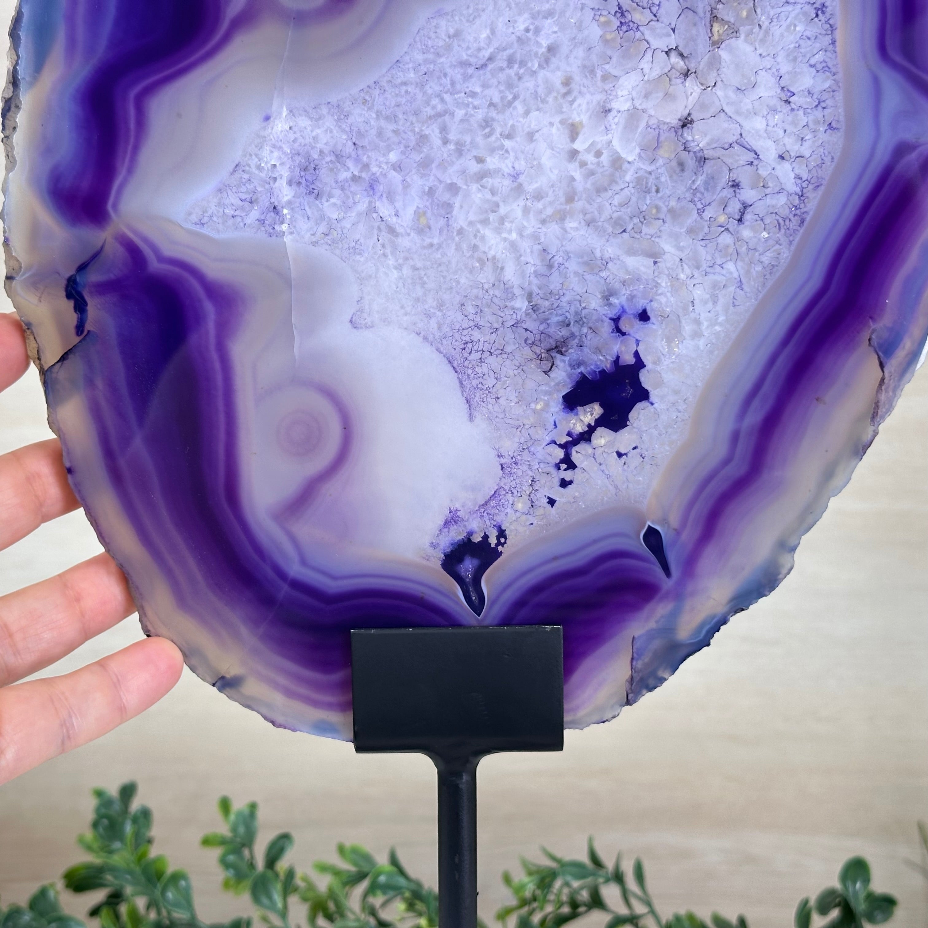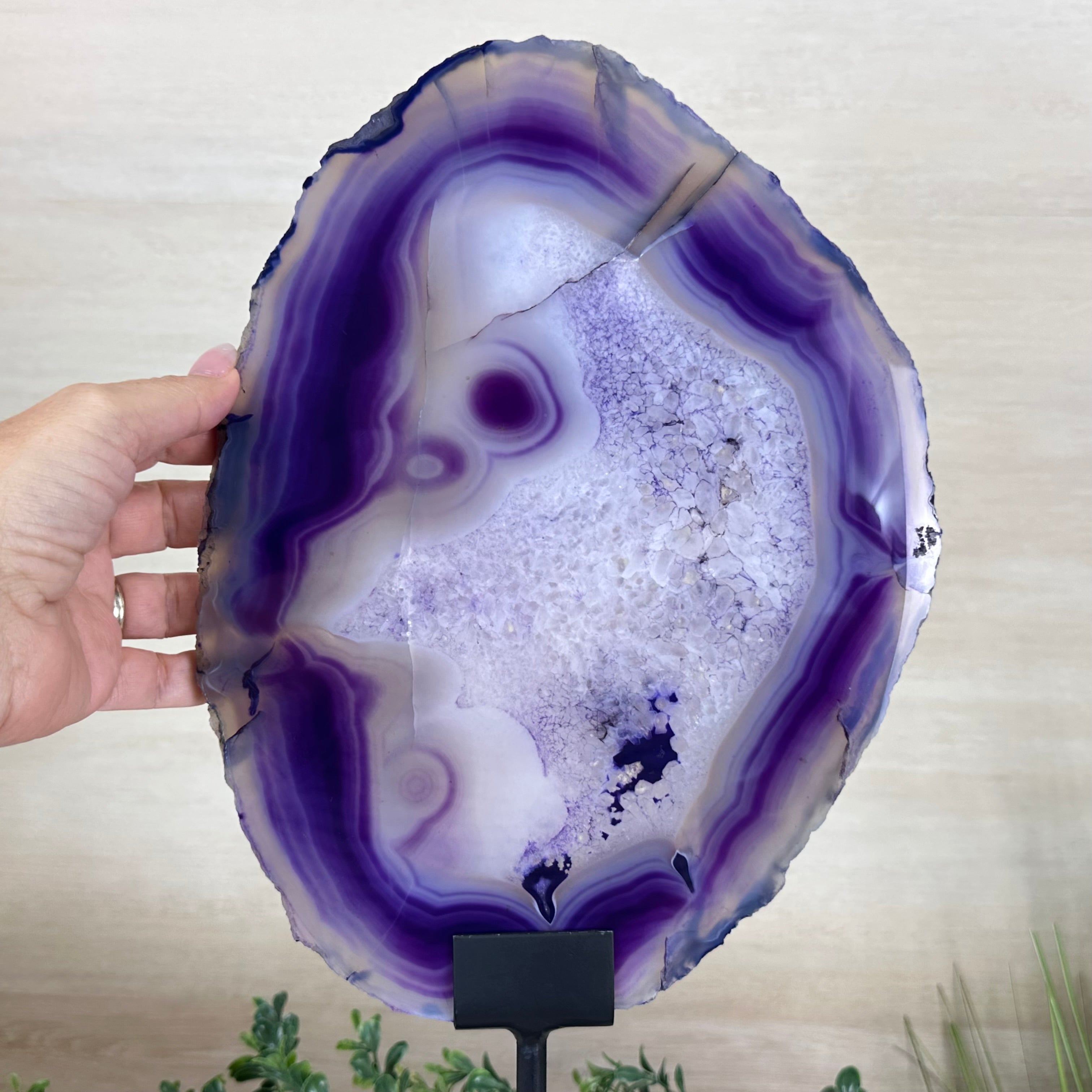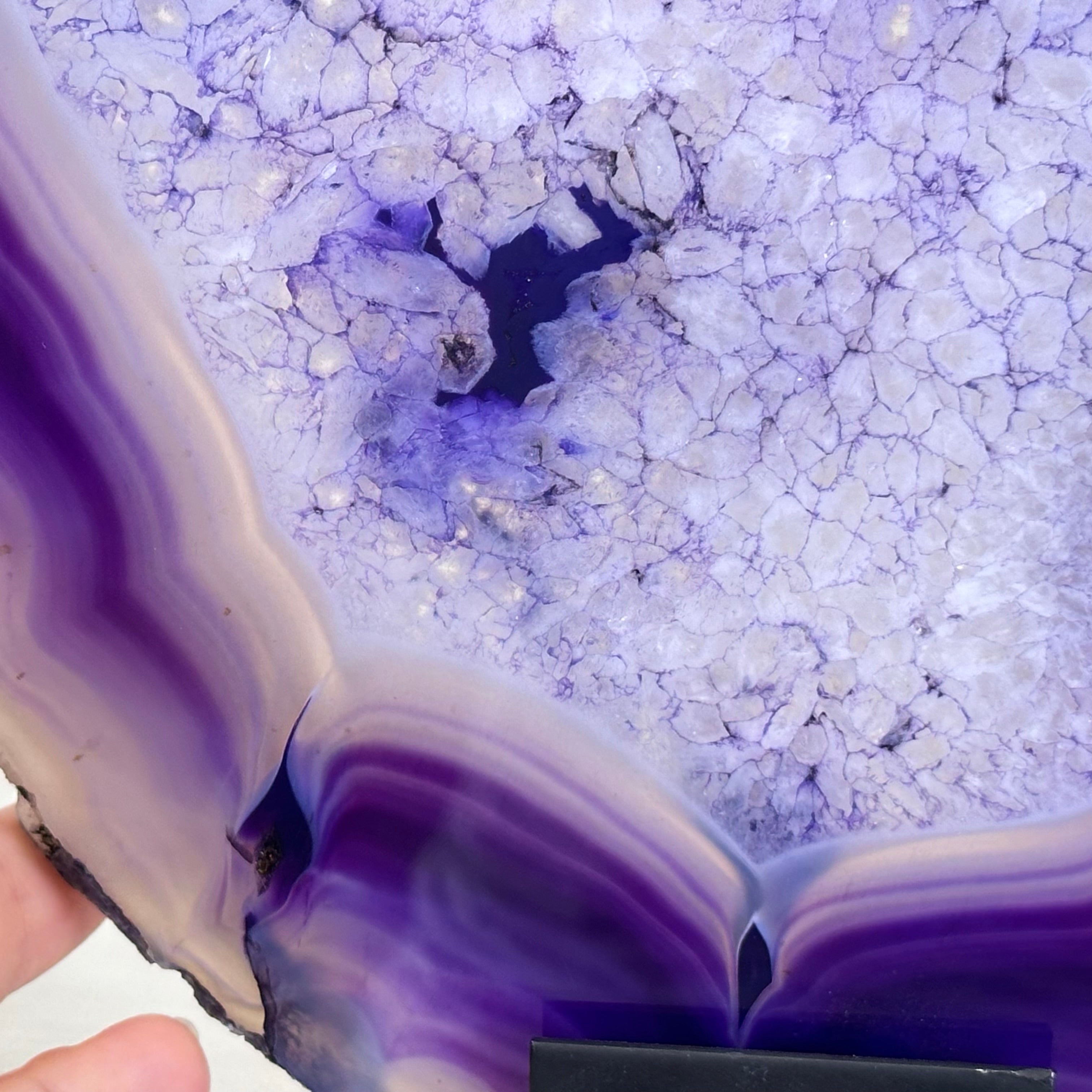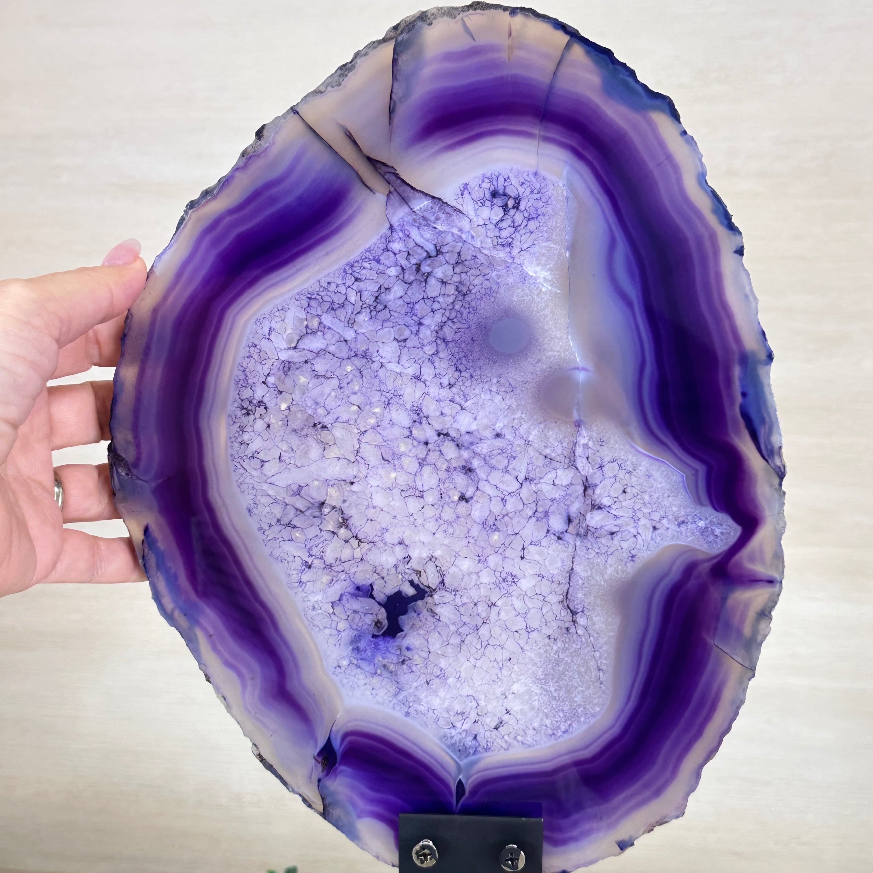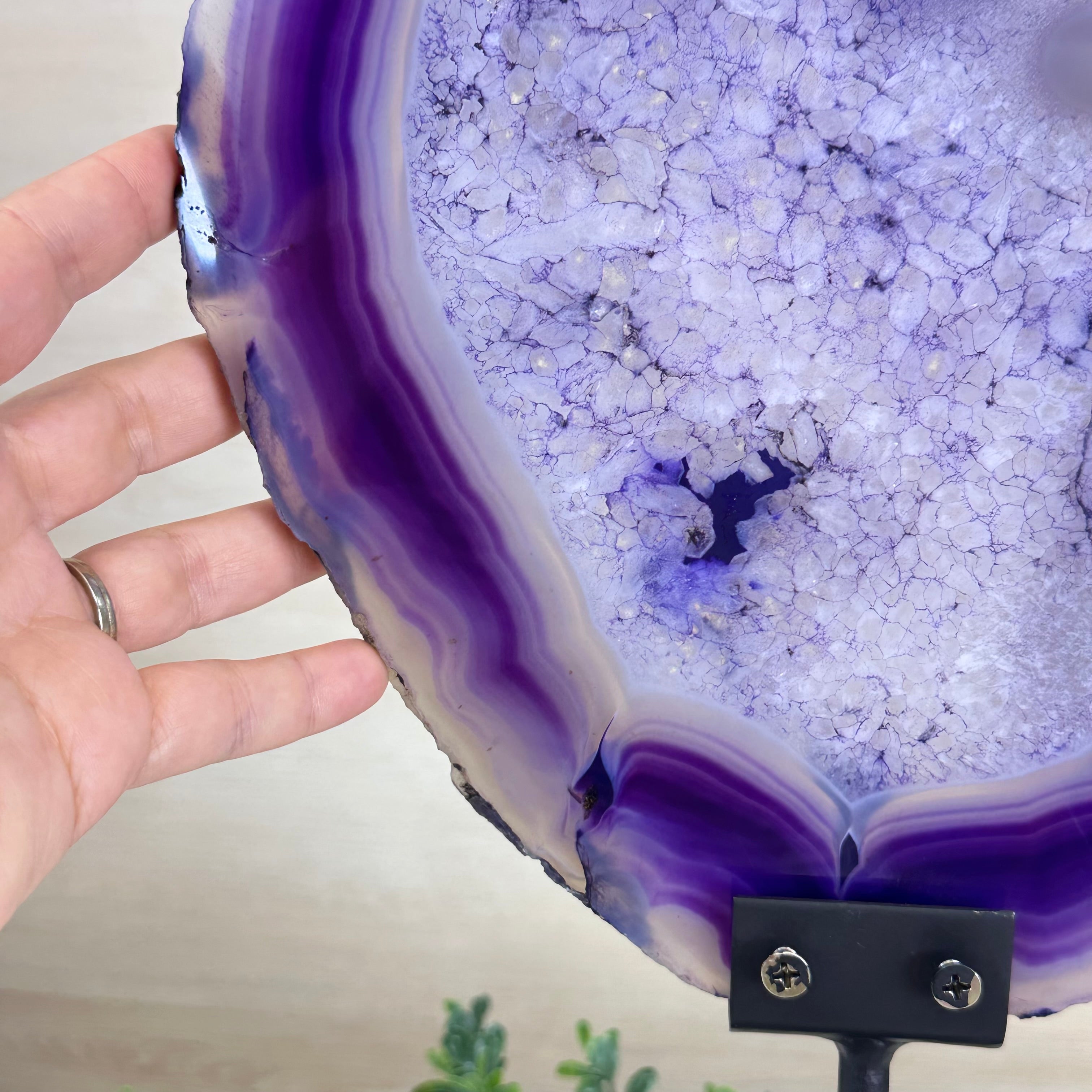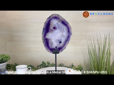 Bright slice of Brazilian Purple Agate (dyed purple) beautifully placed on a metal stand to display and enjoy. This gemstone will enhance any room décor with its striking colors, bands and crystals. Nature's work of millions of years now available to you.