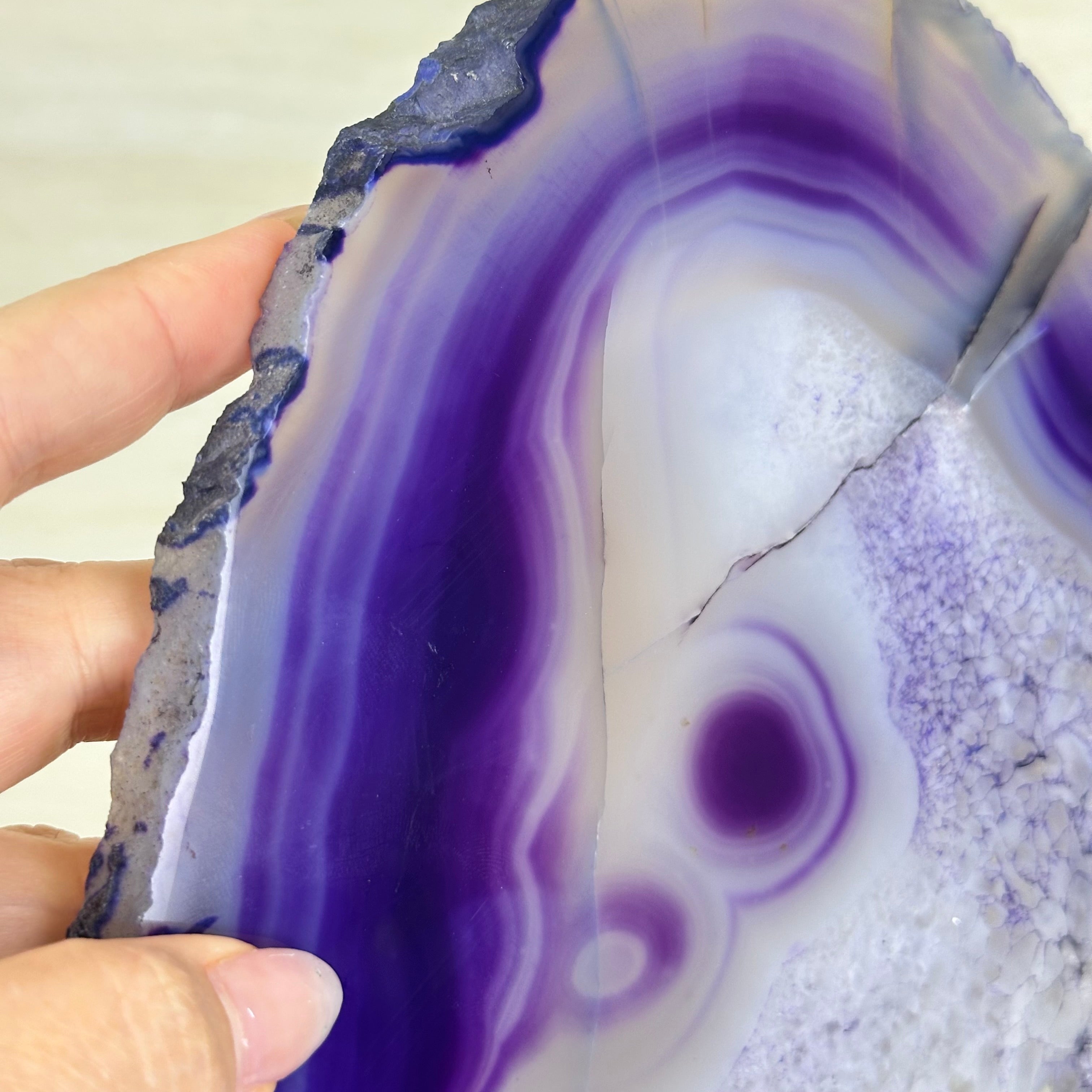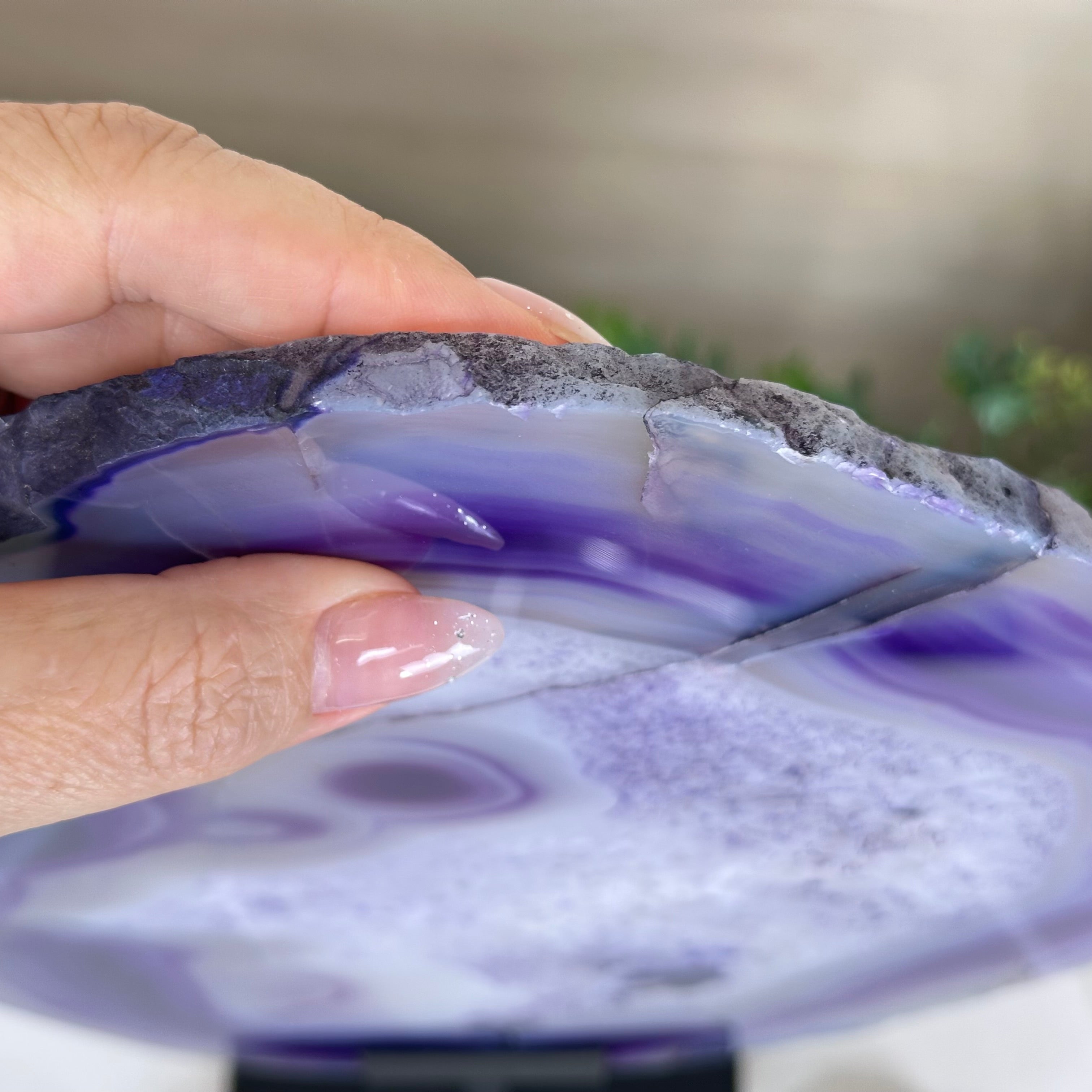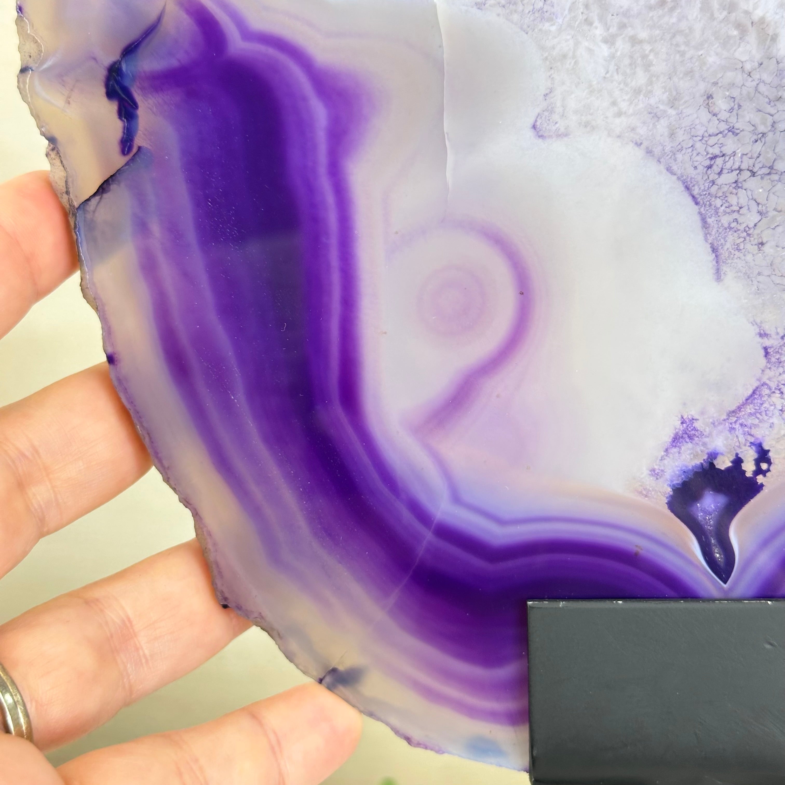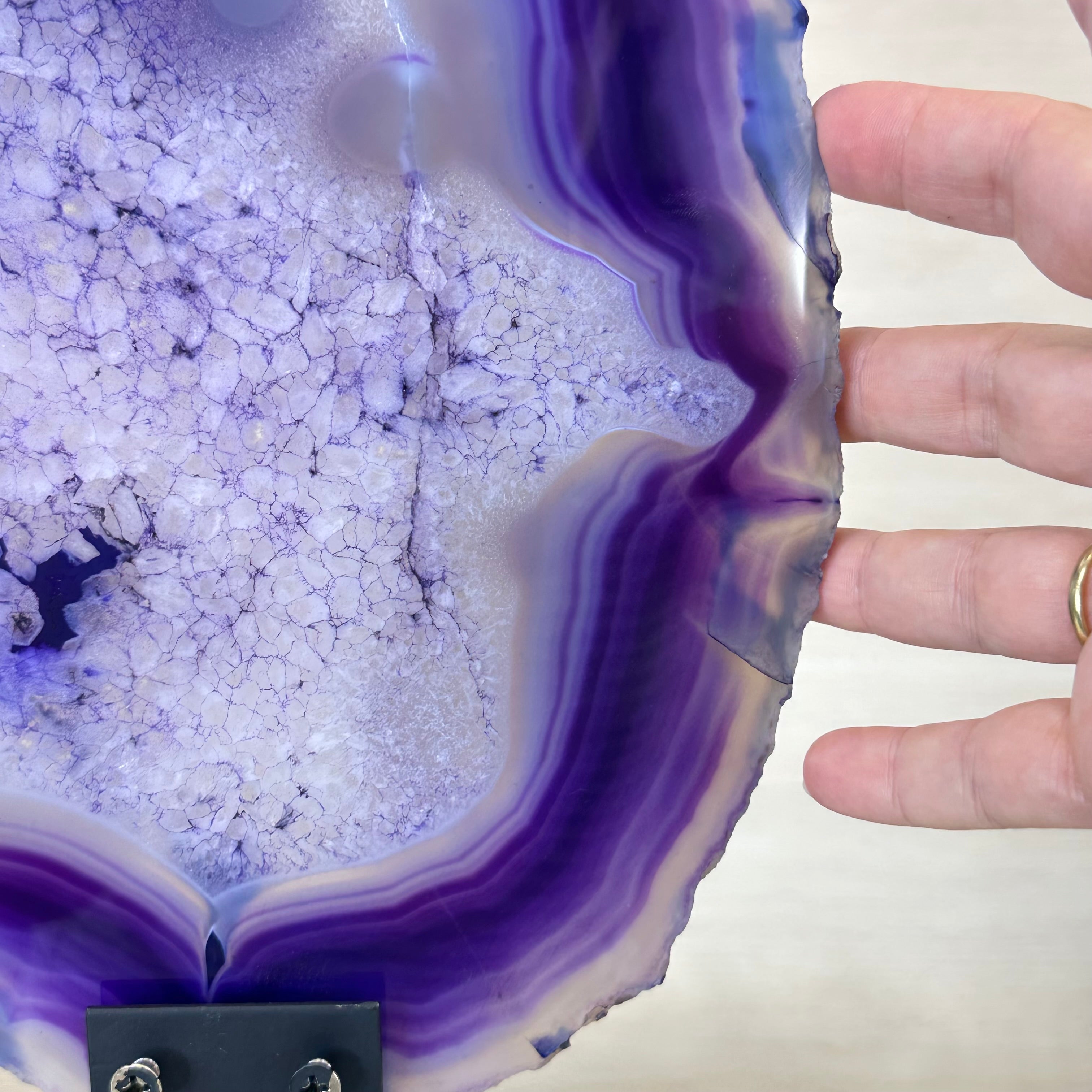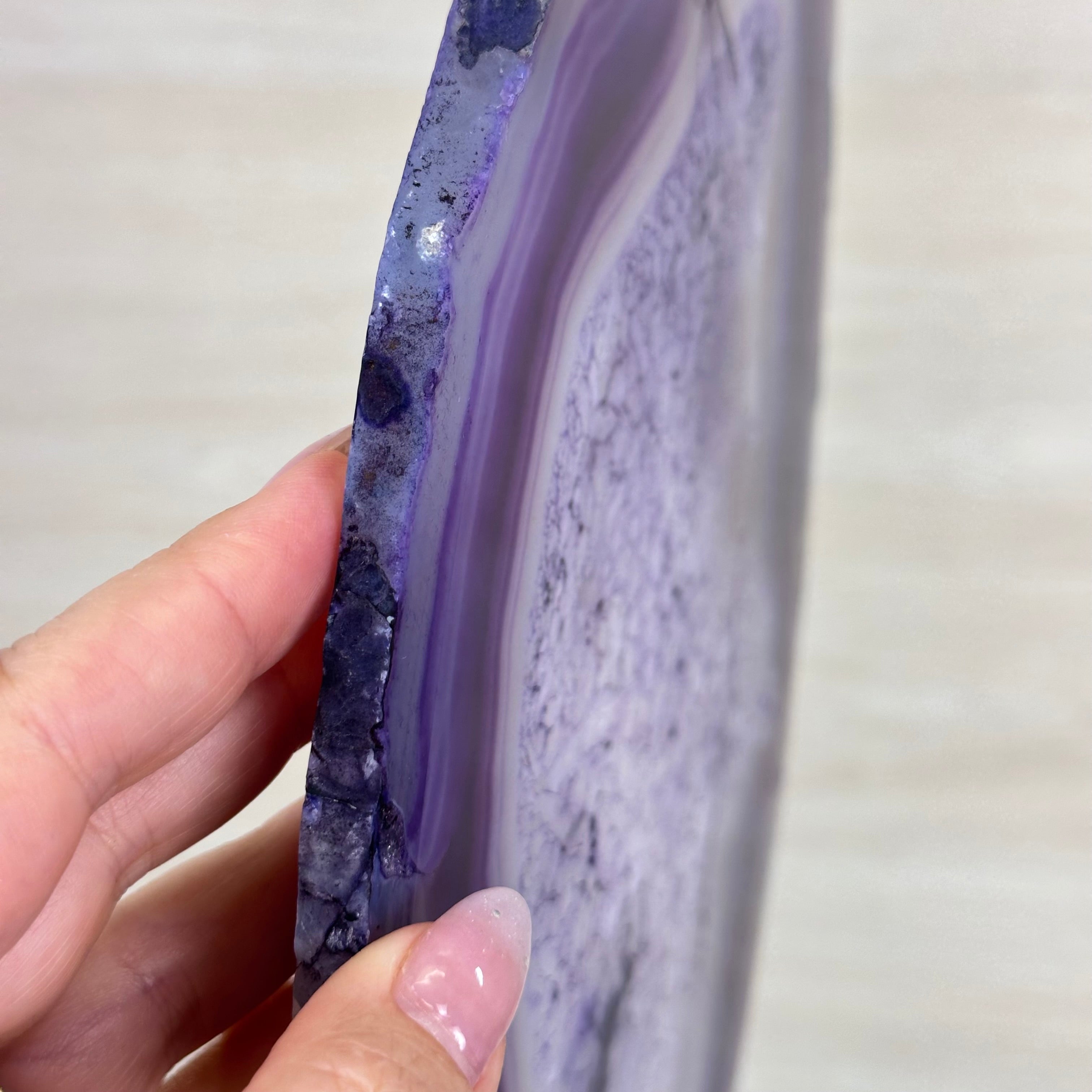 Bright slice of Brazilian Purple Agate (dyed purple) beautifully placed on a metal stand to display and enjoy. This gemstone will enhance any room décor with its striking colors, bands and crystals. Nature's work of millions of years now available to you.