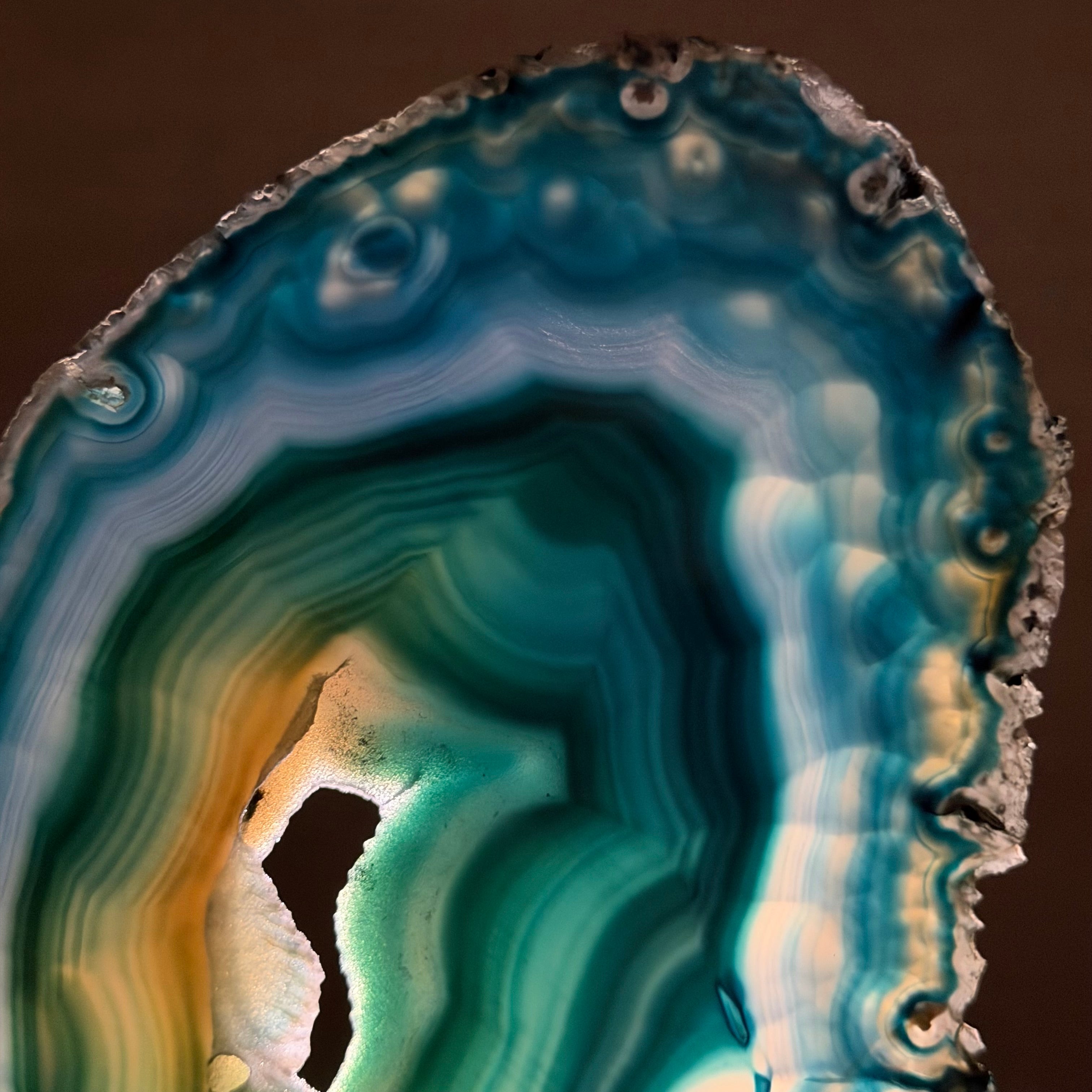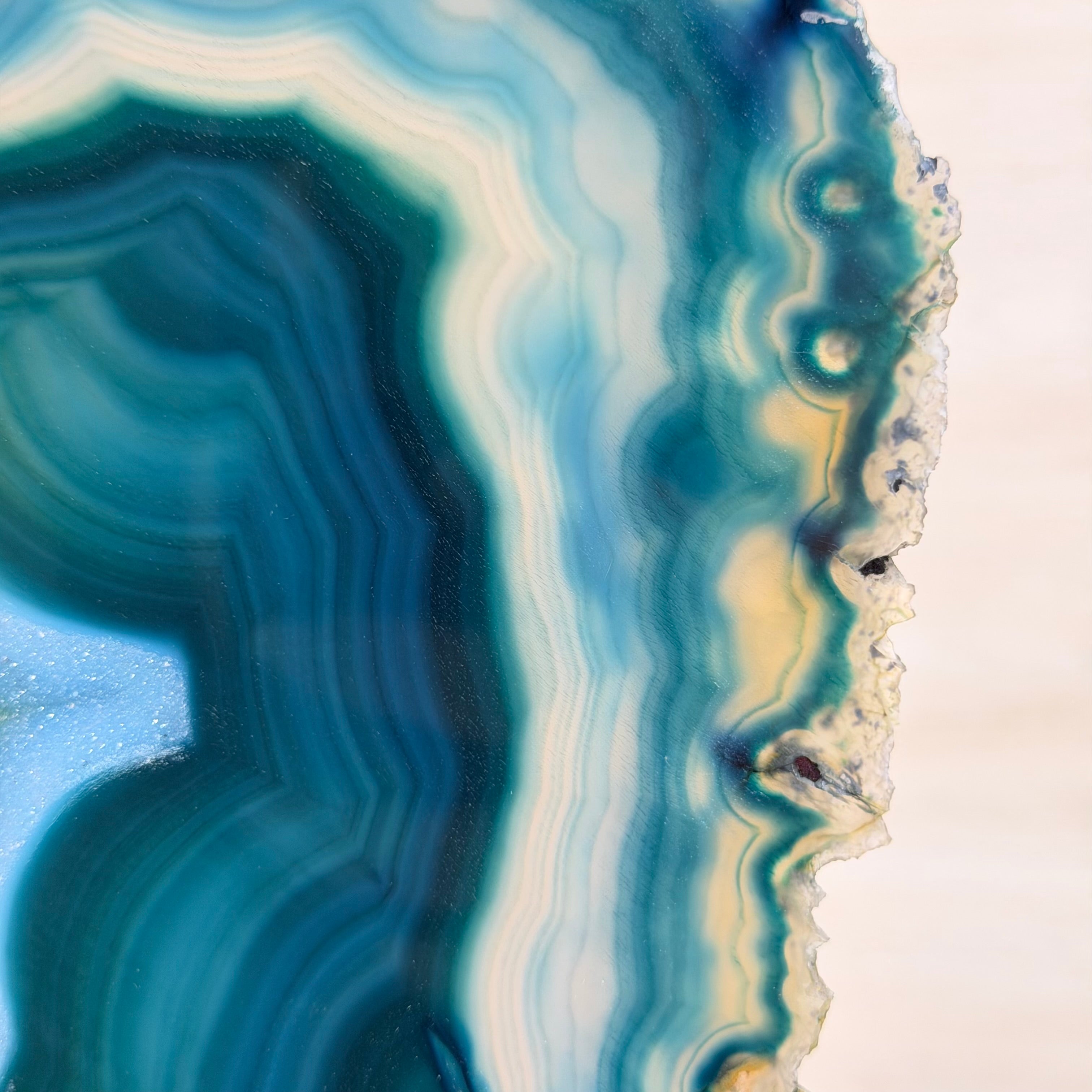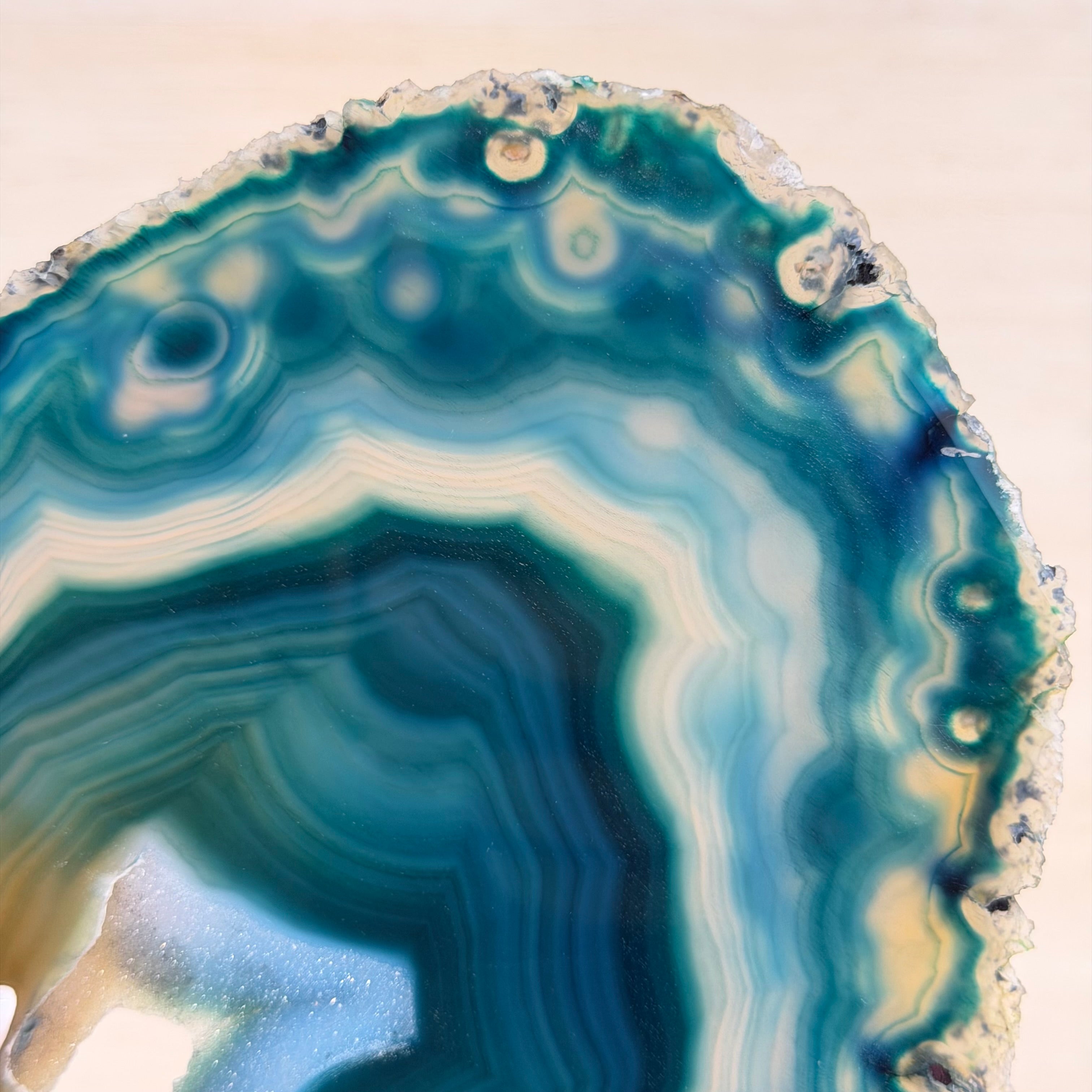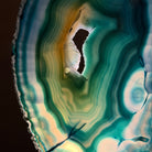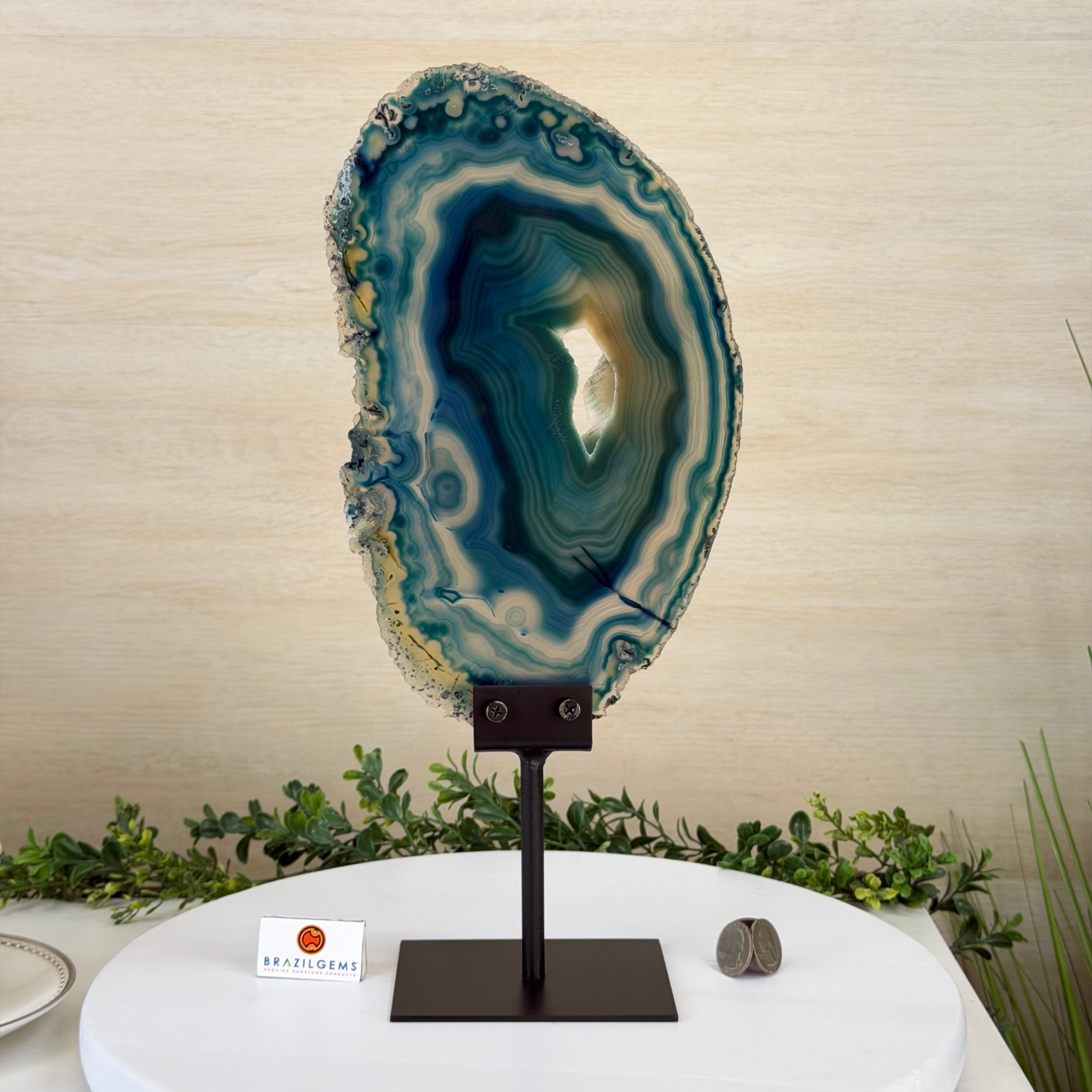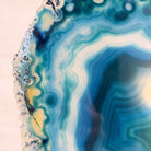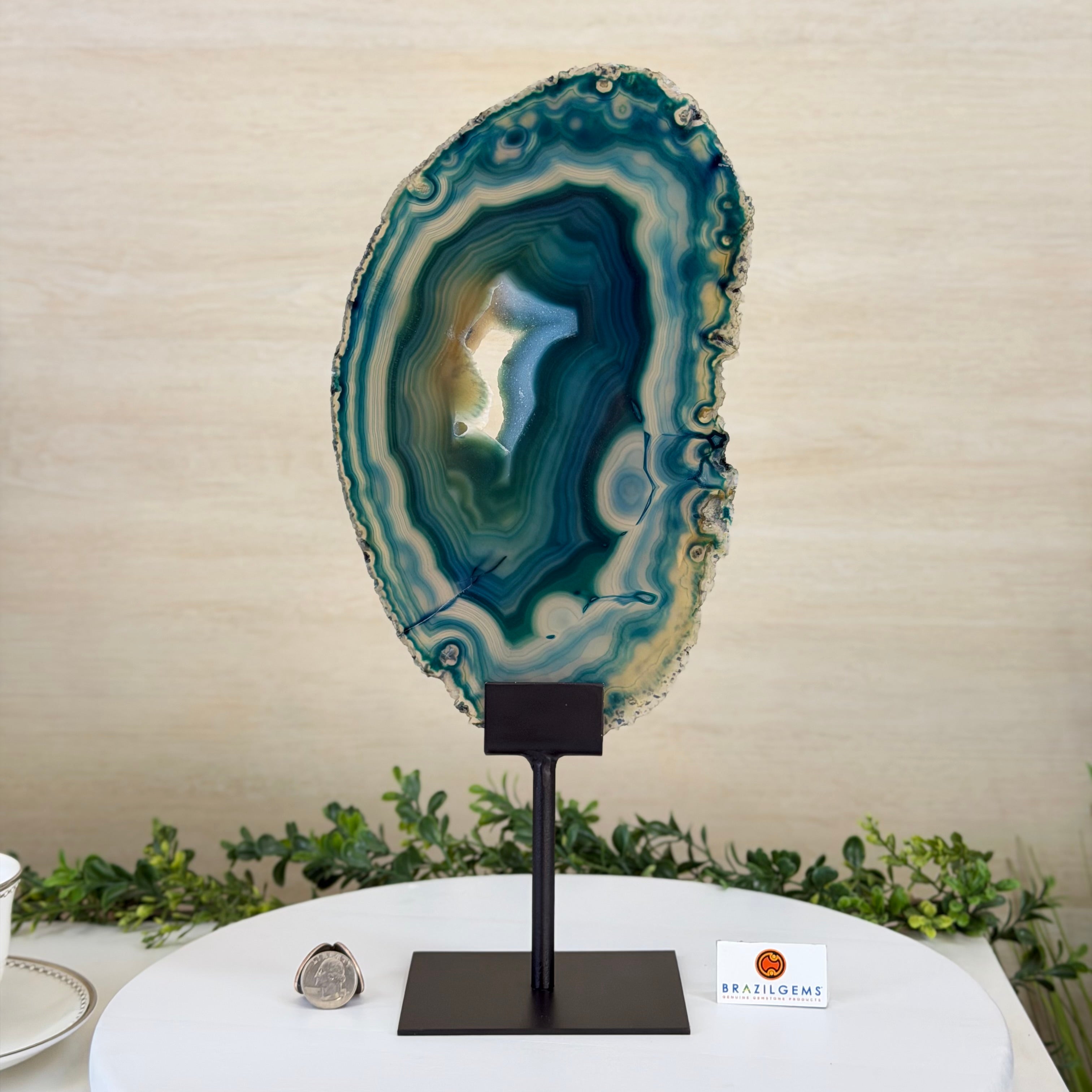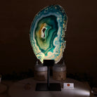 Enhance your decor with this bright slice of Brazilian Teal Agate (dyed teal) beautifully placed on a metal stand by Brazil Gems®. With its striking colors, well defined bands and druzy crystals, this is nature's work of millions of years now available to you.