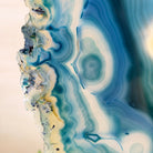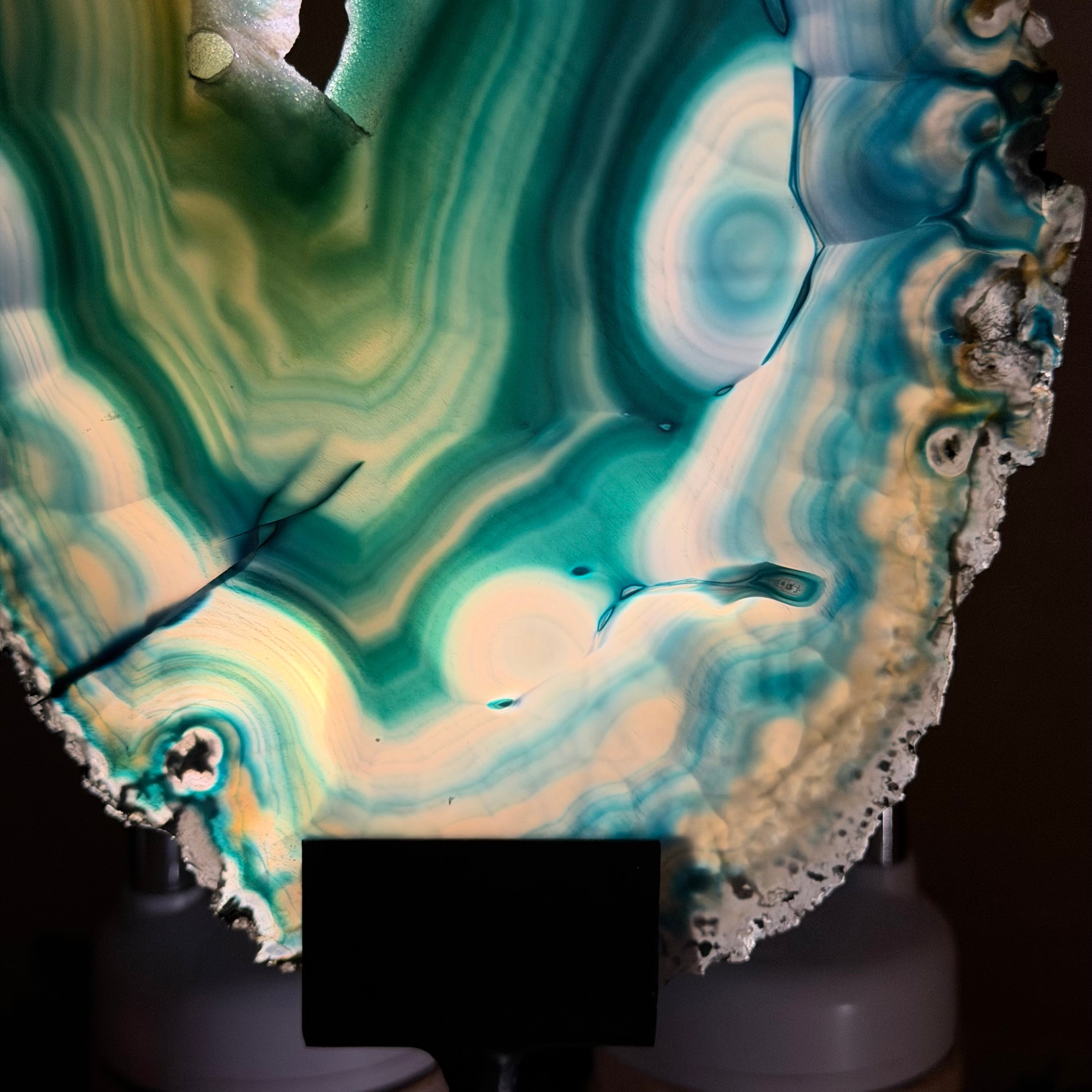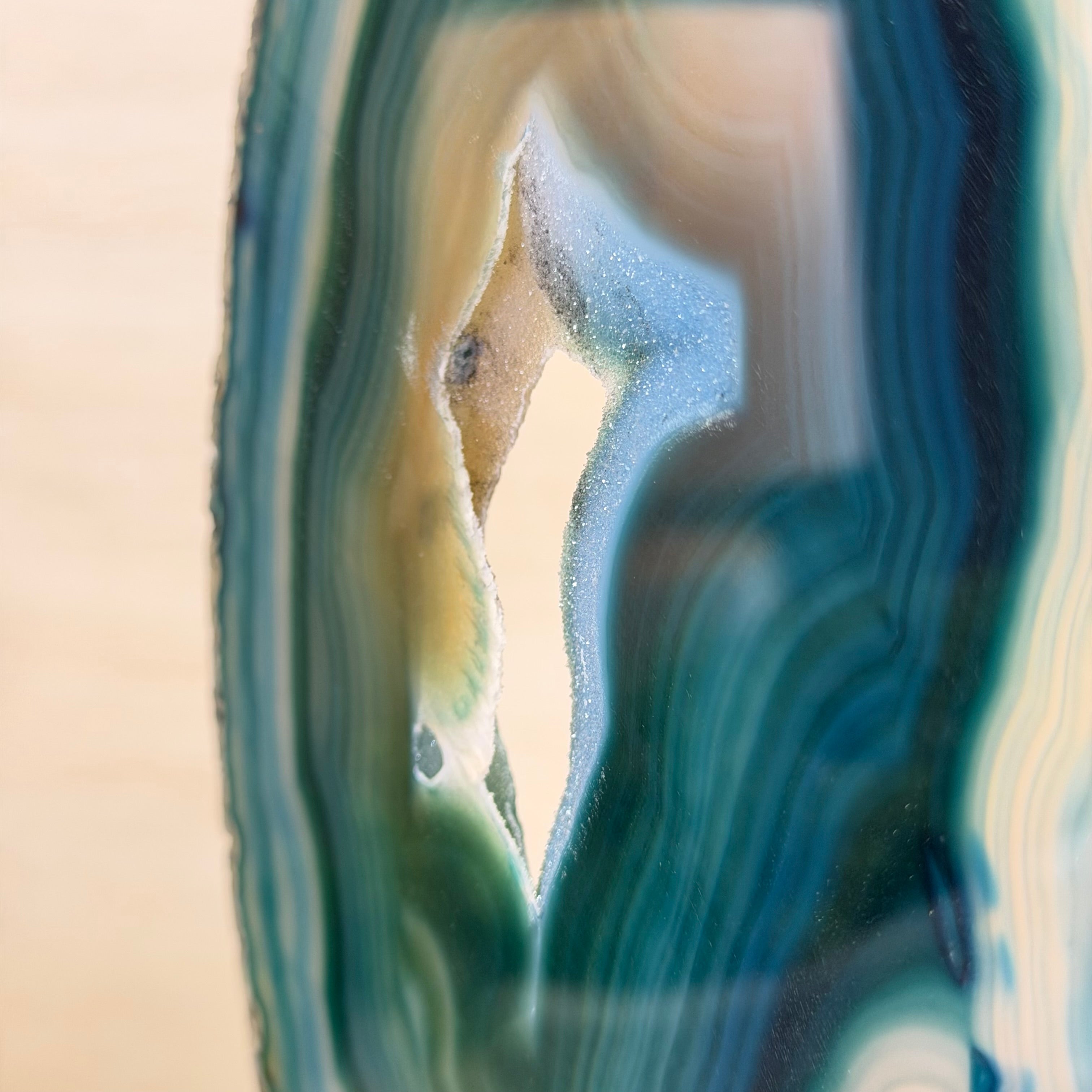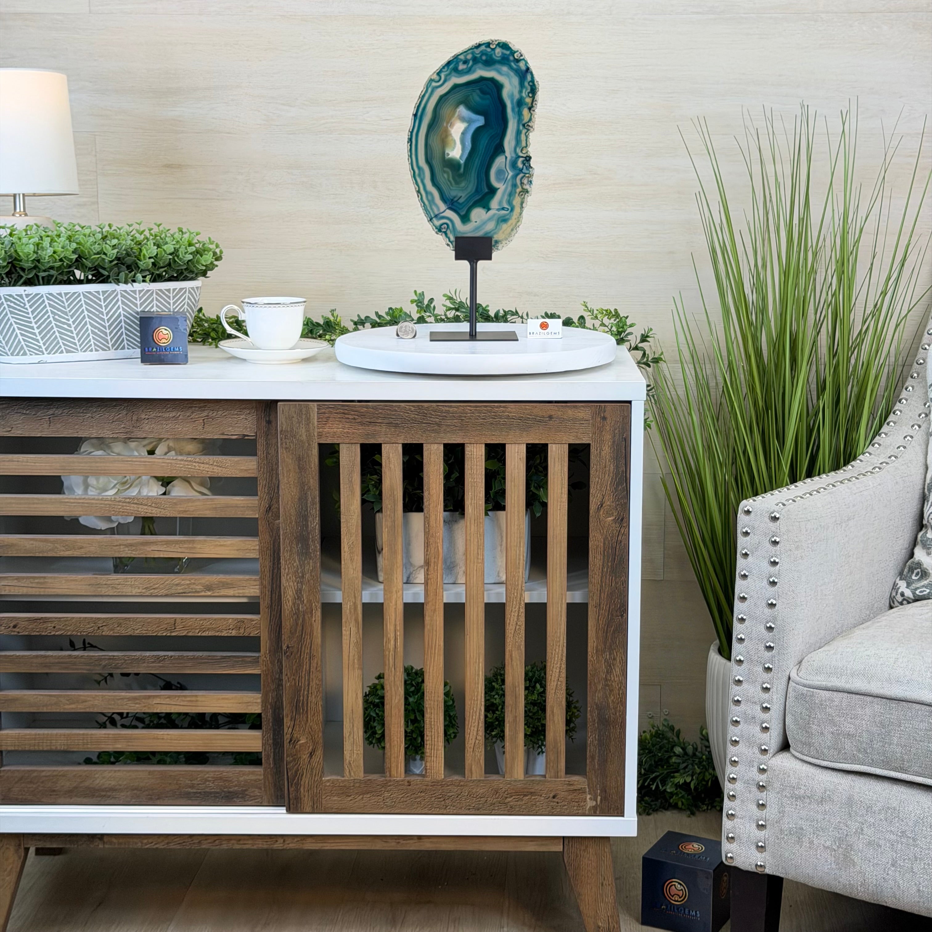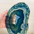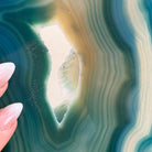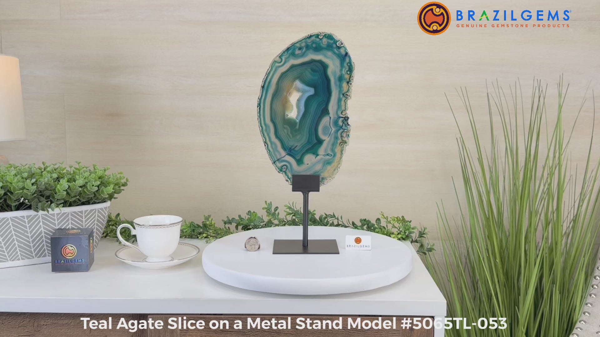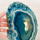 Enhance your decor with this bright slice of Brazilian Teal Agate (dyed teal) beautifully placed on a metal stand by Brazil Gems®. With its striking colors, well defined bands and druzy crystals, this is nature's work of millions of years now available to you.