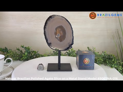 Discover the beauty of nature with this stunning Brazilian Agate slice displayed on a sleek metal base. Admire its vibrant colors, intricate bands, unique formations, and sparkling crystals, adding a touch of elegance to any room. This unique gemstone is a true testament to millions of years of nature's artistry, now available for you to enjoy.