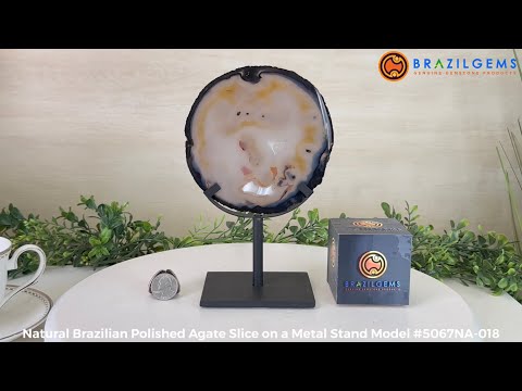 Discover the beauty of nature with this stunning Brazilian Agate slice displayed on a sleek metal base. Admire its vibrant colors, intricate bands, unique formations, and sparkling crystals, adding a touch of elegance to any room. This unique gemstone is a true testament to millions of years of nature's artistry, now available for you to enjoy.