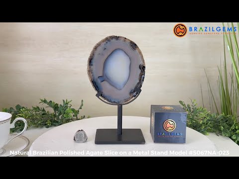 Discover the beauty of nature with this stunning Brazilian Agate slice displayed on a sleek metal base. Admire its vibrant colors, intricate bands, unique formations, and sparkling crystals, adding a touch of elegance to any room. This unique gemstone is a true testament to millions of years of nature's artistry, now available for you to enjoy.