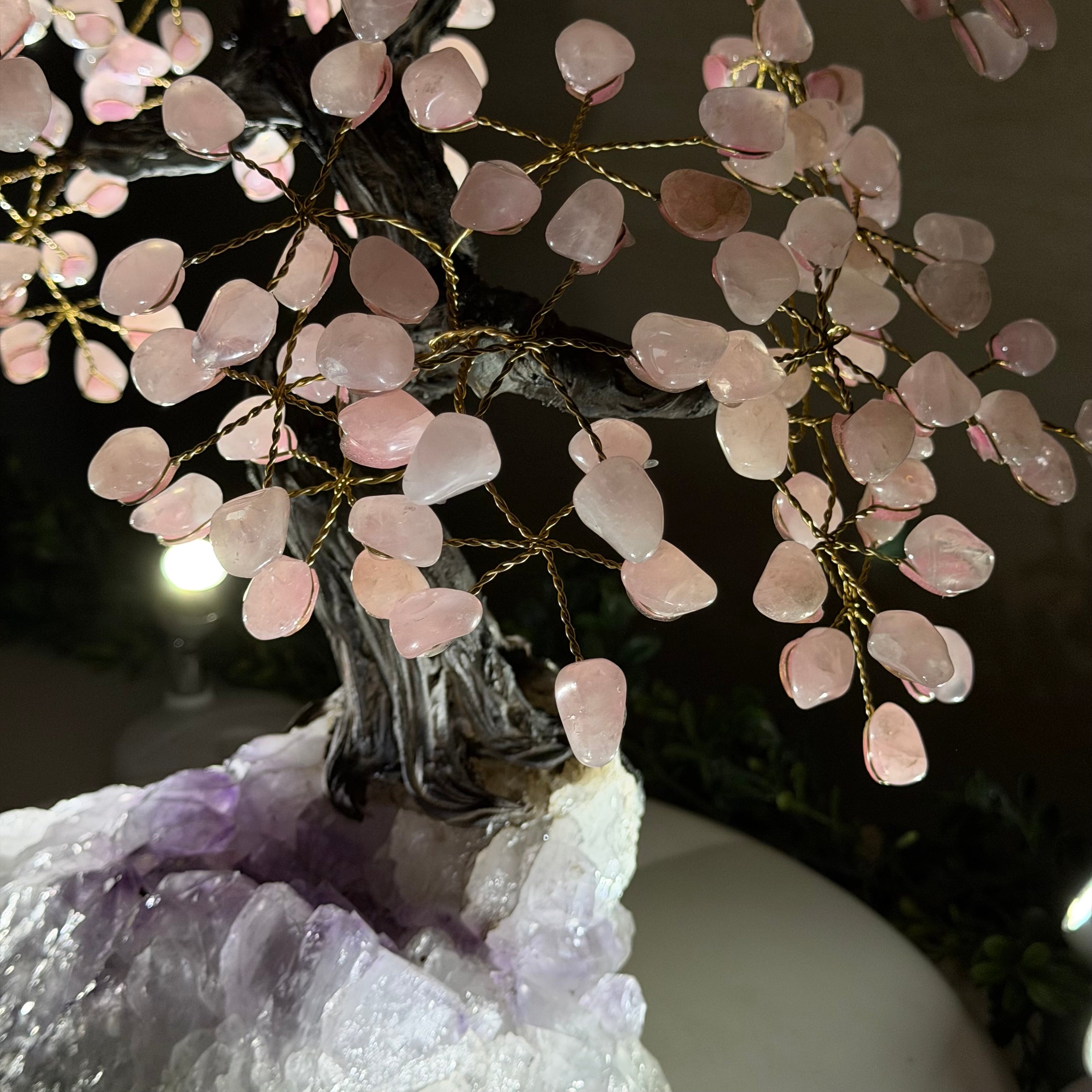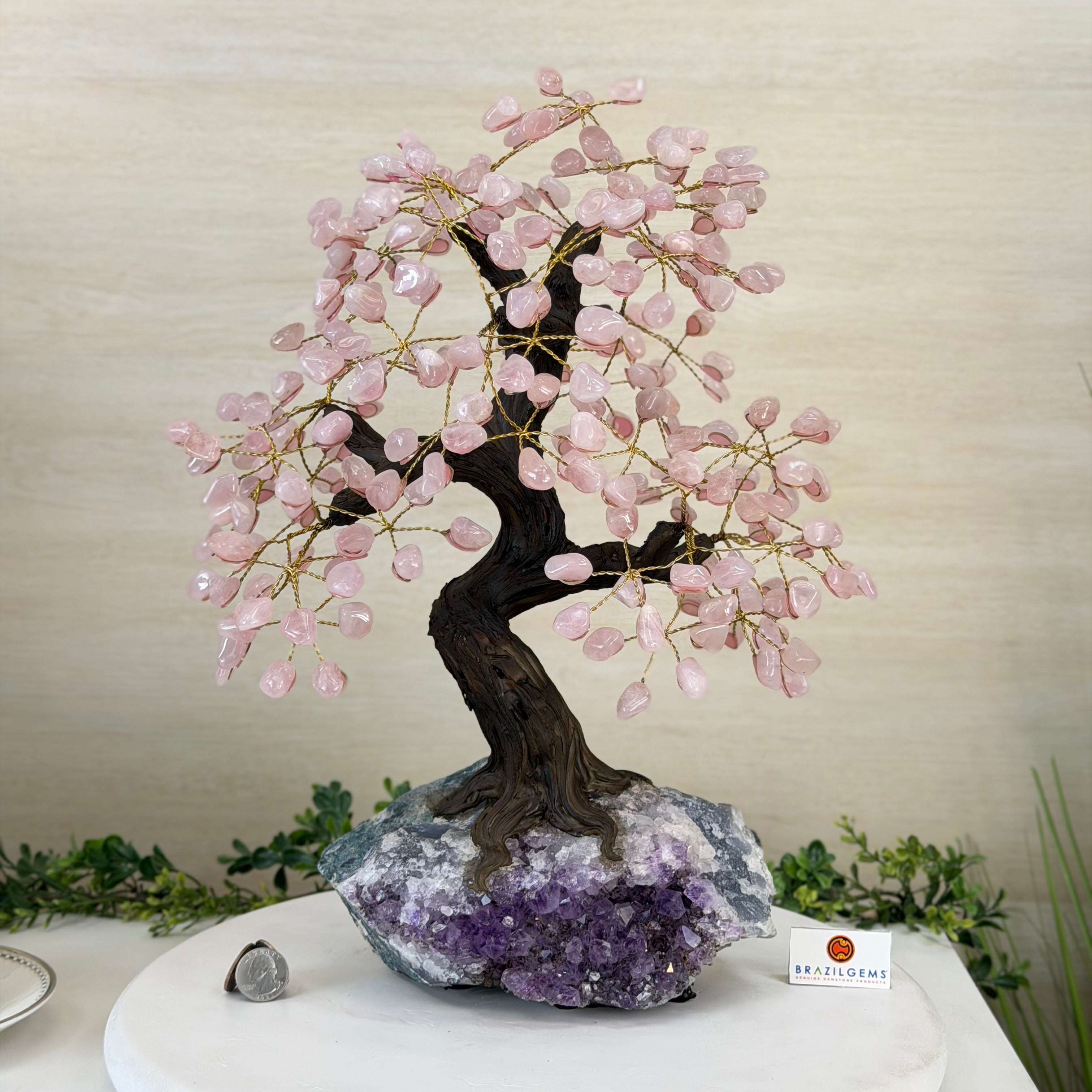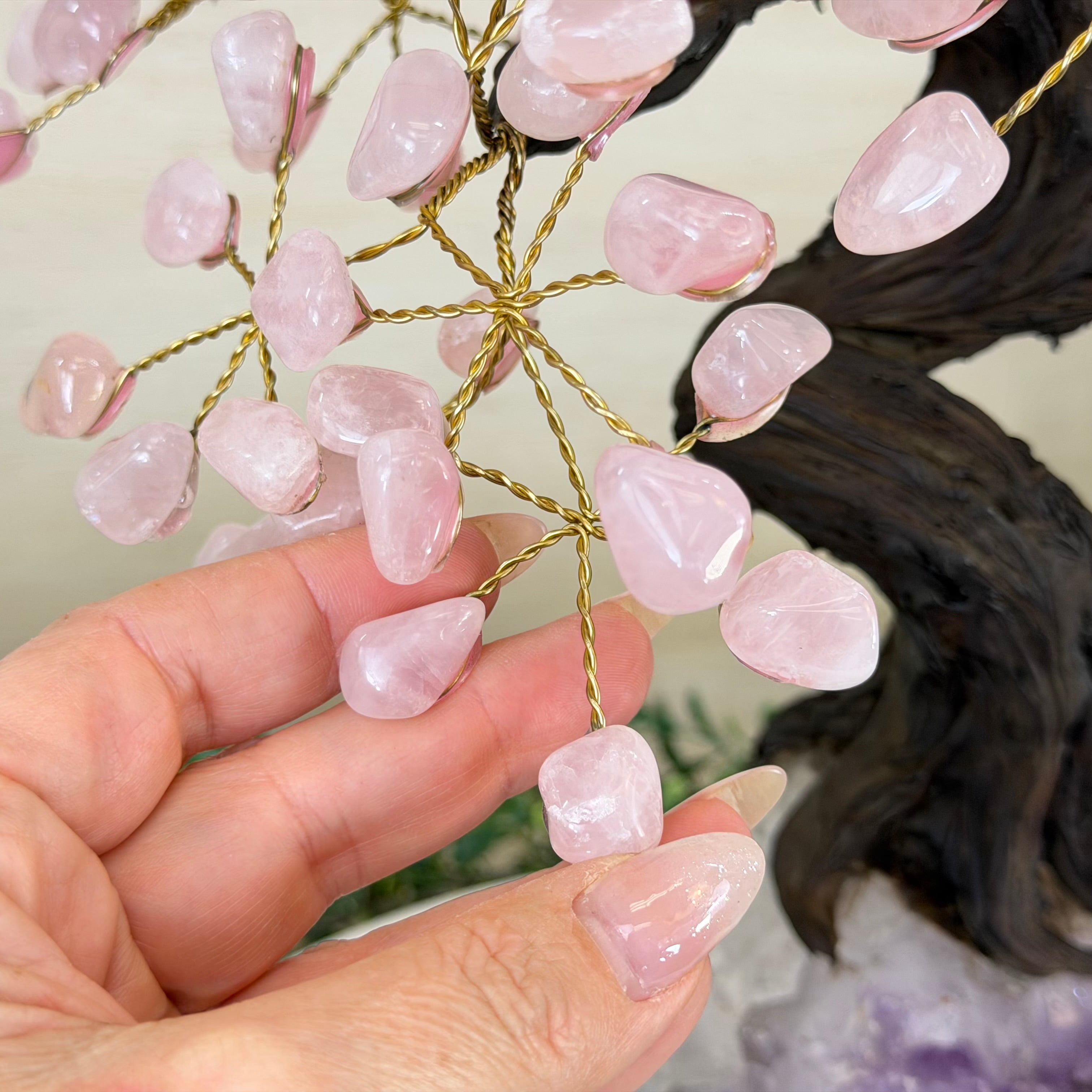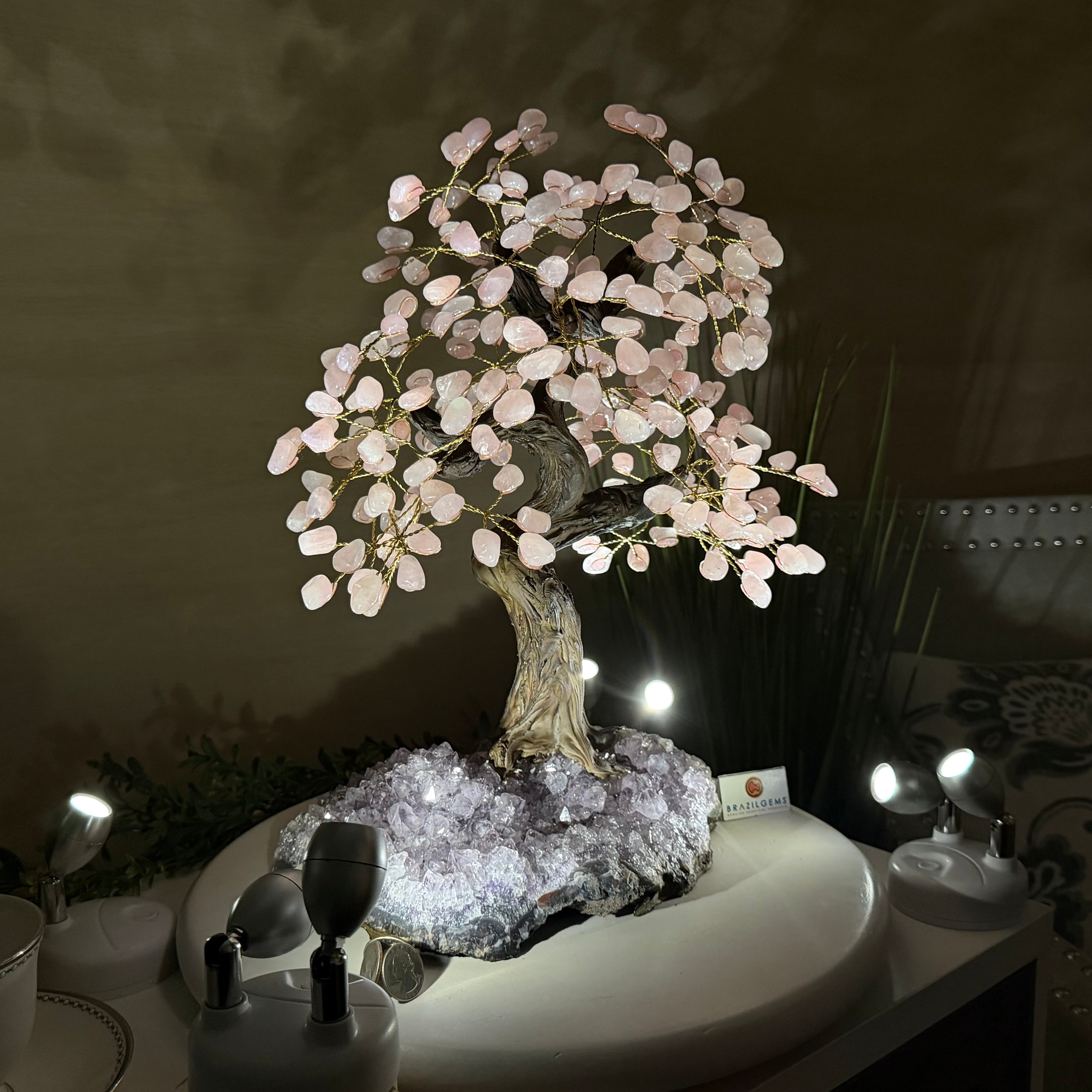 17" Tall Rose Quartz Bonsai Gemstone Tree, Amethyst Base, 240 Gems #5405ROSQ-002