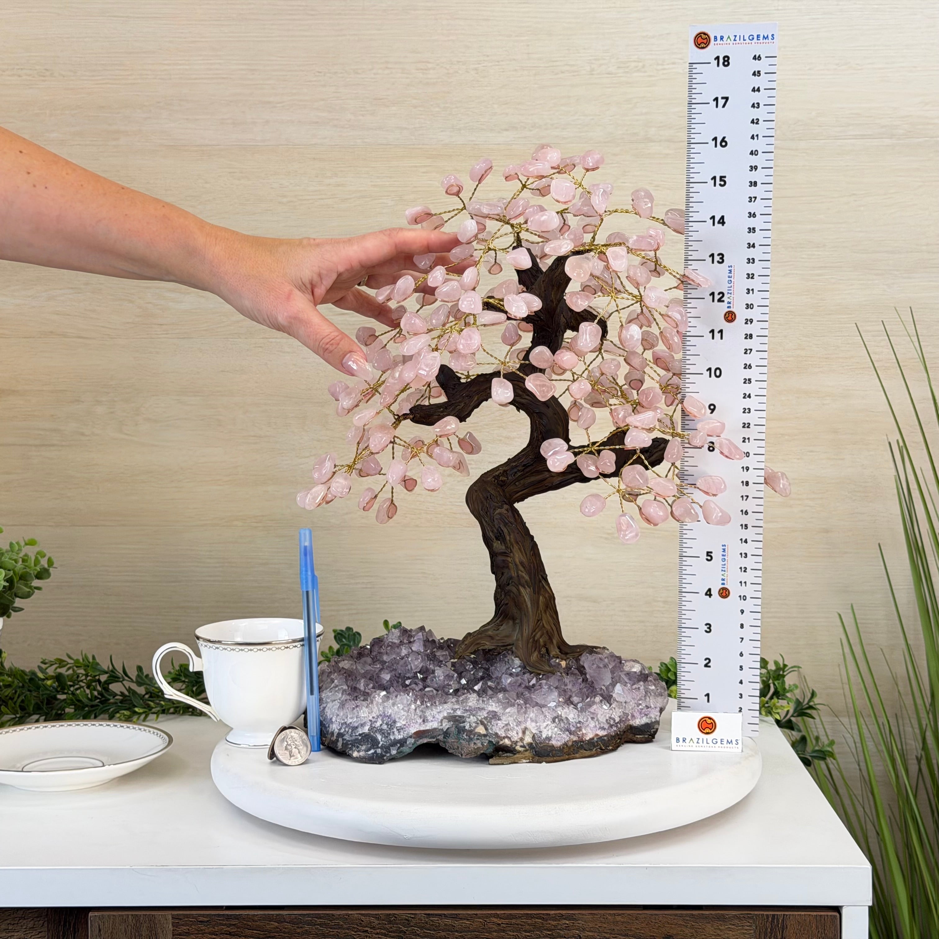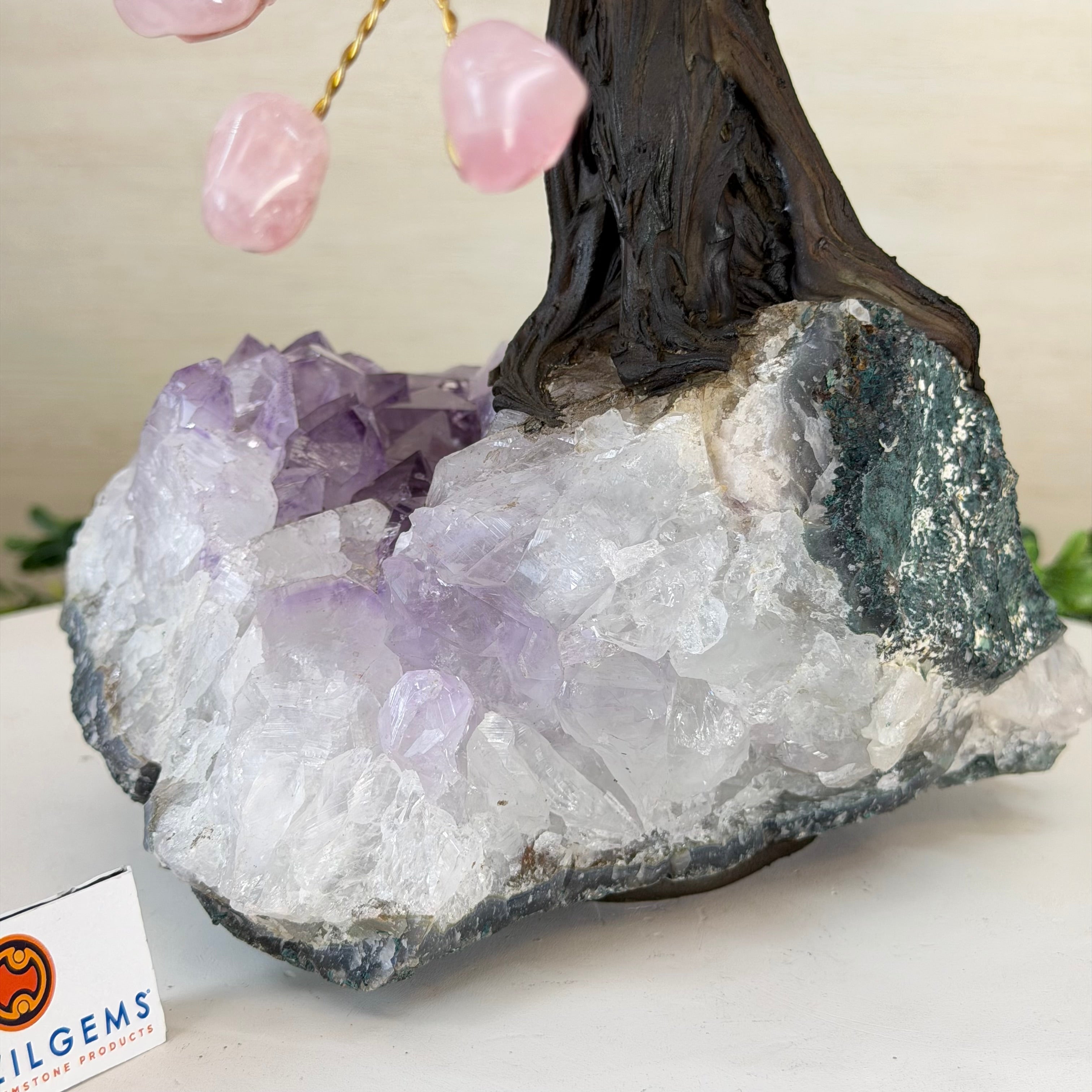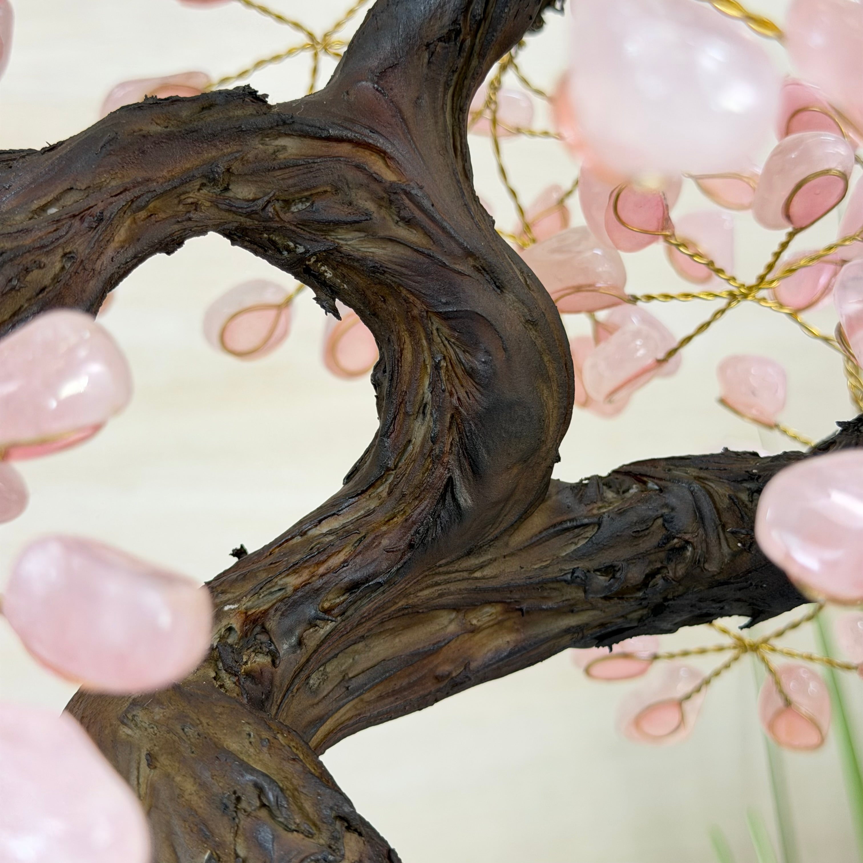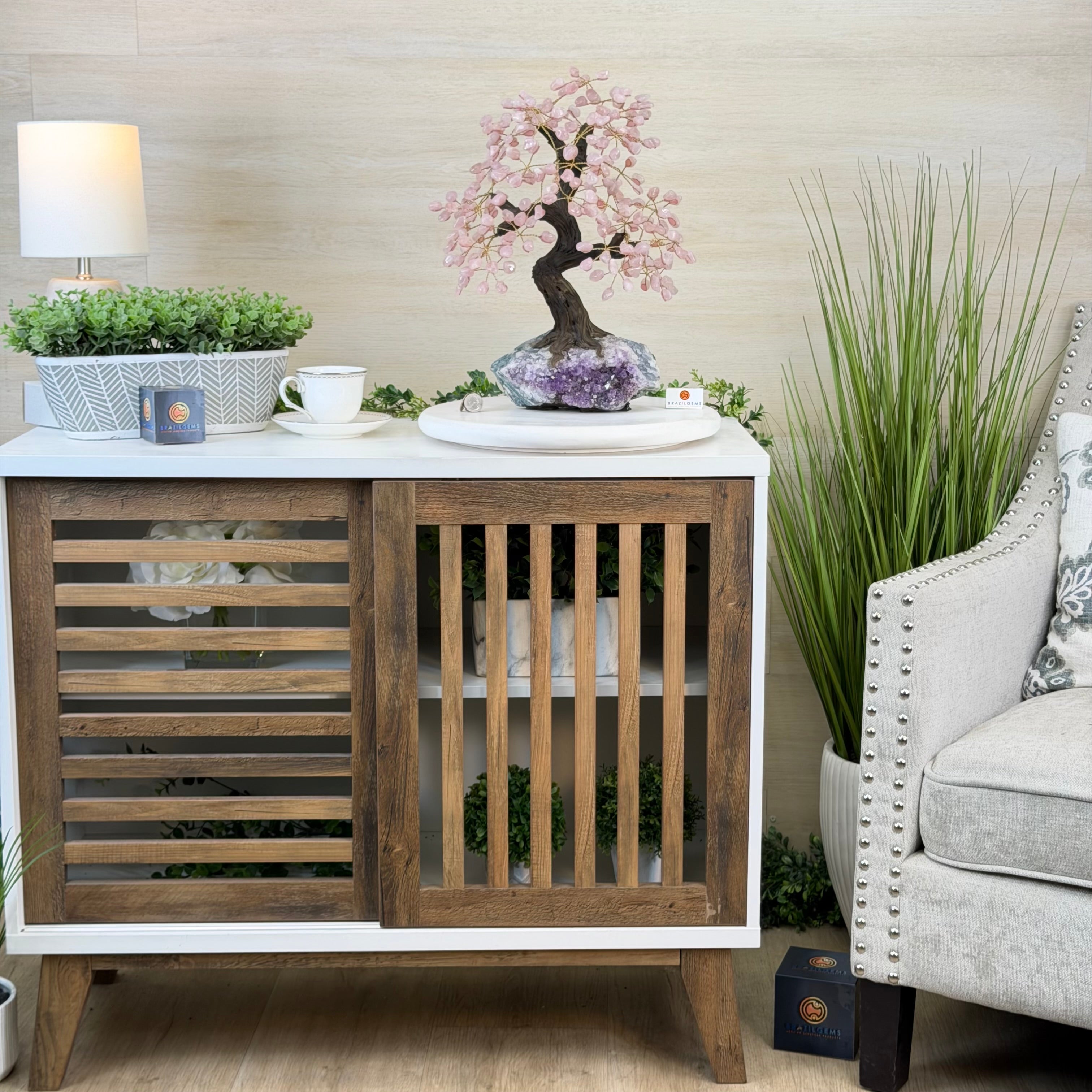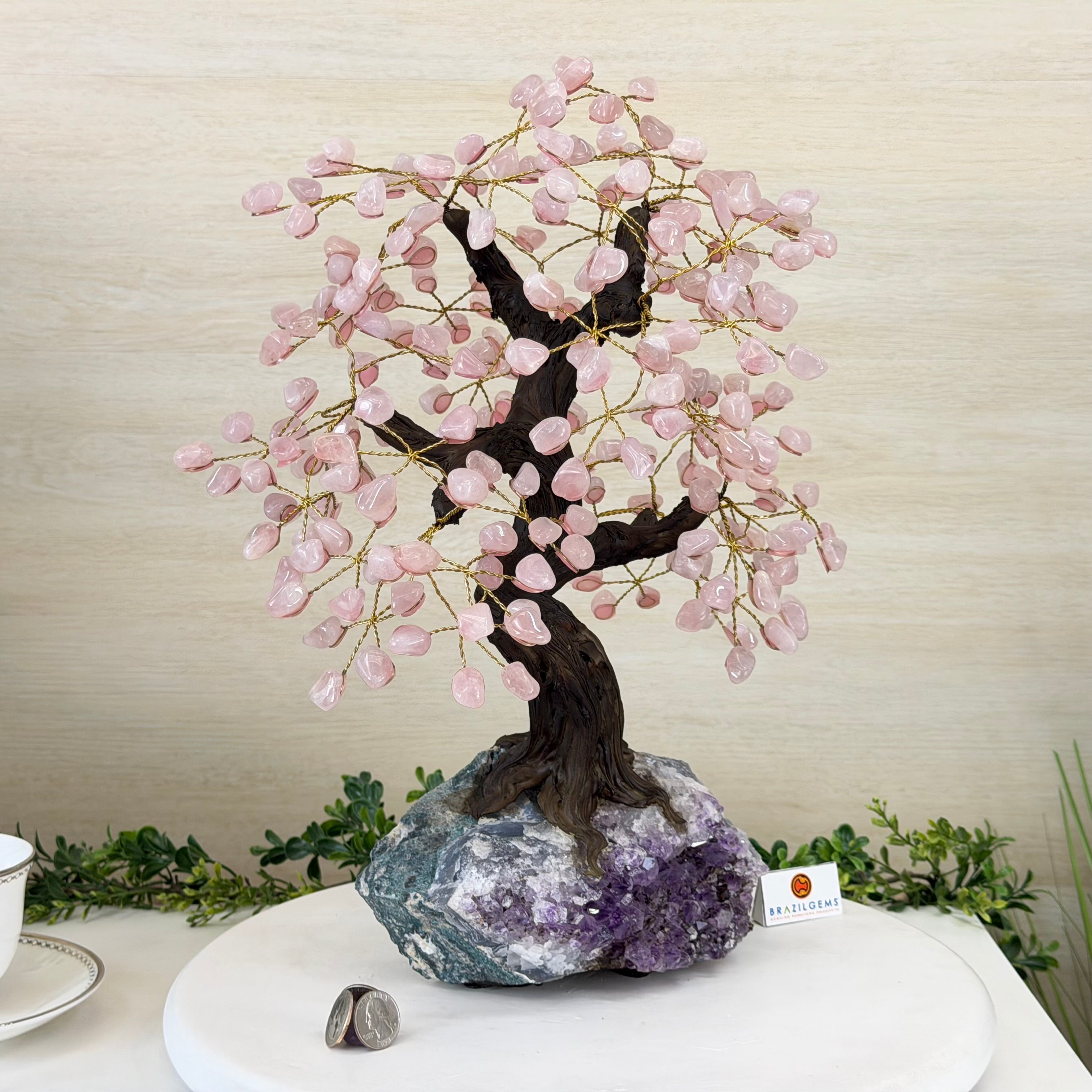 17" Tall Rose Quartz Bonsai Gemstone Tree, Amethyst Base, 240 Gems #5405ROSQ-002