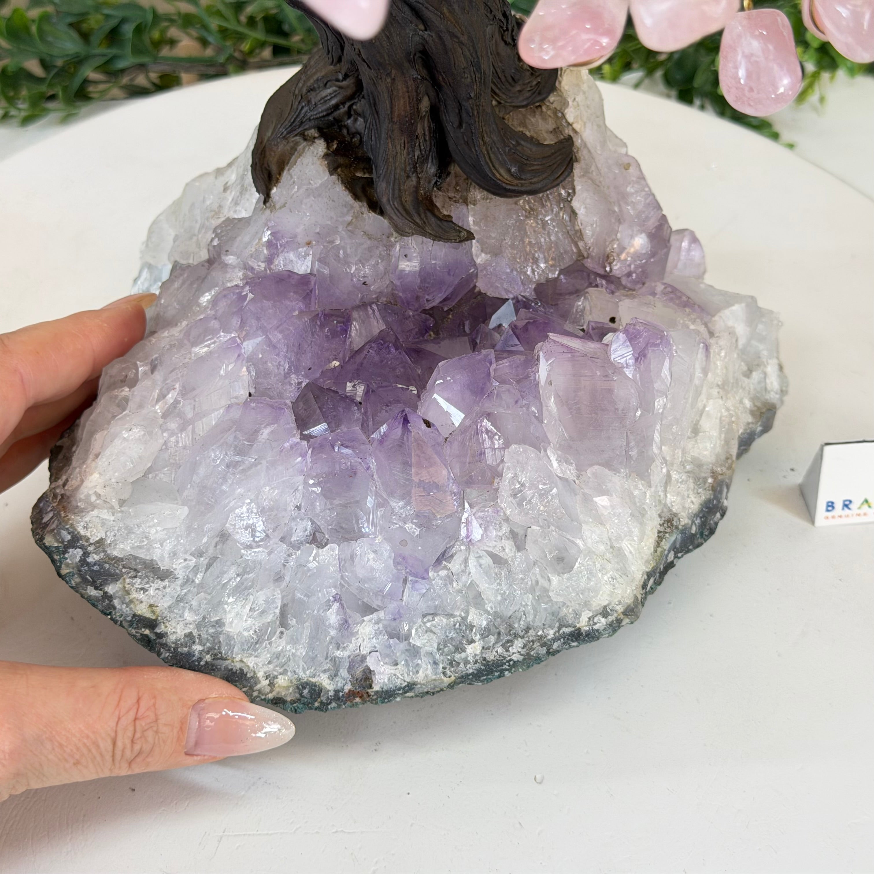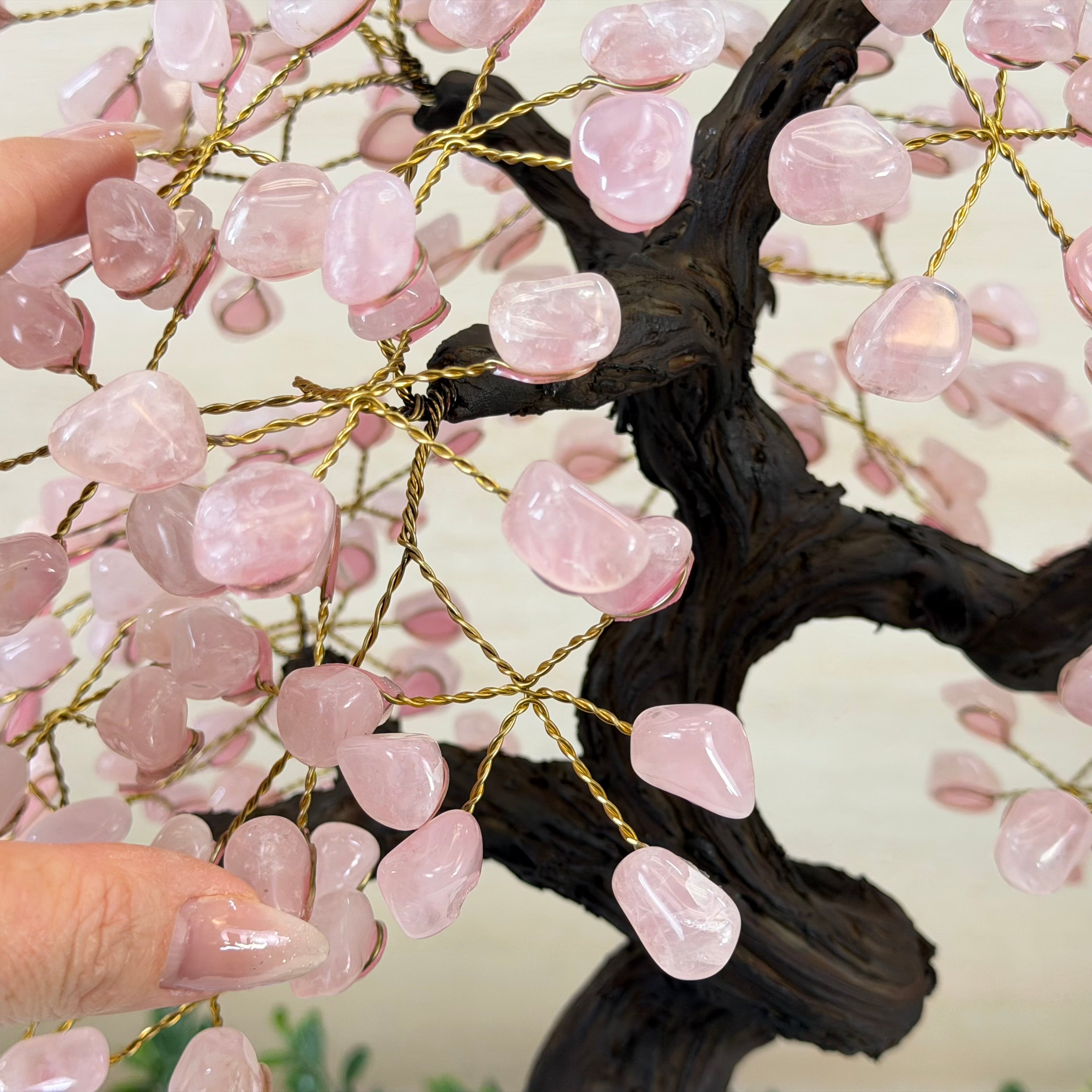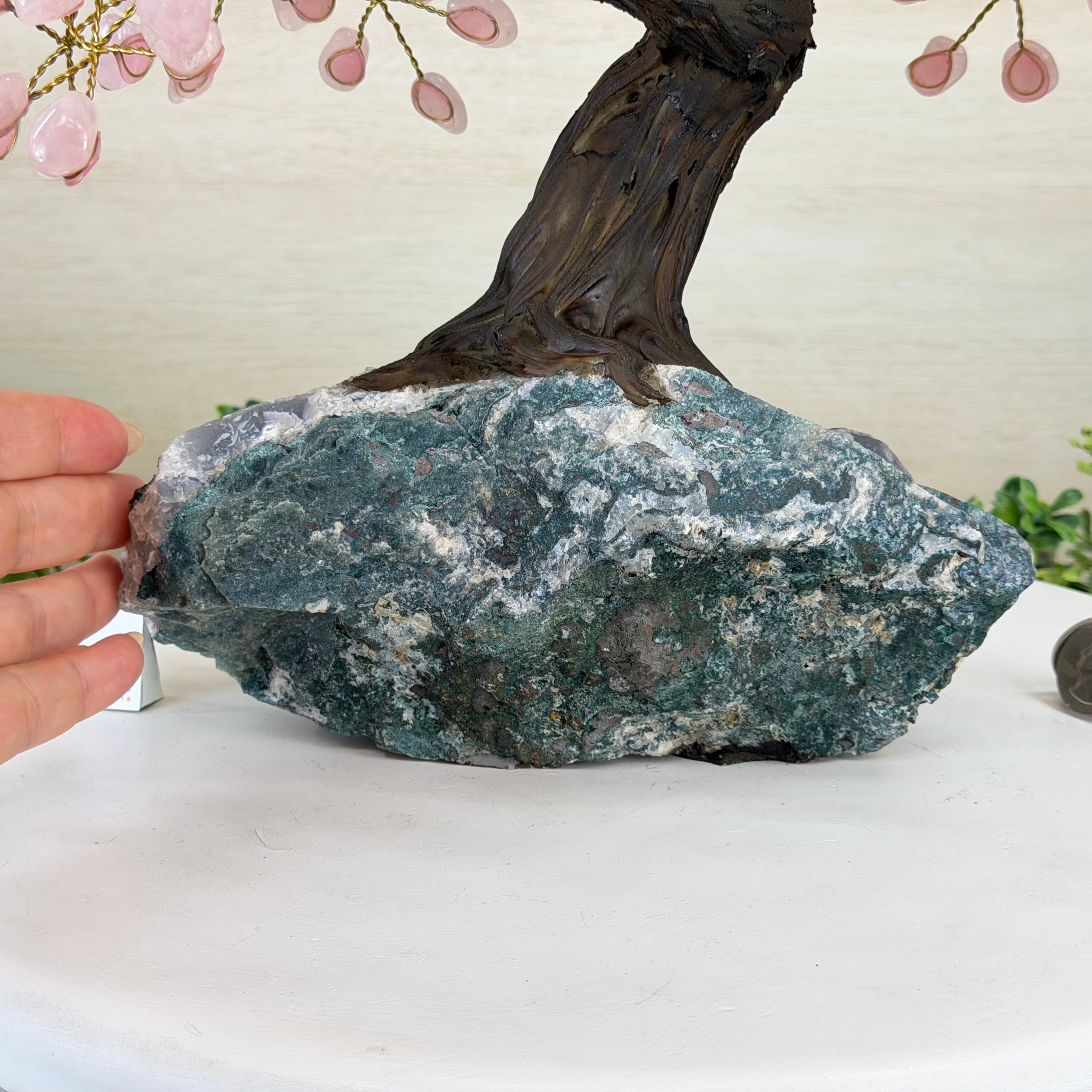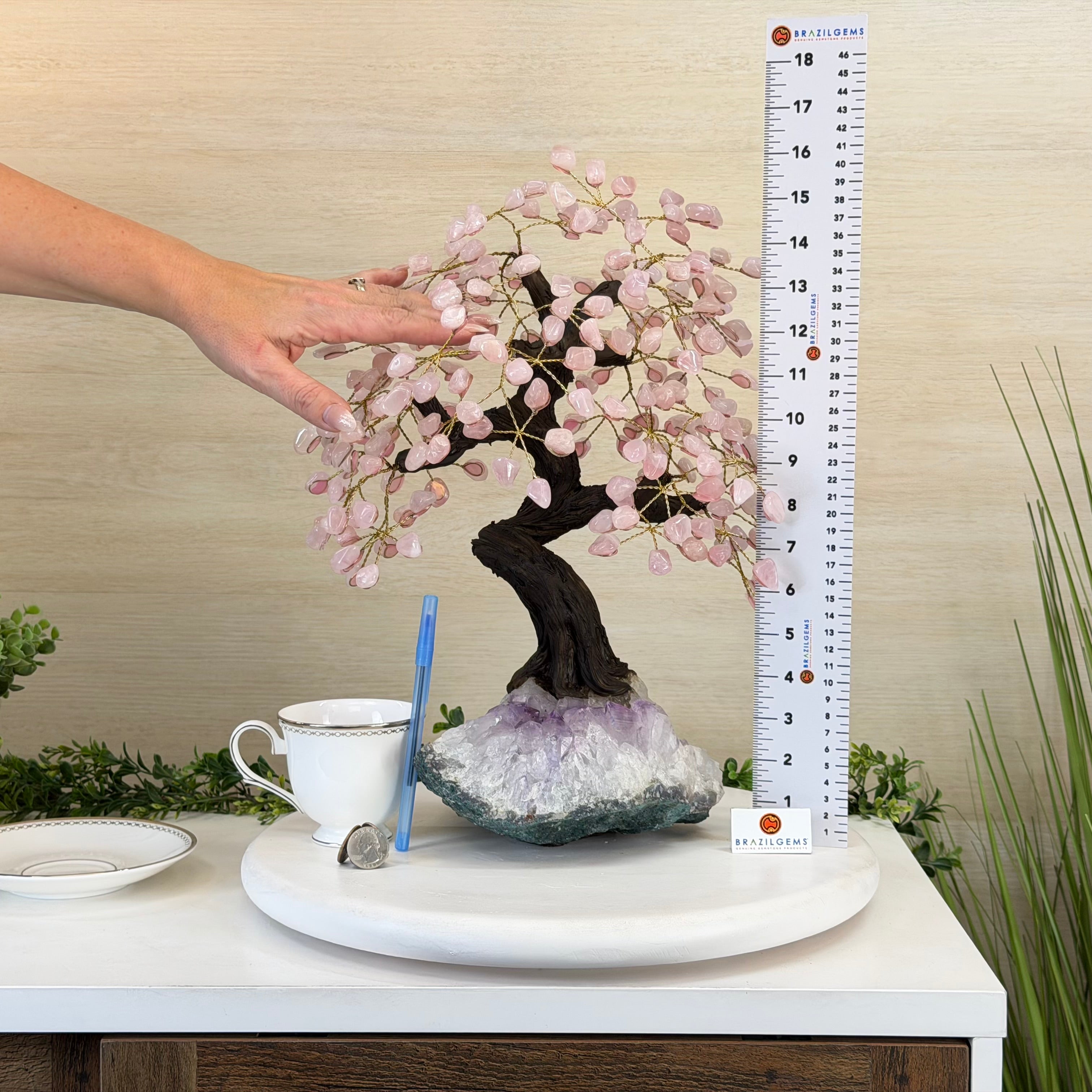 17" Tall Rose Quartz Bonsai Gemstone Tree, Amethyst Base, 240 Gems #5405ROSQ-002