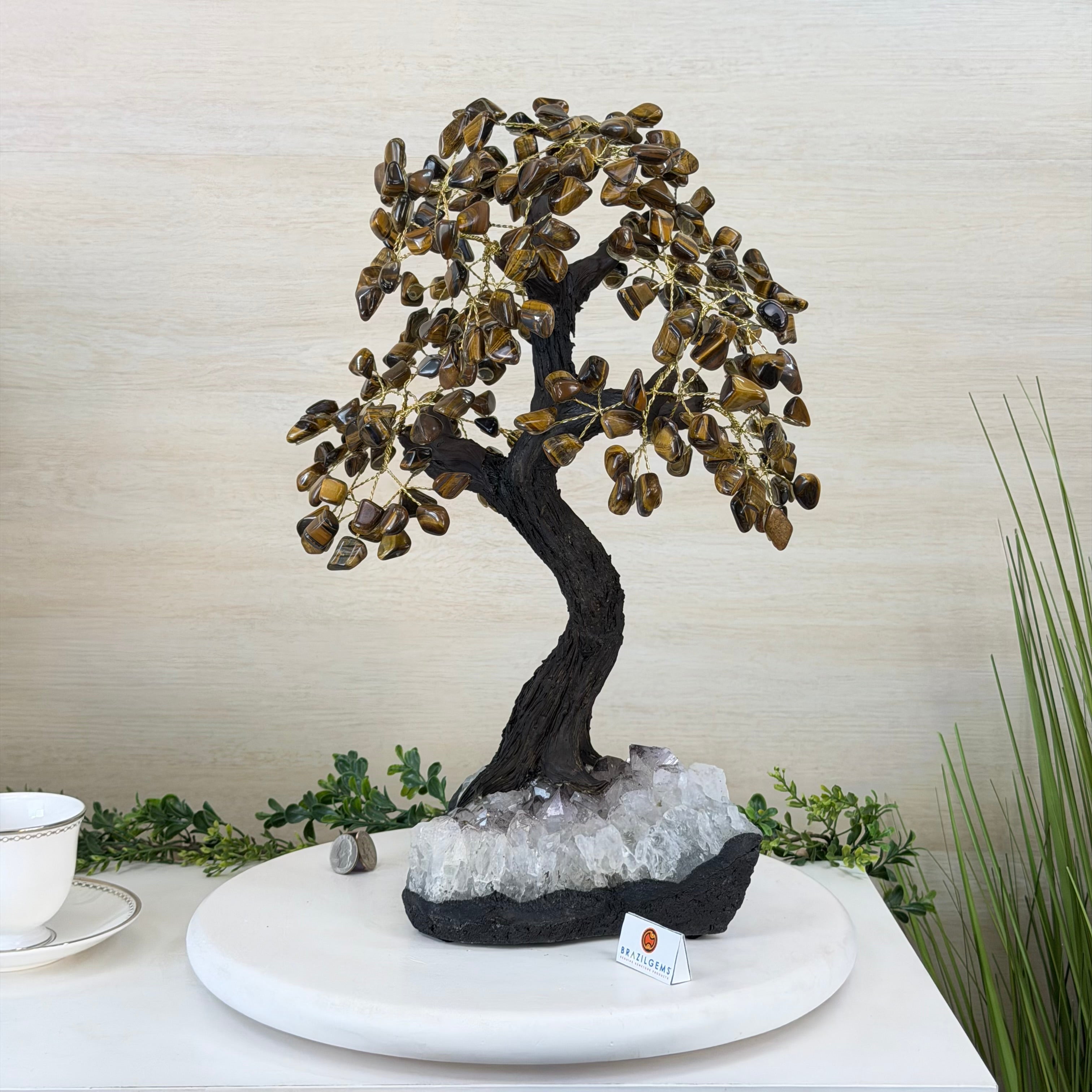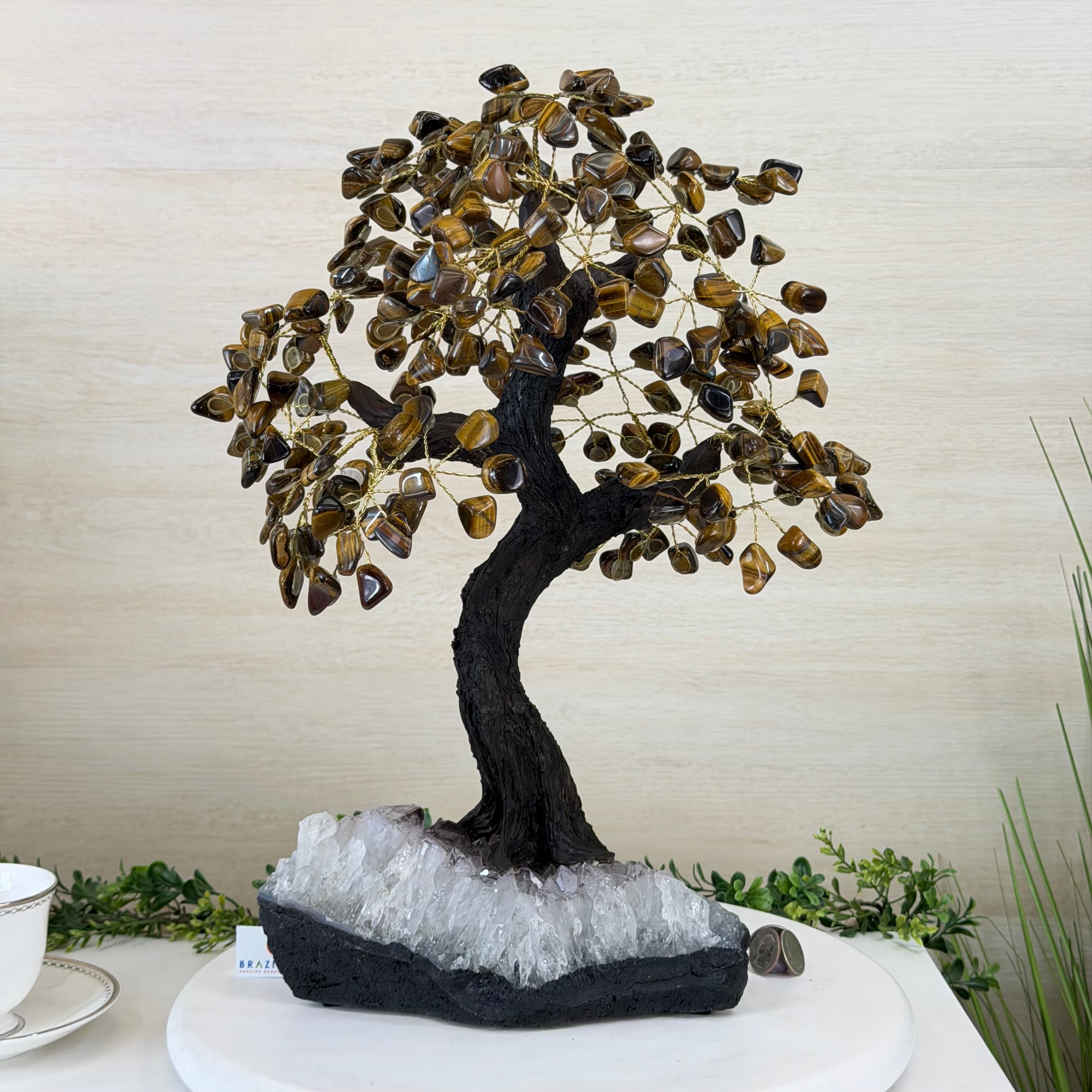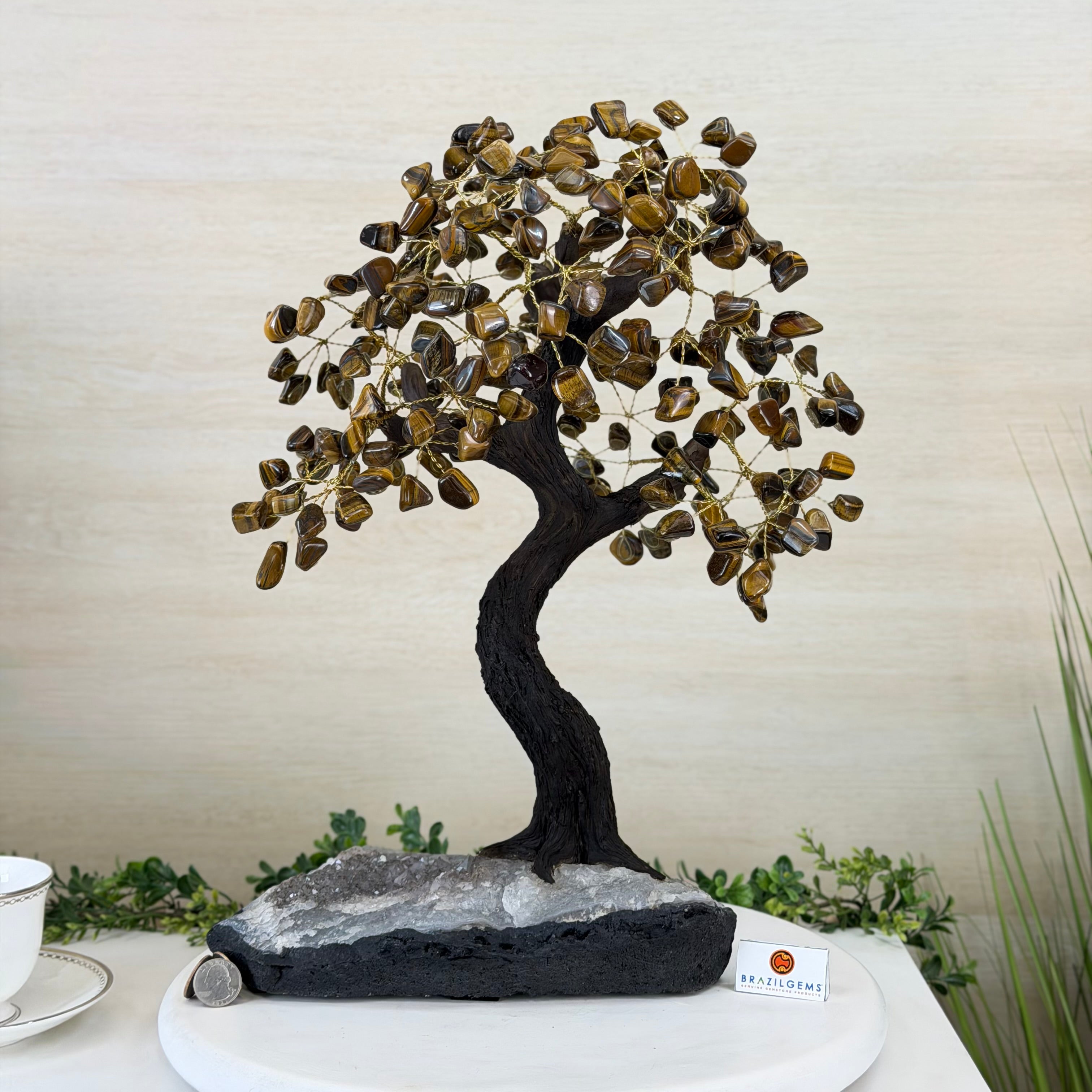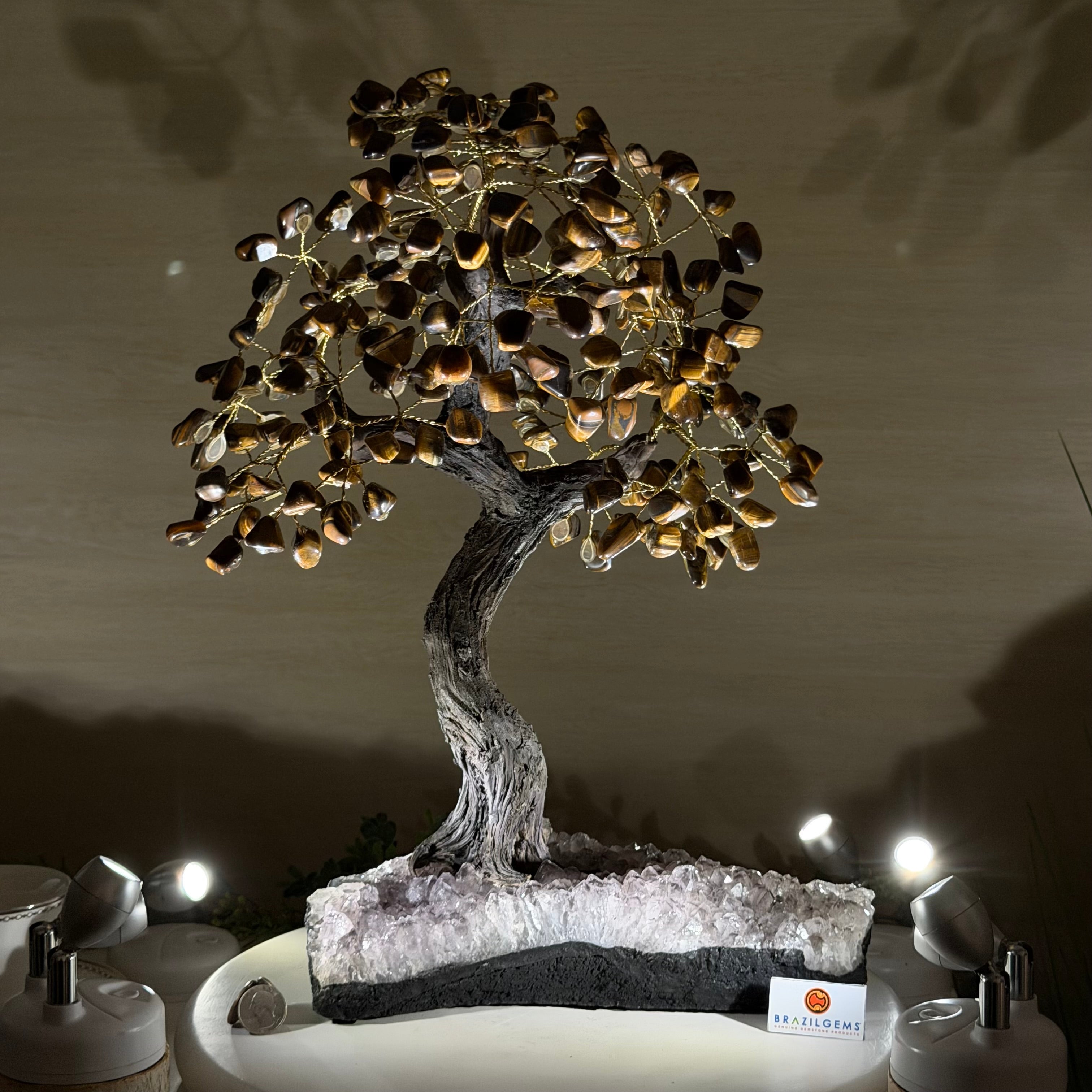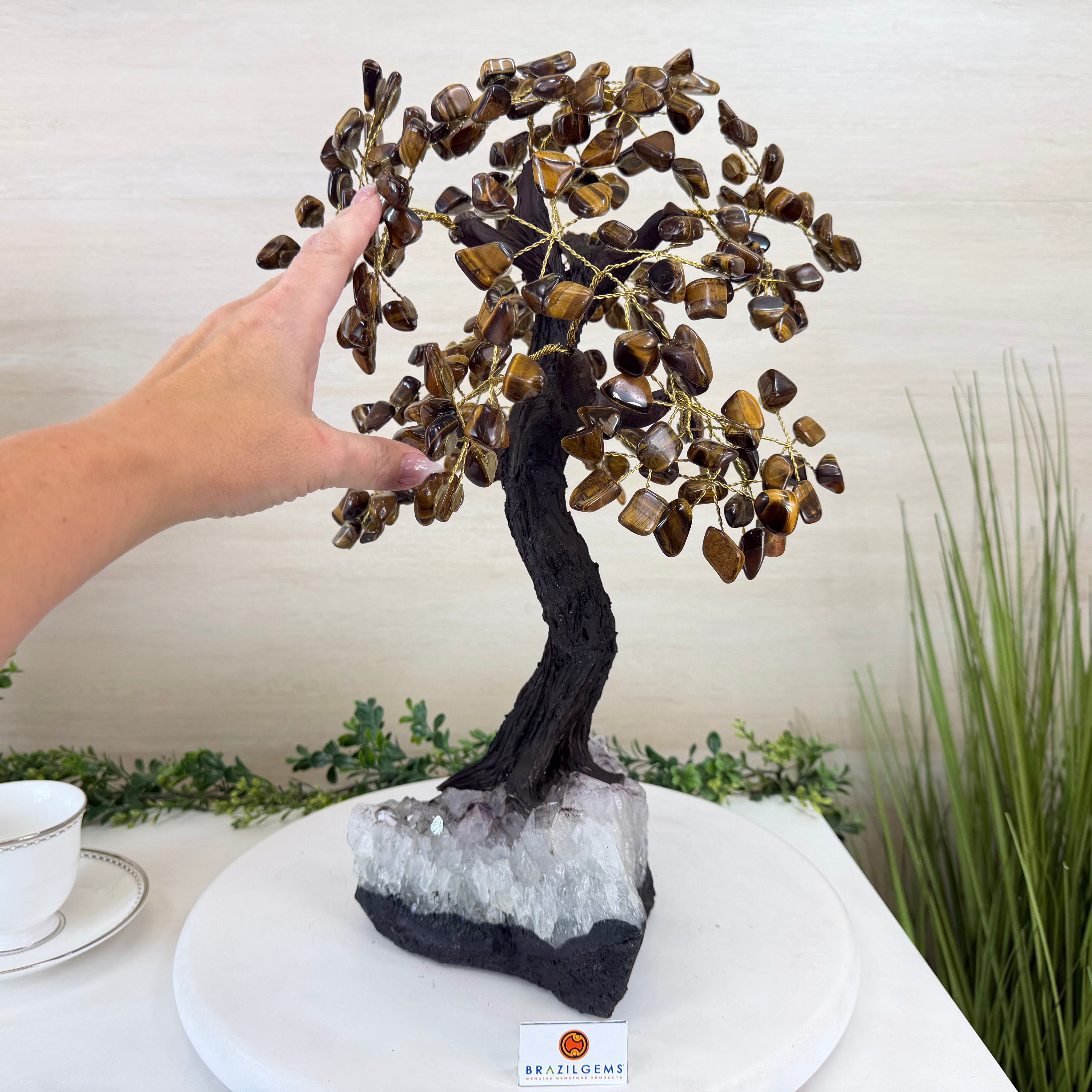 17" Tall Tiger's Eye Bonsai Gemstone Tree, Amethyst base, 240 Gems #5405TIGE-001