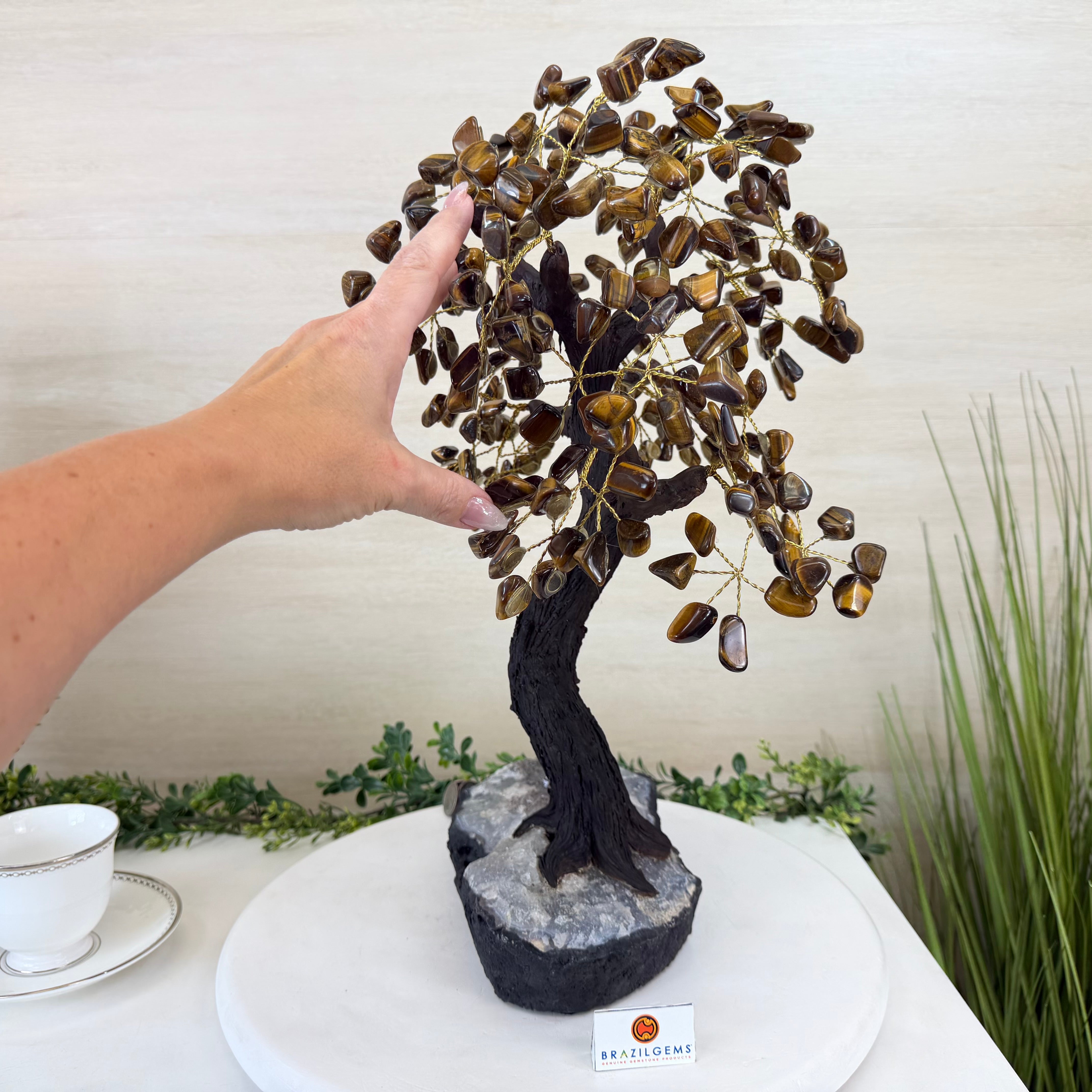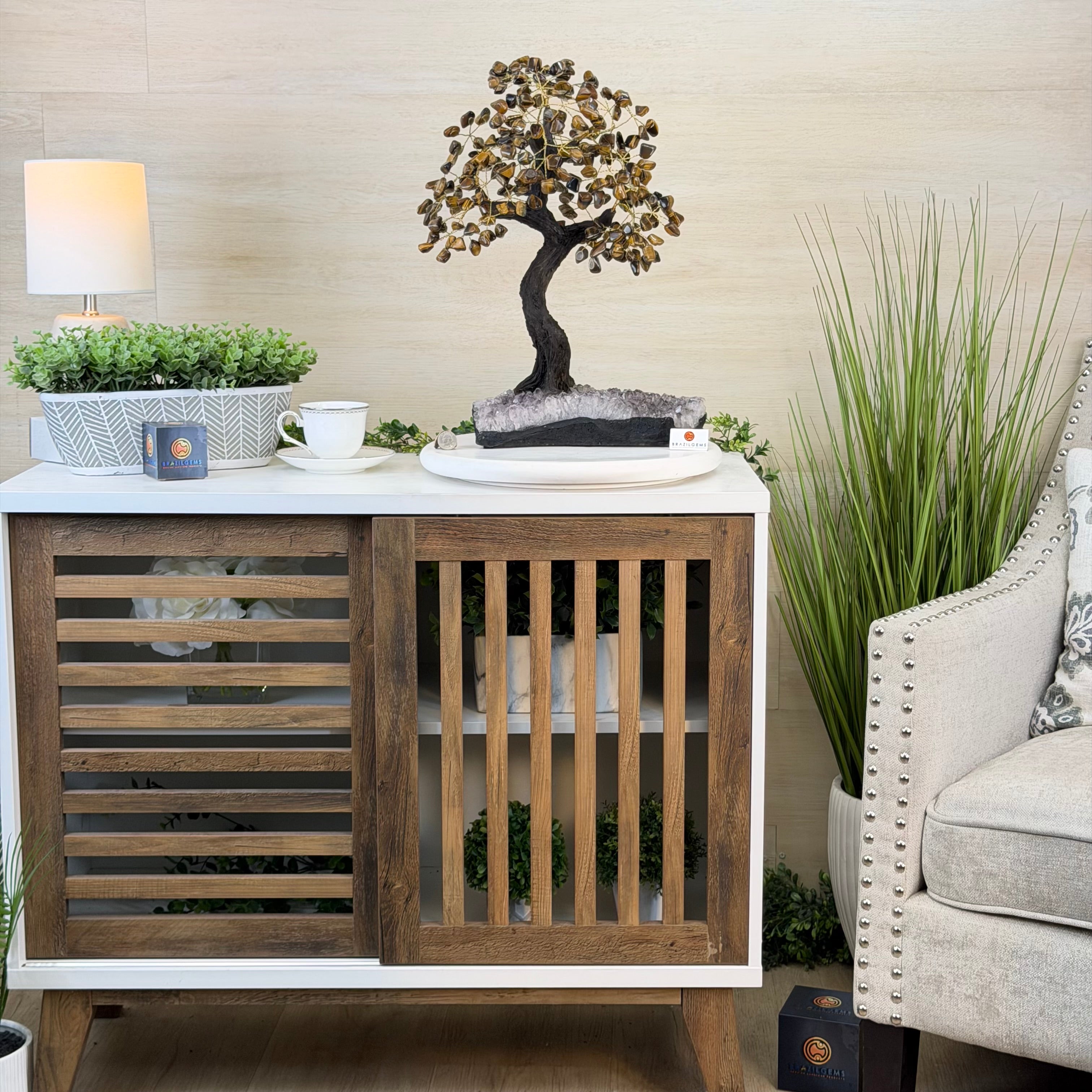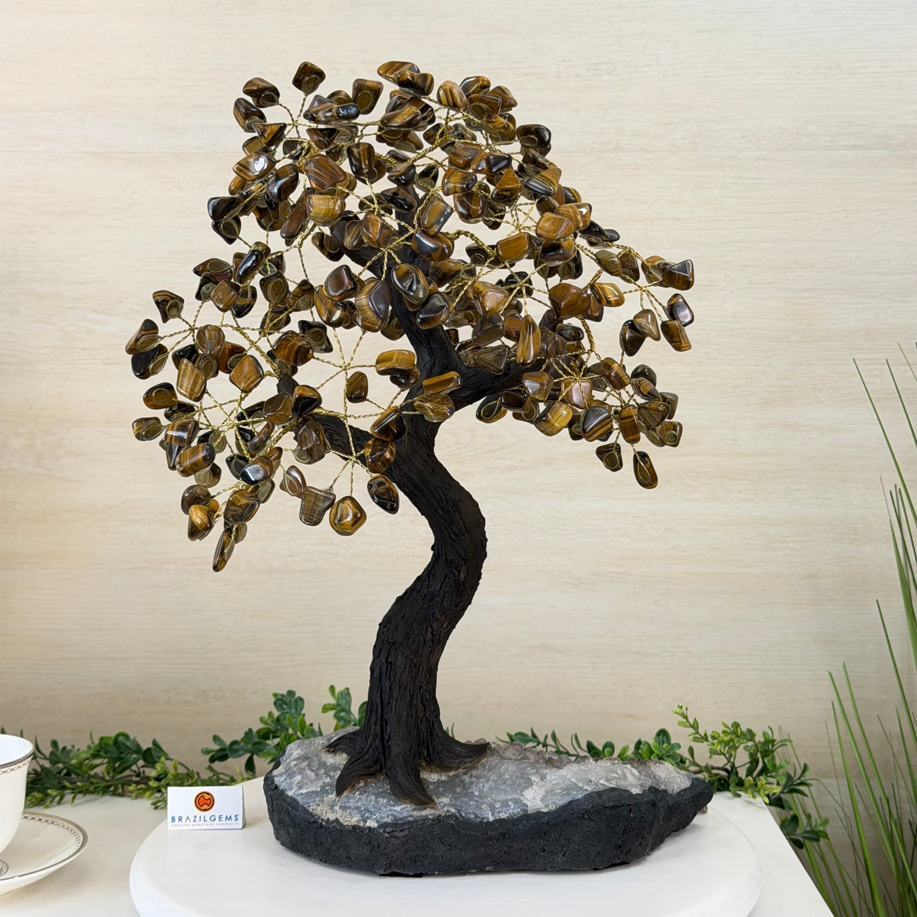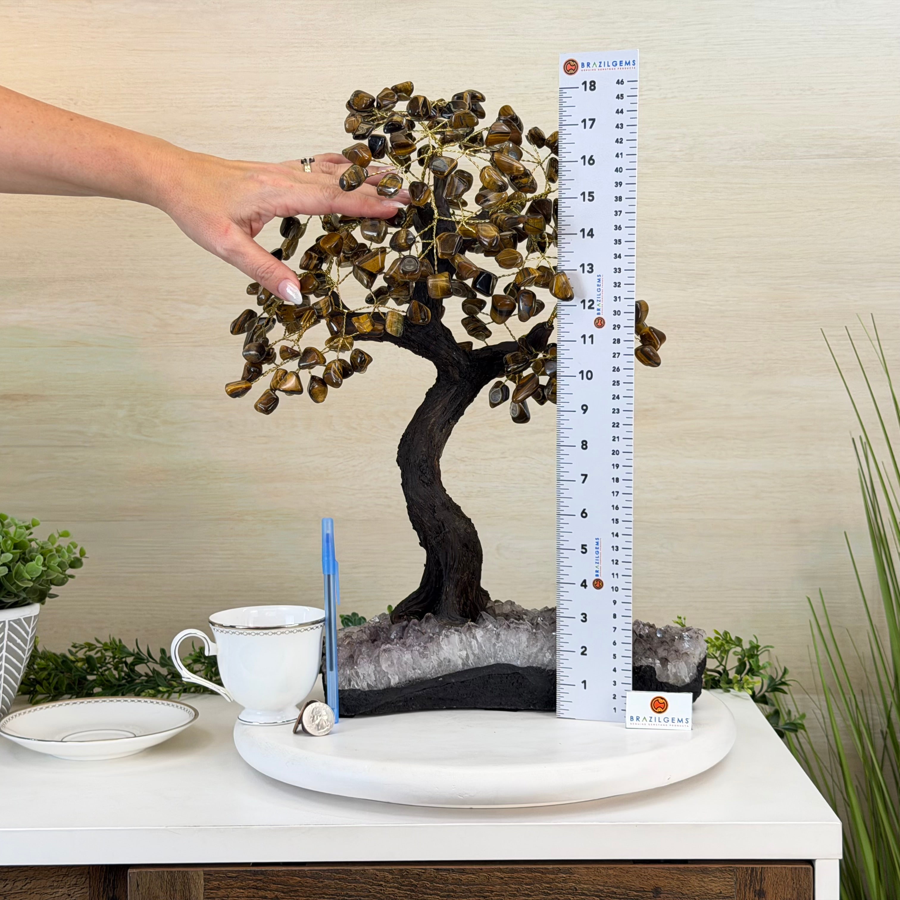 17" Tall Tiger's Eye Bonsai Gemstone Tree, Amethyst base, 240 Gems #5405TIGE-001