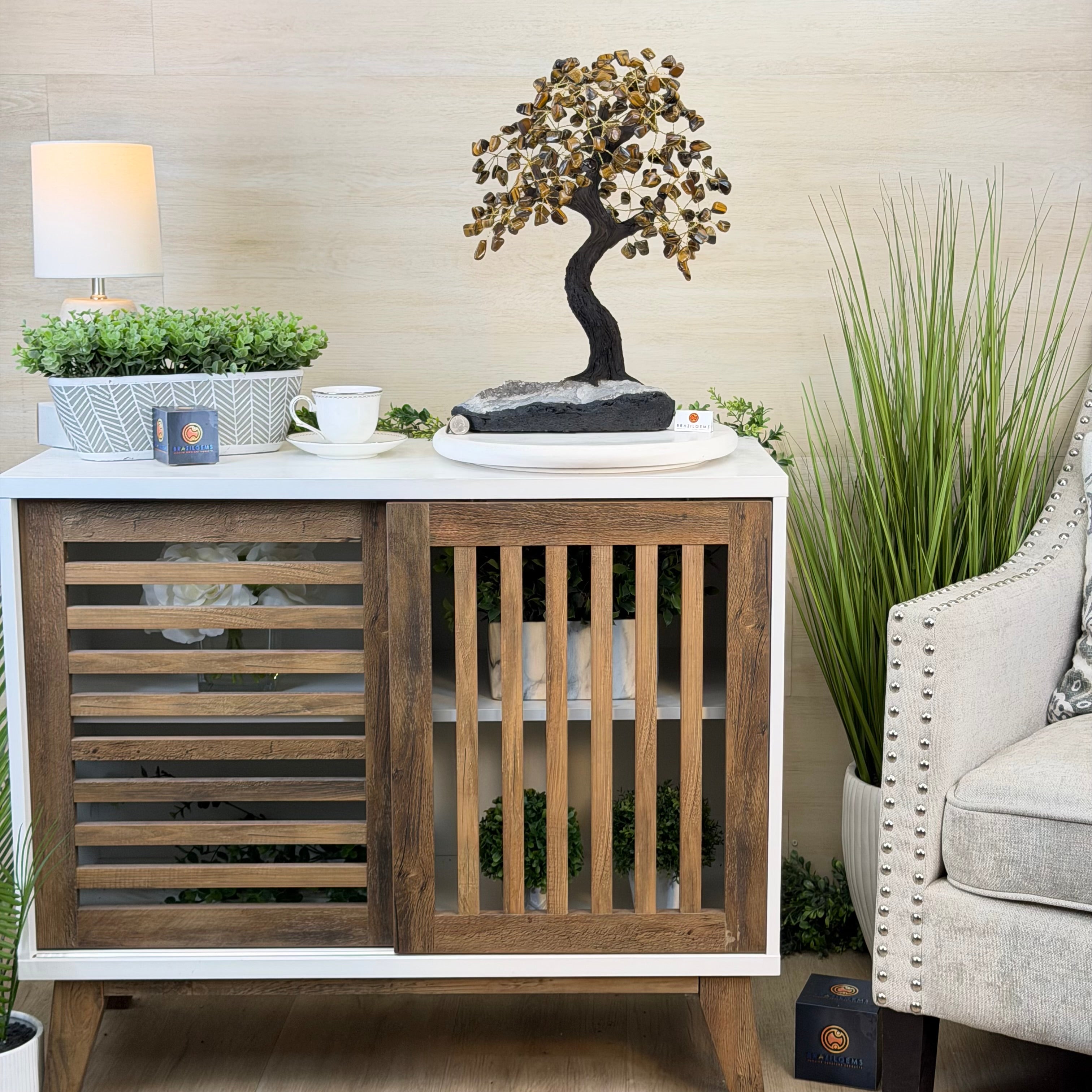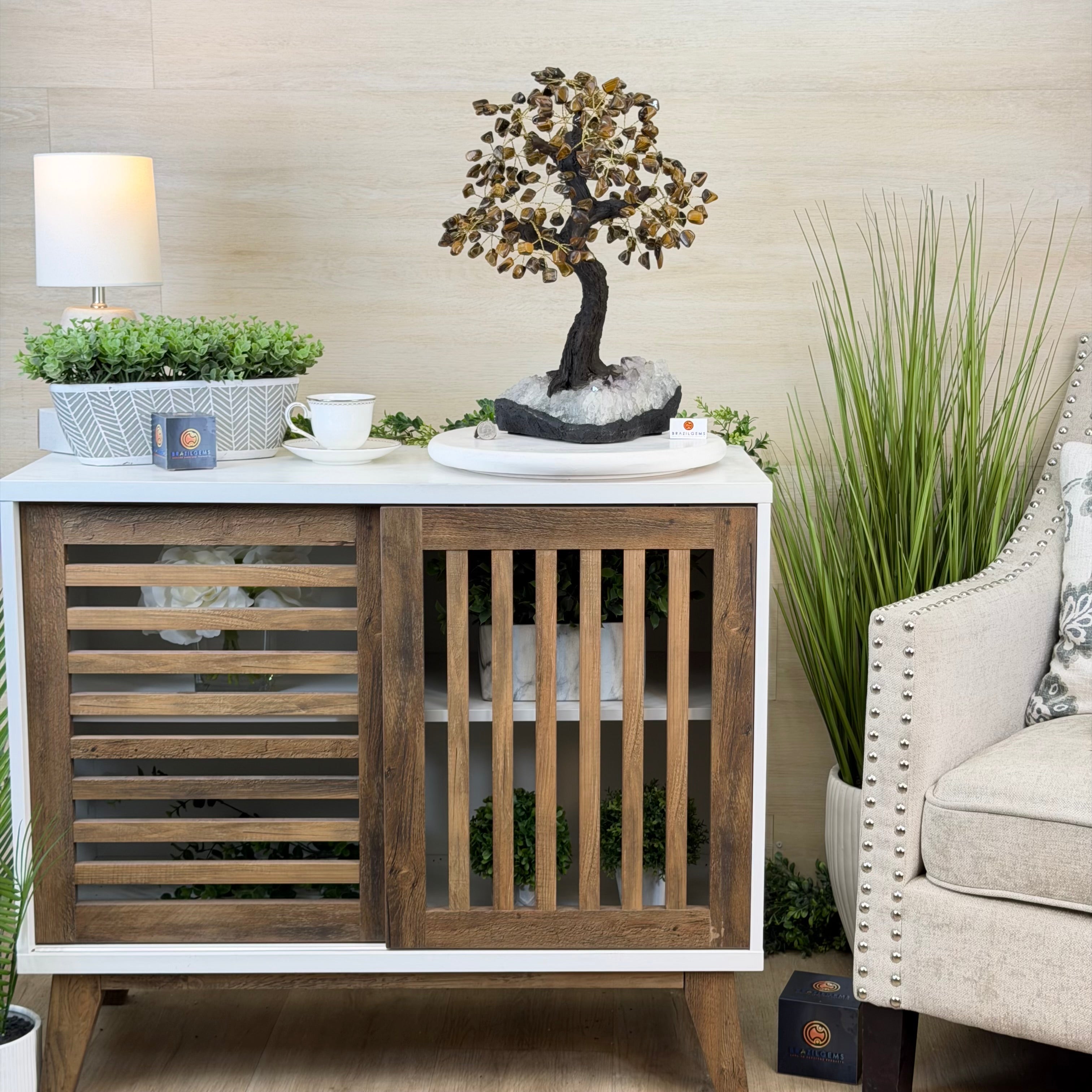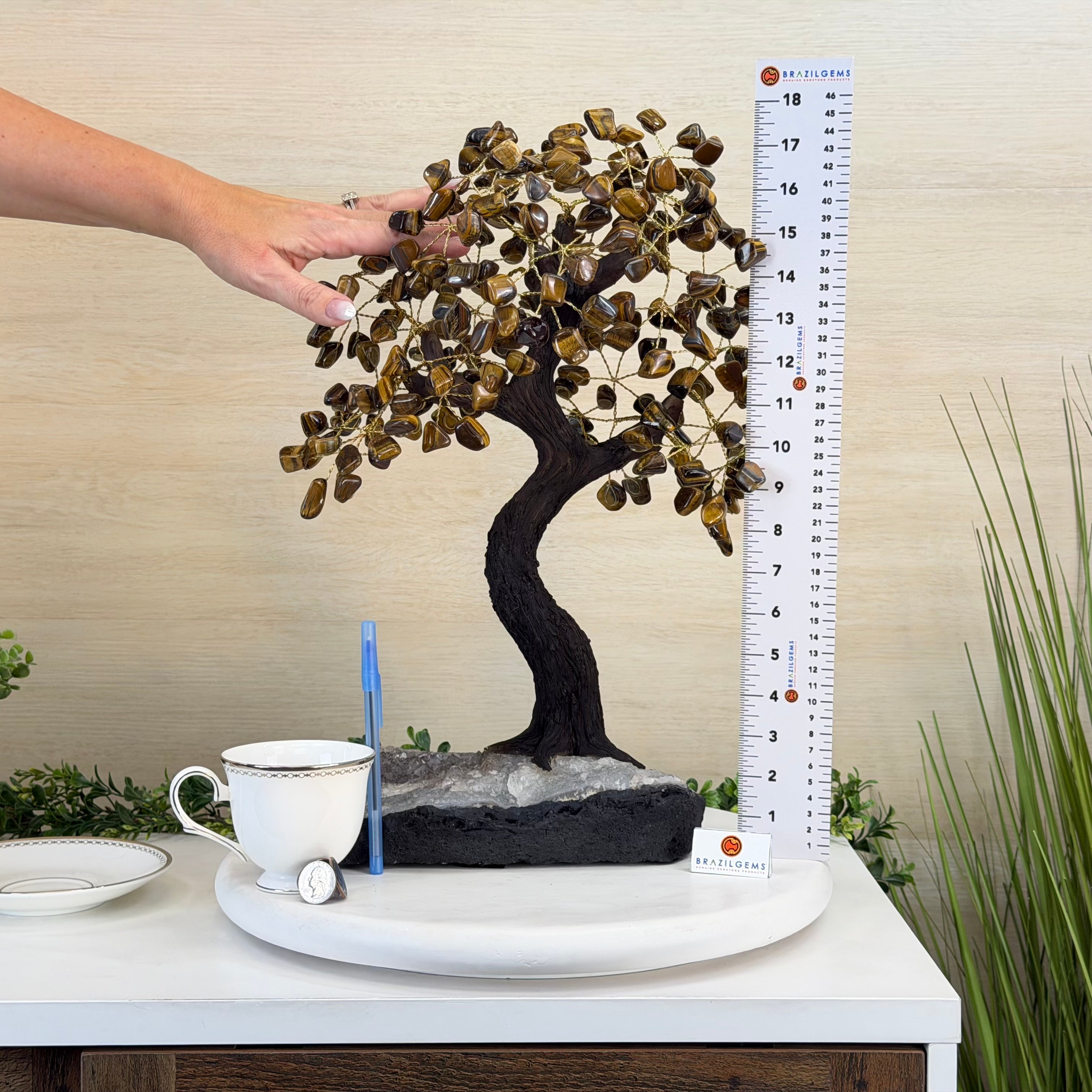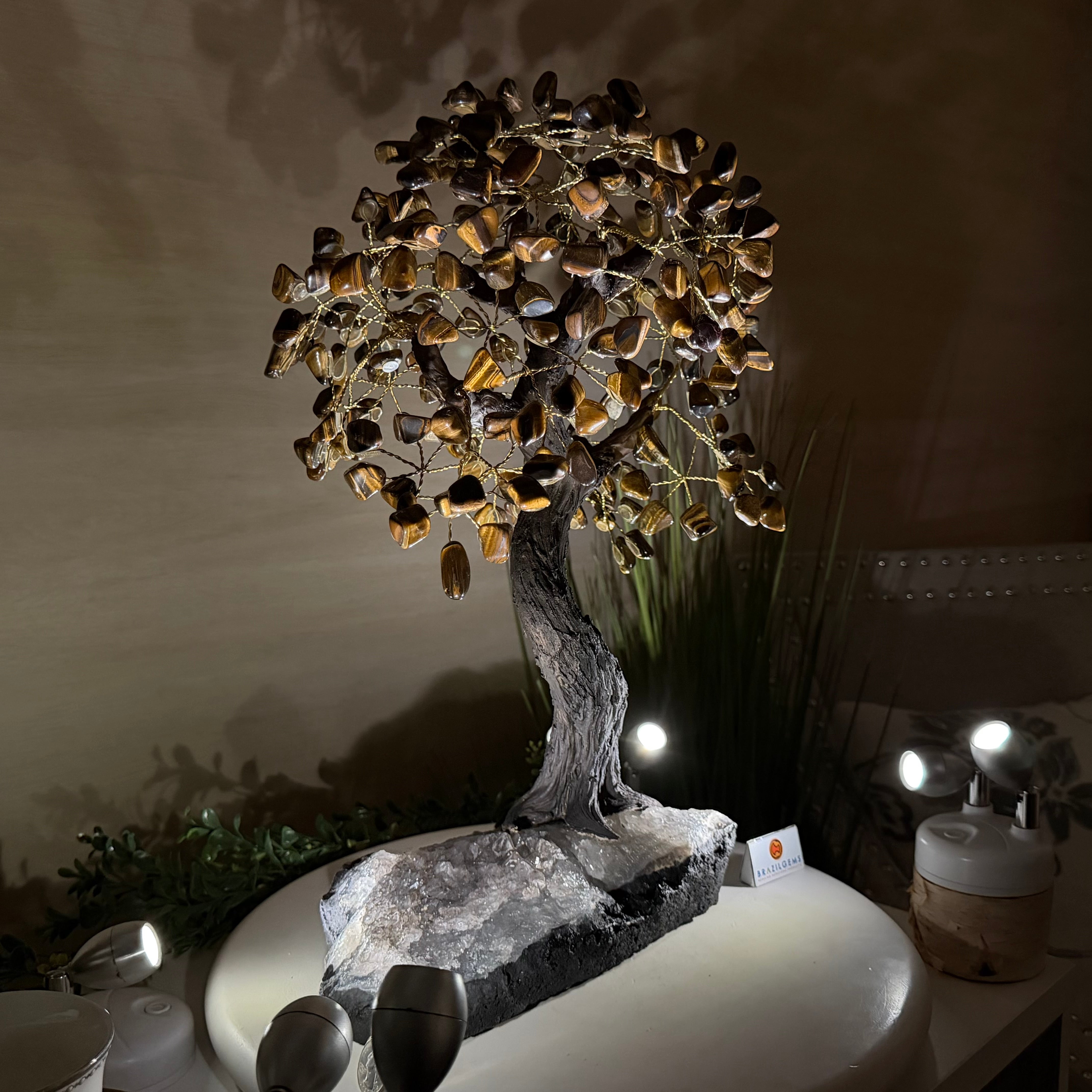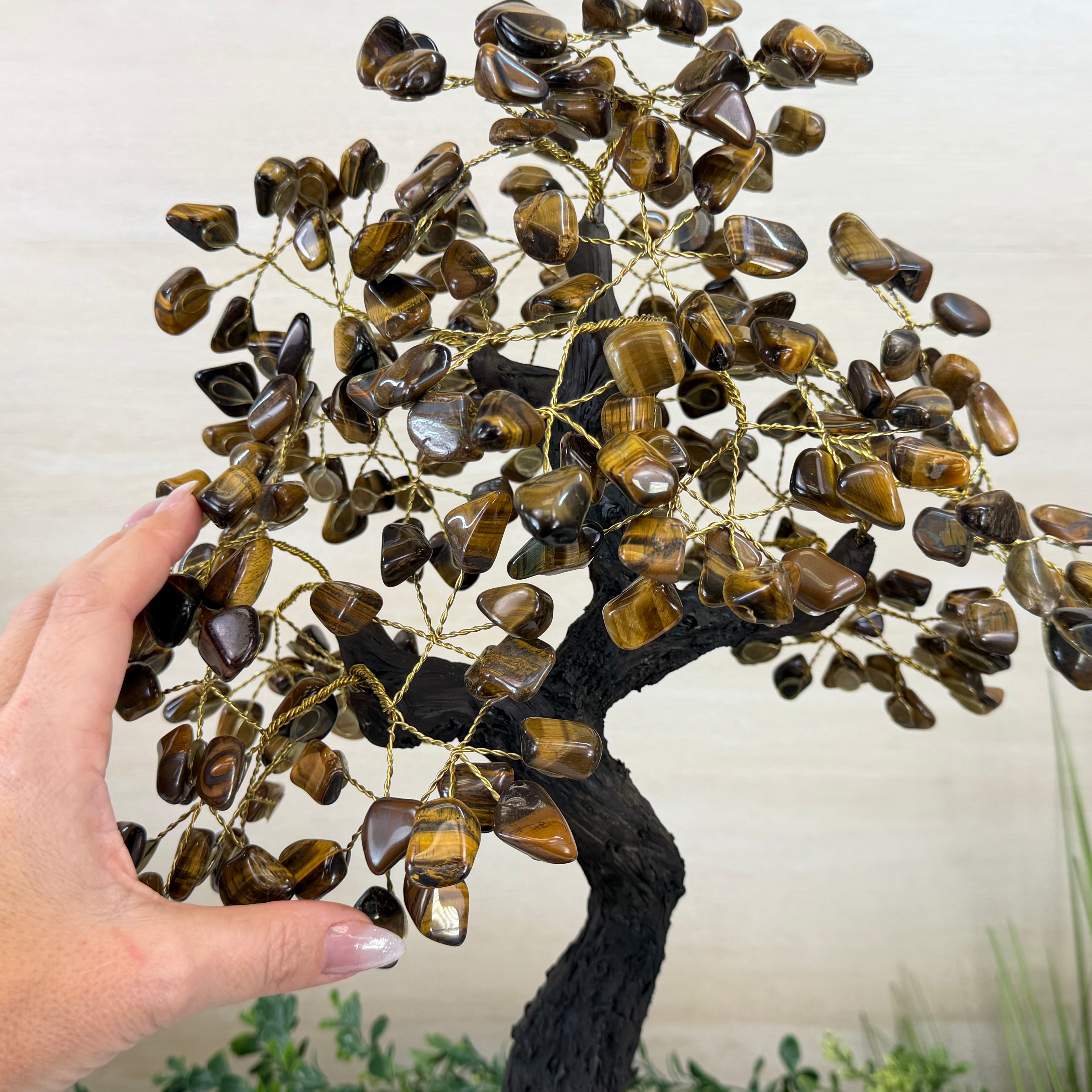 17" Tall Tiger's Eye Bonsai Gemstone Tree, Amethyst base, 240 Gems #5405TIGE-001