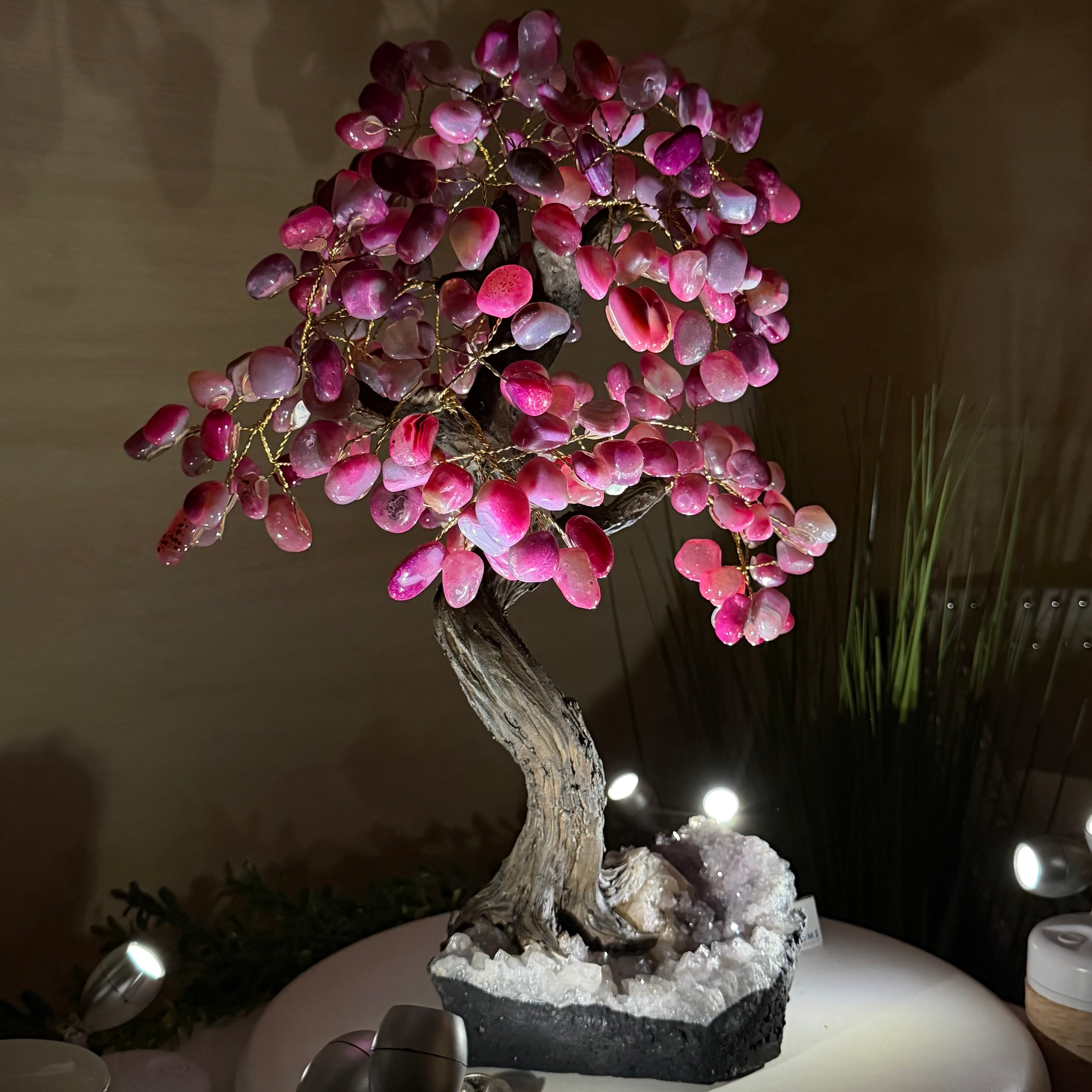 17" Tall Pink Agate Bonsai Gemstone Tree, Amethyst Base, 240 Gems #5405PNKA-002