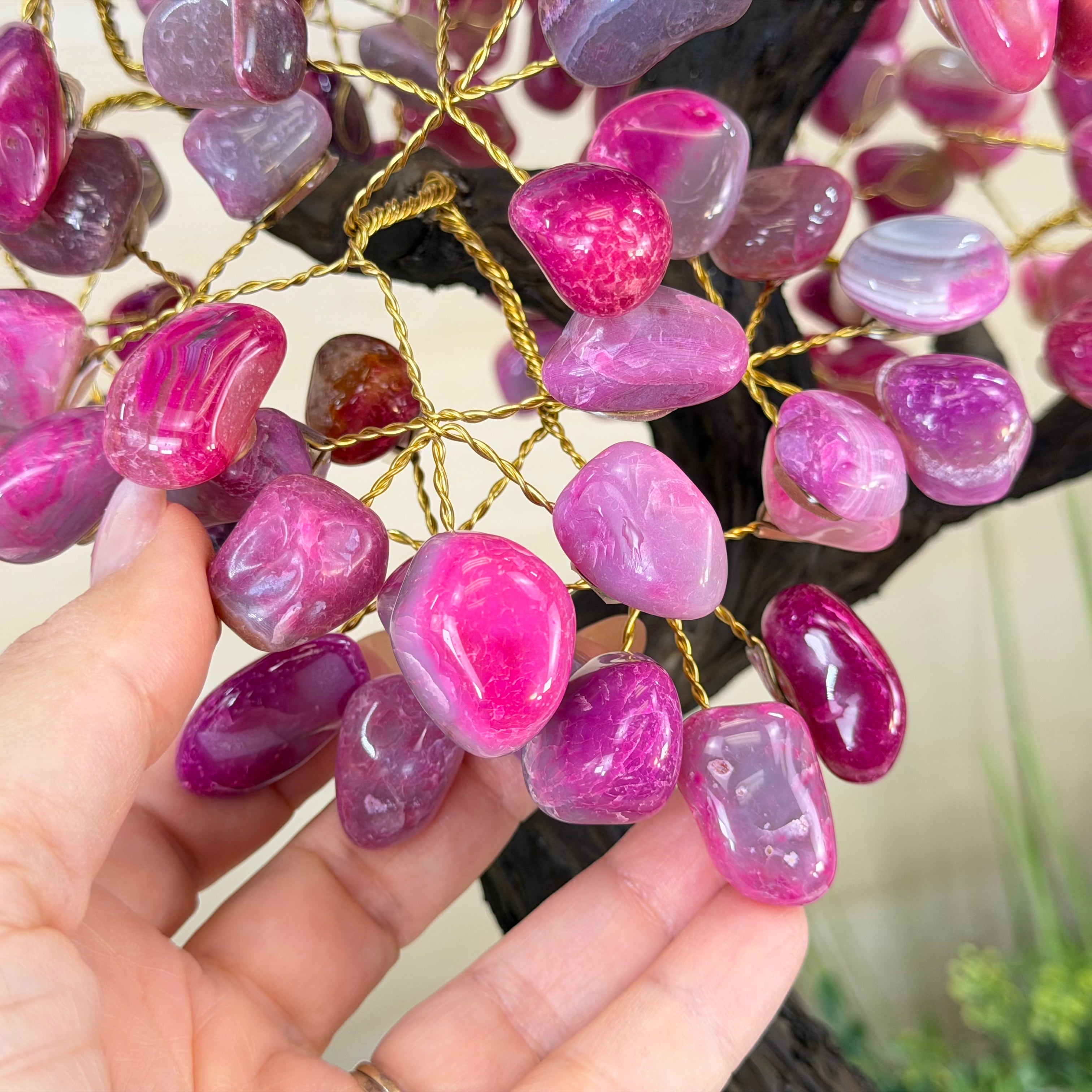 21" Tall Pink Agate Gemstone Tree w/ Amethyst base, 540 gems #5406PA-007