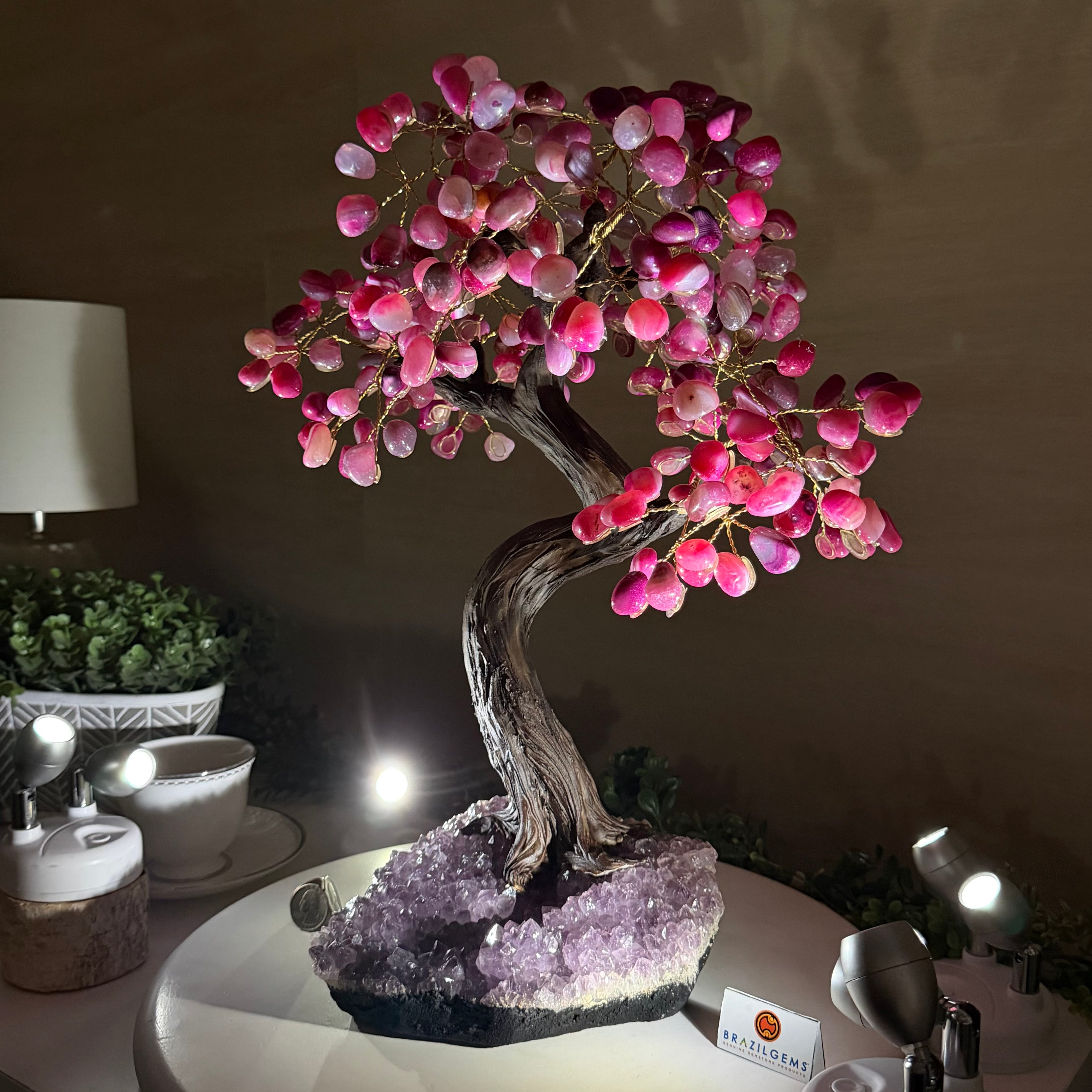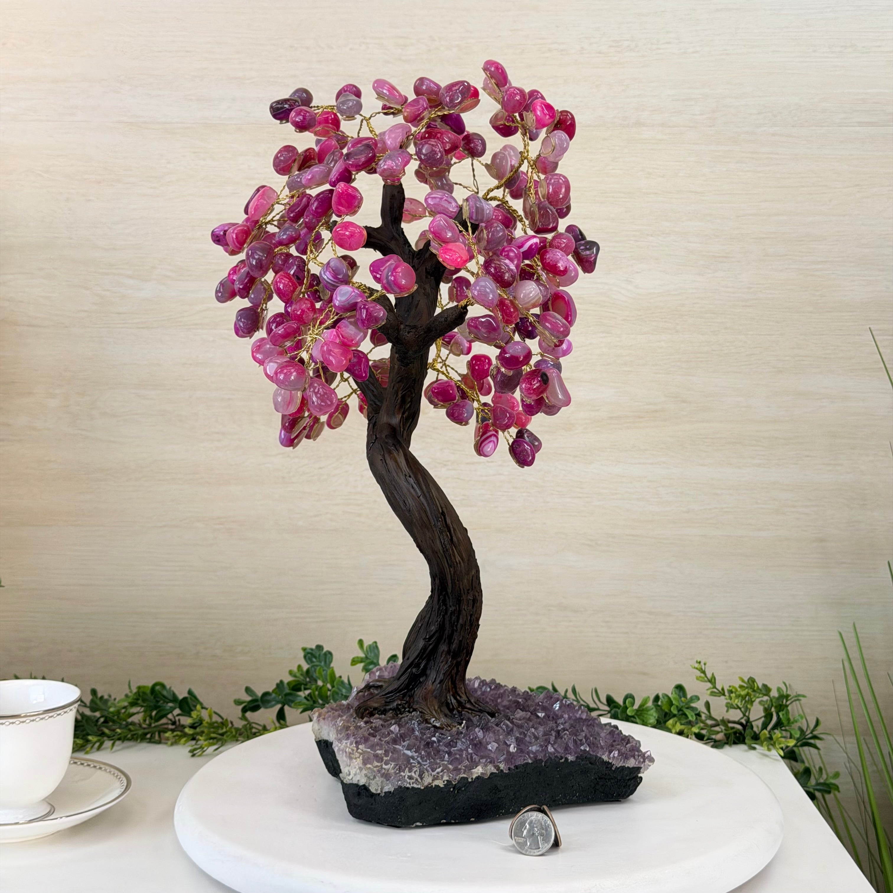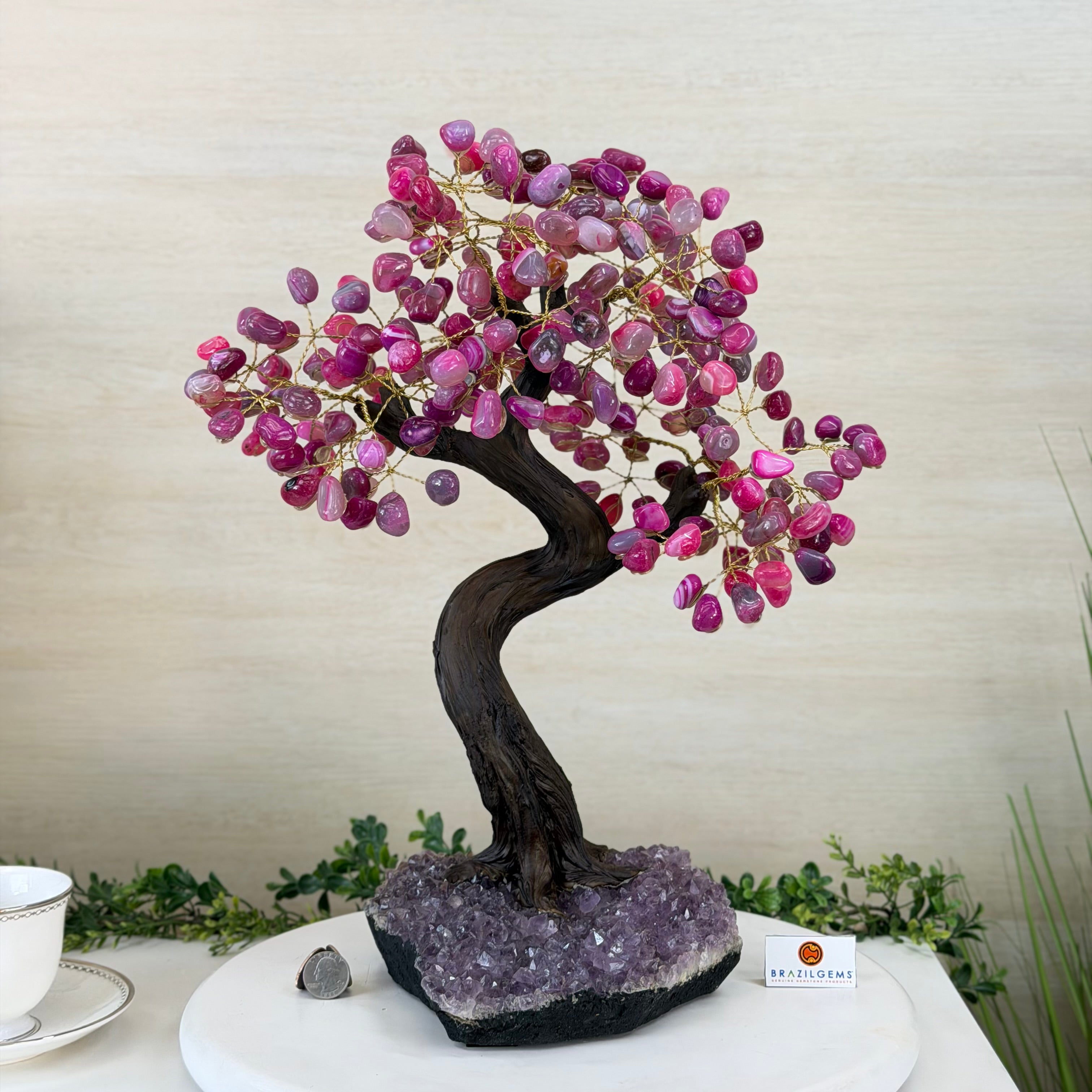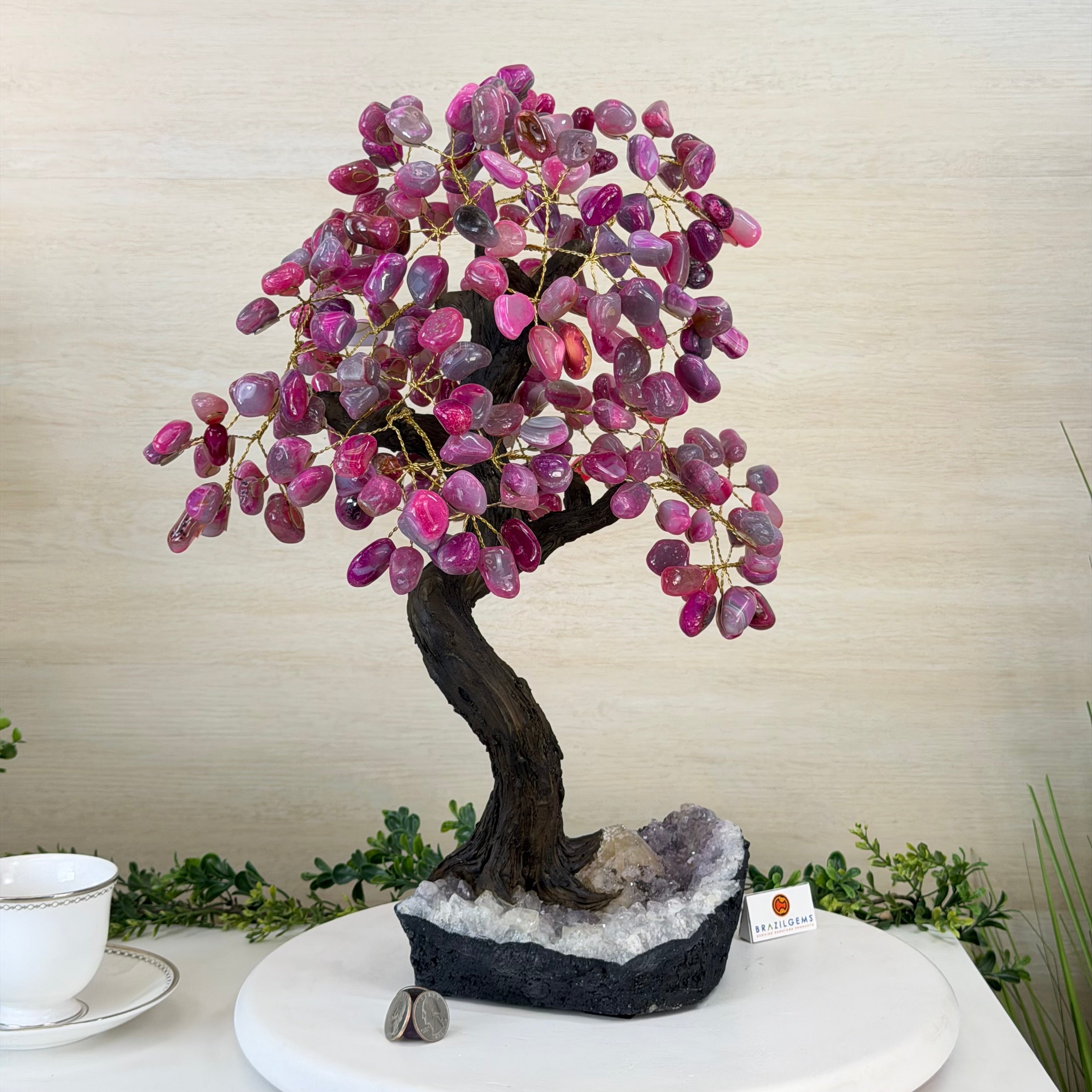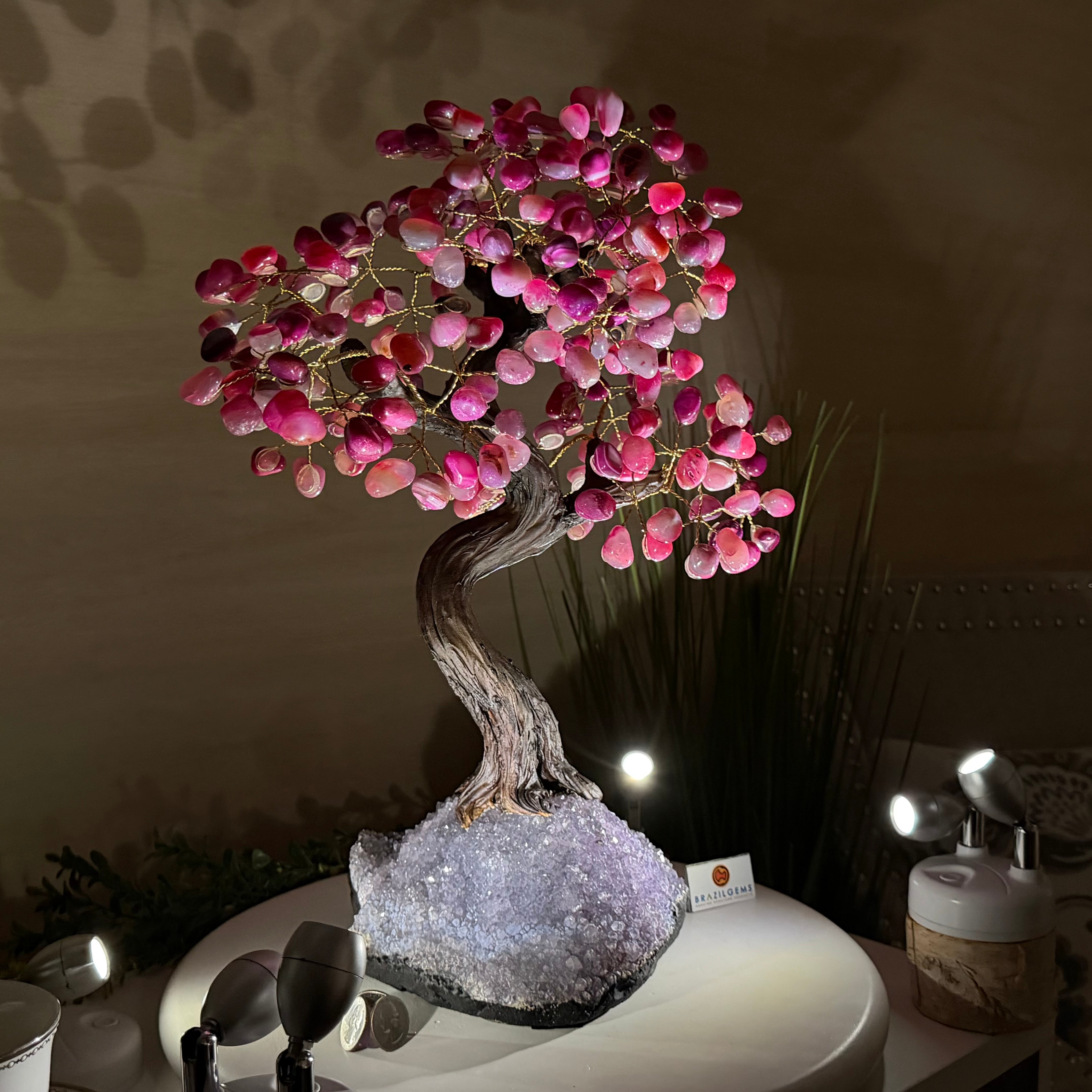 17" Tall Pink Agate Bonsai Gemstone Tree, Amethyst Base, 240 Gems #5405PNKA-001