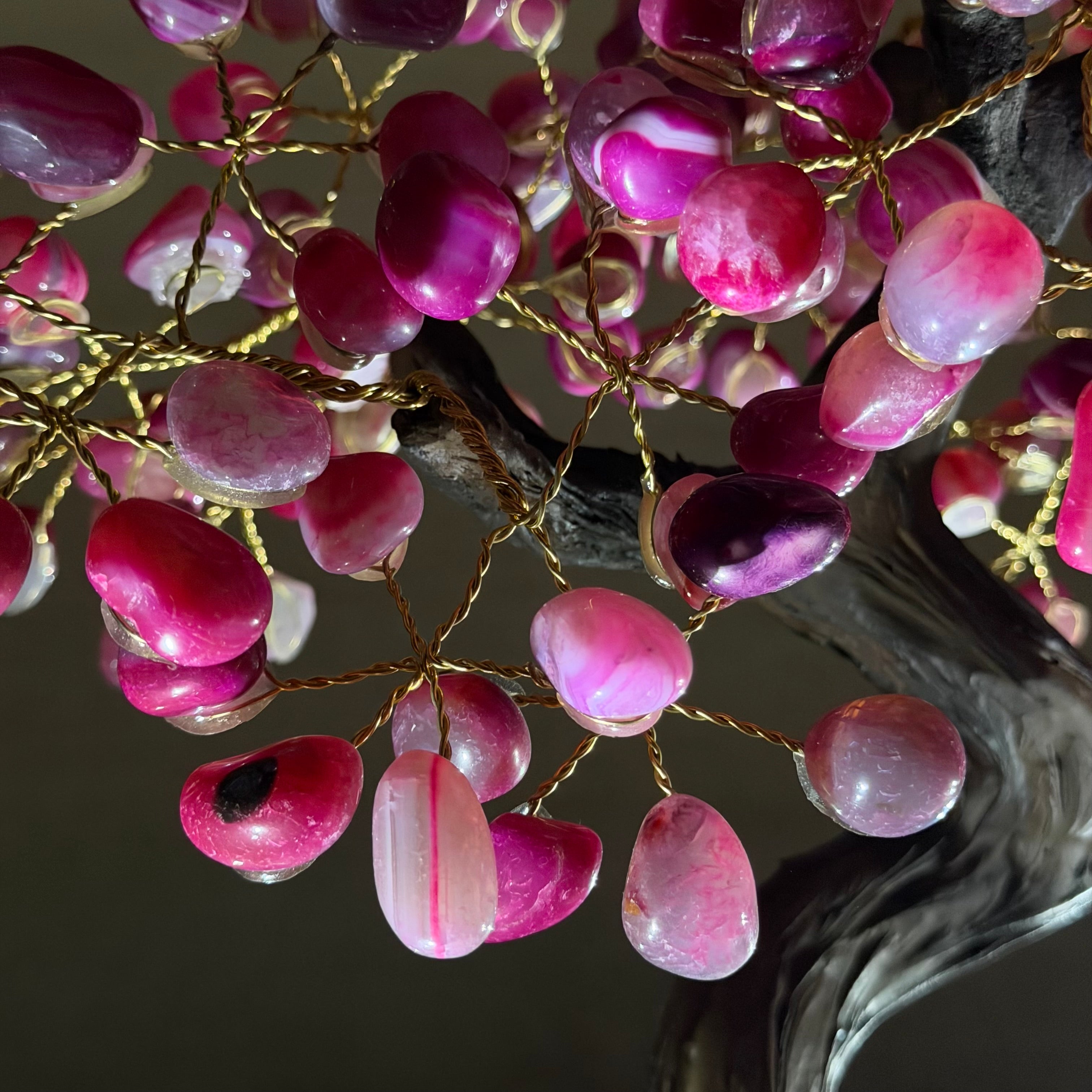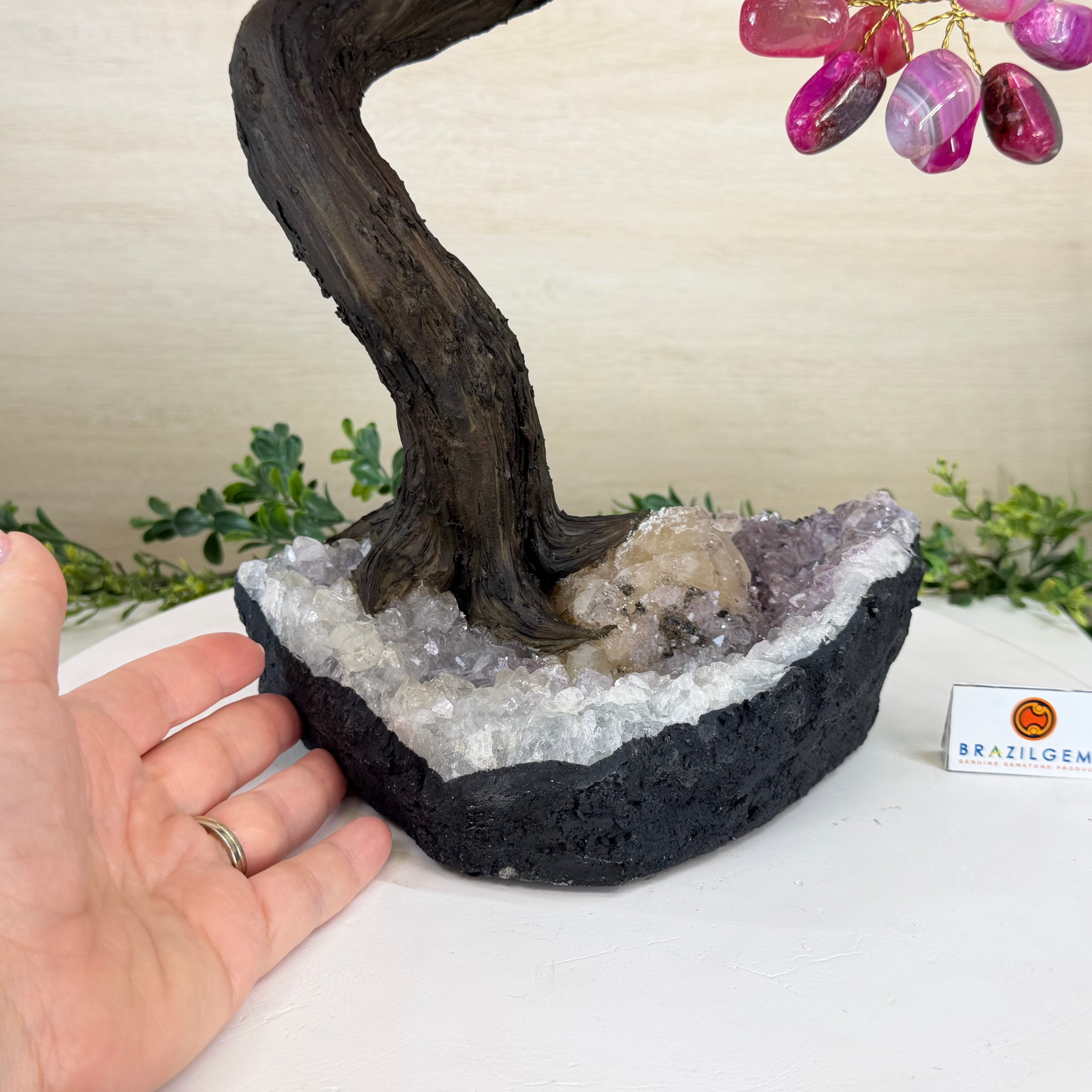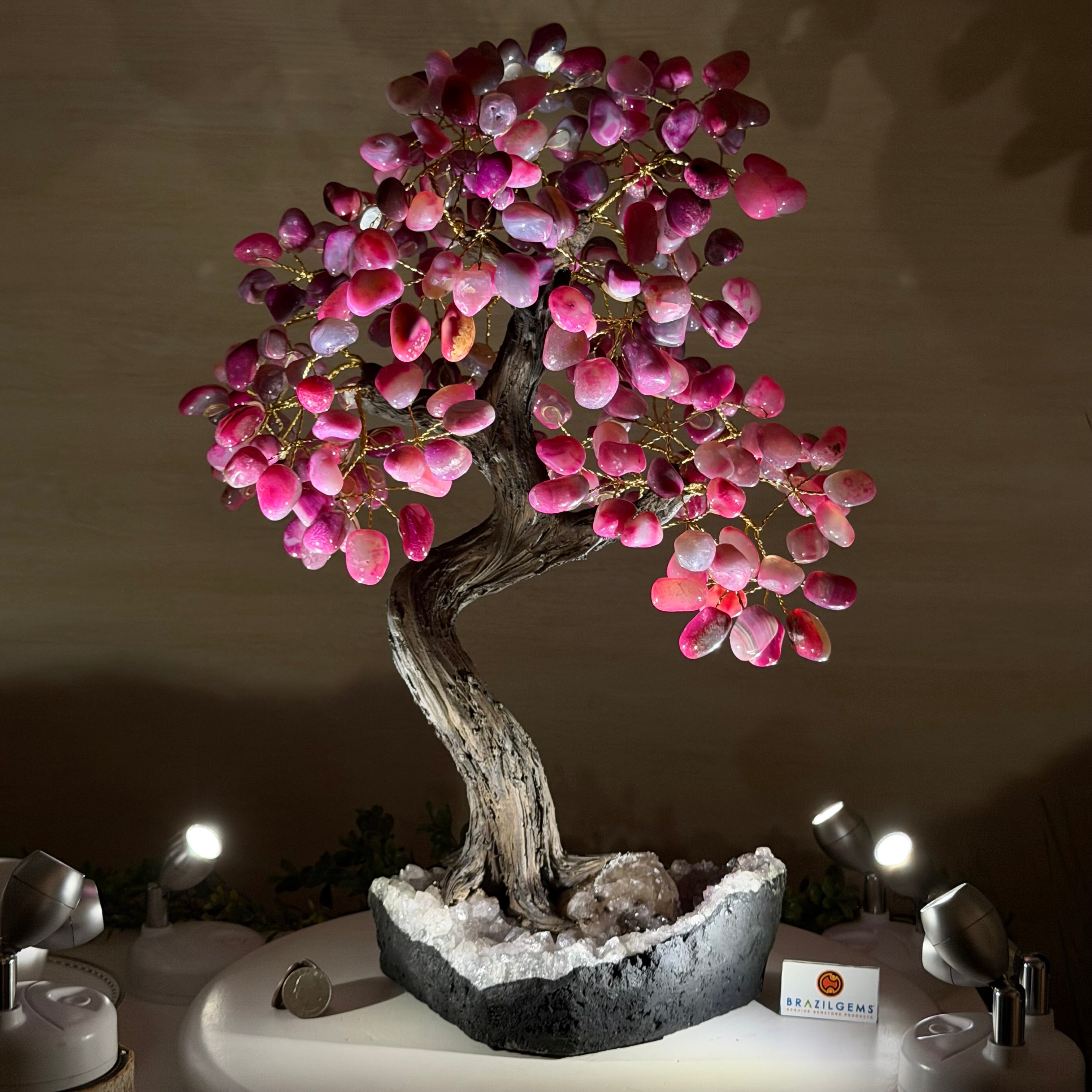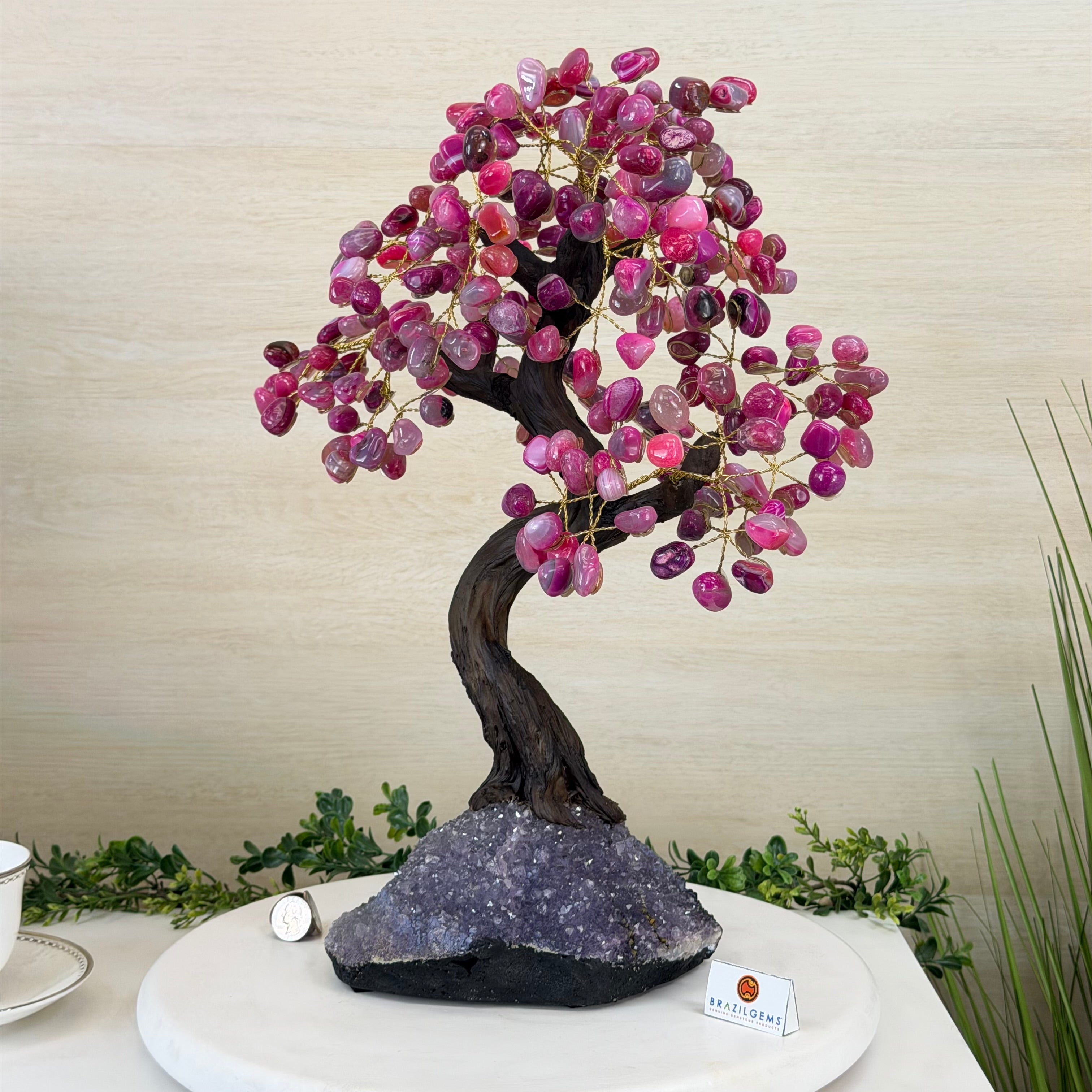17" Tall Pink Agate Bonsai Gemstone Tree, Amethyst Base, 240 Gems #5405PNKA-001