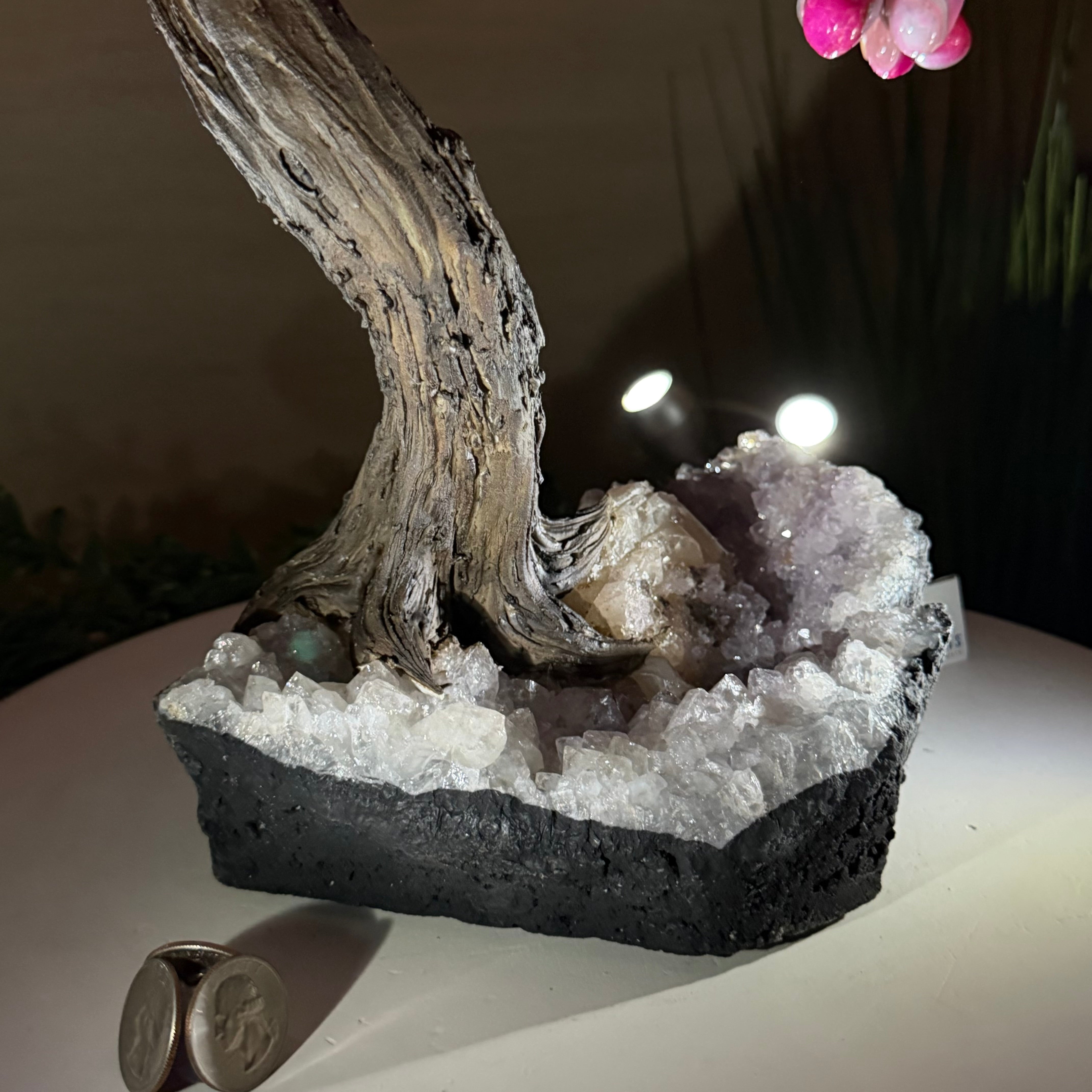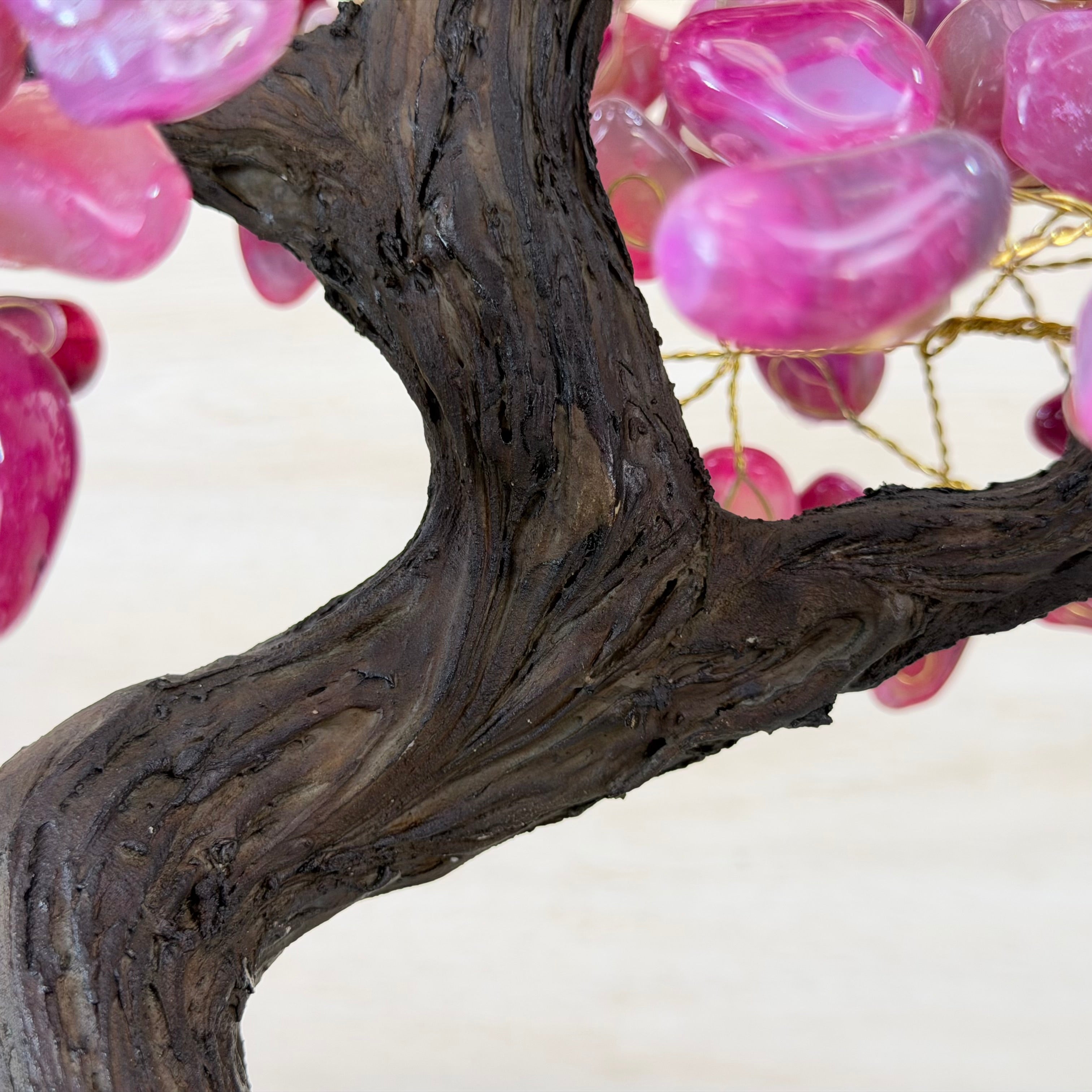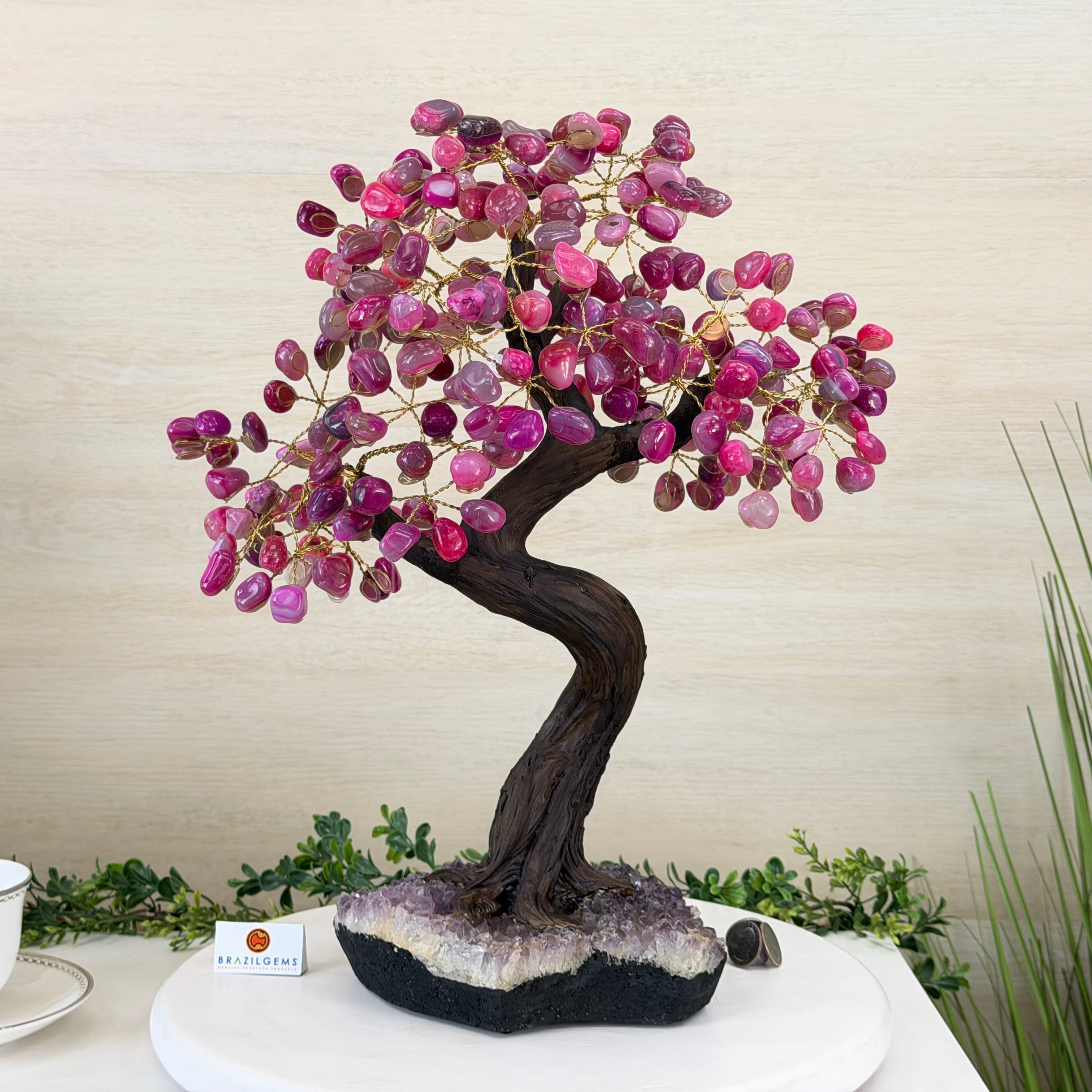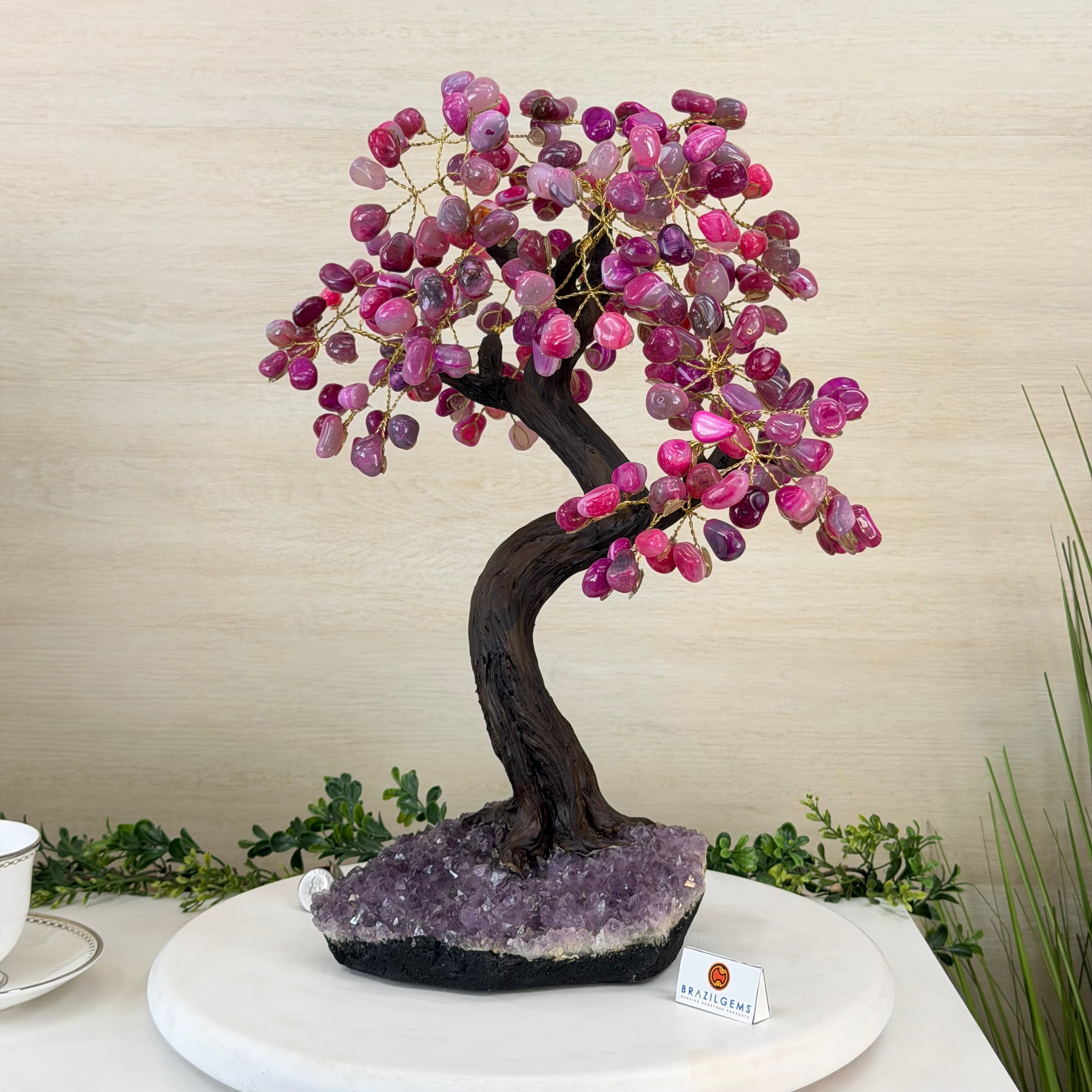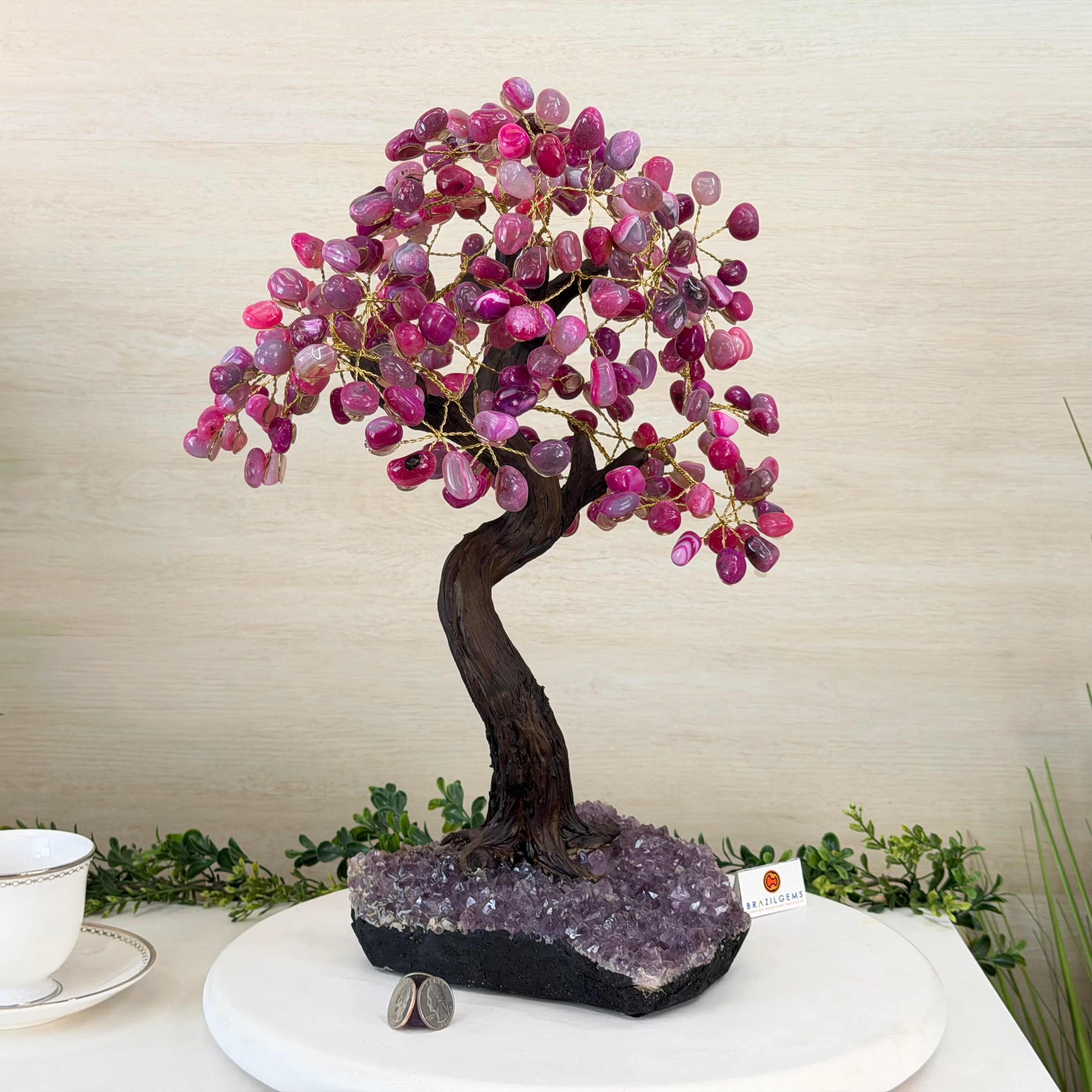 17" Tall Pink Agate Bonsai Gemstone Tree, Amethyst Base, 240 Gems #5405PNKA-001