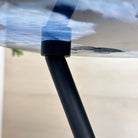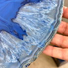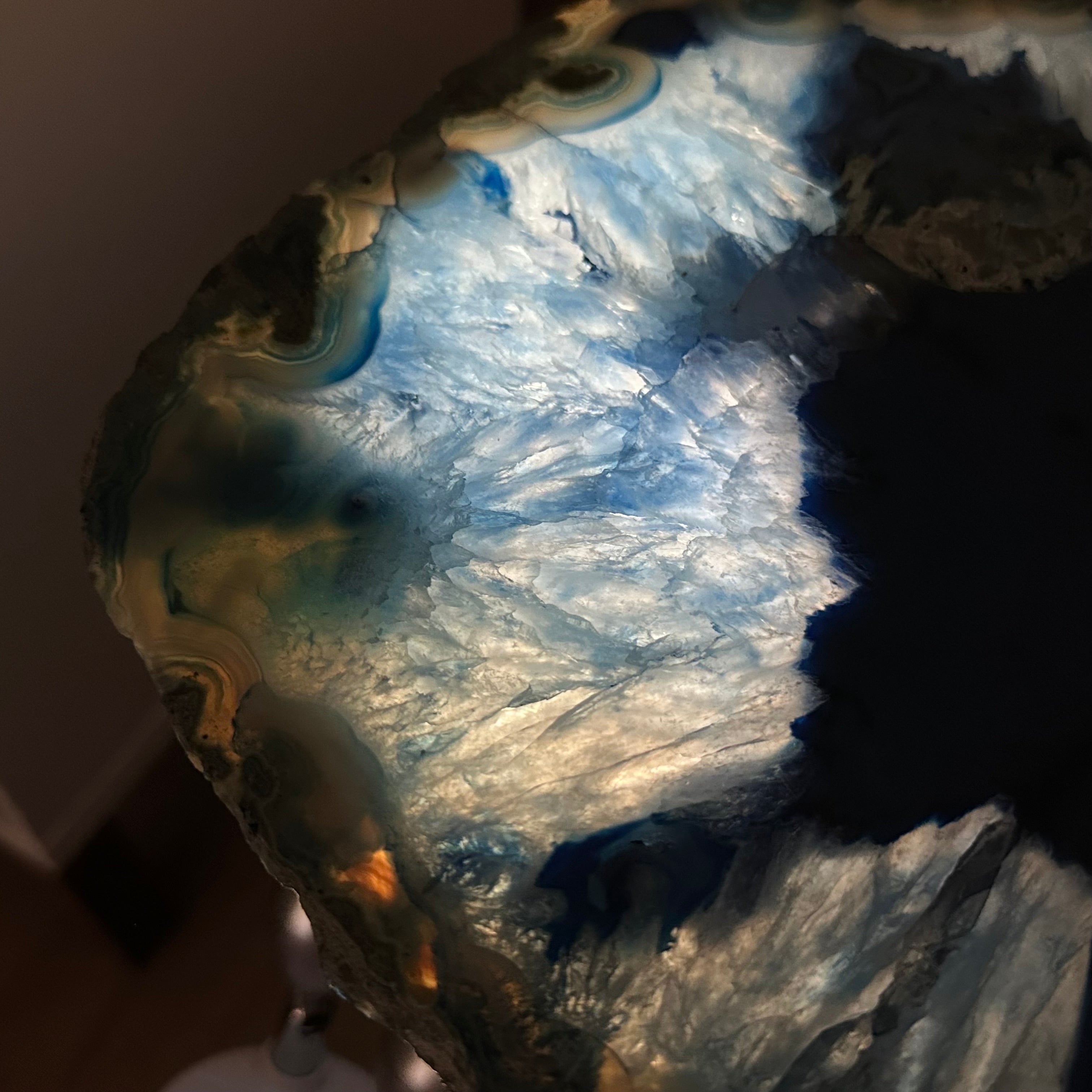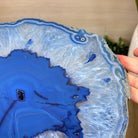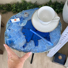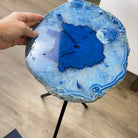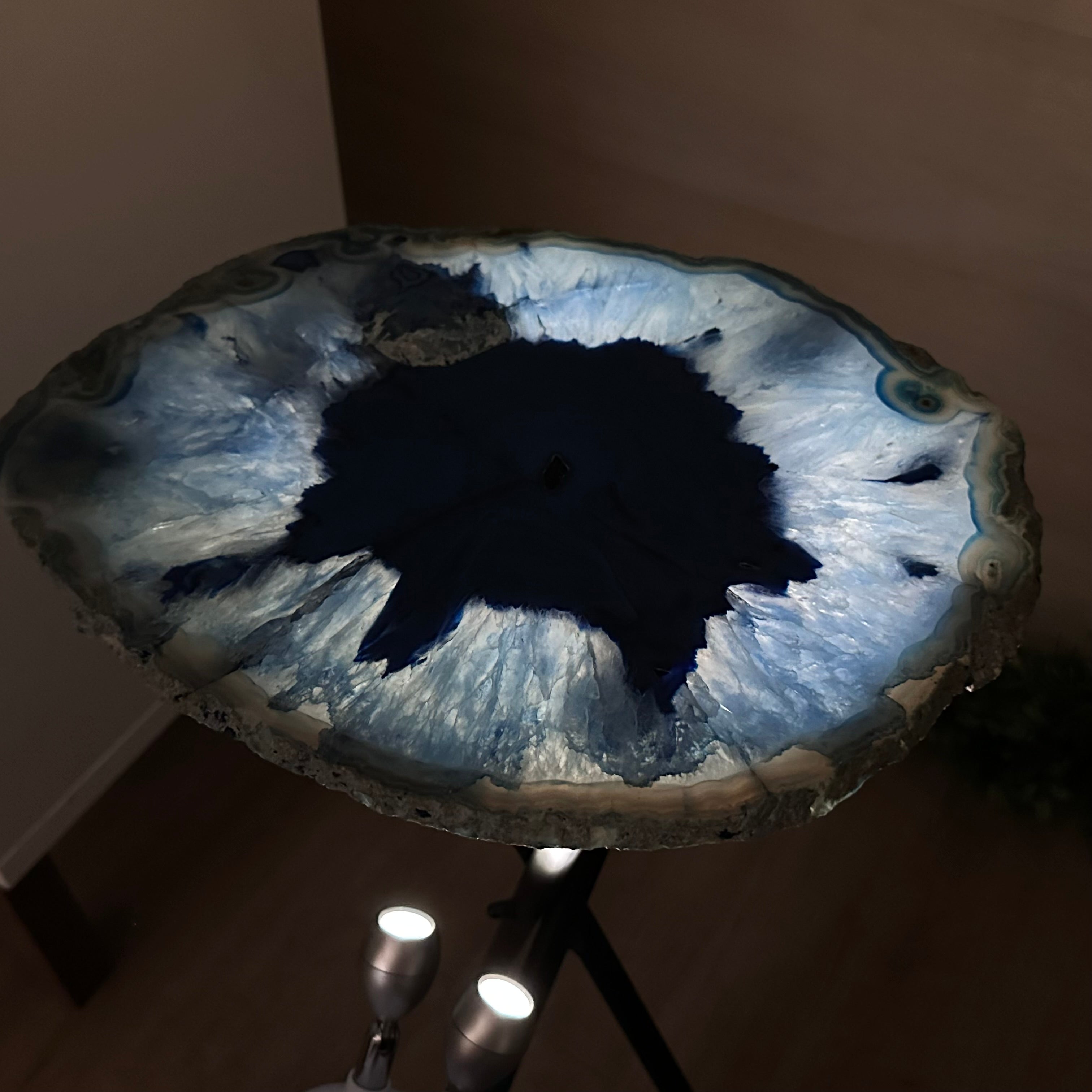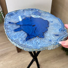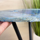 Large Blue Agate Side Table (dyed blue) w/ one slice of stone on a black metal base. An amazing vibrant specimen to accent the decor of your home.