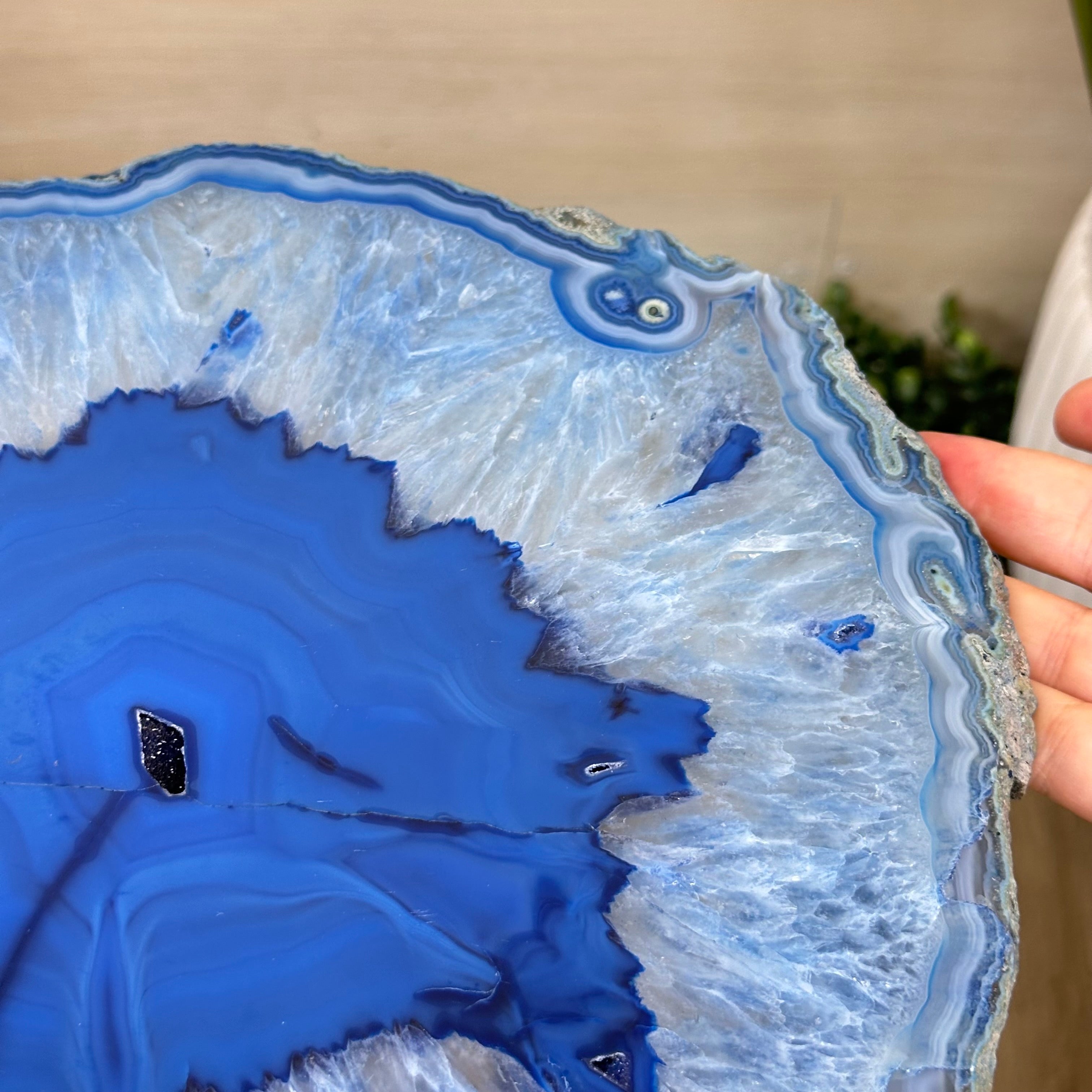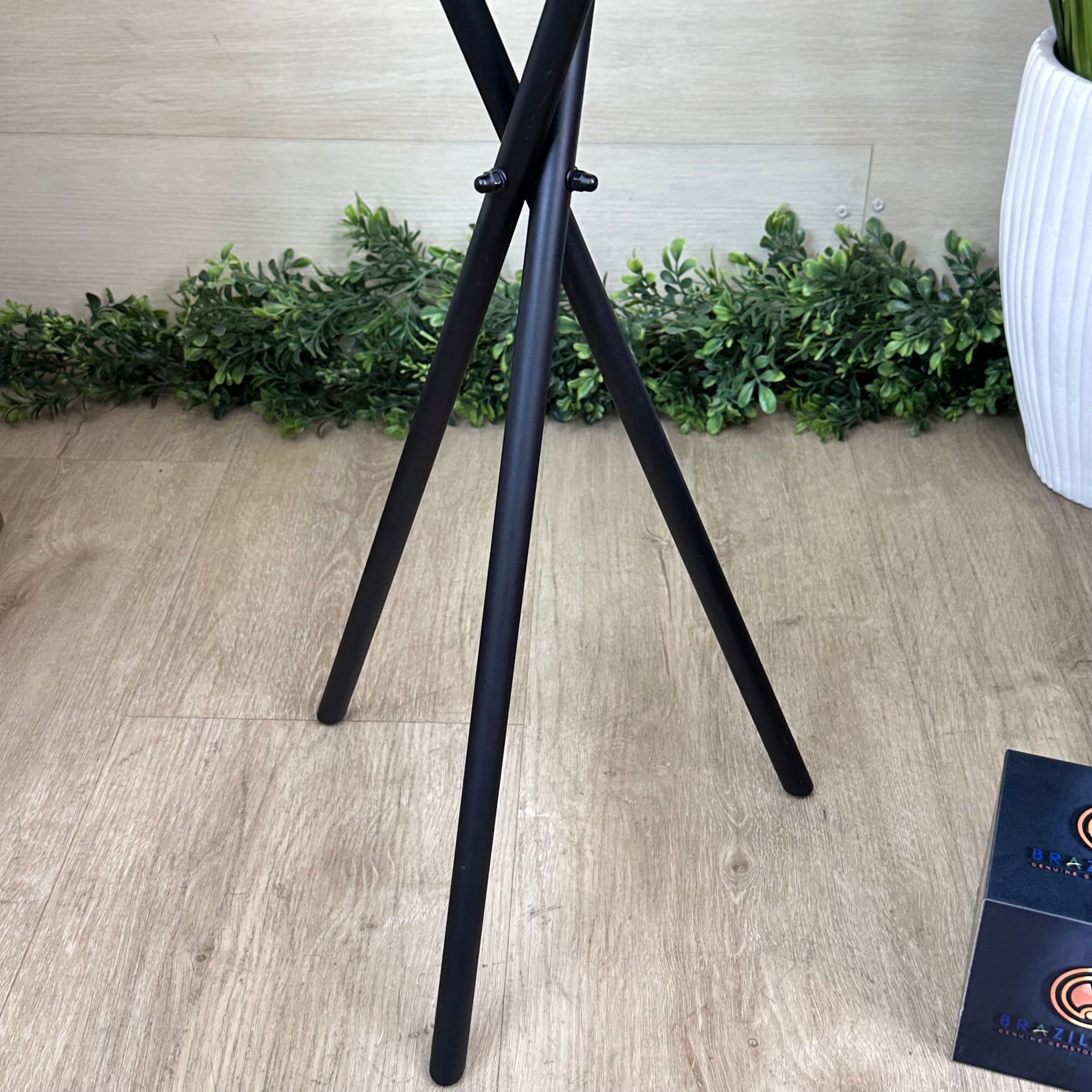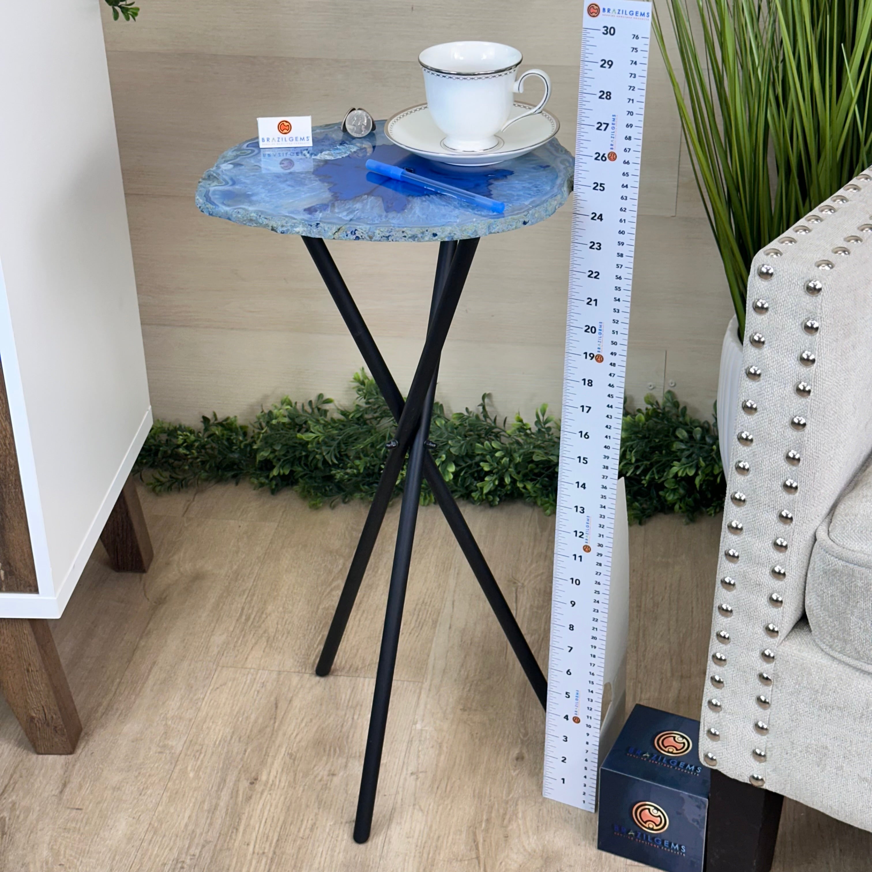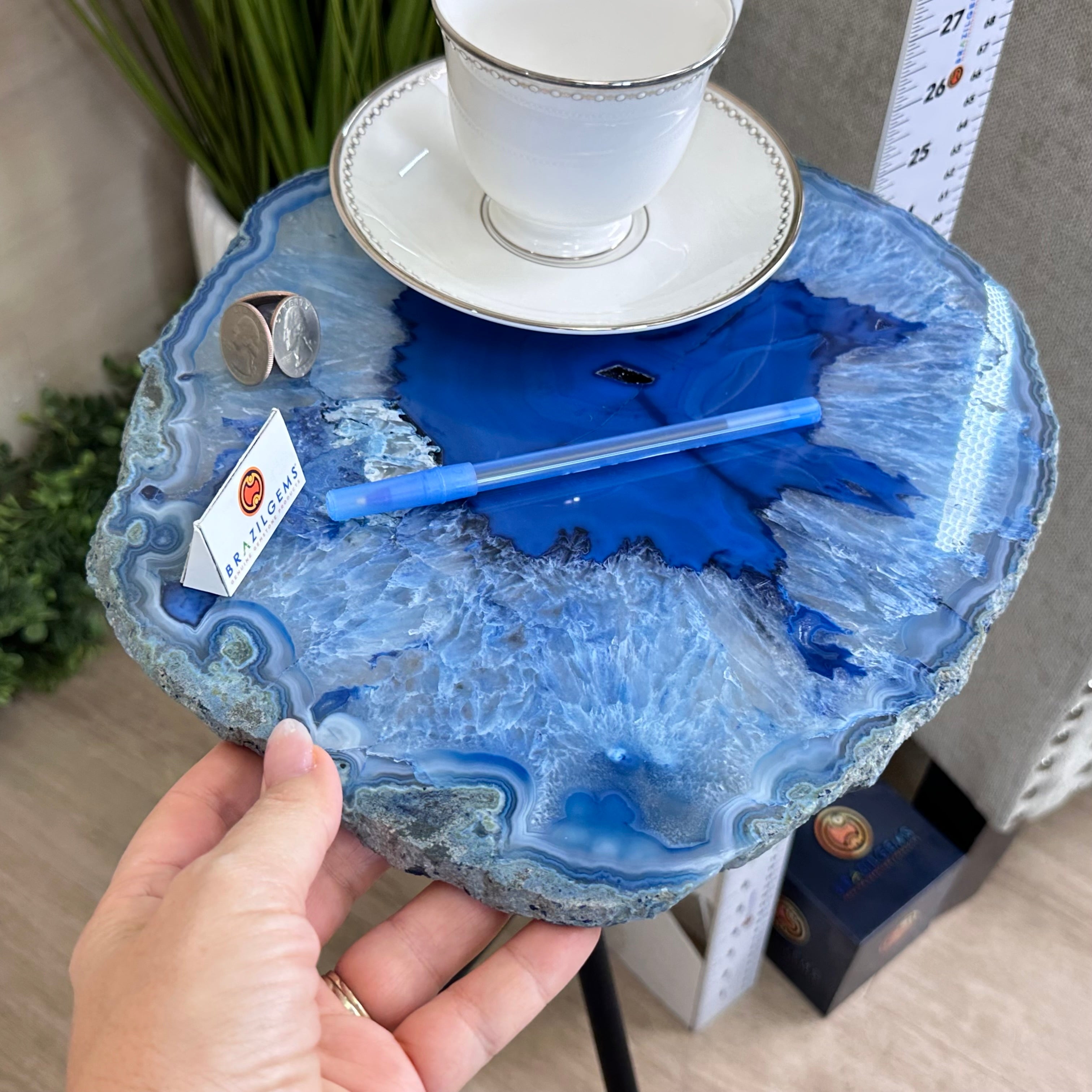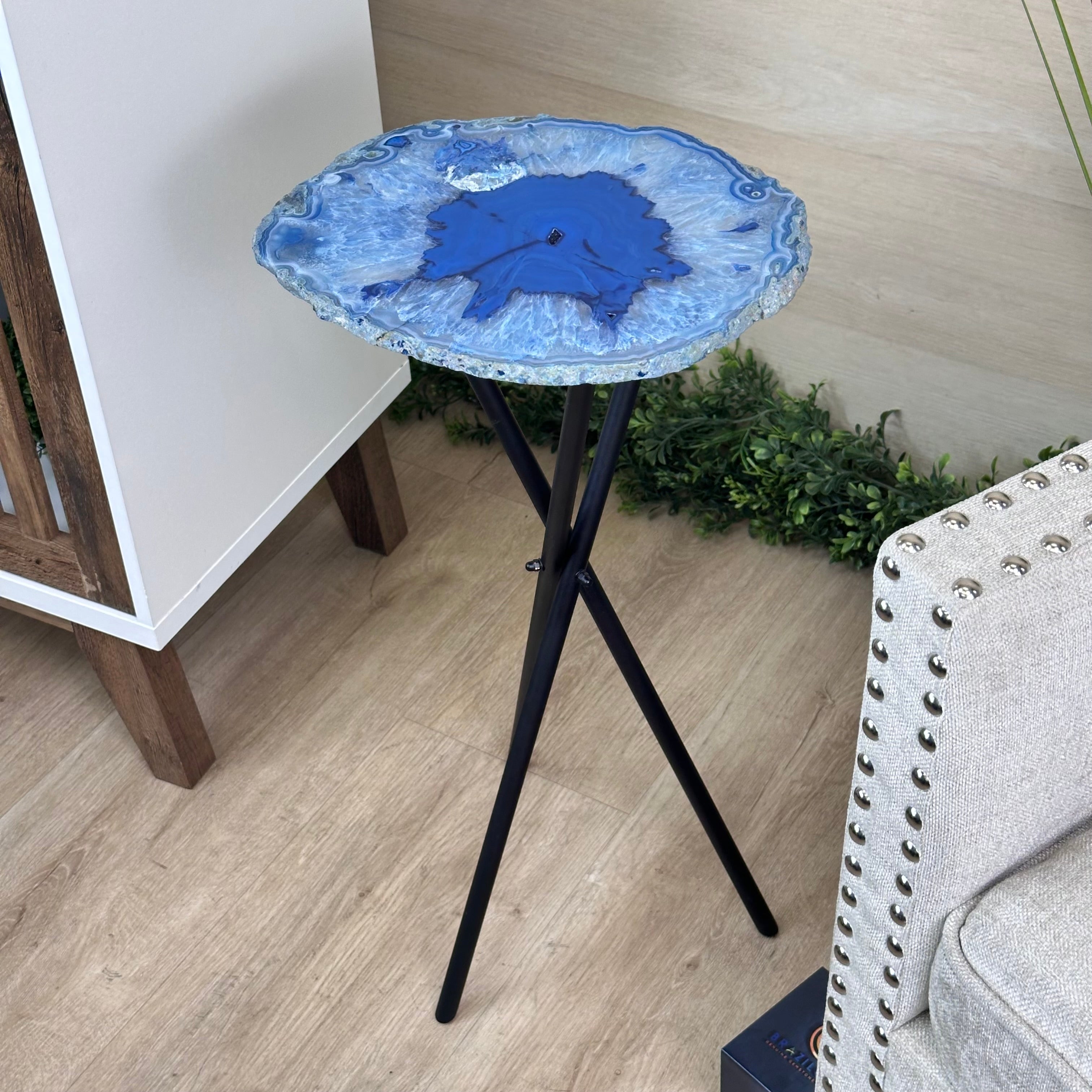 Disclaimer: This is a natural gemstone dyed blue sold as is by Brazil Gems® as you see it in its images and video. It may contain natural imperfections as well as imperfections, scratches, repairs and broken edges from the extraction, slicing and polishing processes. This stone has been dyed blue. Some assembly required to tighten the legs (Tool provided). The metal base was painted black. Brazil Gems® makes every effort to get measurements as exact as possible but they are done by human hands & eyes and therefore may have minor discrepancies.