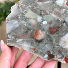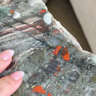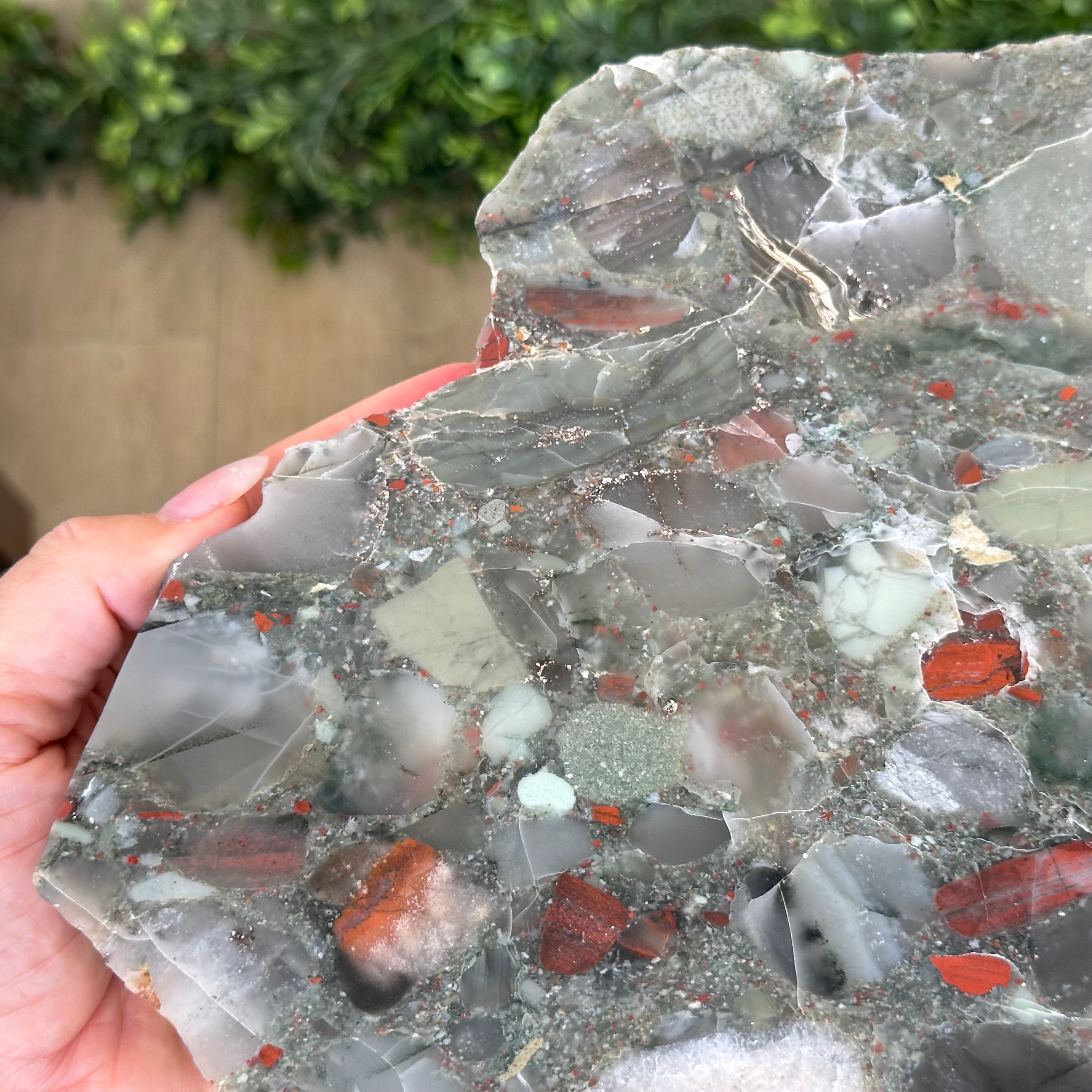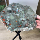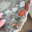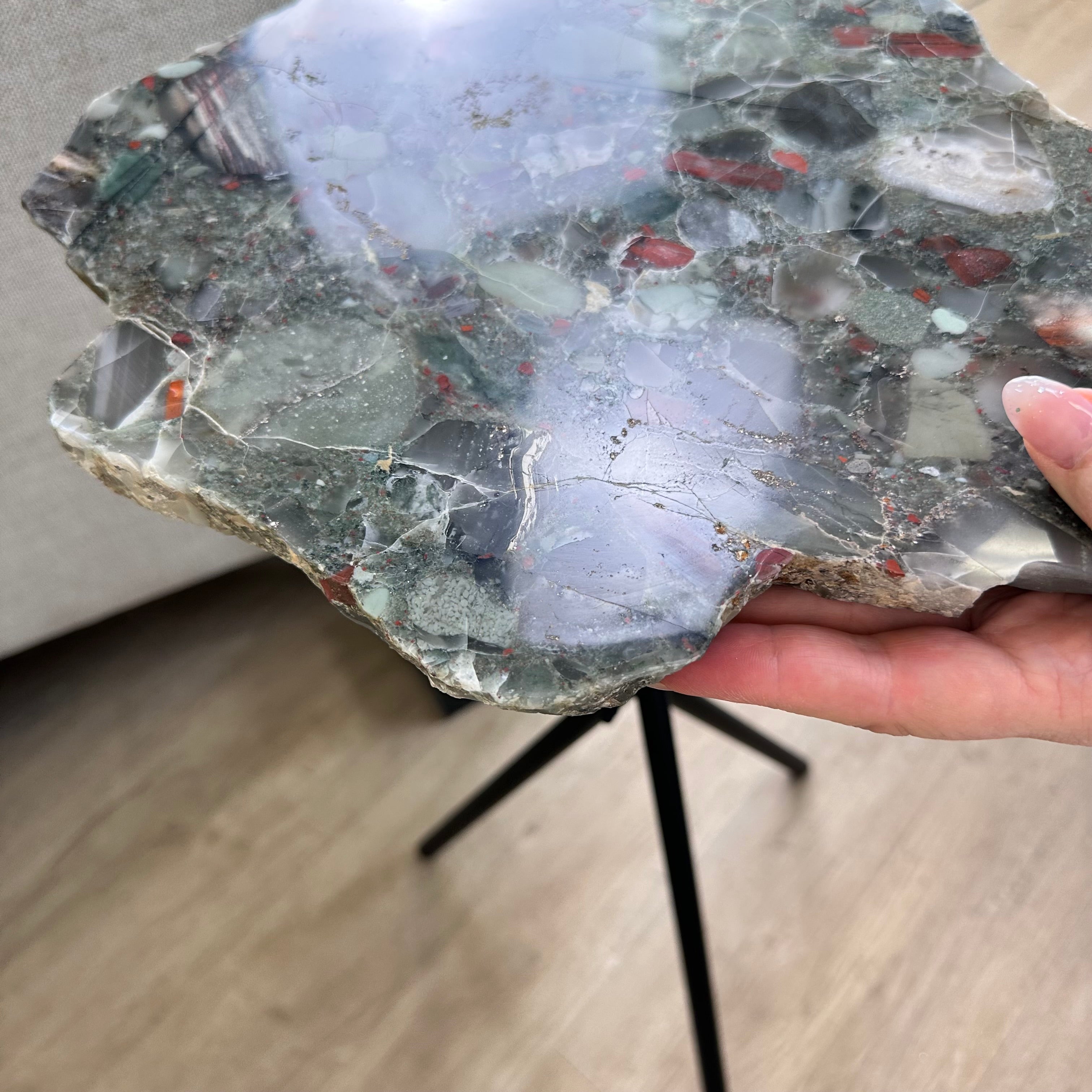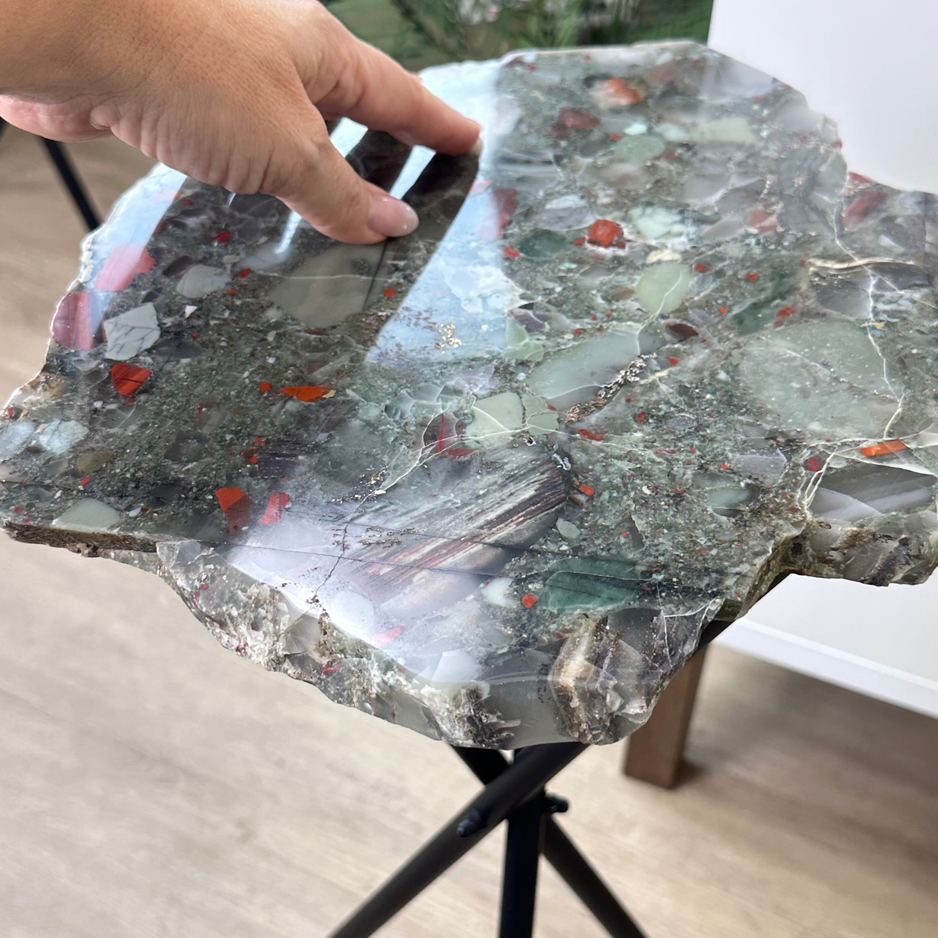 Large Natural Bloodstone Jasper Side Table w/ one slice of stone on a black metal base. An amazing vibrant specimen to accent the decor of your home.