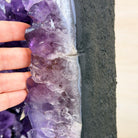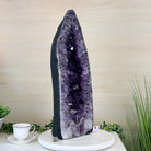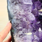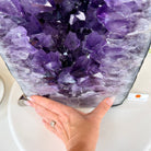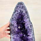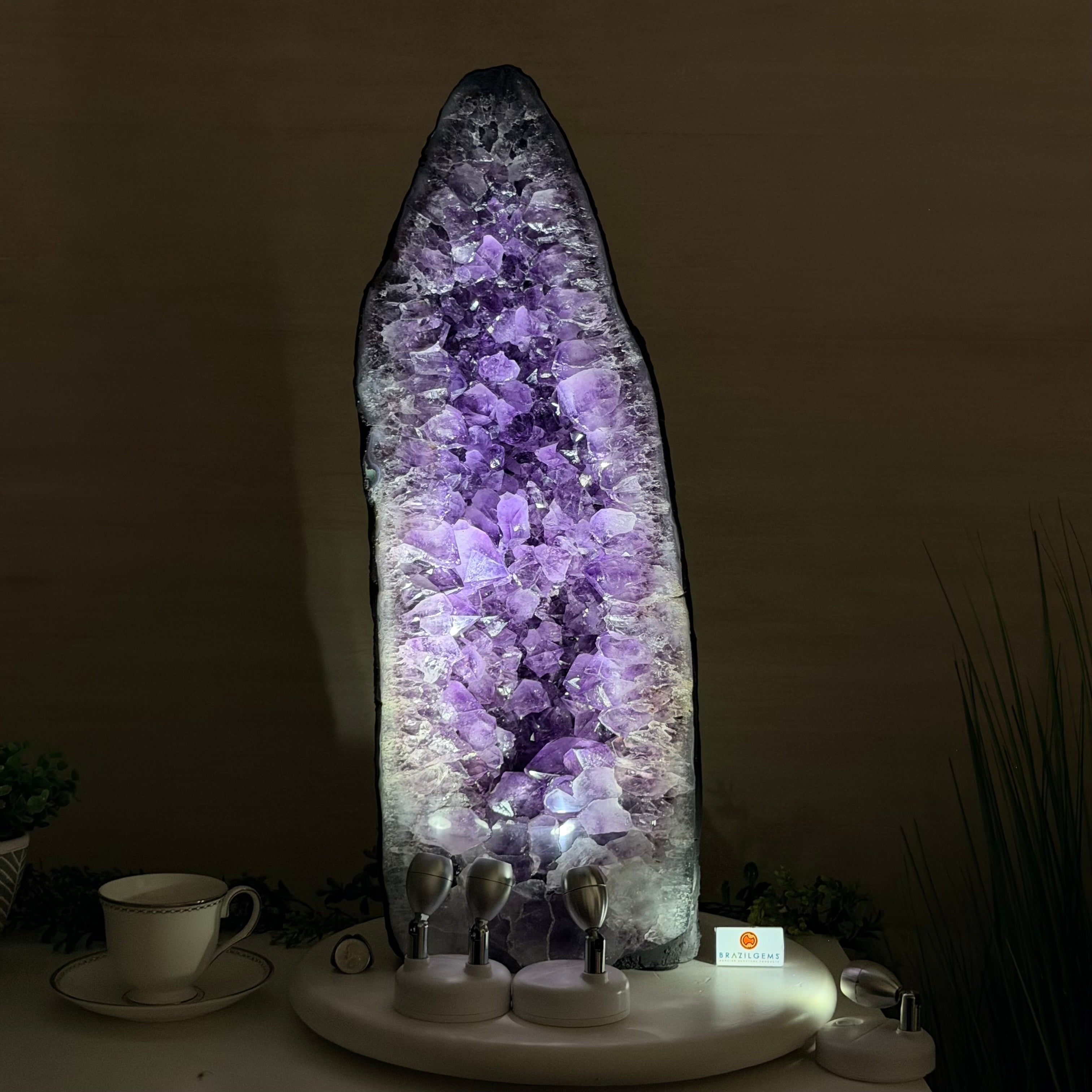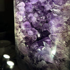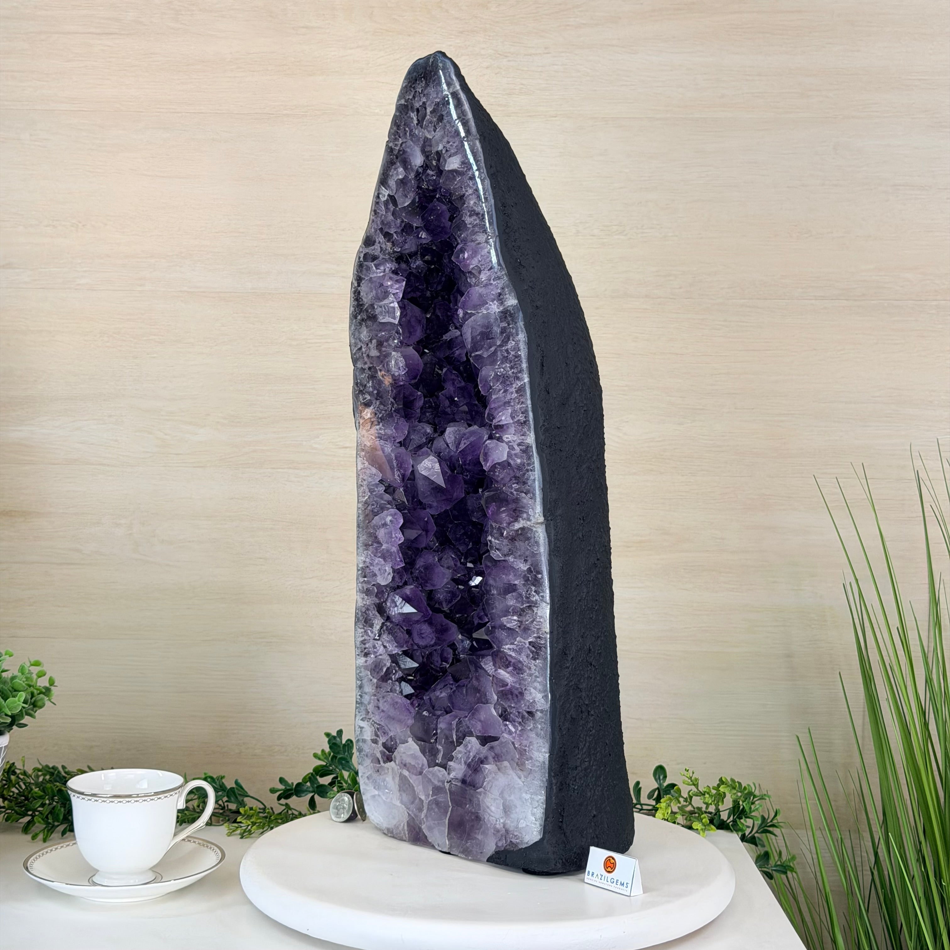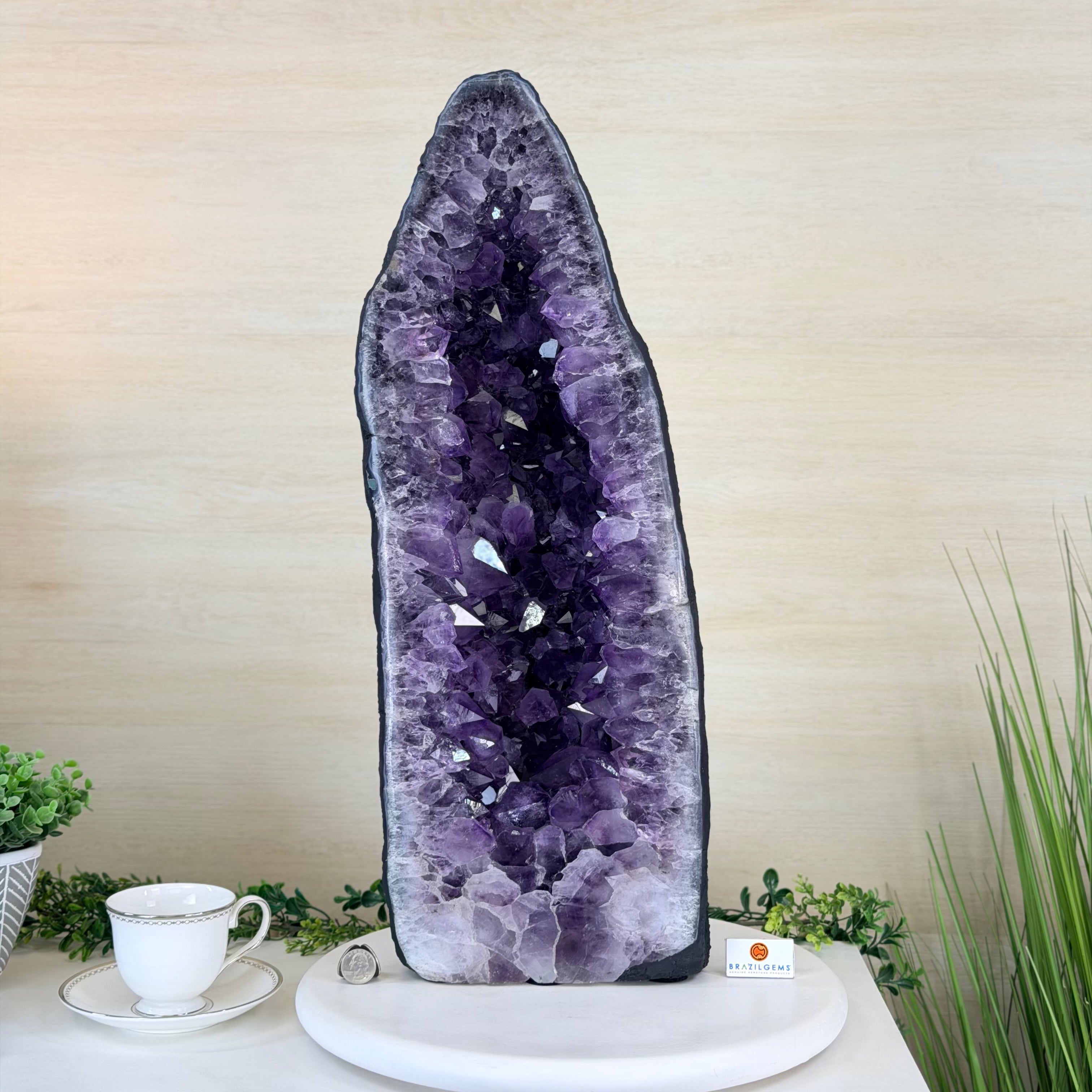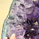 A Majestic statement piece for your space, this elegant awe-inspiring Brazilian Amethyst Cathedral, a Super Quality geode, commands attention with its large purple crystals and vibrant energy by Brazil Gems®.