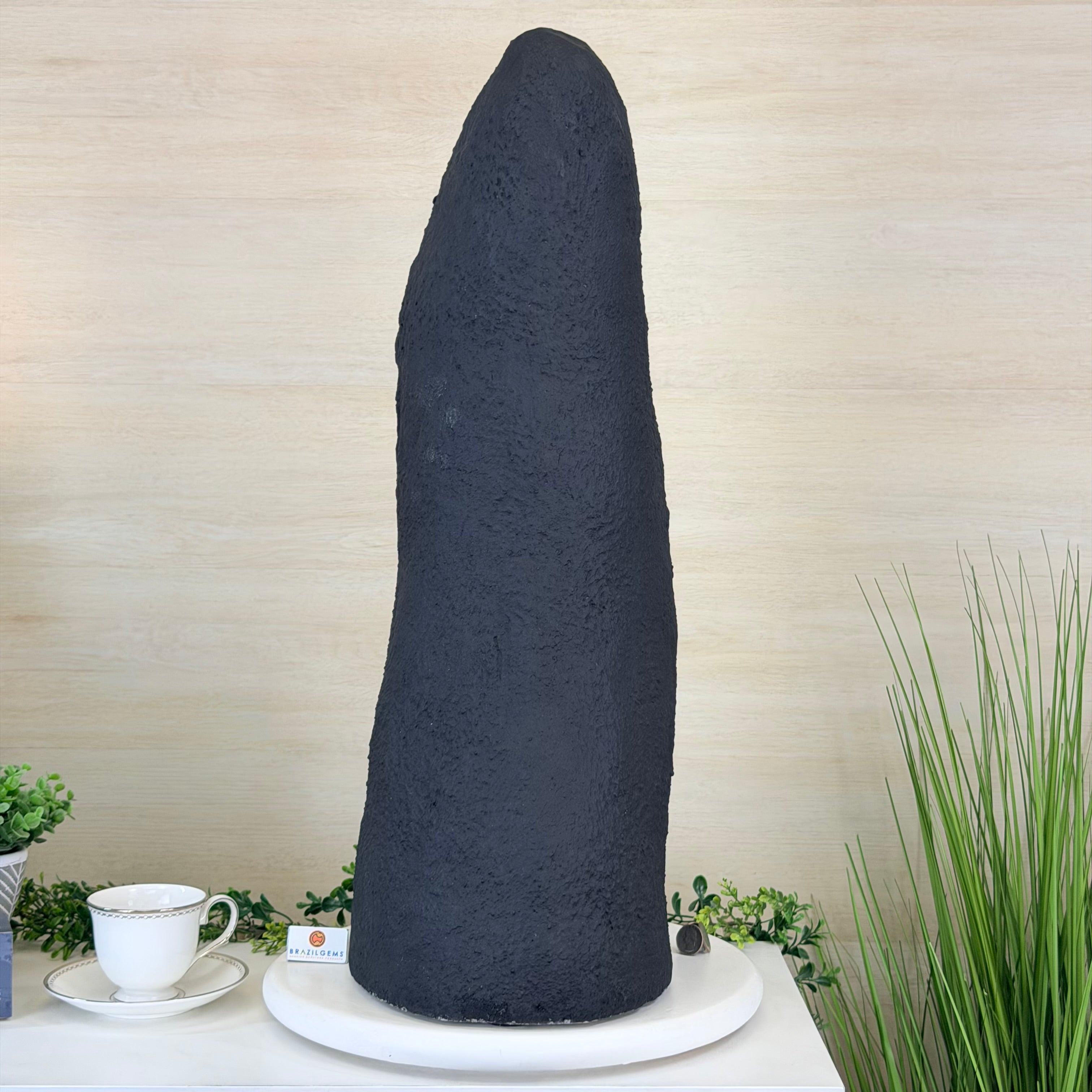 This is a natural gemstone crystal sold by Brazil Gems® as is and as you see it in its images and video. It is the exact one you will receive. It may contain natural imperfections as well as imperfections, broken edges and repairs from the extraction, polishing and prepping processes. In order for it to stand on its own, the back and bottom have been reinforced with a small amount of cement then painted black. At Brazil Gems® we make every effort to get measurements as exact as possible but they are done by human hands and eyes and therefore may have minor discrepancies.