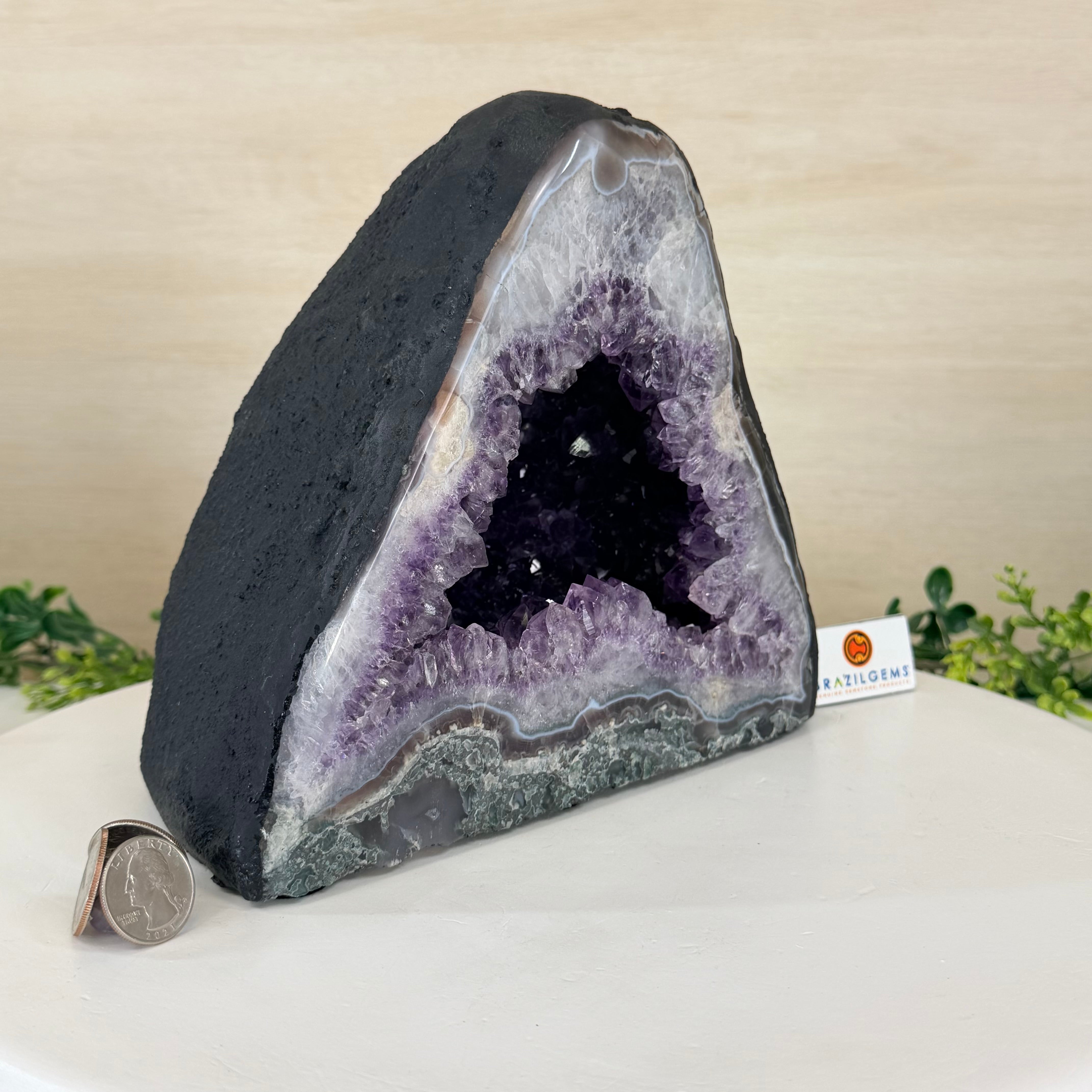 Disclaimer: This is a natural gemstone crystal sold by Brazil Gems® as is and as you see it in its images and video. It is the exact one you will receive. It may contain natural imperfections as well as imperfections, broken edges and repairs from the extraction, polishing and prepping processes. In order for it to stand on its own, the back and bottom have been reinforced with a small amount of cement then painted black. At Brazil Gems® we make every effort to get measurements as exact as possible but they are done by human hands and eyes and therefore may have minor discrepancies.