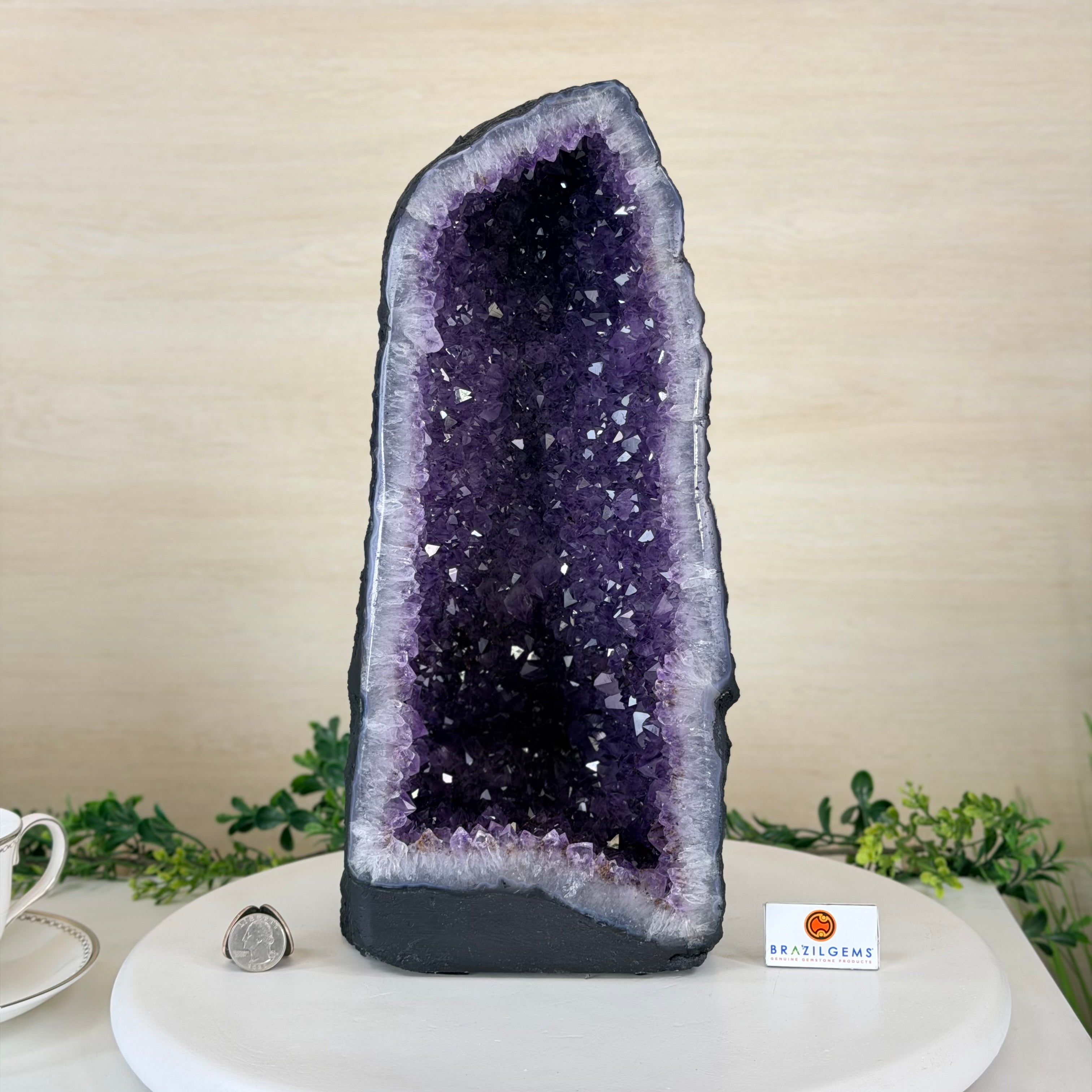 Disclaimer: This is a natural gemstone crystal sold by Brazil Gems® as is and as you see it in its images and video. It is the exact one you will receive. It may contain natural imperfections as well as imperfections, broken edges and repairs from the extraction, polishing and prepping processes. In order for it to stand on its own, the back and bottom have been reinforced with a small amount of cement then painted black. At Brazil Gems® we make every effort to get measurements as exact as possible but they are done by human hands and eyes and therefore may have minor discrepancies.