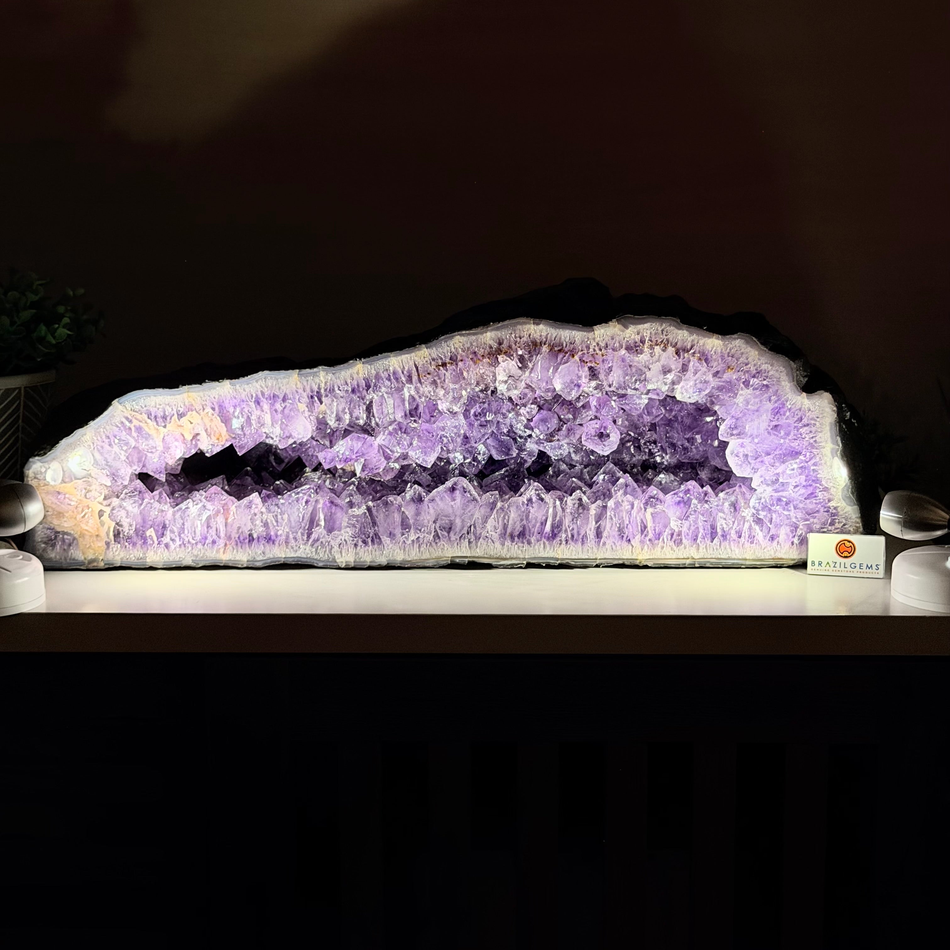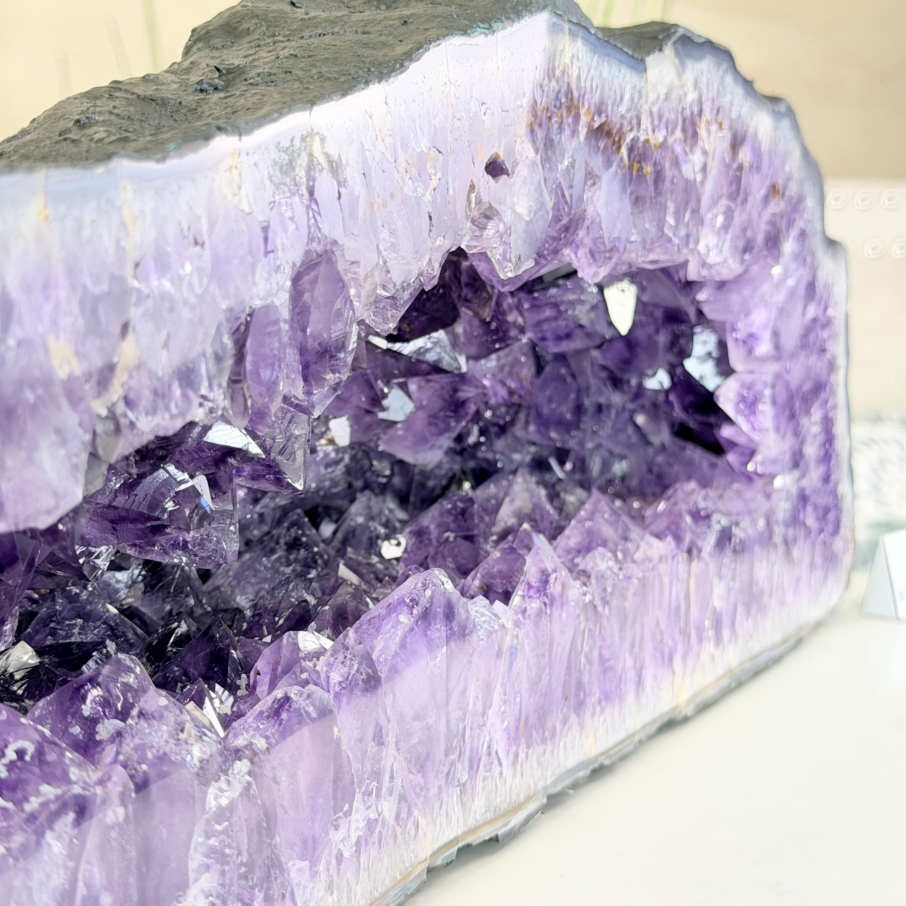 Disclaimer: This is a natural gemstone crystal sold by Brazil Gems® as is and as you see it in its images and video. It is the exact one you will receive. It may contain natural imperfections as well as imperfections, broken edges and repairs from the extraction, polishing and prepping processes. In order for it to stand on its own, the back and bottom have been reinforced with a small amount of cement then painted black. At Brazil Gems® we make every effort to get measurements as exact as possible but they are done by human hands and eyes and therefore may have minor discrepancies.